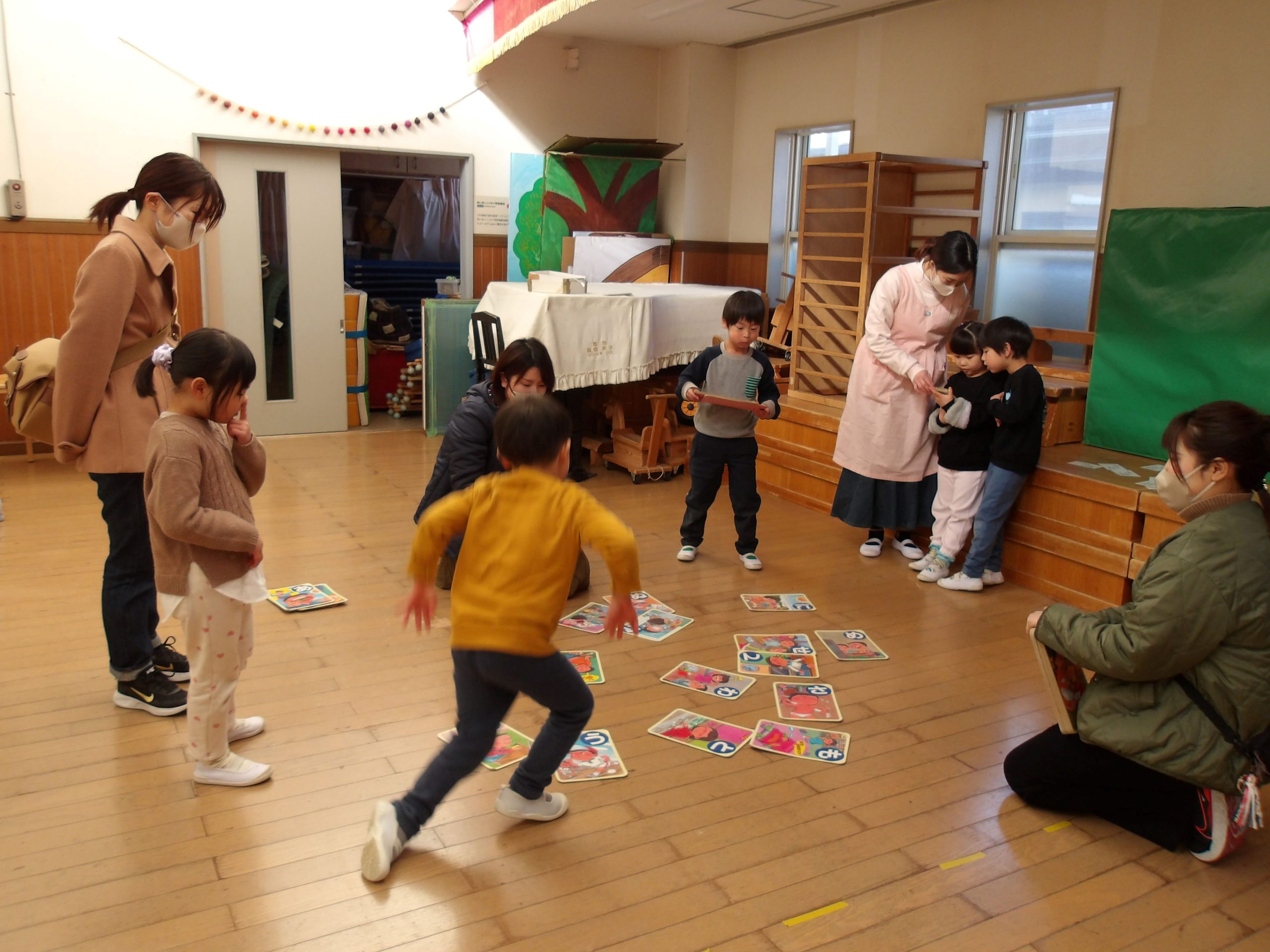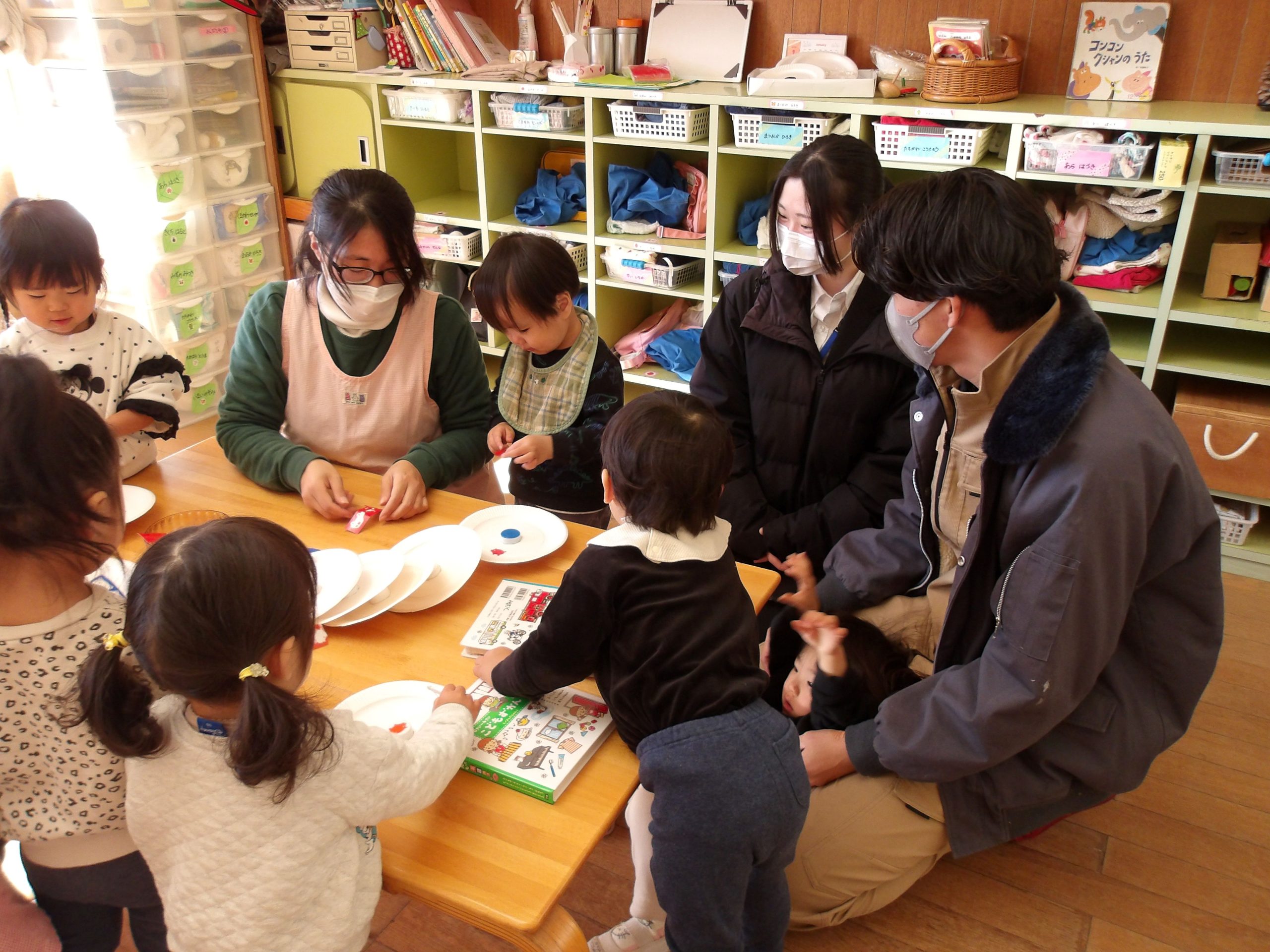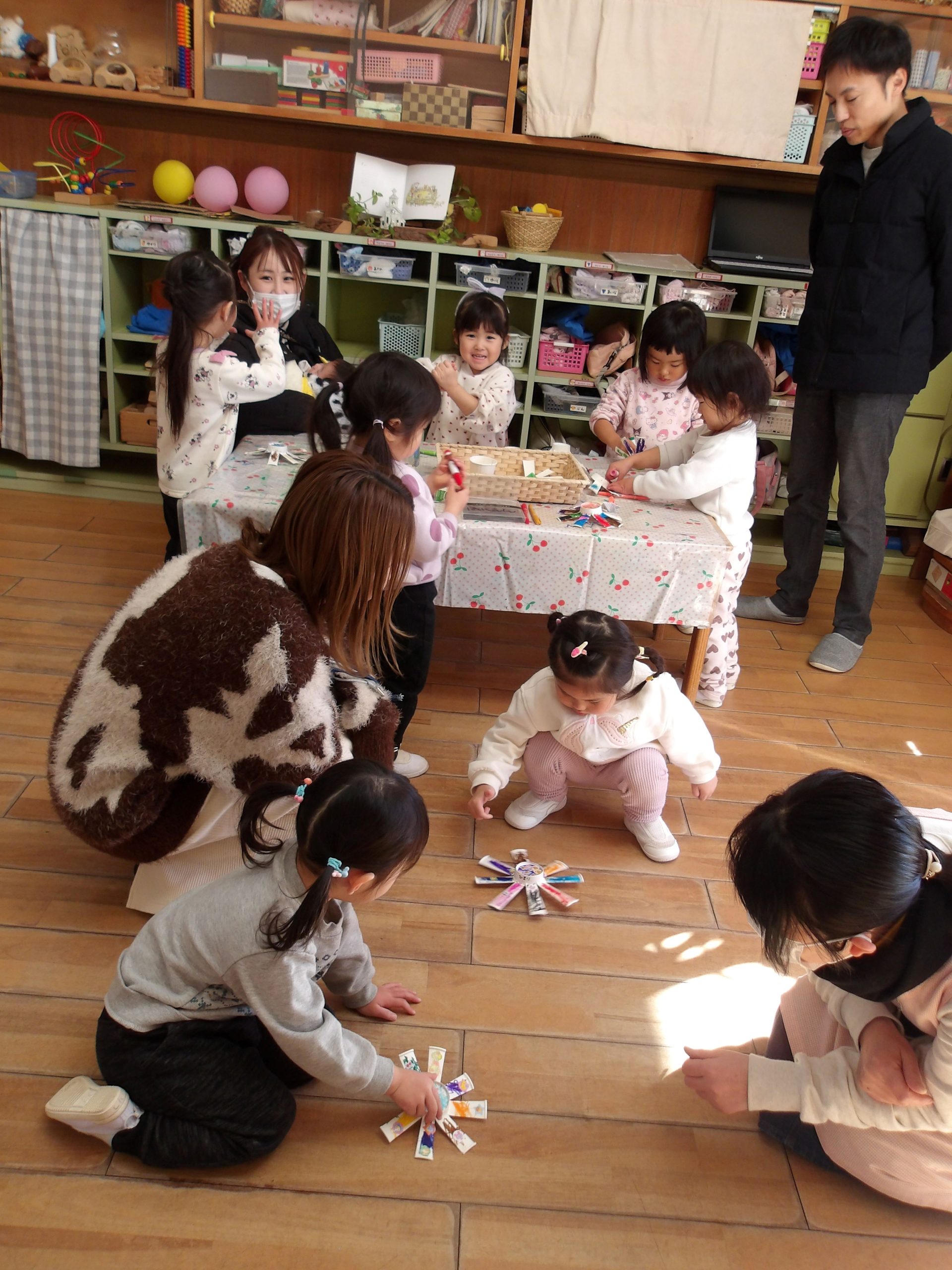 今年度2回目の保育参観でした。子どもたち同士で遊ぶ姿、自分でやってみようとする姿など保護者の方に見ていただくことができました。子どもたちもお家の人が一緒で張り切っていました。