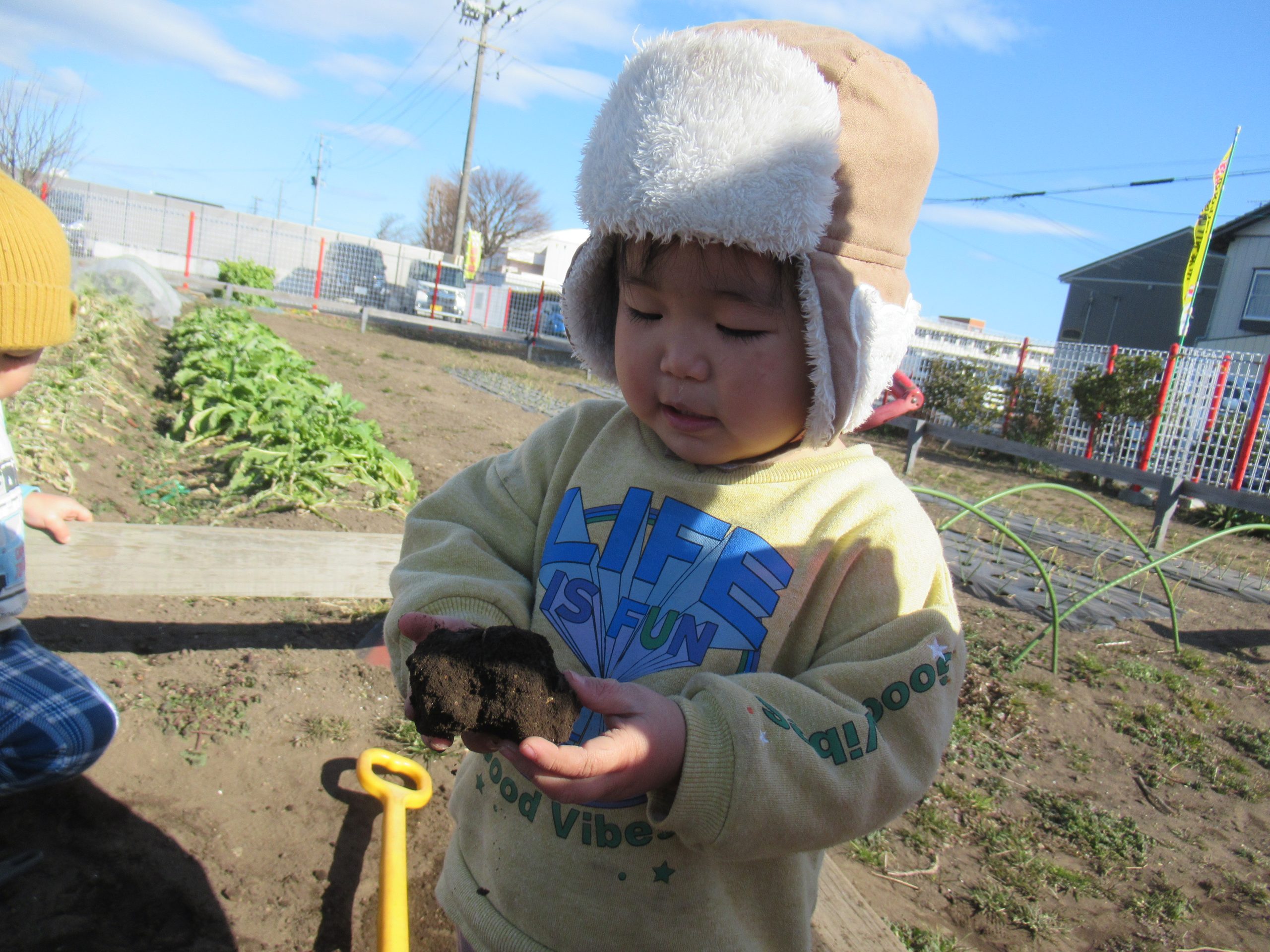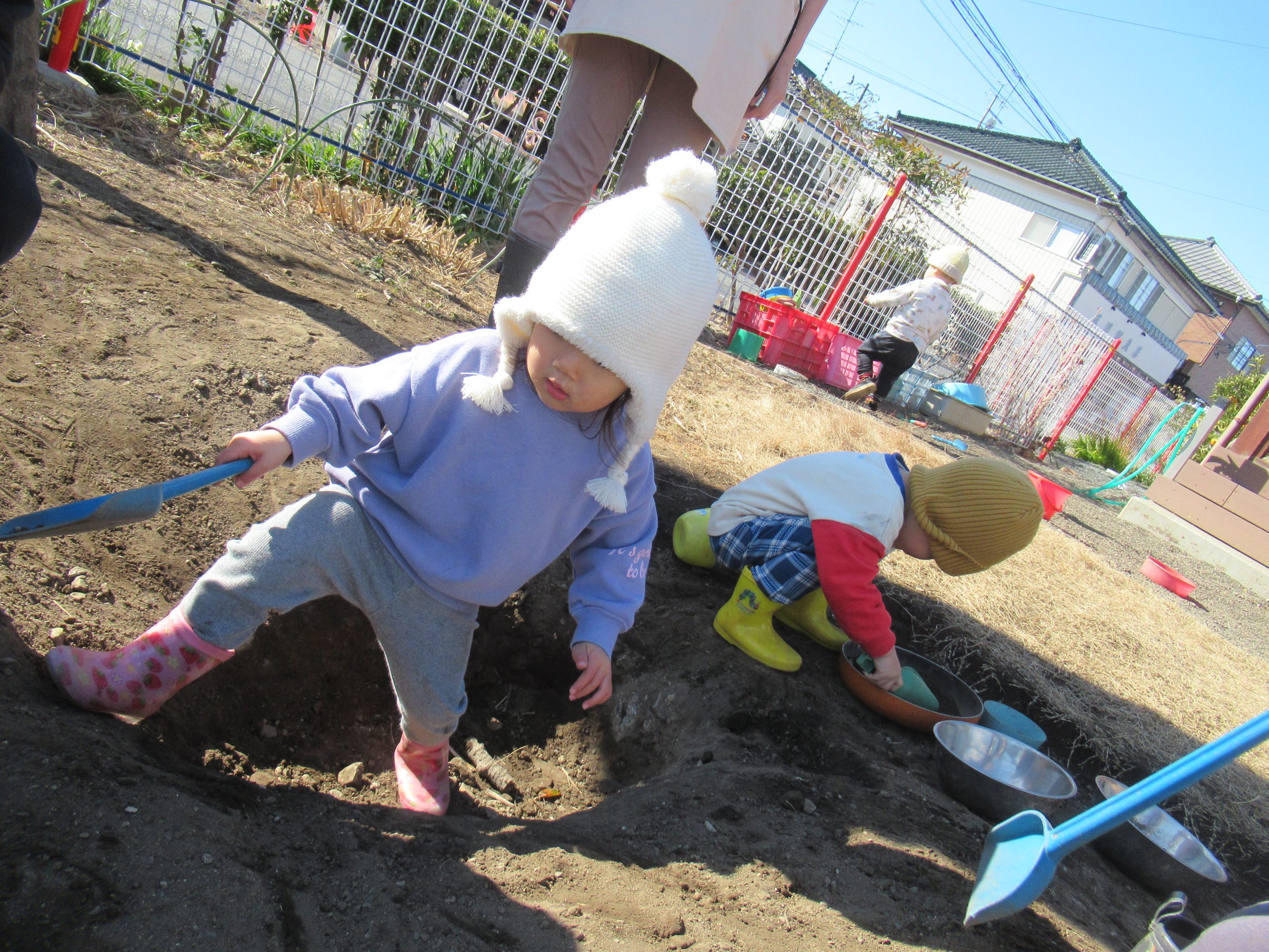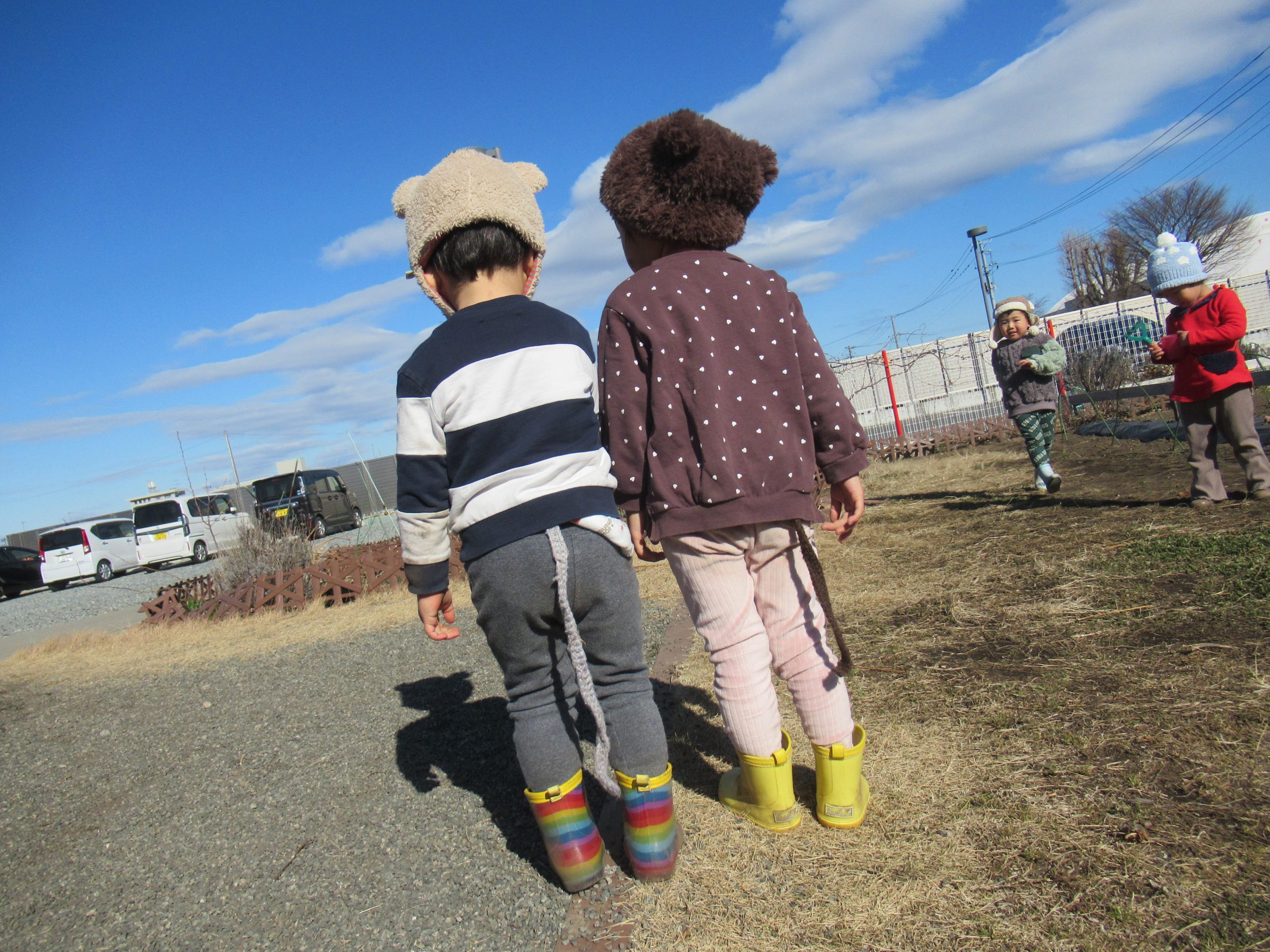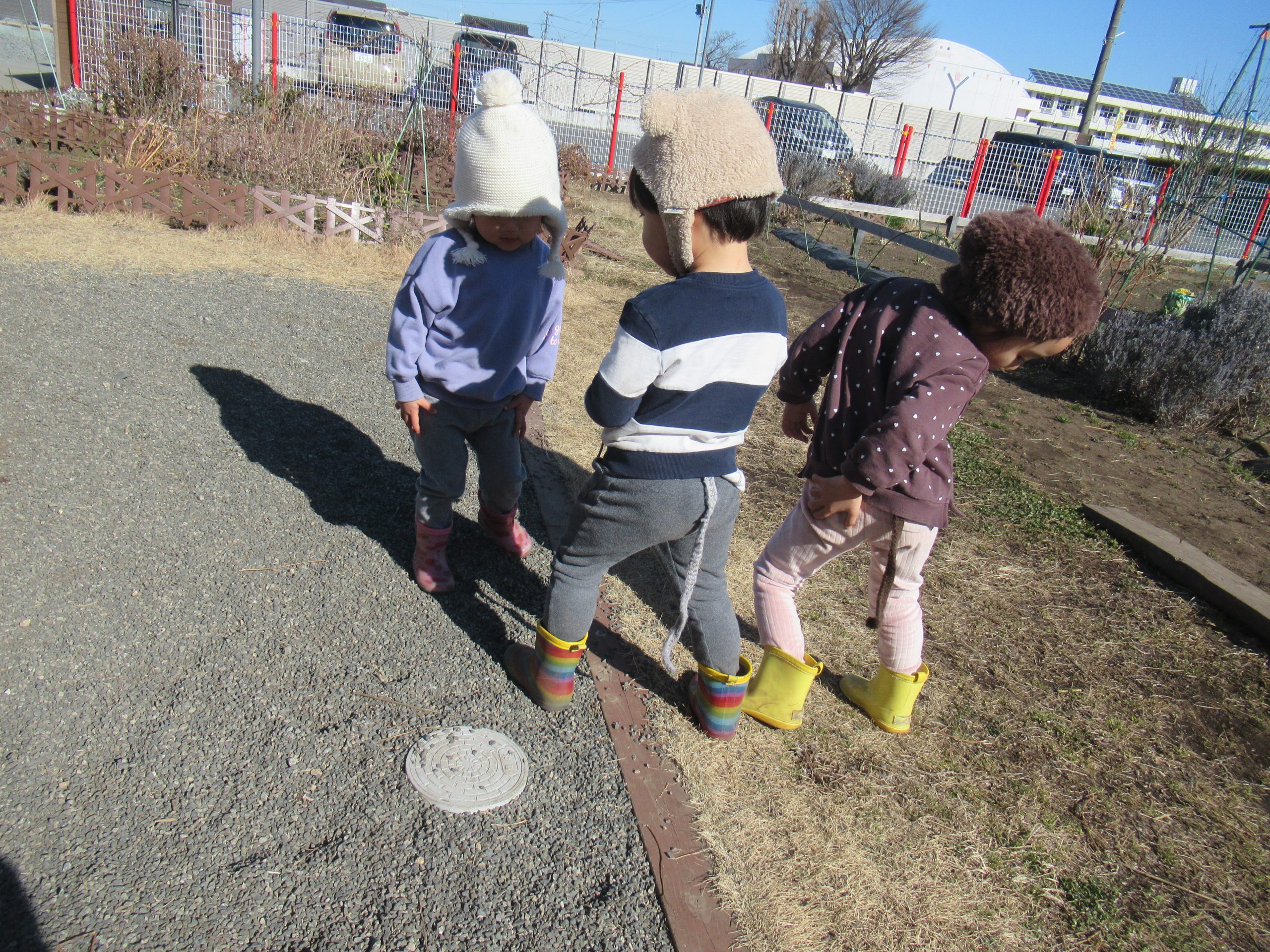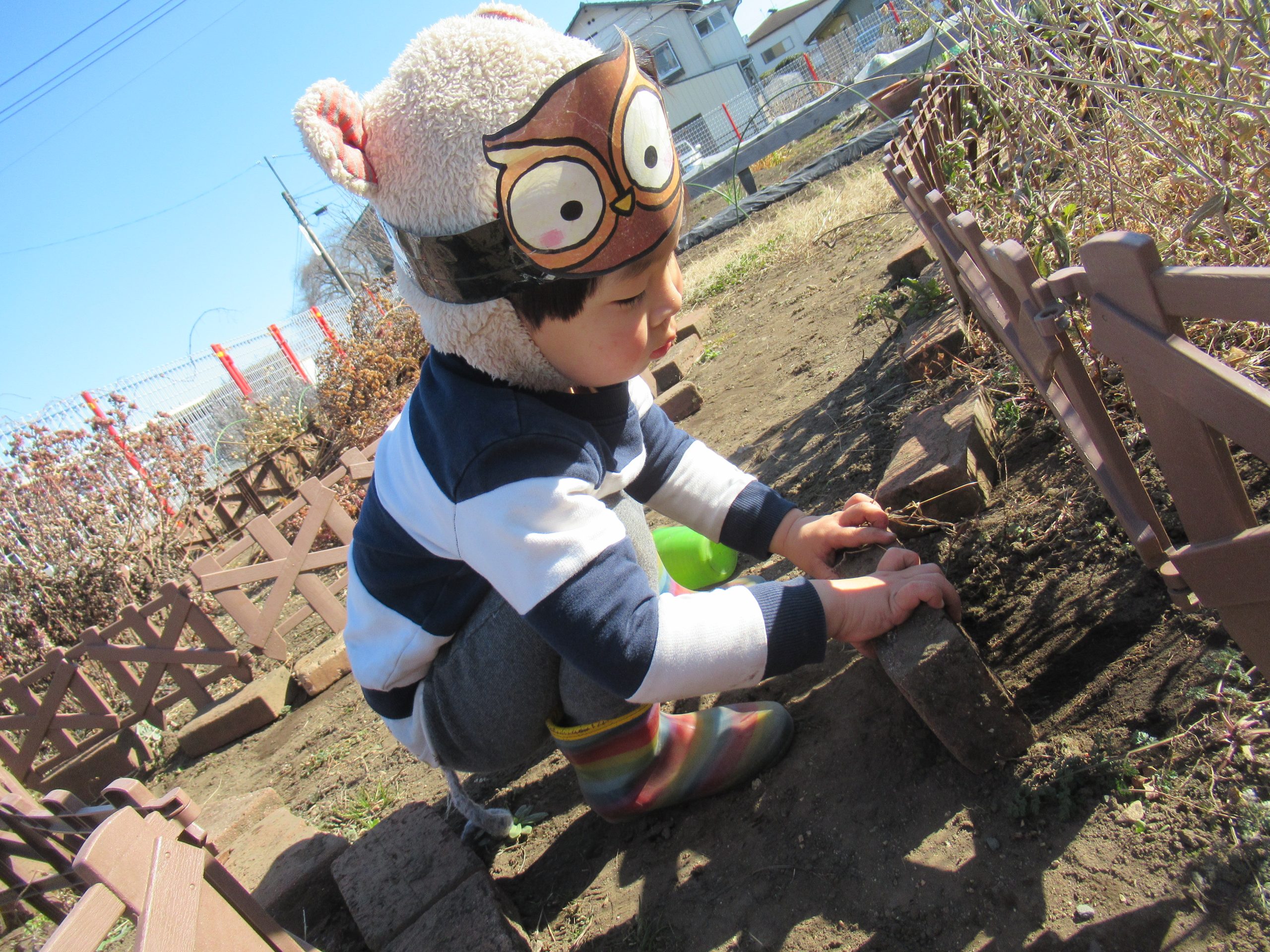 今日は寒さがやわらいで“お外で遊ぶのがいい気持ち”遊んでいる子ども達の表情も違っています。思わず虫探しをするH君です。