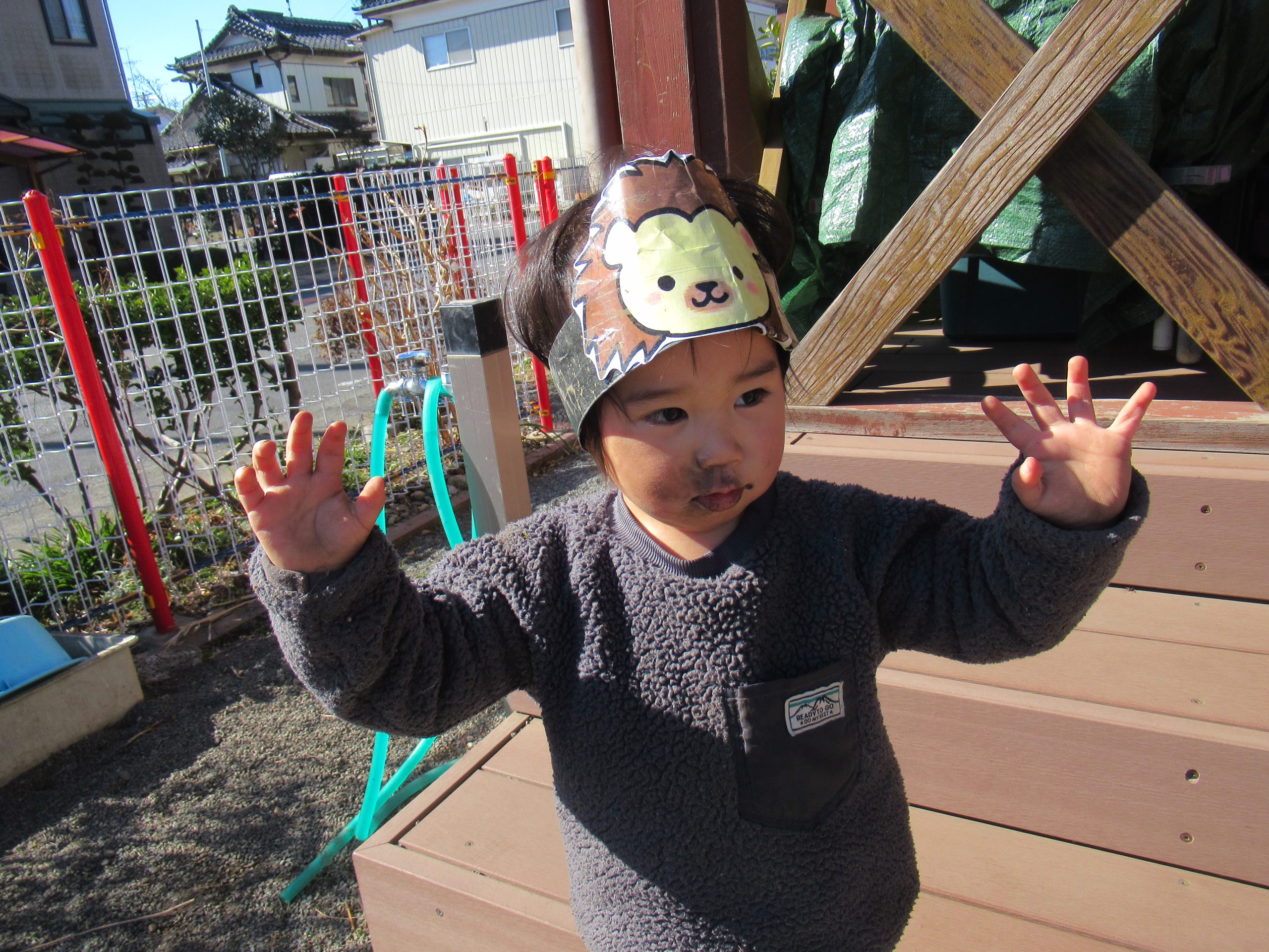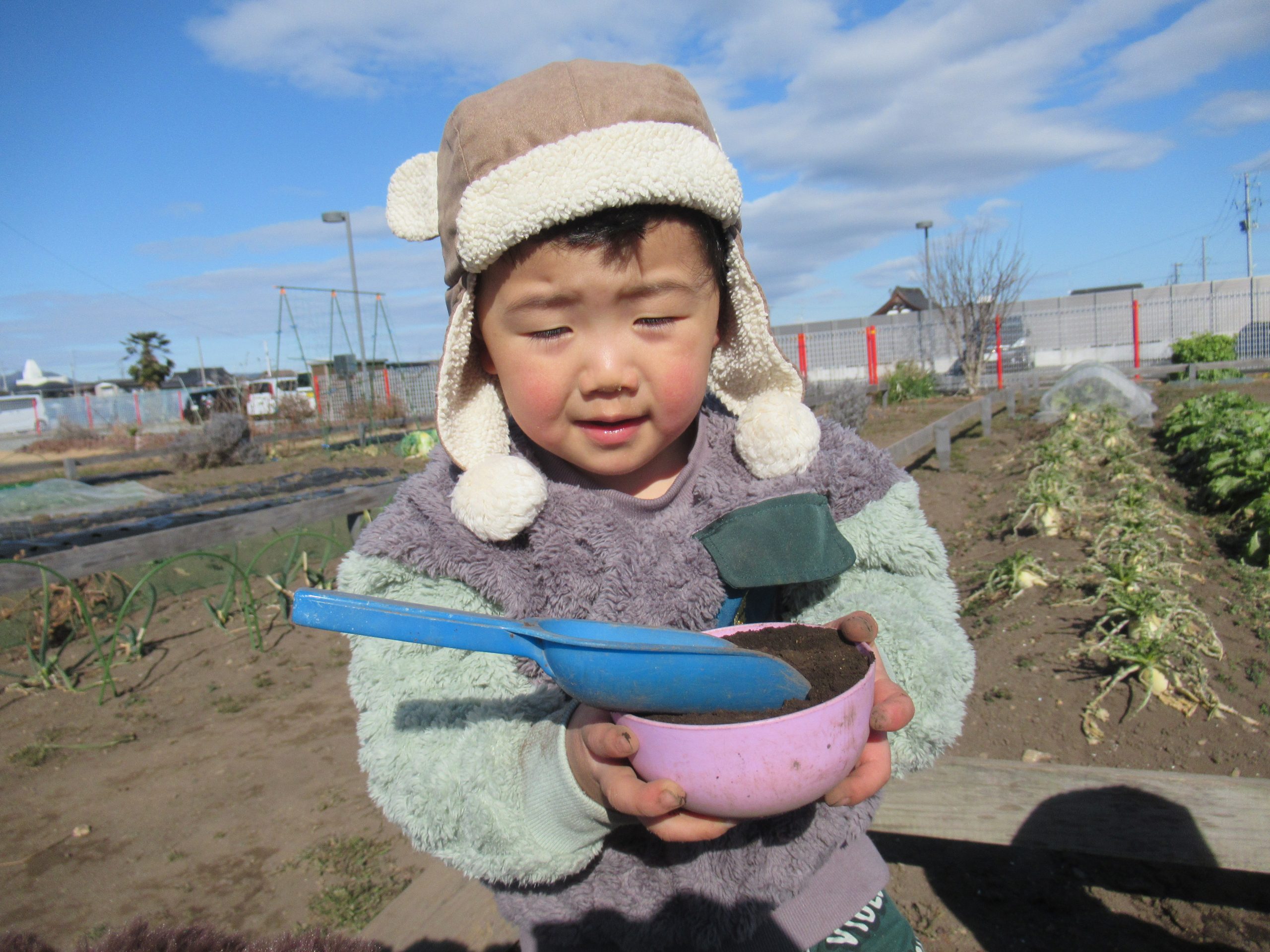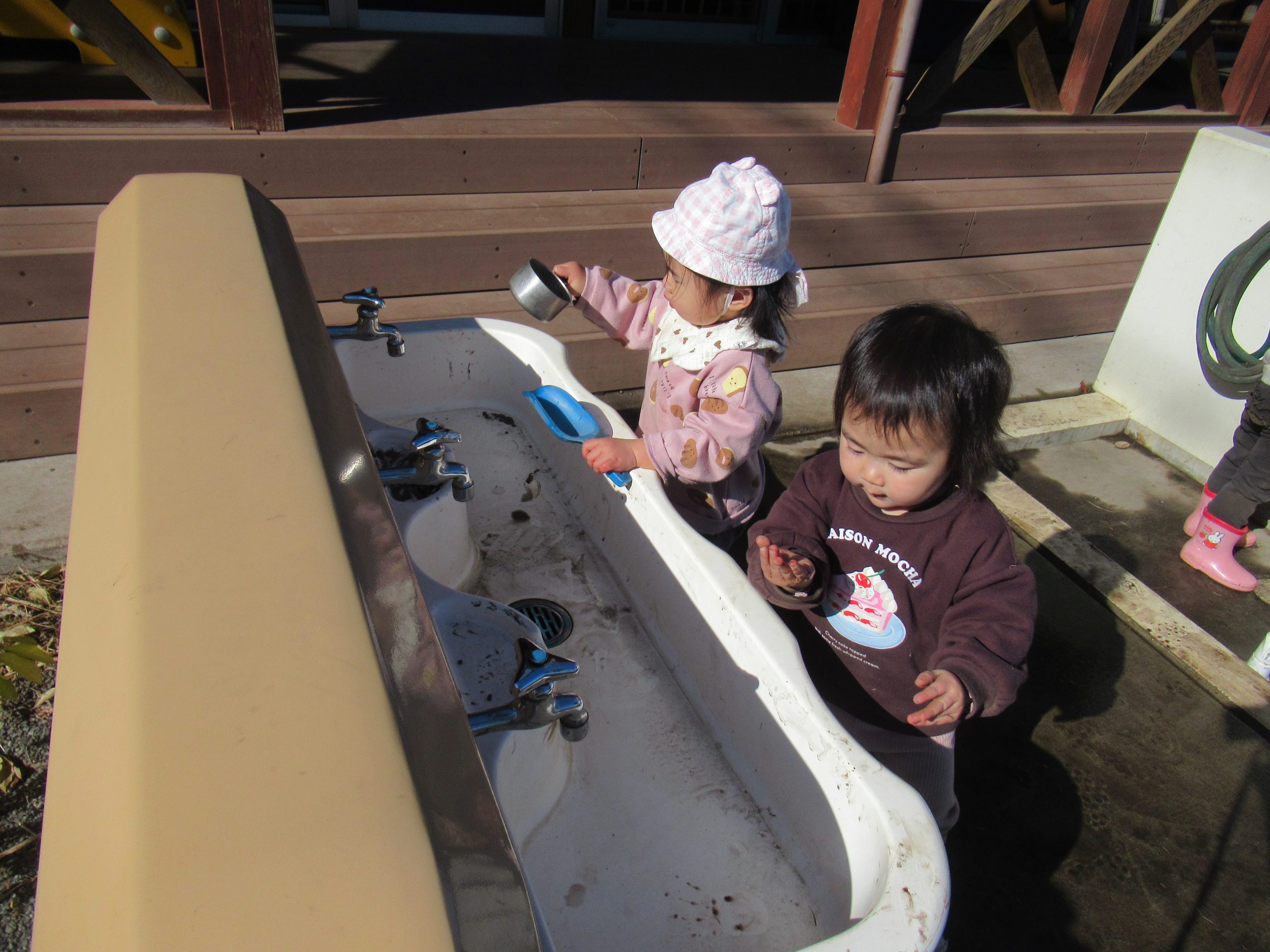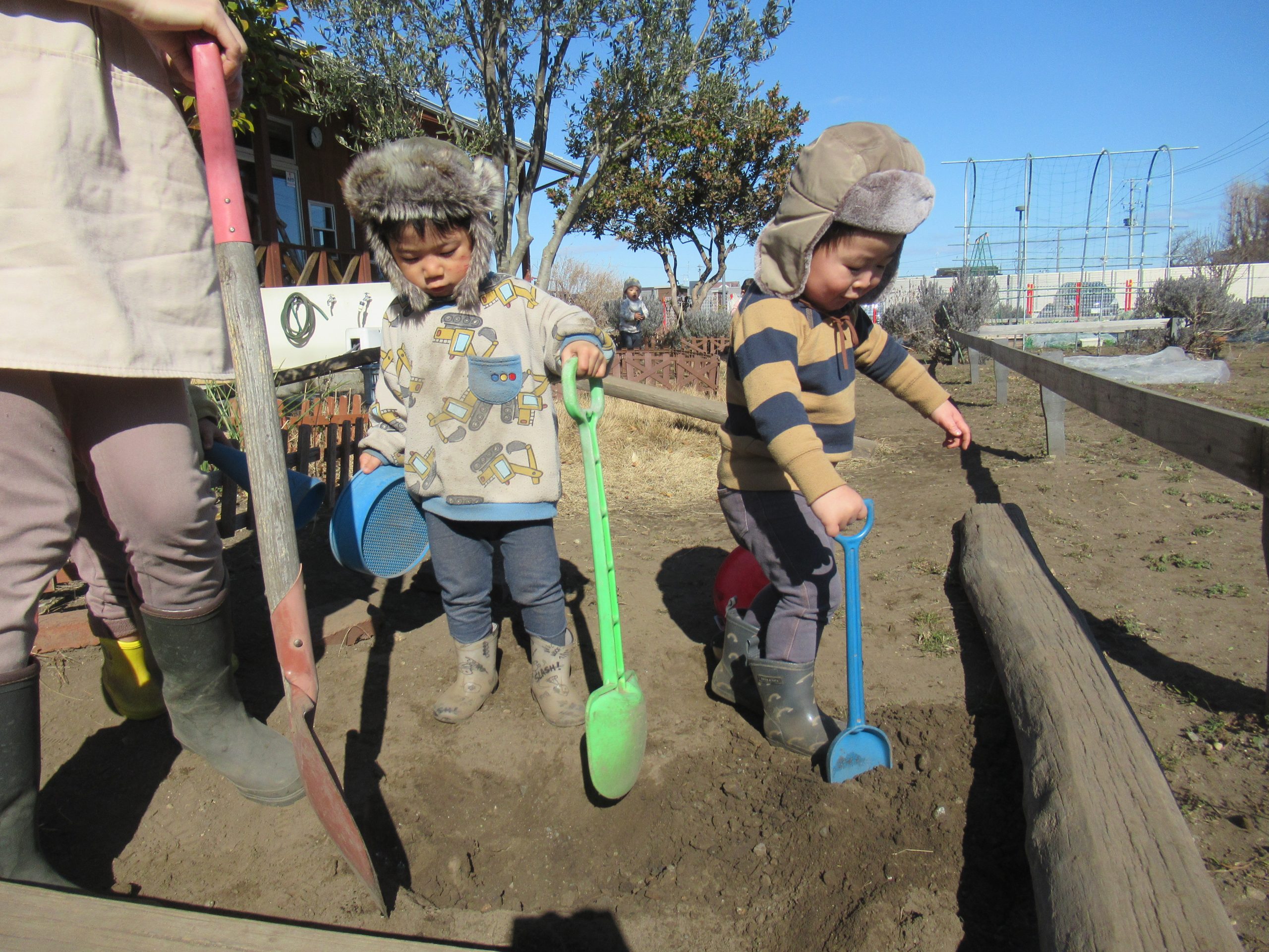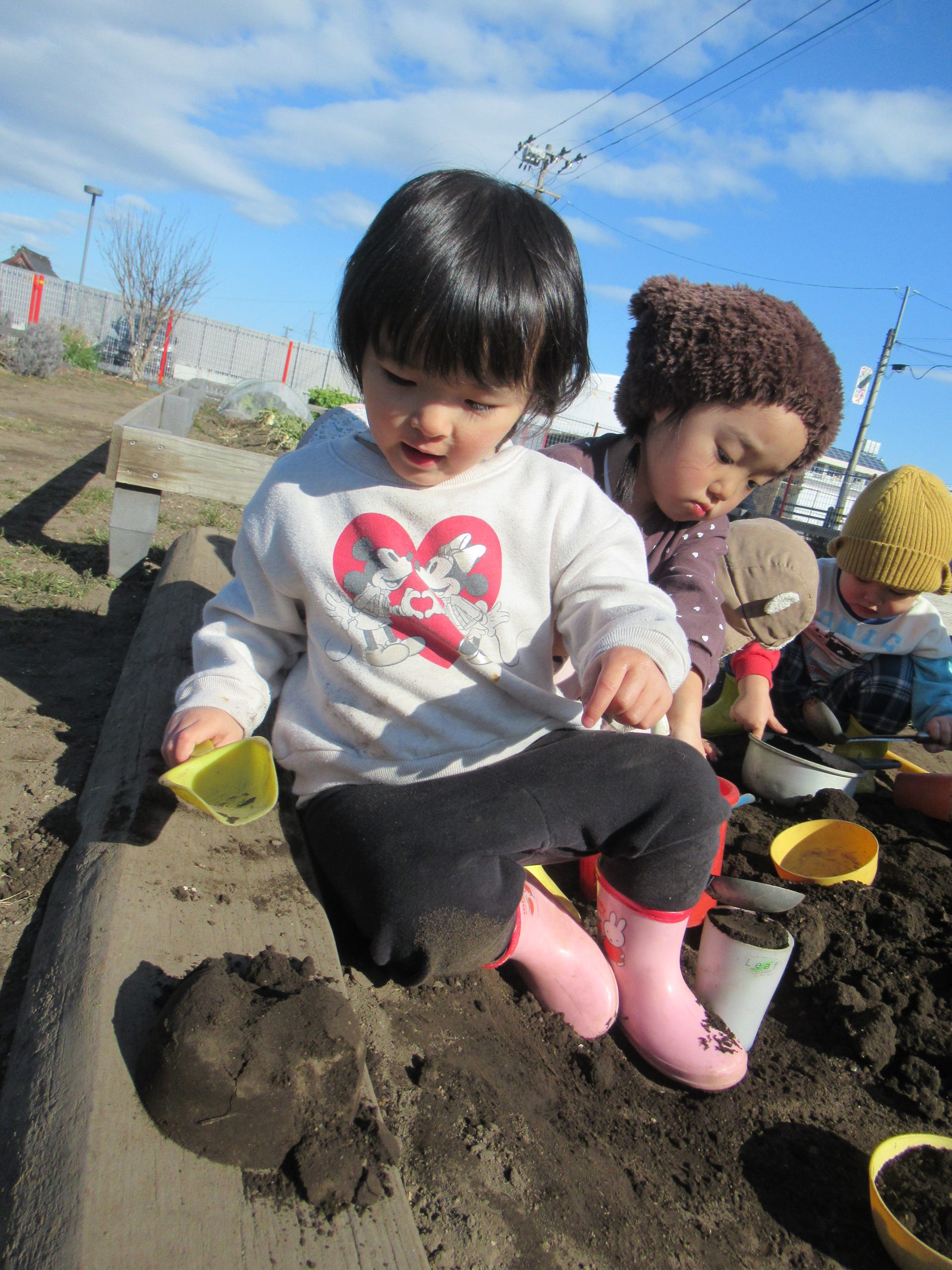 今日は寒さがやわらいで“お外で遊ぶのがいい気持ち”遊んでいる子ども達の表情も違っています。思わず虫探しをするH君です。