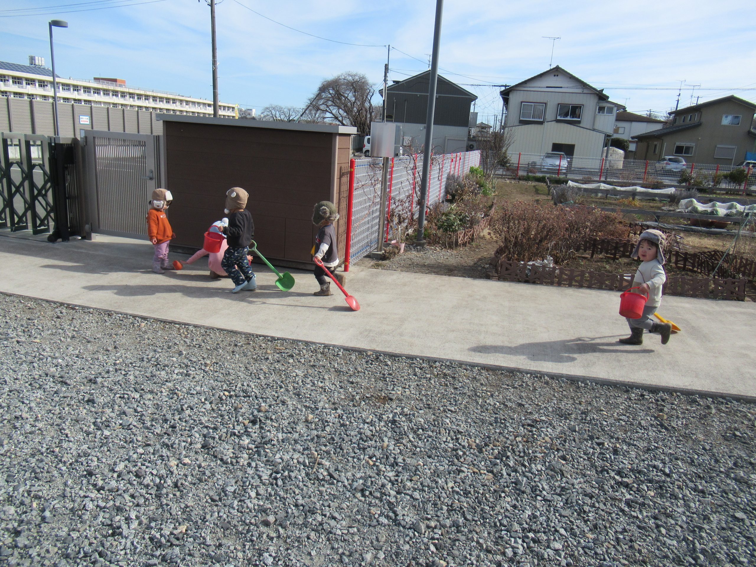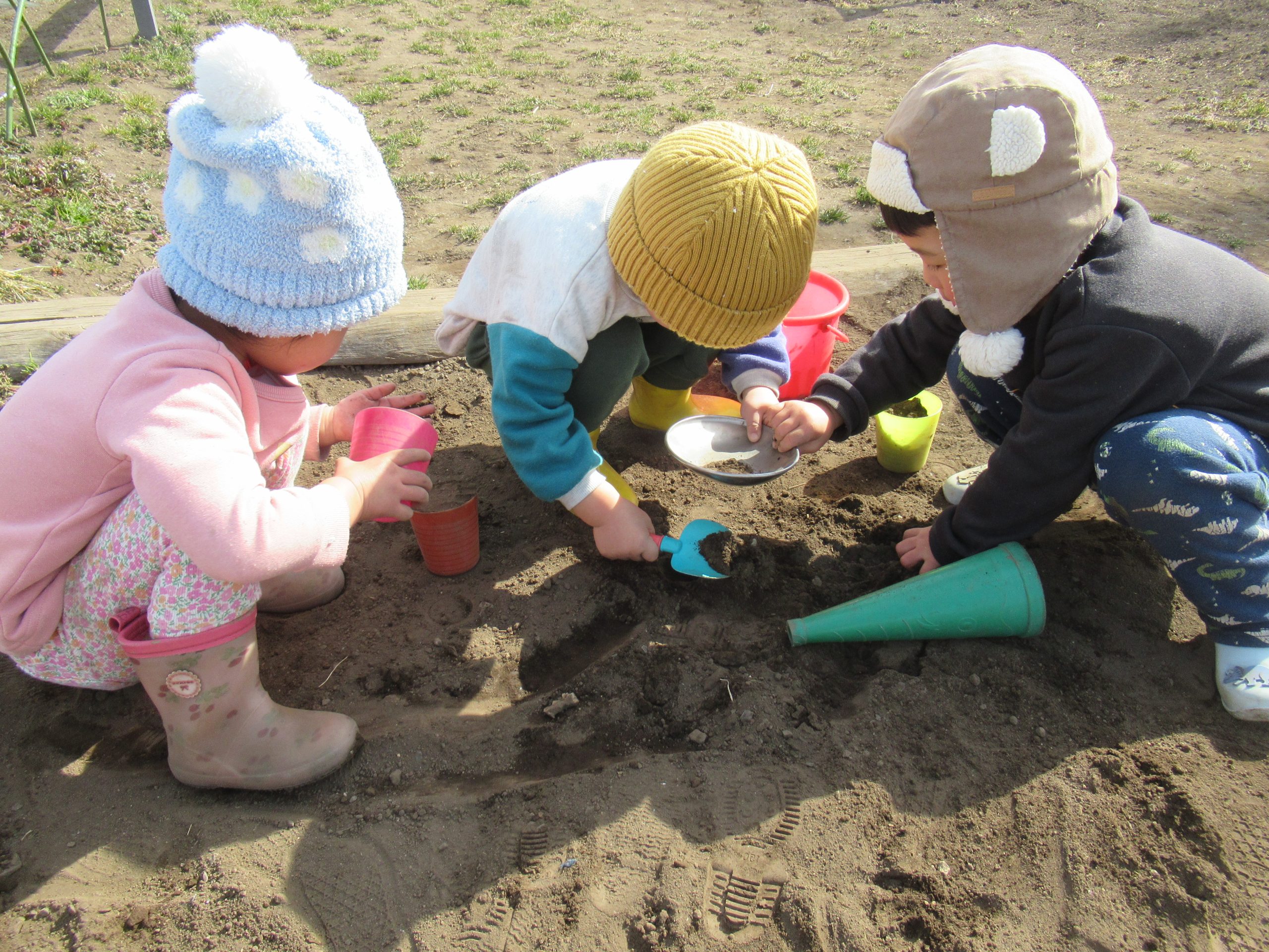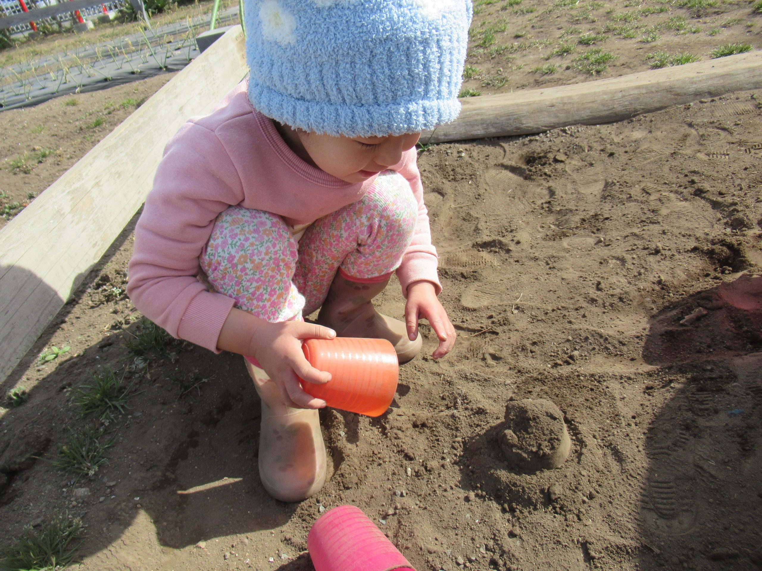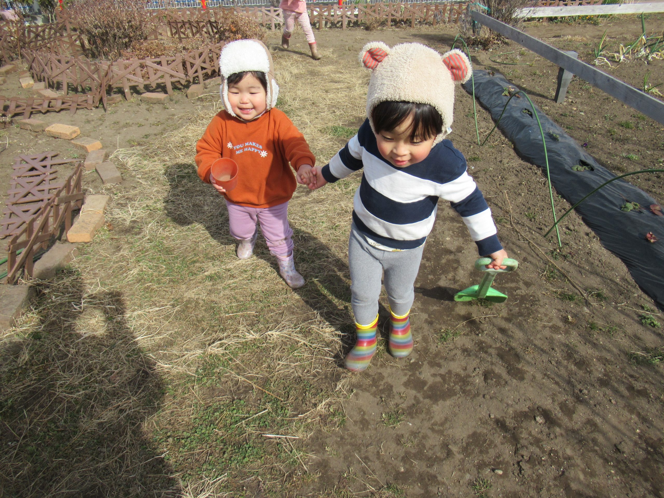この頃は、お互いに相手のやることに共感して遊んでいるように感じます。お友だちのお誕生会の後、畑では自分たちだけでケーキ作りをする子どもたち。自分も真似てみたいとそれぞれにシャベルやスコップでやってみる子。同じおもちゃを持って走り回ったり、手をつないだりして一緒!を味わう子。はな組さんがやっていた場所で同じようにやってみる子、と畑での遊びはみんな主体的です。