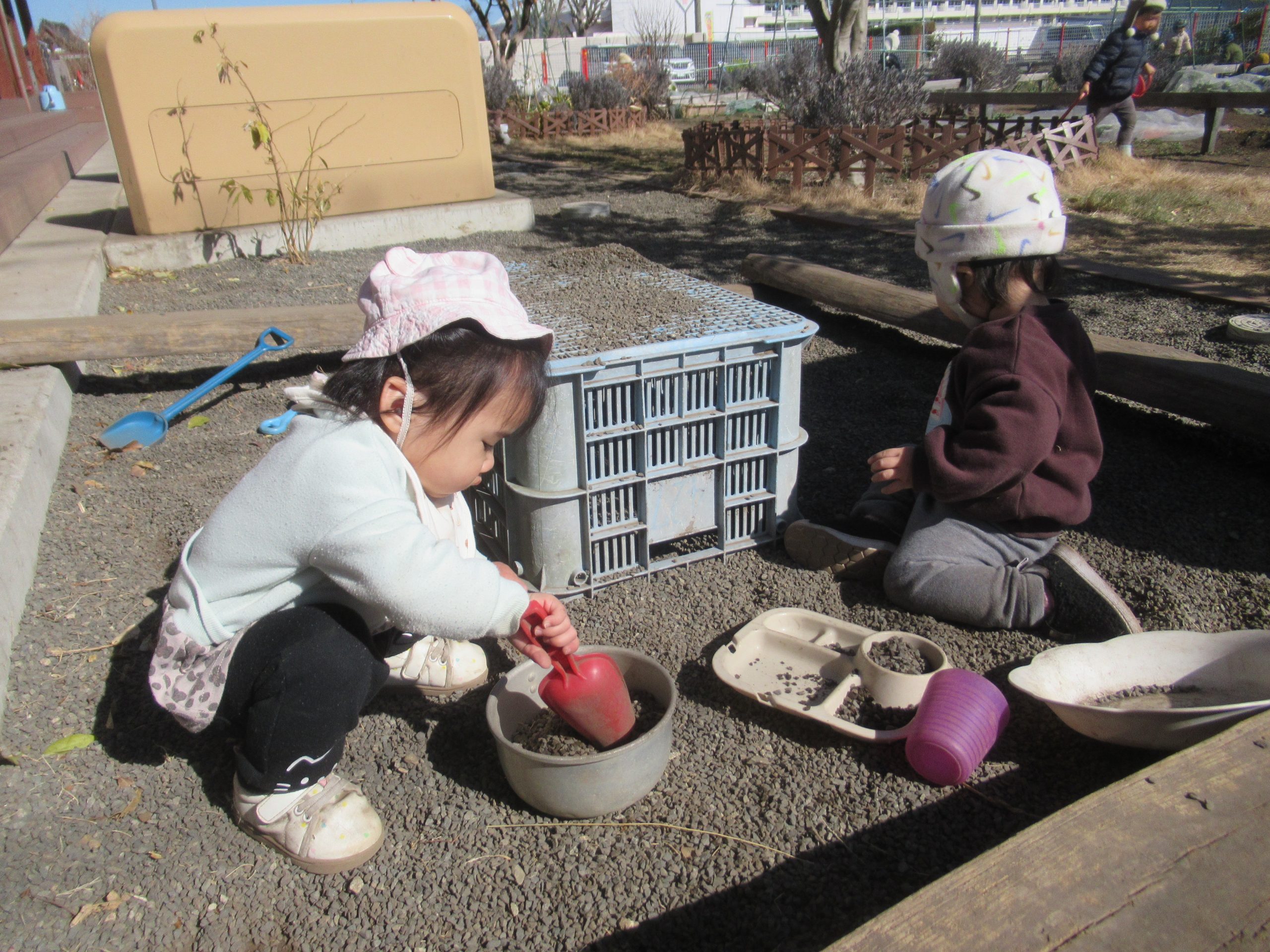 ことり組さんもままごと。砂利を入れたりかき混ぜたり、出来上がった(?)ら食べることを真似てみたり。また、先生に作ってもらった、大きなまん丸泥団子を喜んで持ち運んだり。やってもらっていたことから自分でやってみて遊ぶ、になって楽しんでいます。