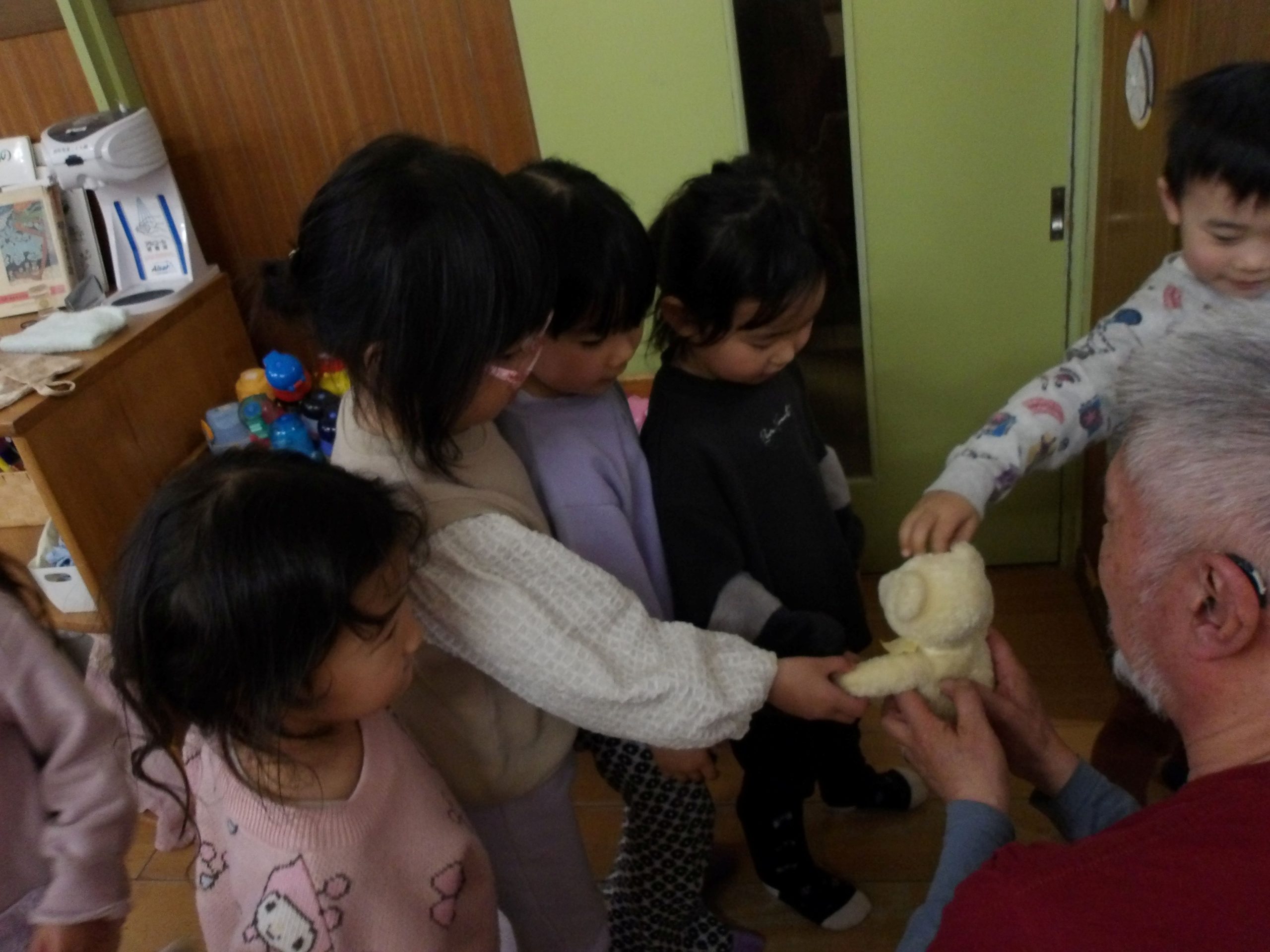 東京から幸田さんが来園し、ほし組の子どもたちに人形劇を見せてくれました。人形劇の他に紙芝居、素話など子どもたちはお話しの中に入り込んで楽しんでいました。手作りのパペットをいただきました。大切に使わせていただきます。