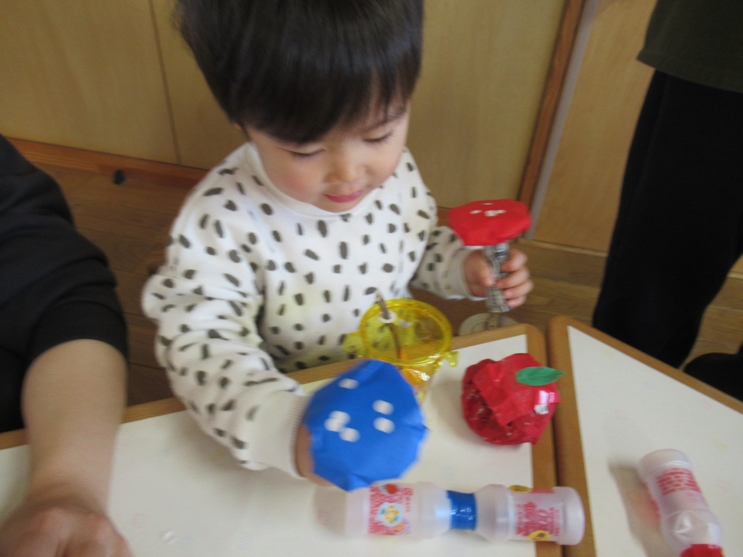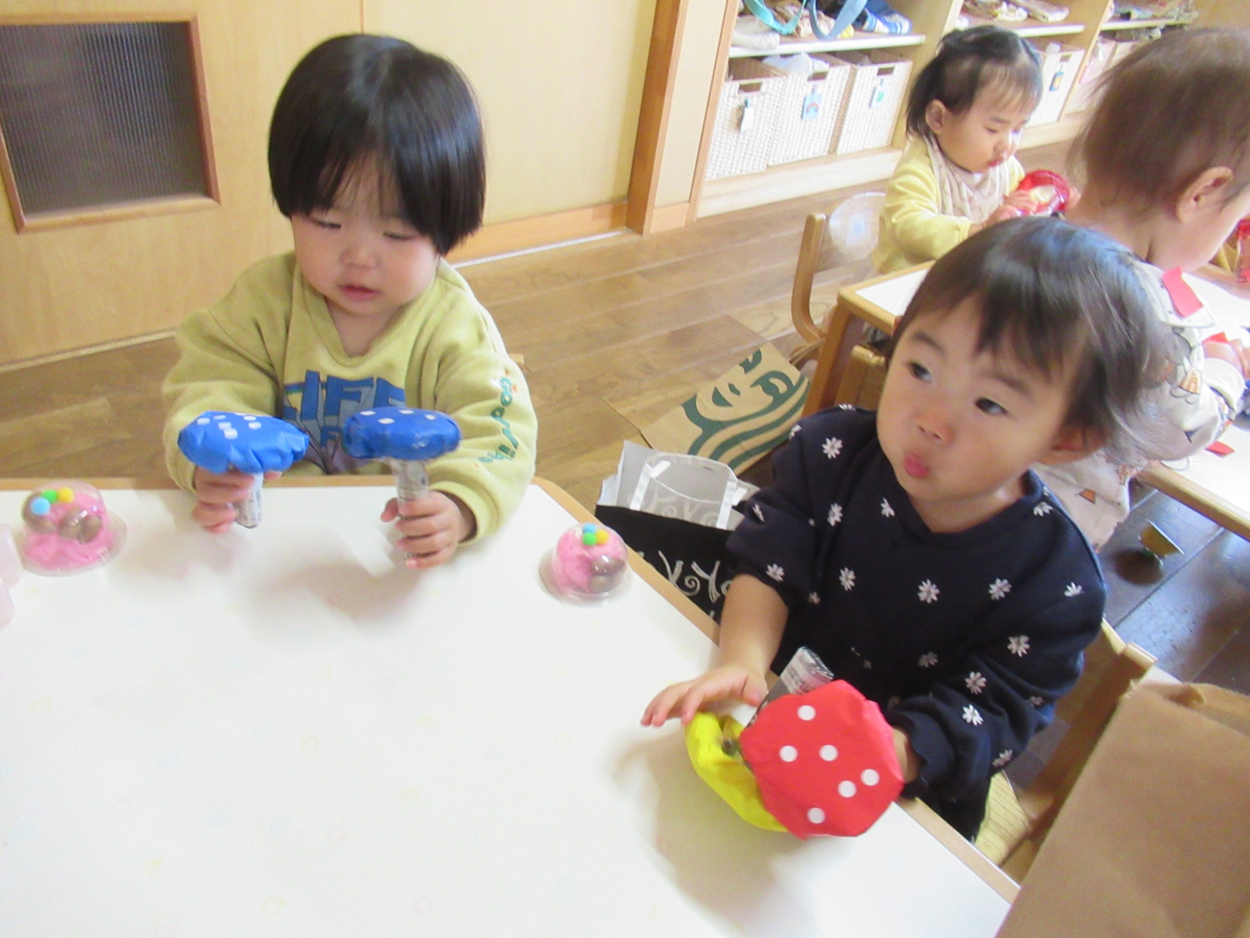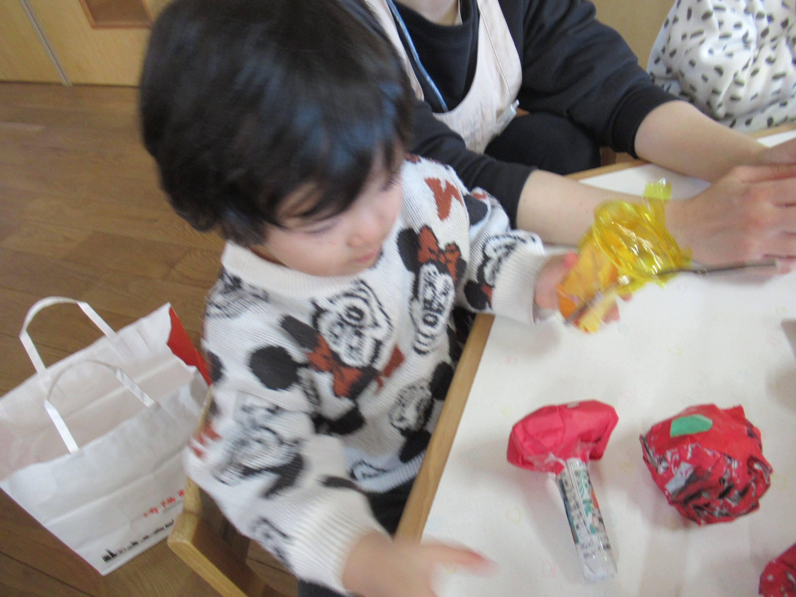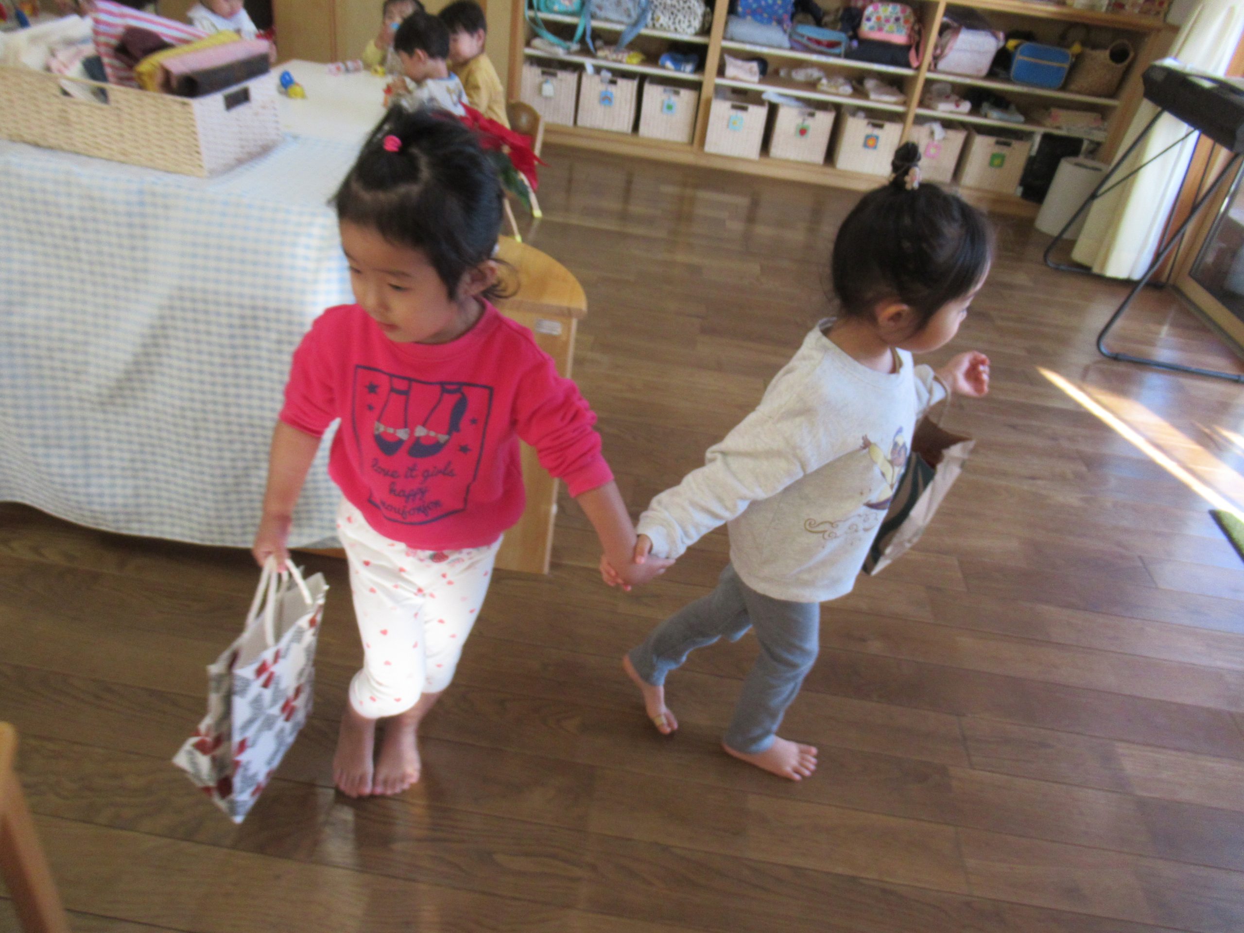 今日はサンタさんになってみました。昨日は羊さん・今日はサンタさん。変身するのもめまぐるしいことり組さんたちです。でも、羊さんもサンタさんもよくわかりません・・・。明日サンタさんが来てくれるのを楽しみに待ってようね。