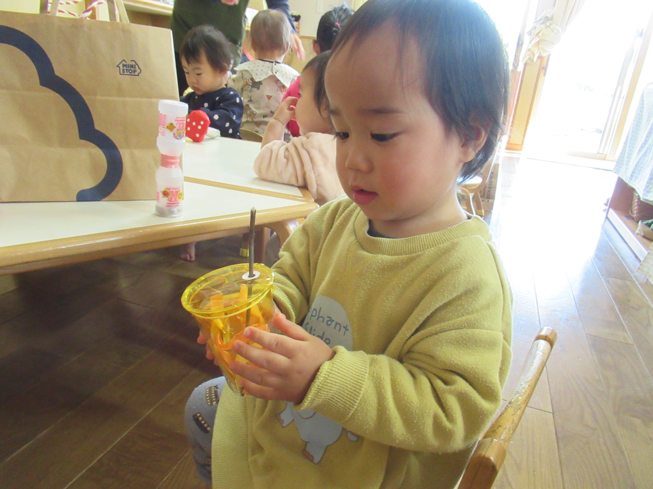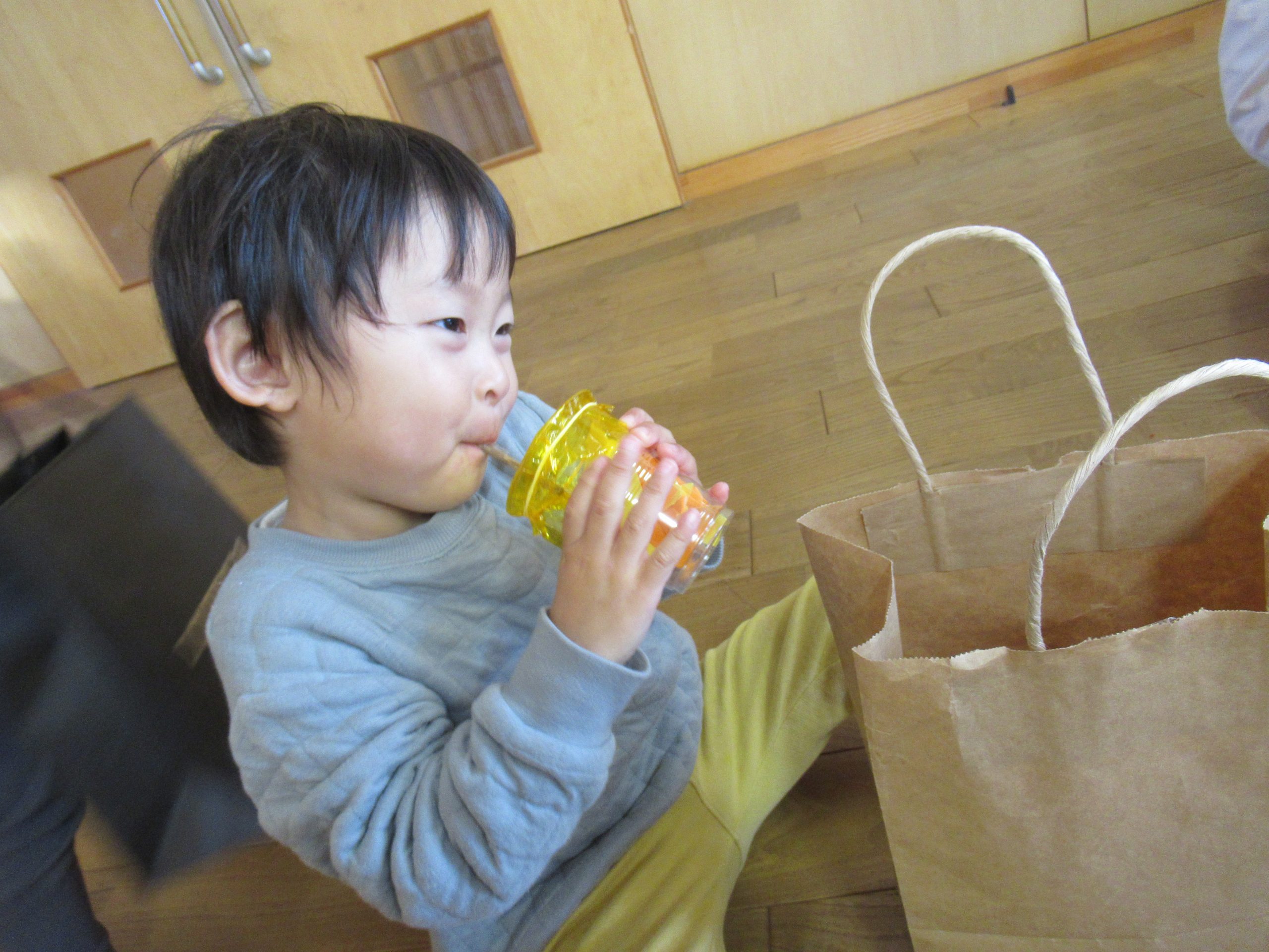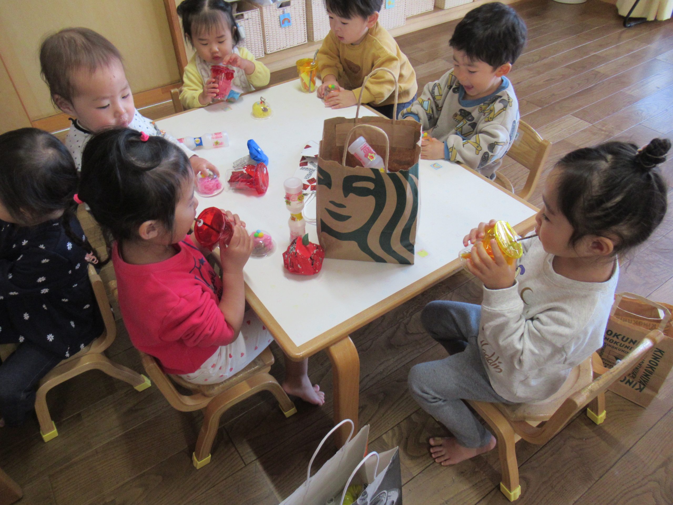 「いらっしゃい いらっしゃい」と元気な呼び込みの声は、はな組さんたちです。お客はにじ組さん。欲しいものを自由にバッグいっぱい詰め込む子。欲しいものが決められないで眺めている子。品を渡されるまで待っている子。と買い物の姿はいろいろです。売る役も買う役も嬉しそうにしていましたが、みんなでフードコートに集まって、食べたり飲んだりしているのが一番嬉しそうでした。