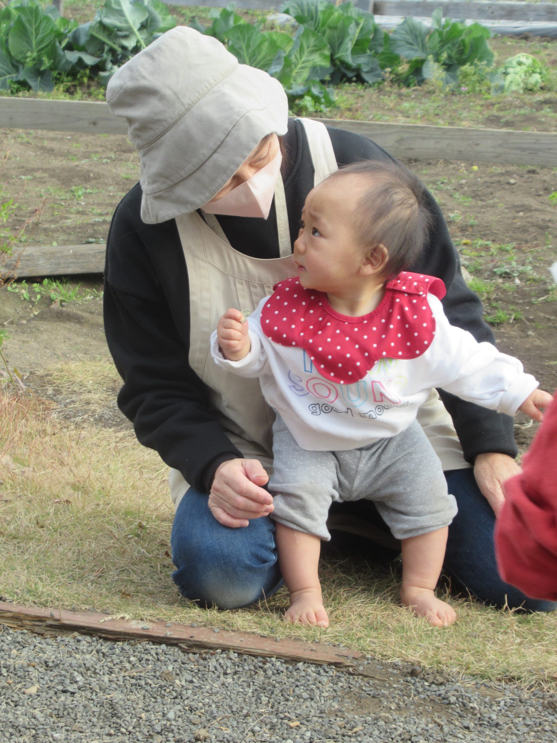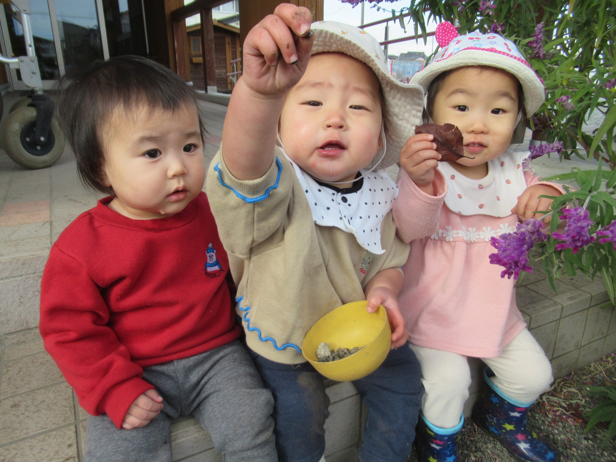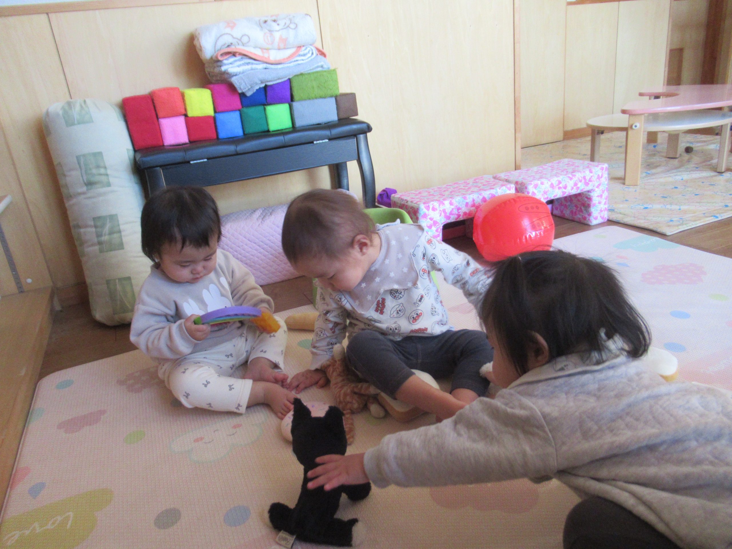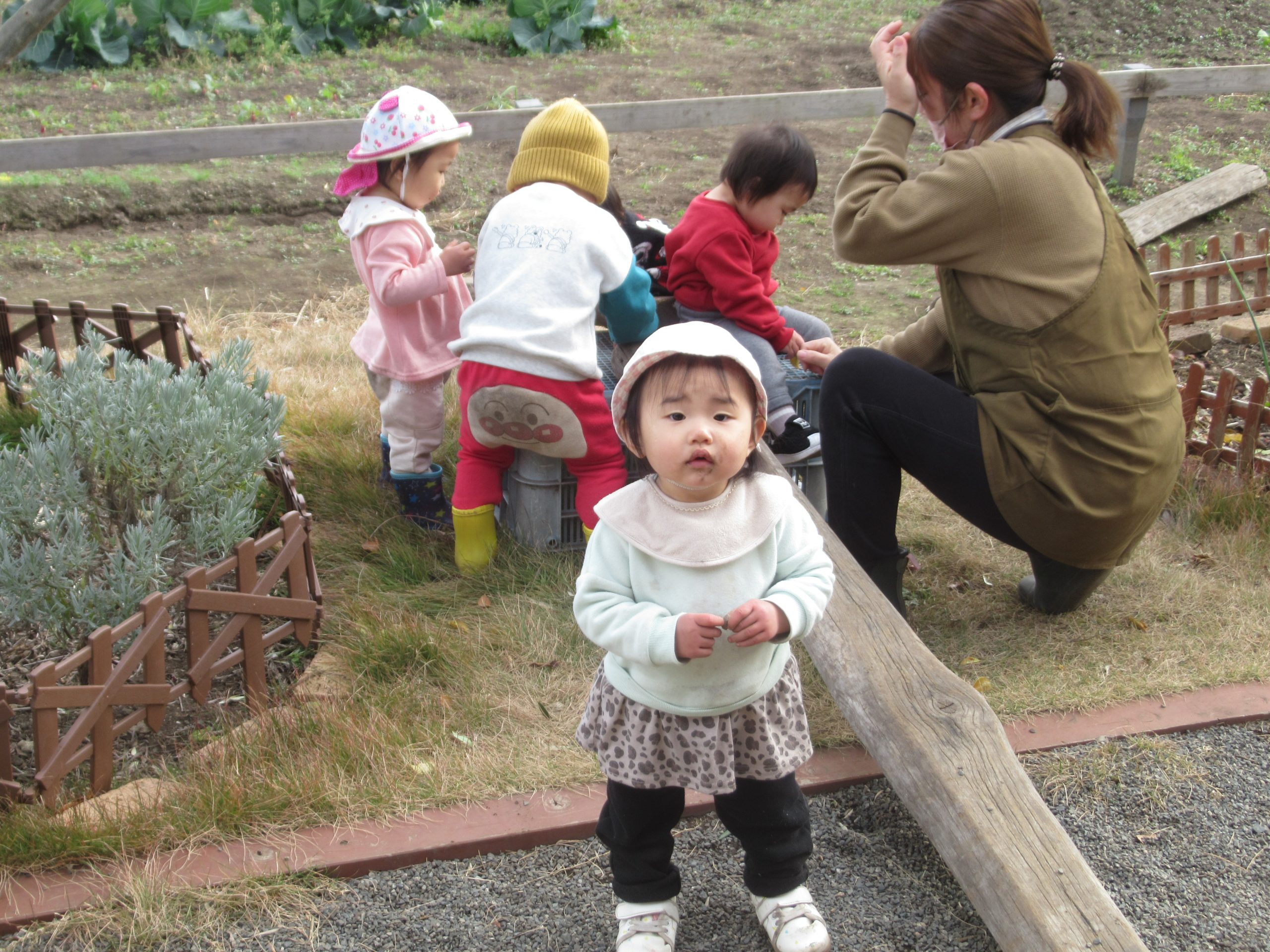 日差しが隠れると、厳しい寒さ到来間近のちょっと寒そうな園庭ですが、ことり組さんはお外が大好きです。先生が「おイスを・・・」と話しだすと最後まで言い切らないうちに、お外に行く気持ちになってソワソワし始めます。にじ・はな組さんの遊んでいるところに行って眺めたり一緒にやったりして、ことり組さんは一か所にとどまらず活発に動き回っています。