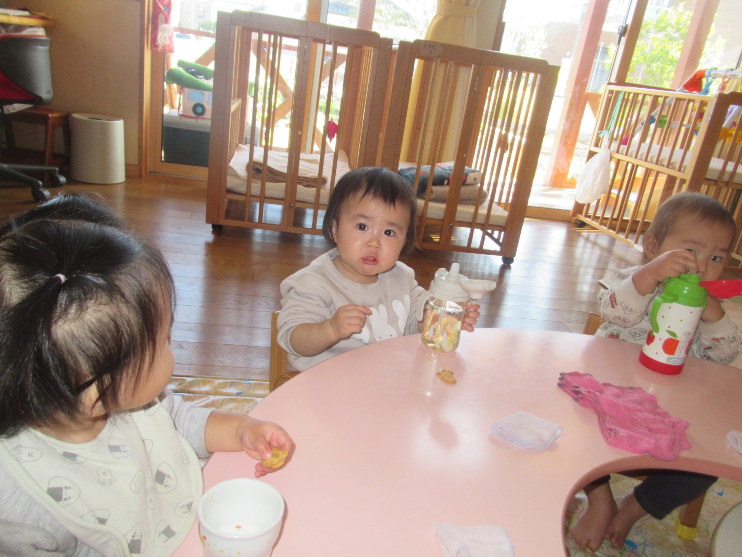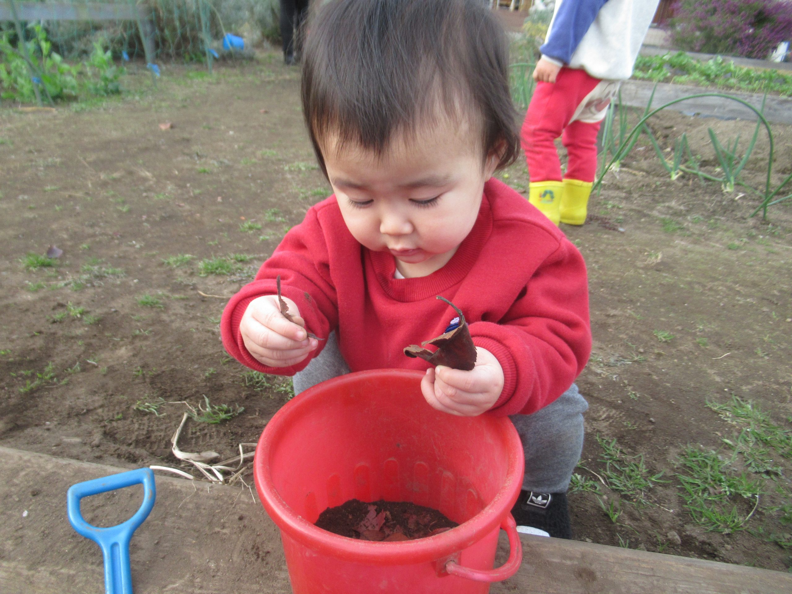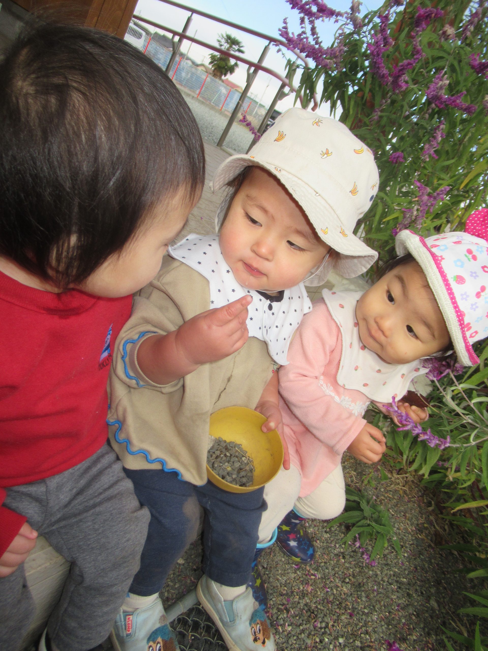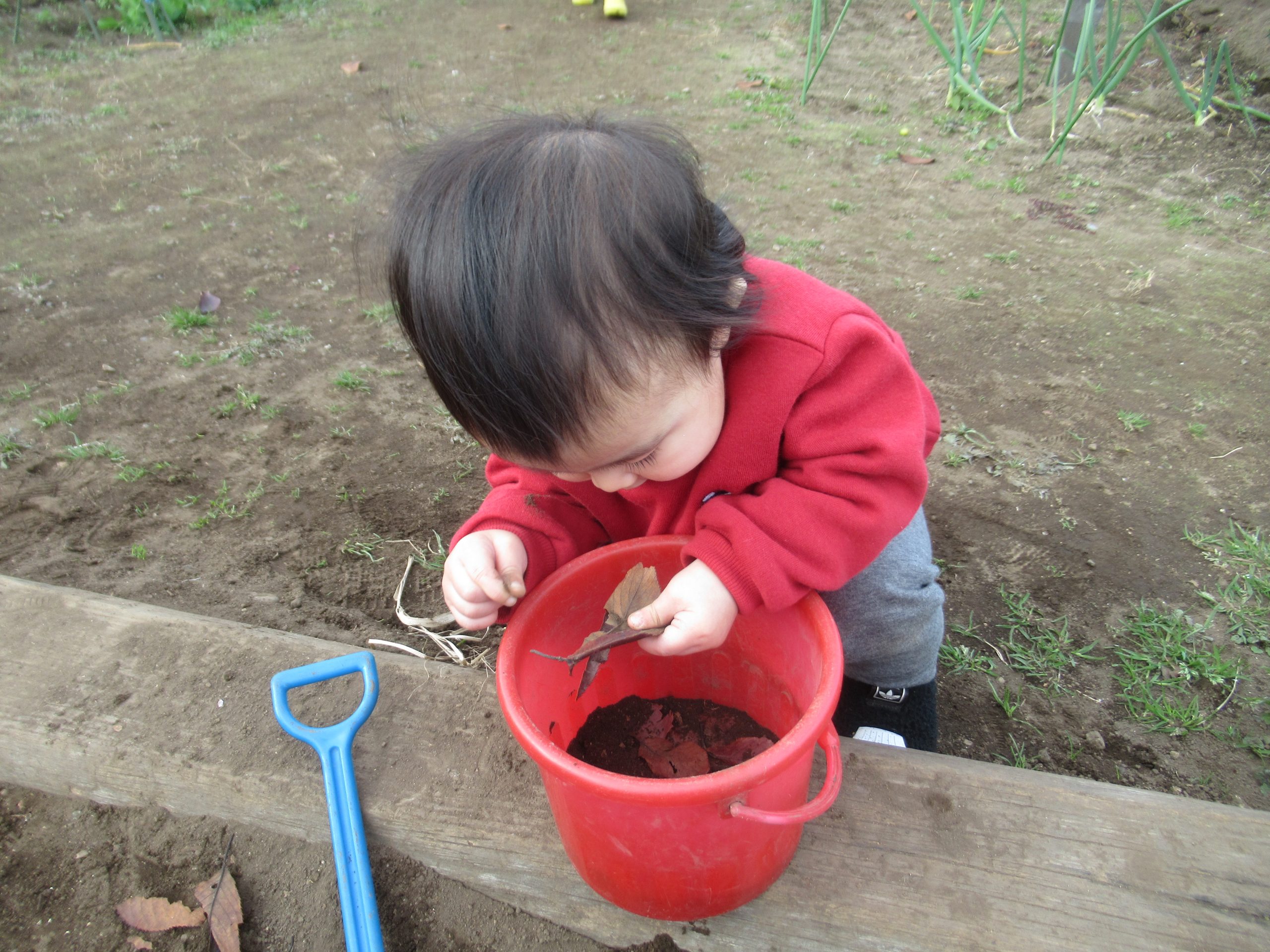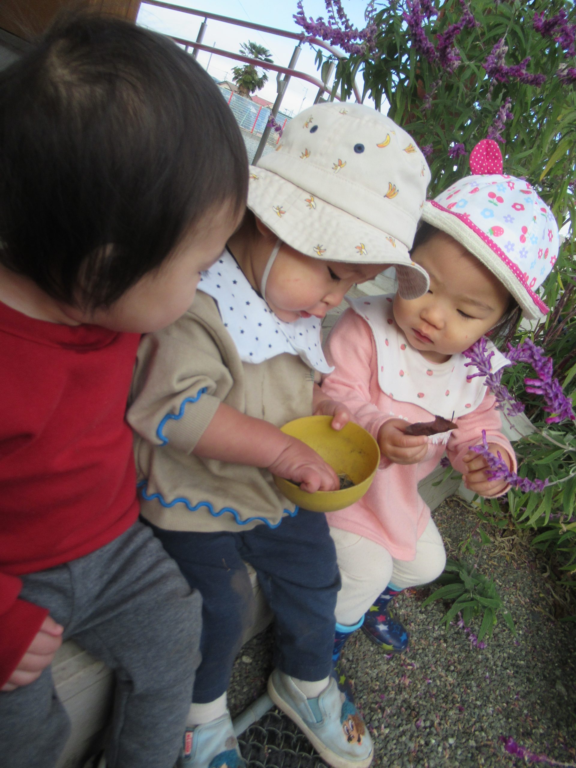 日差しが隠れると、厳しい寒さ到来間近のちょっと寒そうな園庭ですが、ことり組さんはお外が大好きです。先生が「おイスを・・・」と話しだすと最後まで言い切らないうちに、お外に行く気持ちになってソワソワし始めます。にじ・はな組さんの遊んでいるところに行って眺めたり一緒にやったりして、ことり組さんは一か所にとどまらず活発に動き回っています。