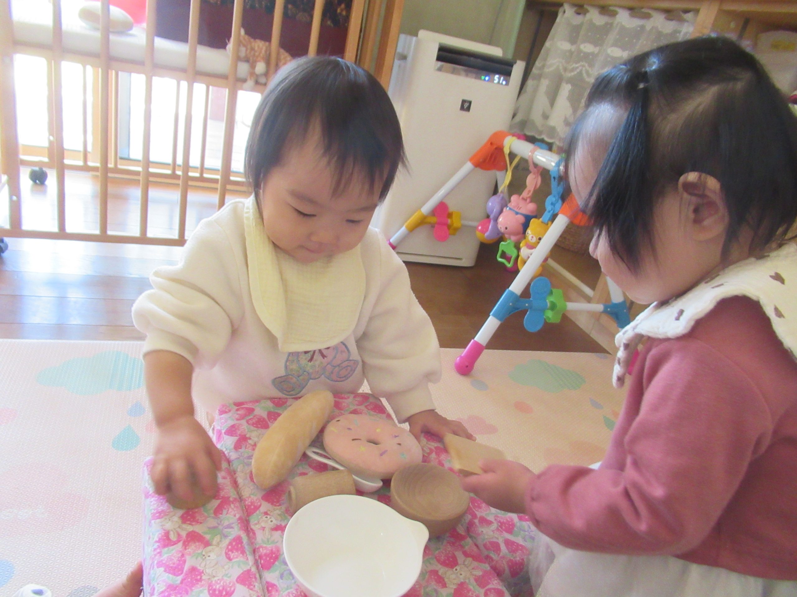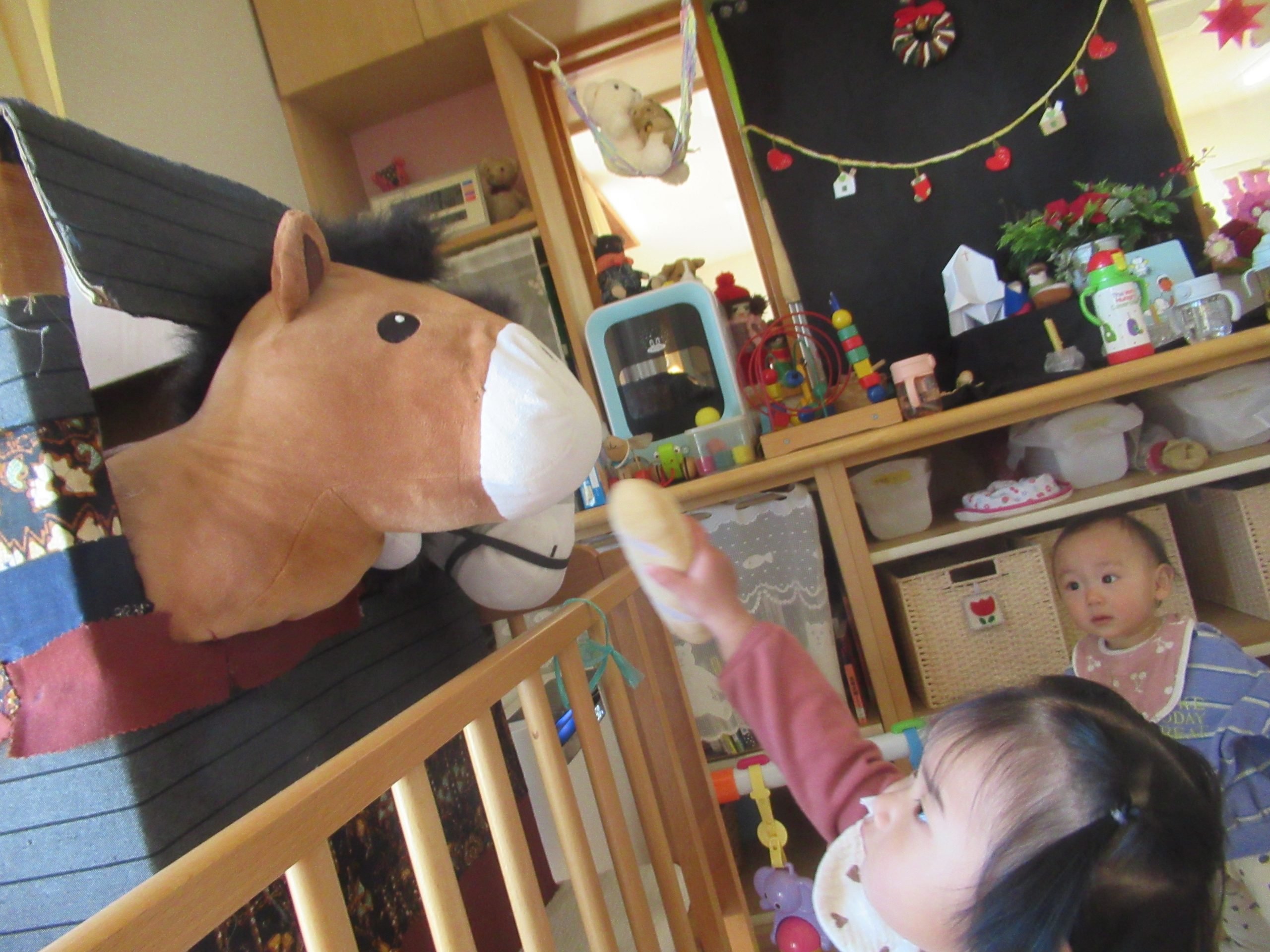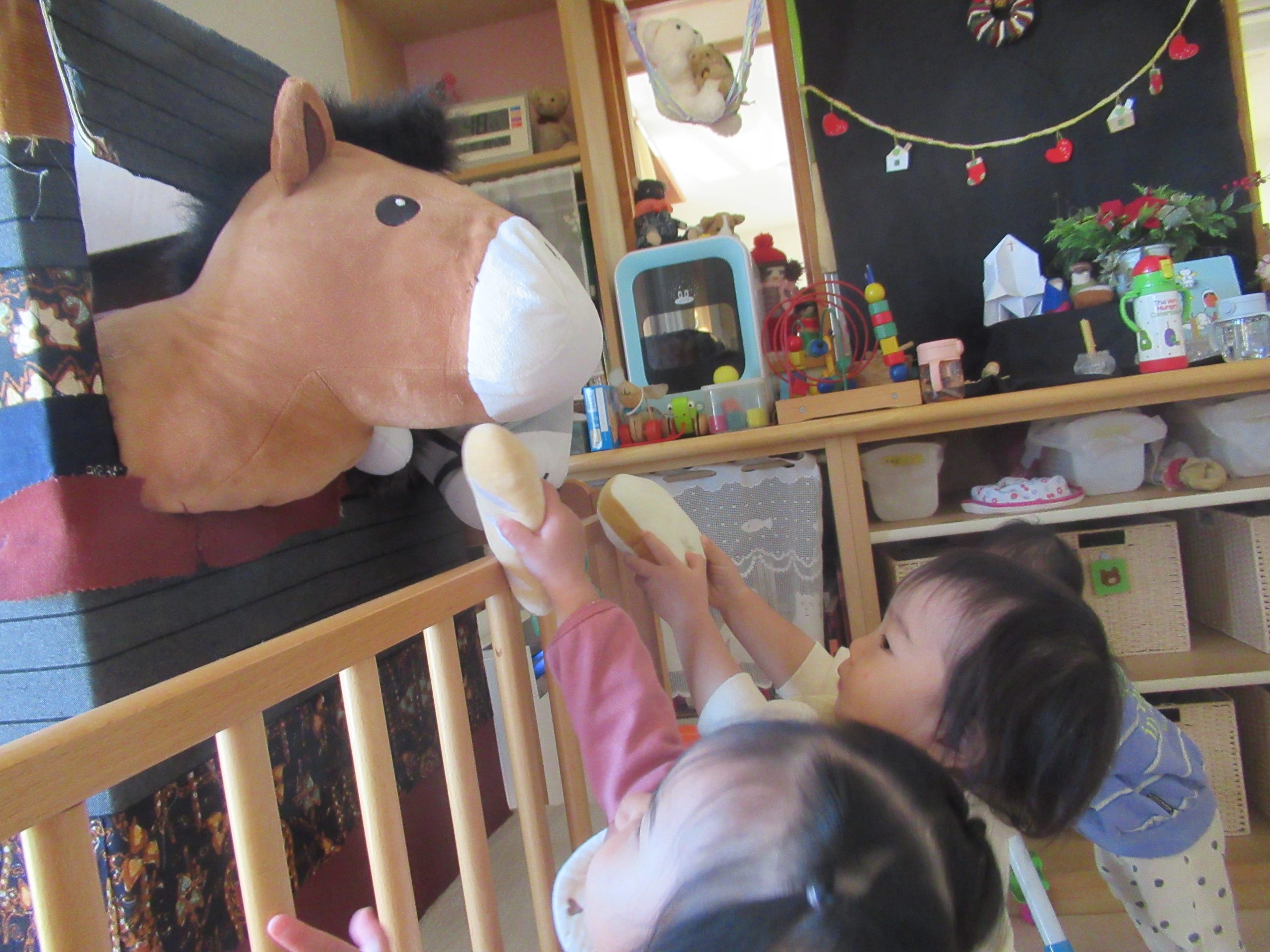 「はい どうぞ」EちゃんとRちゃんがことり組のお部屋に突然現れたロバさんたちに餌をあげようと背伸びをして、一所懸命手を伸ばしています。いつもしているままごとで、お部屋にいるぬいぐるみの猫ちゃんにご飯をやって遊んでいたので、“ロバちゃんも一緒”と自然に思ったようです。