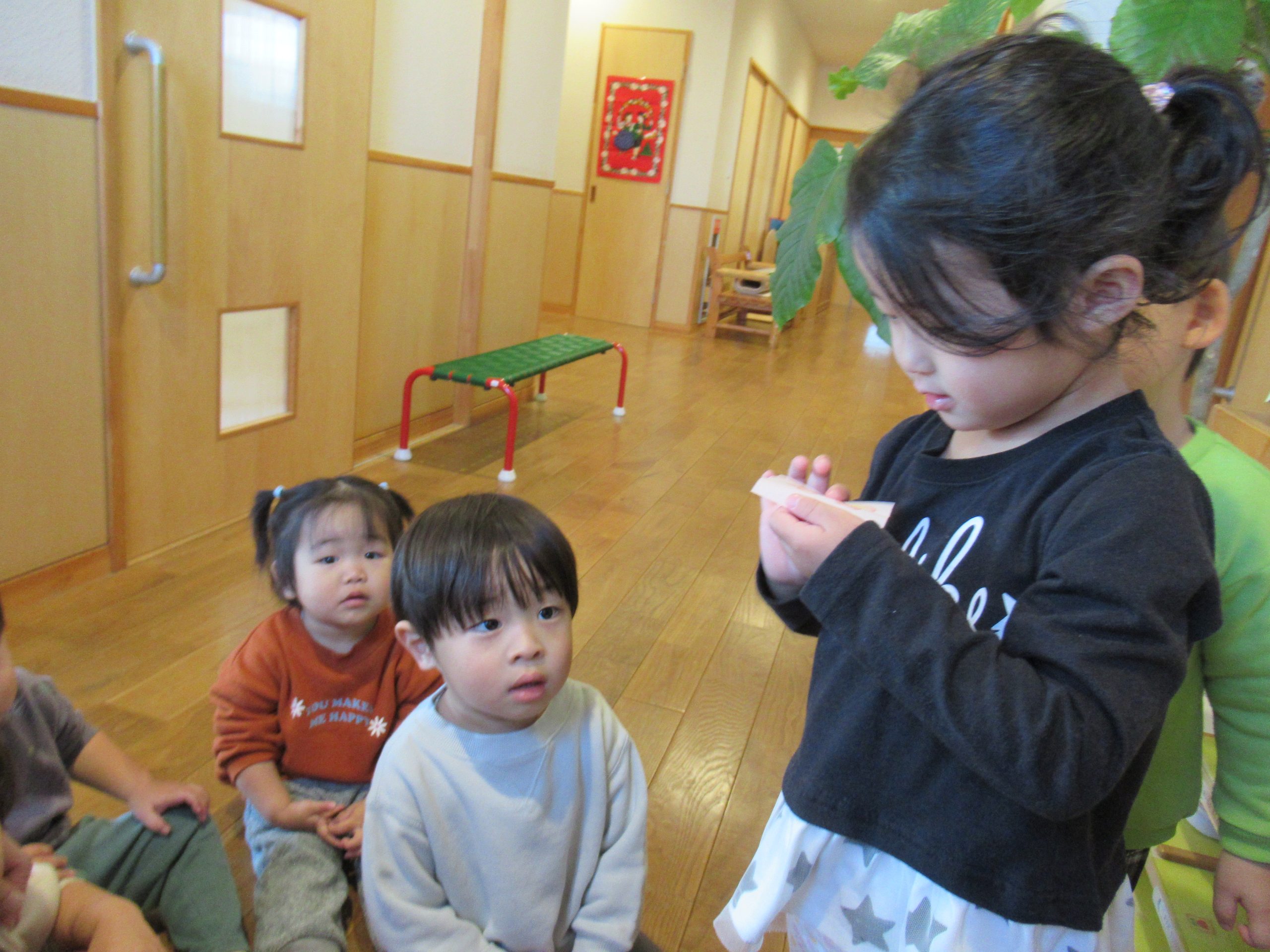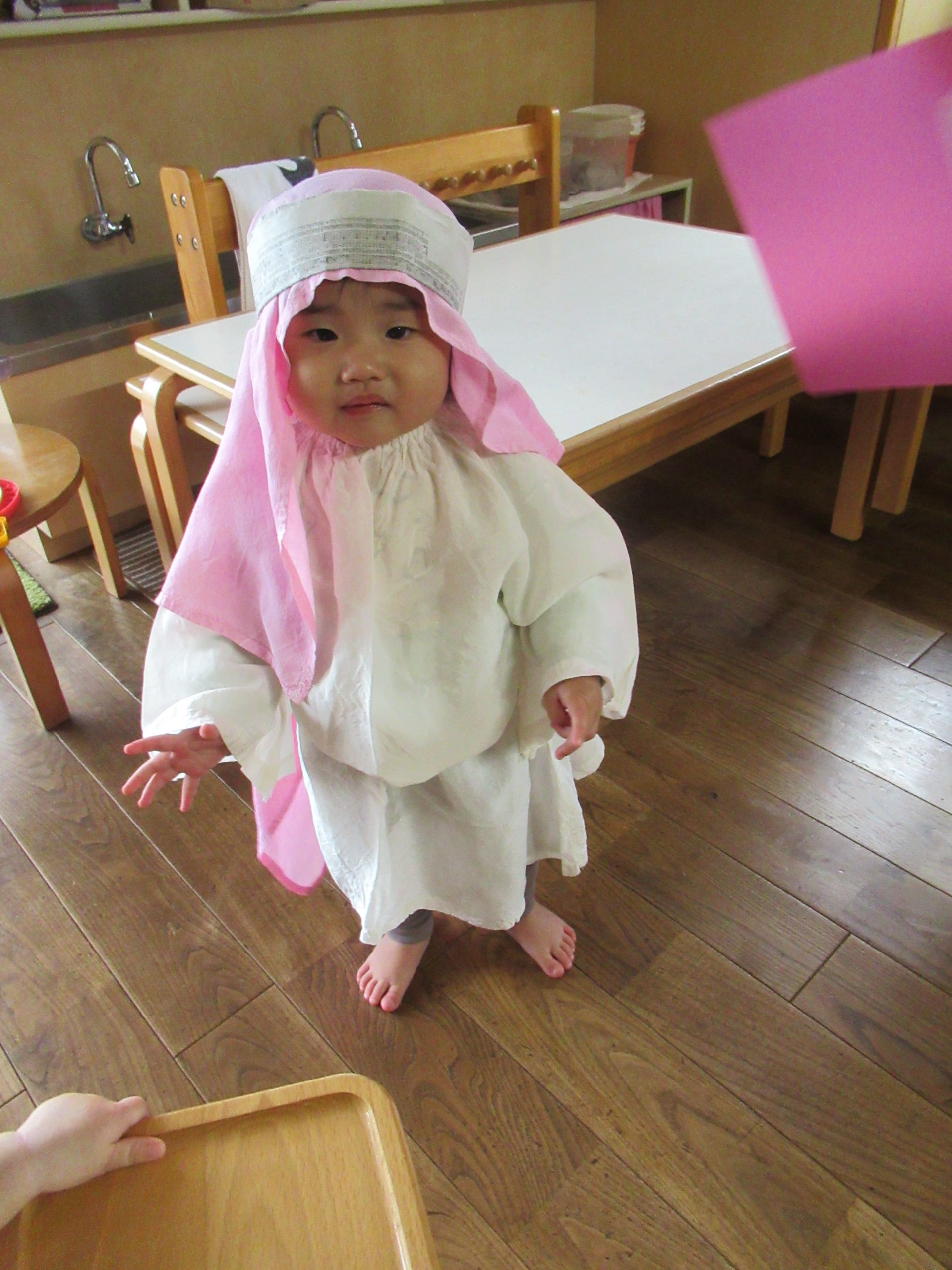 聖誕劇の衣装を着けたり、玄関に飾ってあるアドベントカレンダーを開いたりして、クリスマスが近づいていることを実感している子どもたちです。カレンダーになっている引き出しを開けると・・・自分たちが食べるおやつの絵が描かれていています。「自分が開ける順番はいつかな?」焦る気持ちを押さえて順番を守っていますが、🎁待つことも楽しで、「わくわく」している気持ちが伝わります。