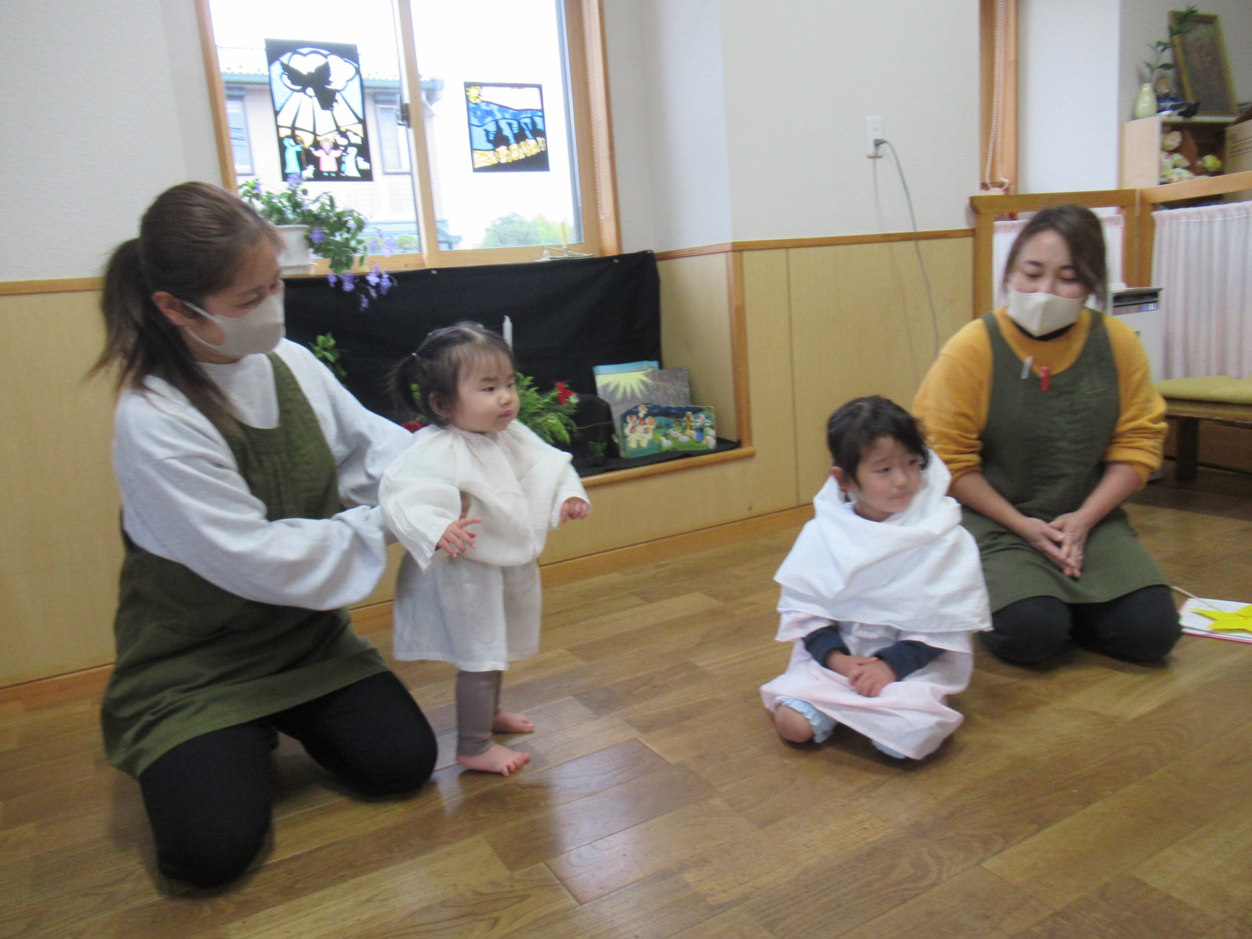 お野菜や果物の持ち寄りのご協力ありがとうございました。自分で持ってきたものを嬉しそうに飾る子どもたち。同じ種類のものの場所を見極めて飾っていました。感謝の礼拝の後、ゲームをしたりきのこのダンスをしたり、これまで作った制作物でお買い物ごっこをして楽しみました。お捧げしたものは給食に使用させていただきます。また今年も、ご近所にもお分けして神さまからの恵みを分かち合いました。