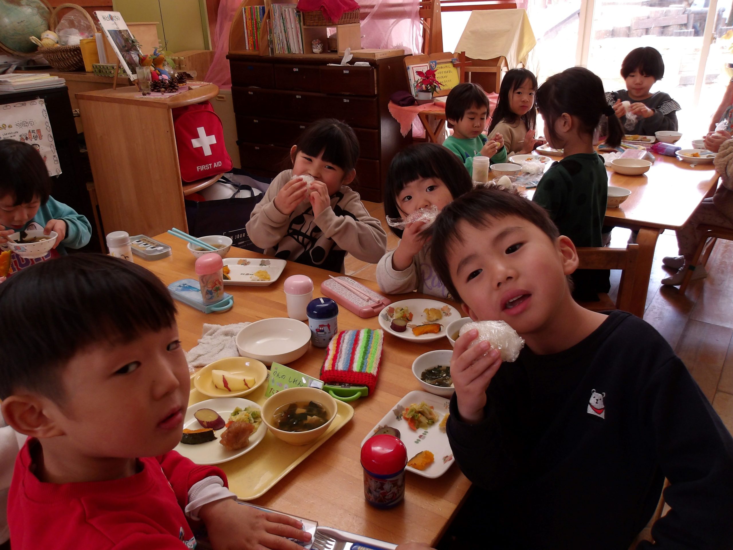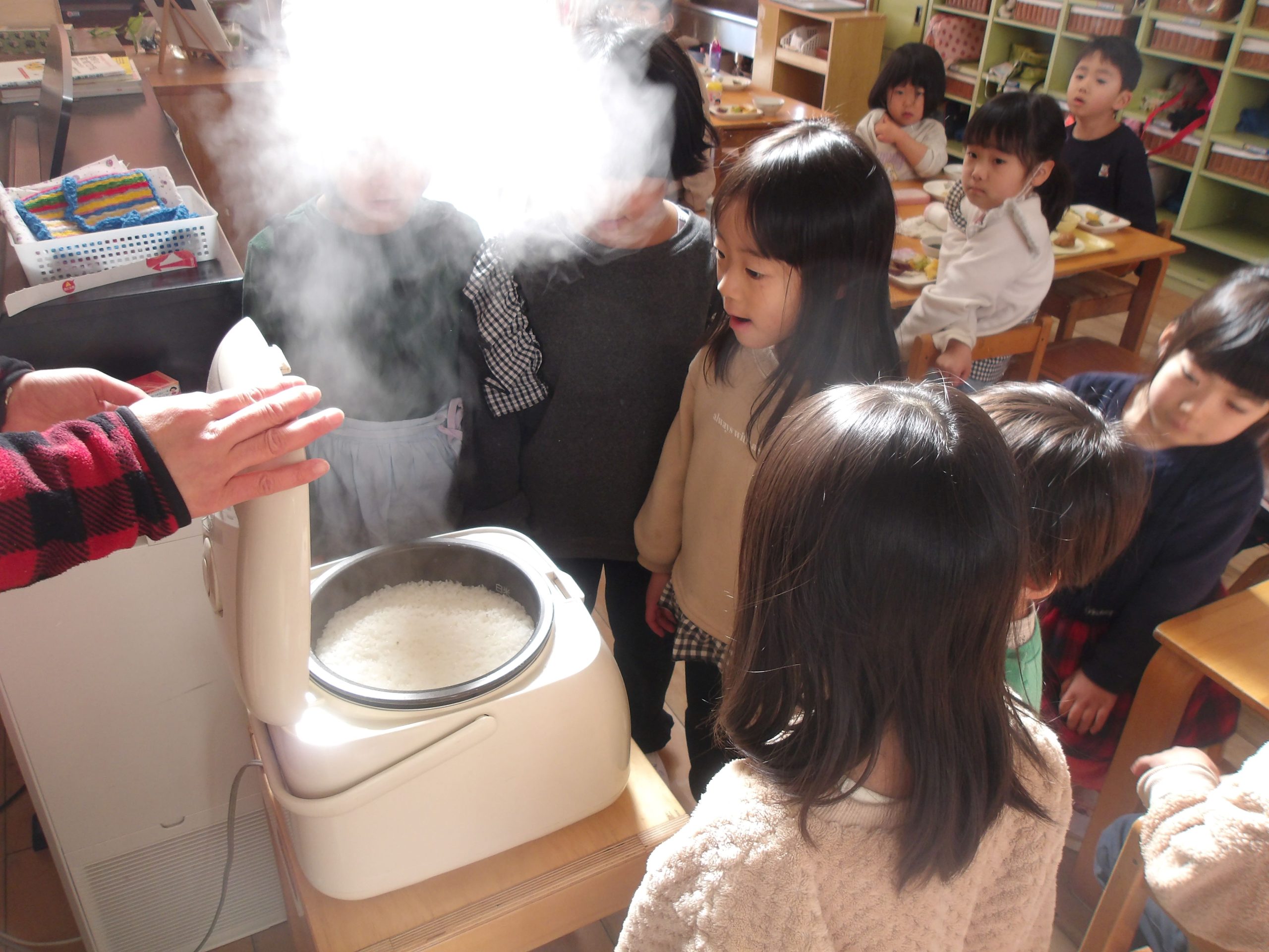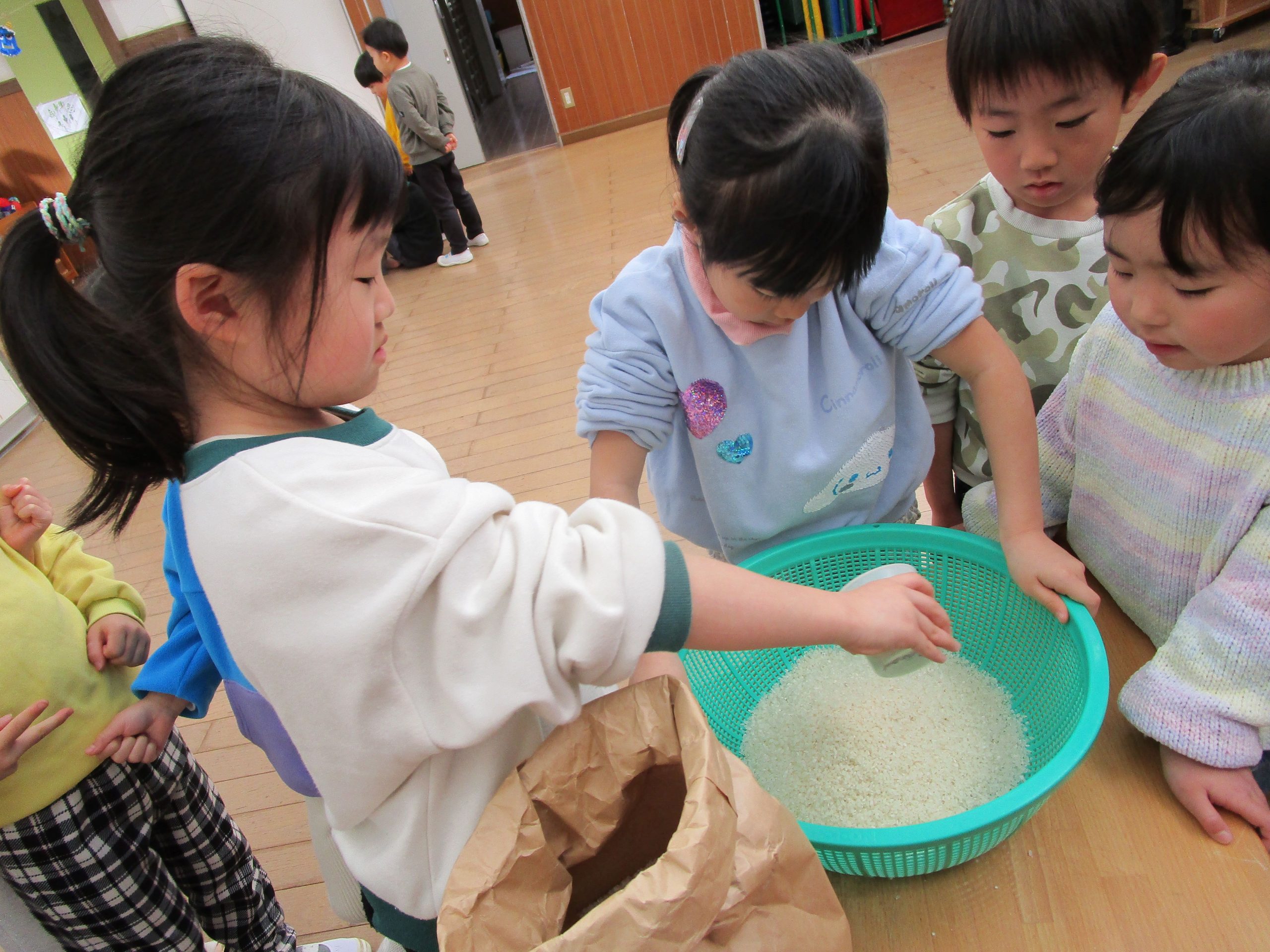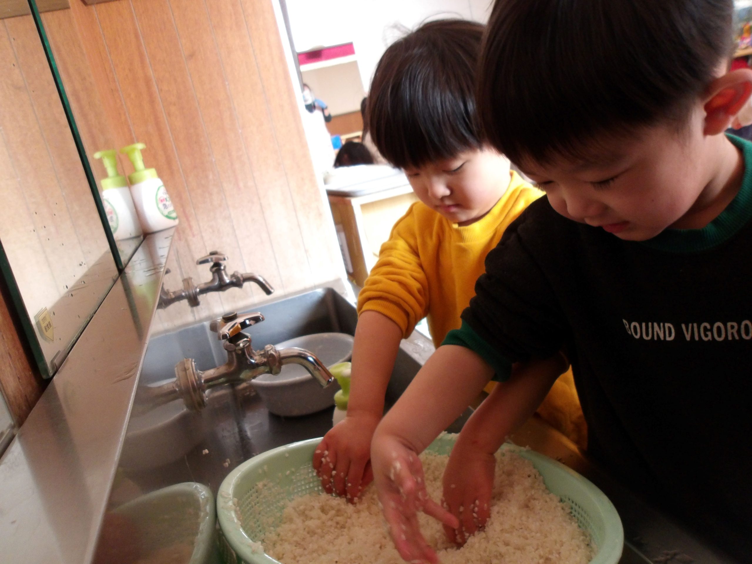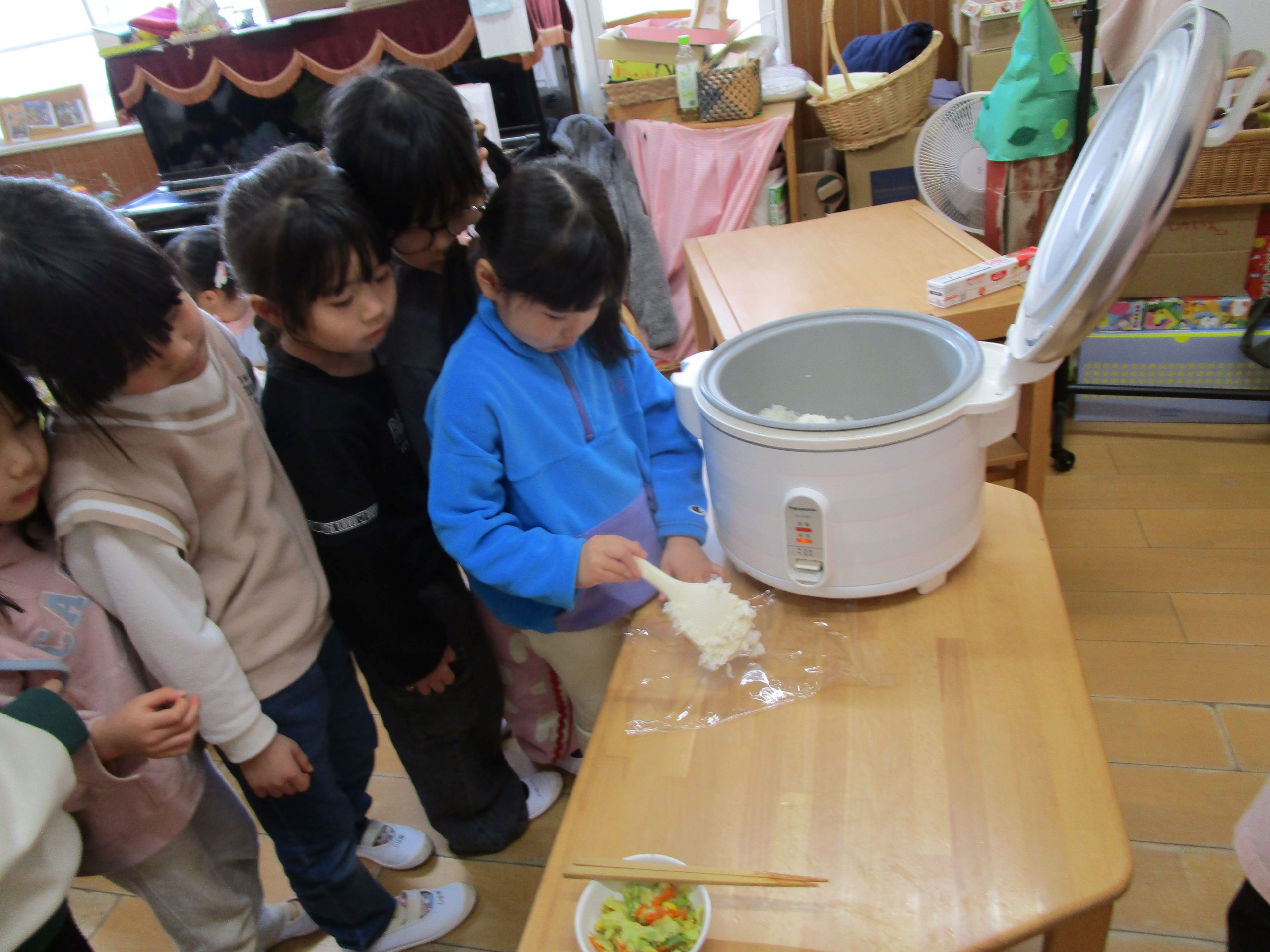聖和保育園さんからいただいたお米でおにぎりパーティーをしました。各クラスでお米を測って研ぎ、炊きあがる時間を計算して炊飯スイッチを入れました。炊きあがる前と後でのお米の様子が違いを見たり、炊き立ての匂いに「美味しいにおいー」とワクワクしたり。ラップにご飯をのせ、自分で握ったおにぎりは格別に美味しかったようです。