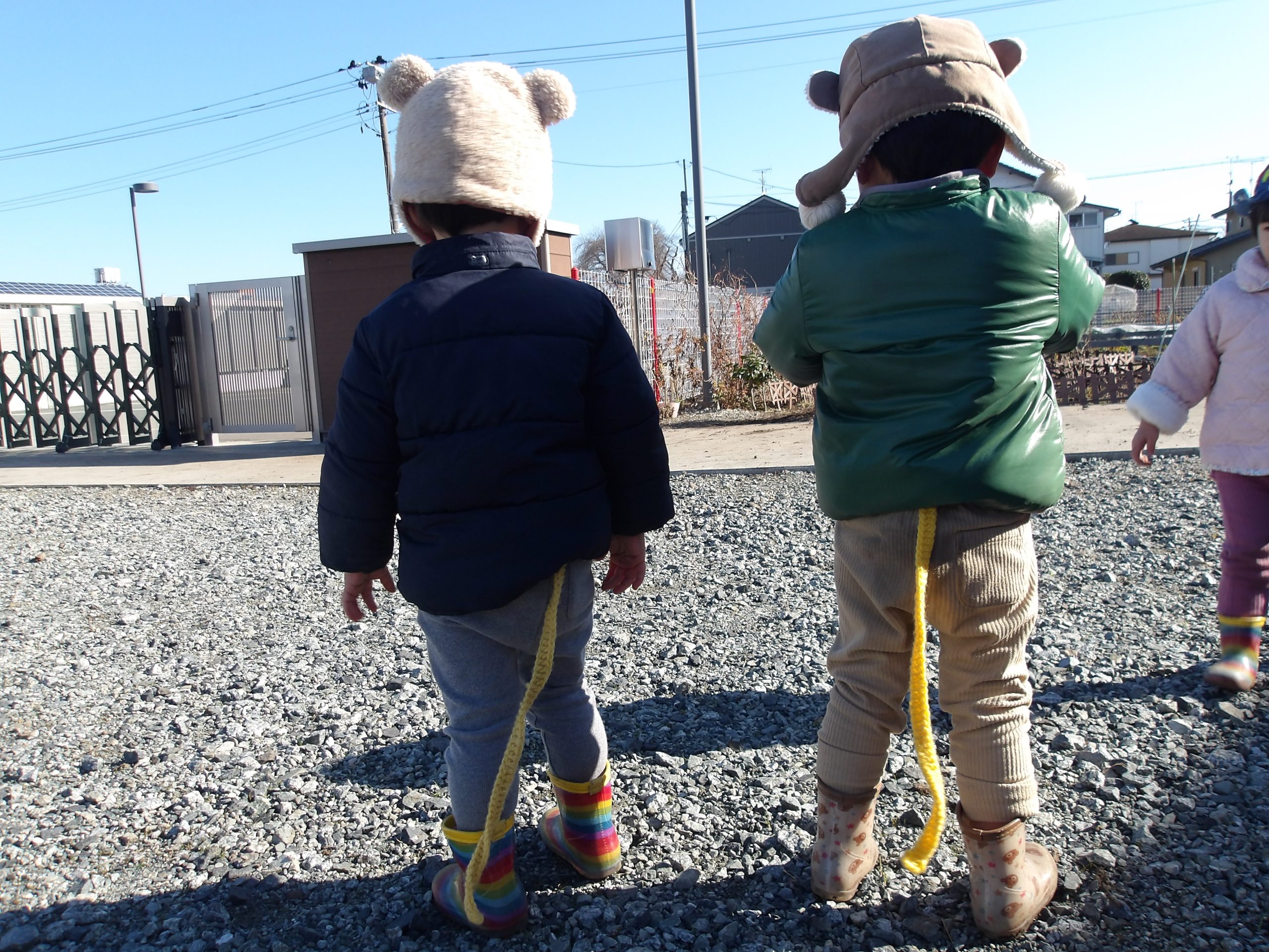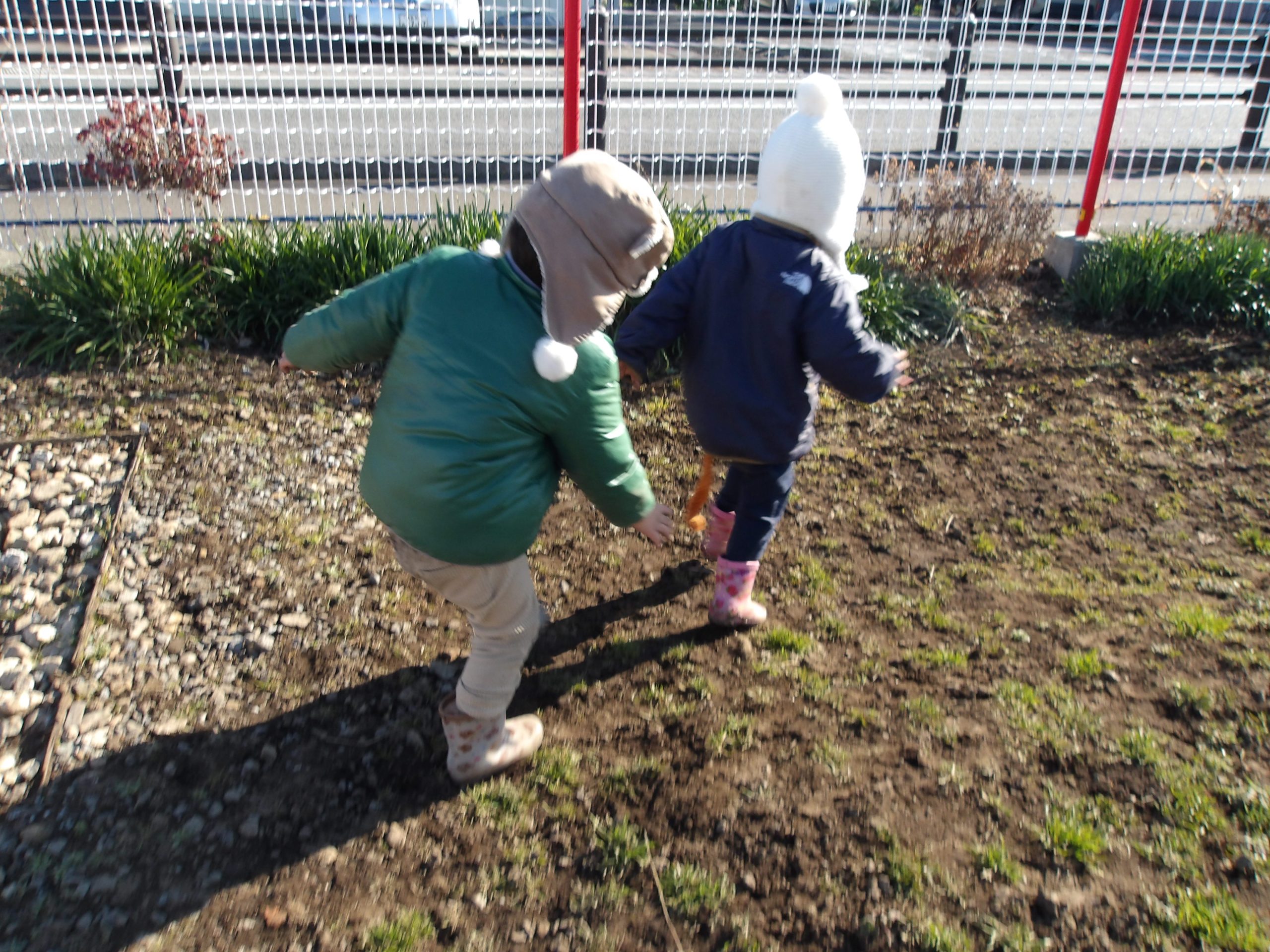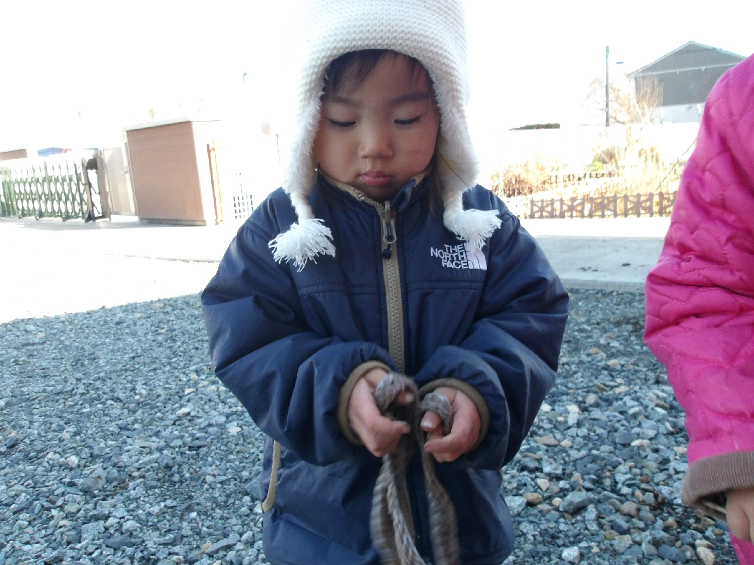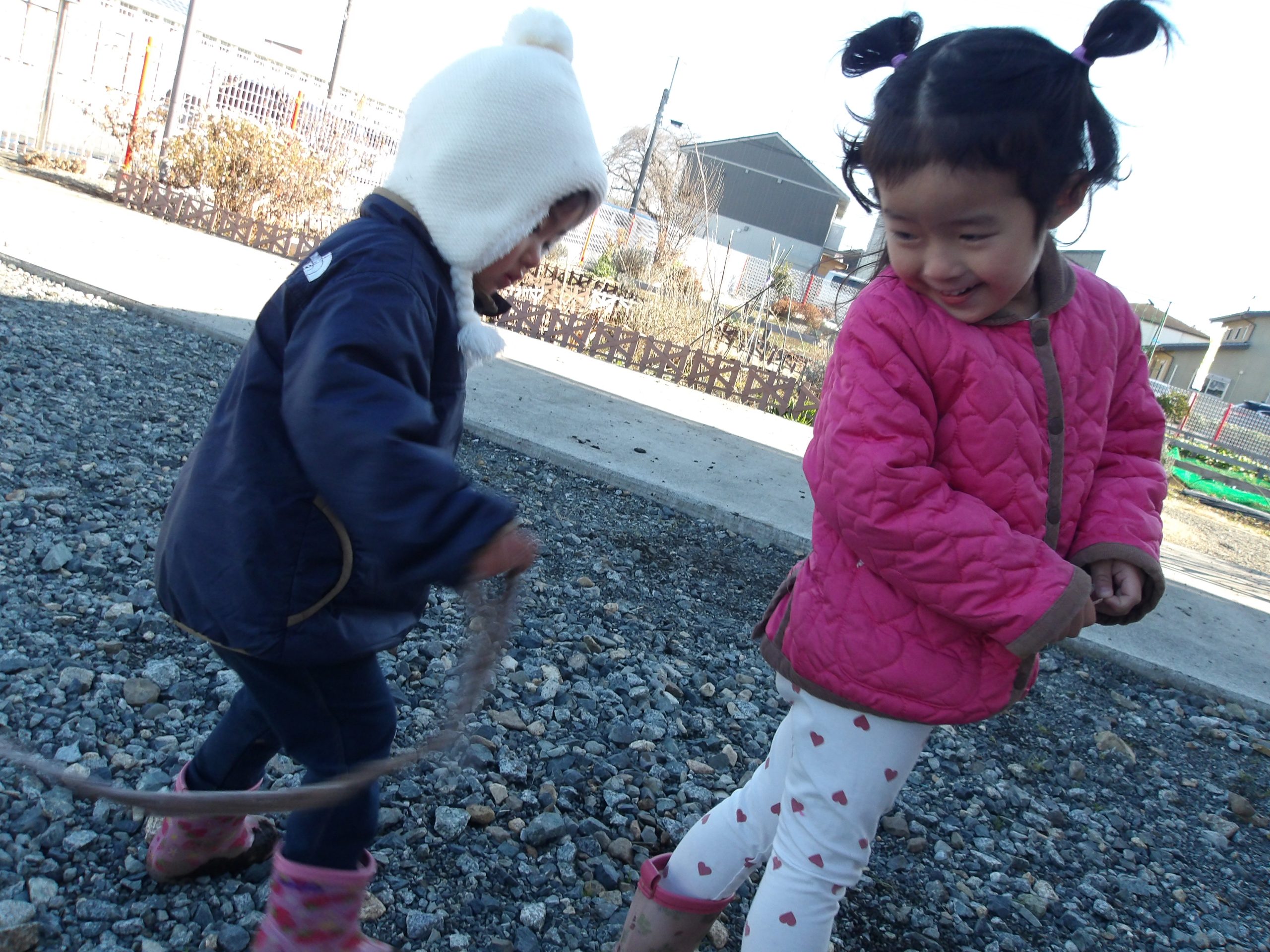 しっぽ取りをして遊びました。しっぽを取られたのにも気づかずに、逃げることそのものを喜ぶ子どもたち。取られても嬉しいAちゃん。取ってみたしっぽを手にして、不思議そうに眺めるSちゃん。嬉しいよりも「とっちゃったけど・・・どうしよう」、と戸惑っているのでしょうか。