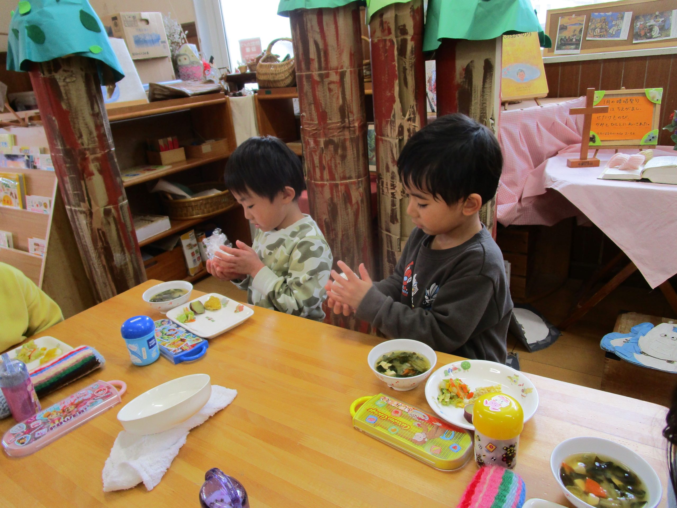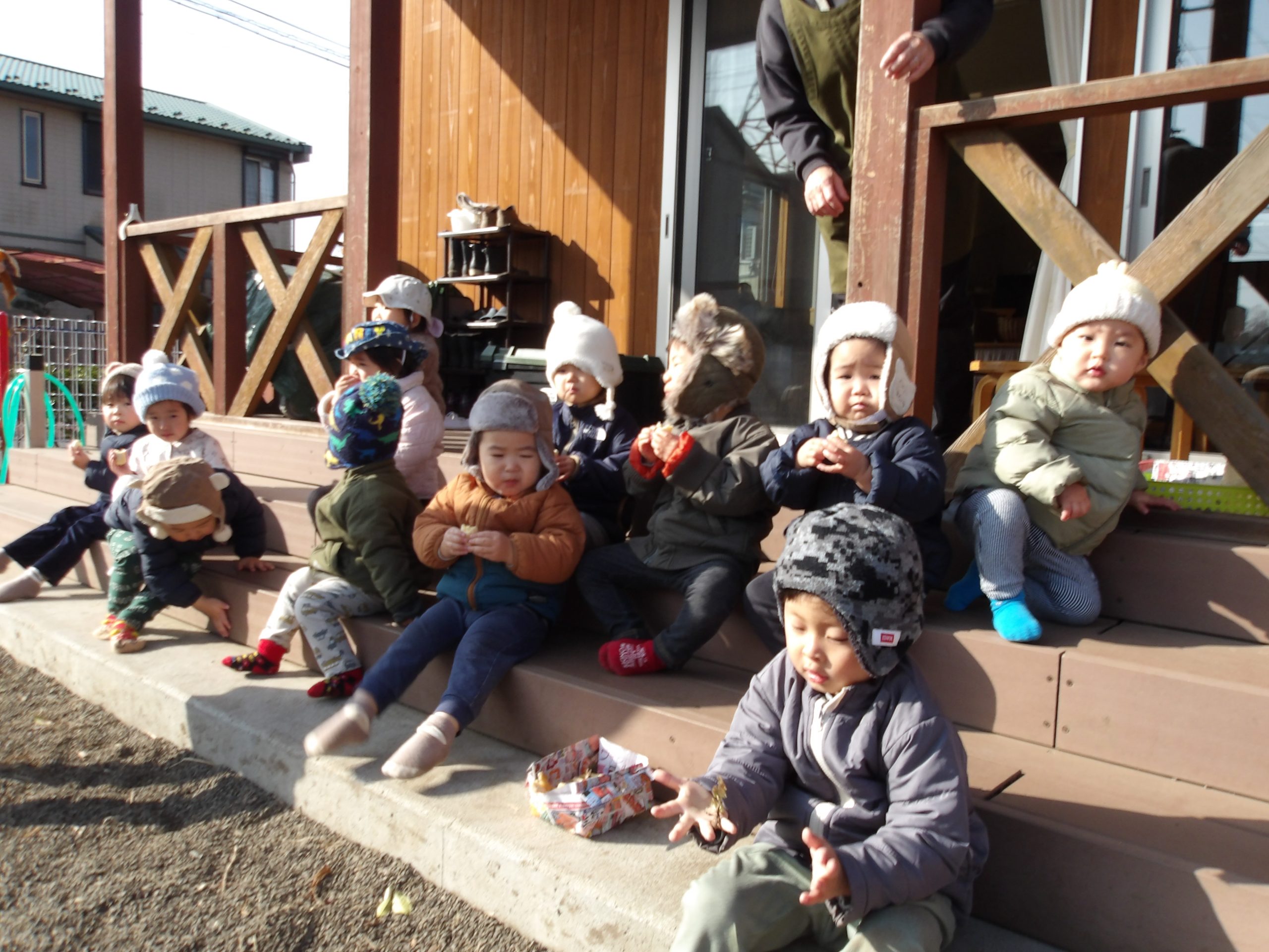 少しだけ寒さが緩んで、今日はお外でおやつ。おやつを食べたら先生の畑仕事(スコップを使って)のお手伝いがある! とやる気満々のようです。