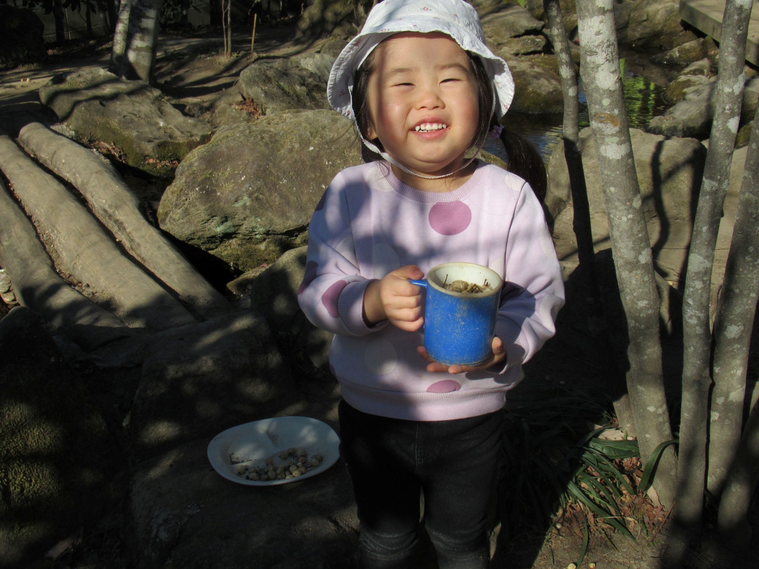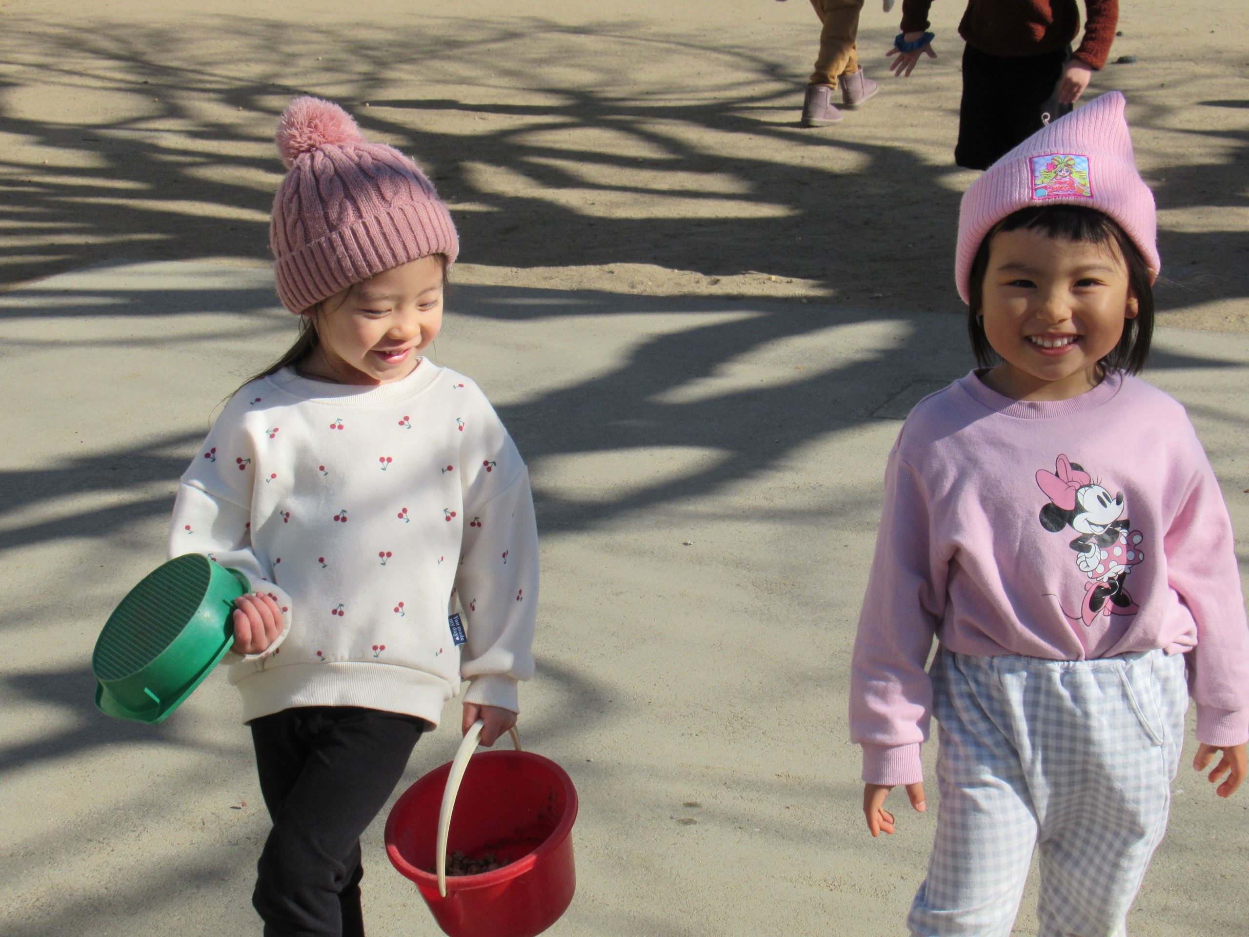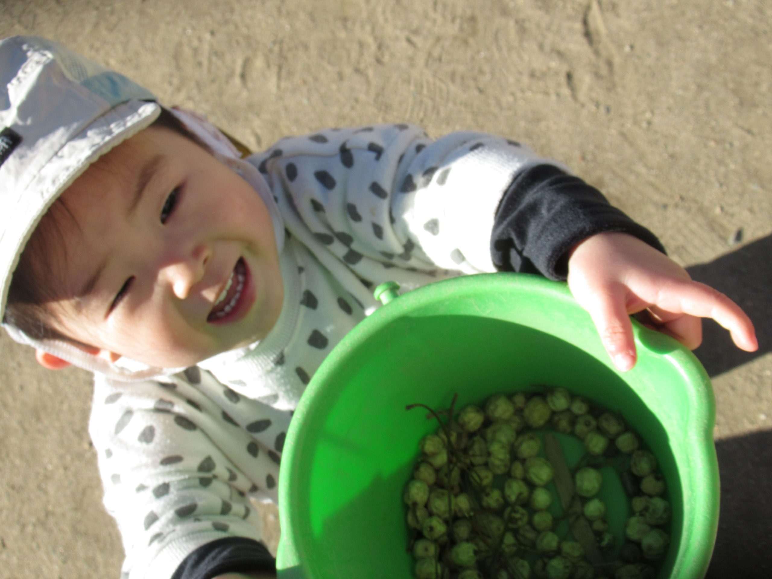 はな組さんが園庭で木の実探し!「どこにいっぱいあるかな?」バケツやコップなど容器を片手にあちらこちら探しまわり、入れ物にたくさん実が集まると「見て!」と満足そうな表情を見せていました。