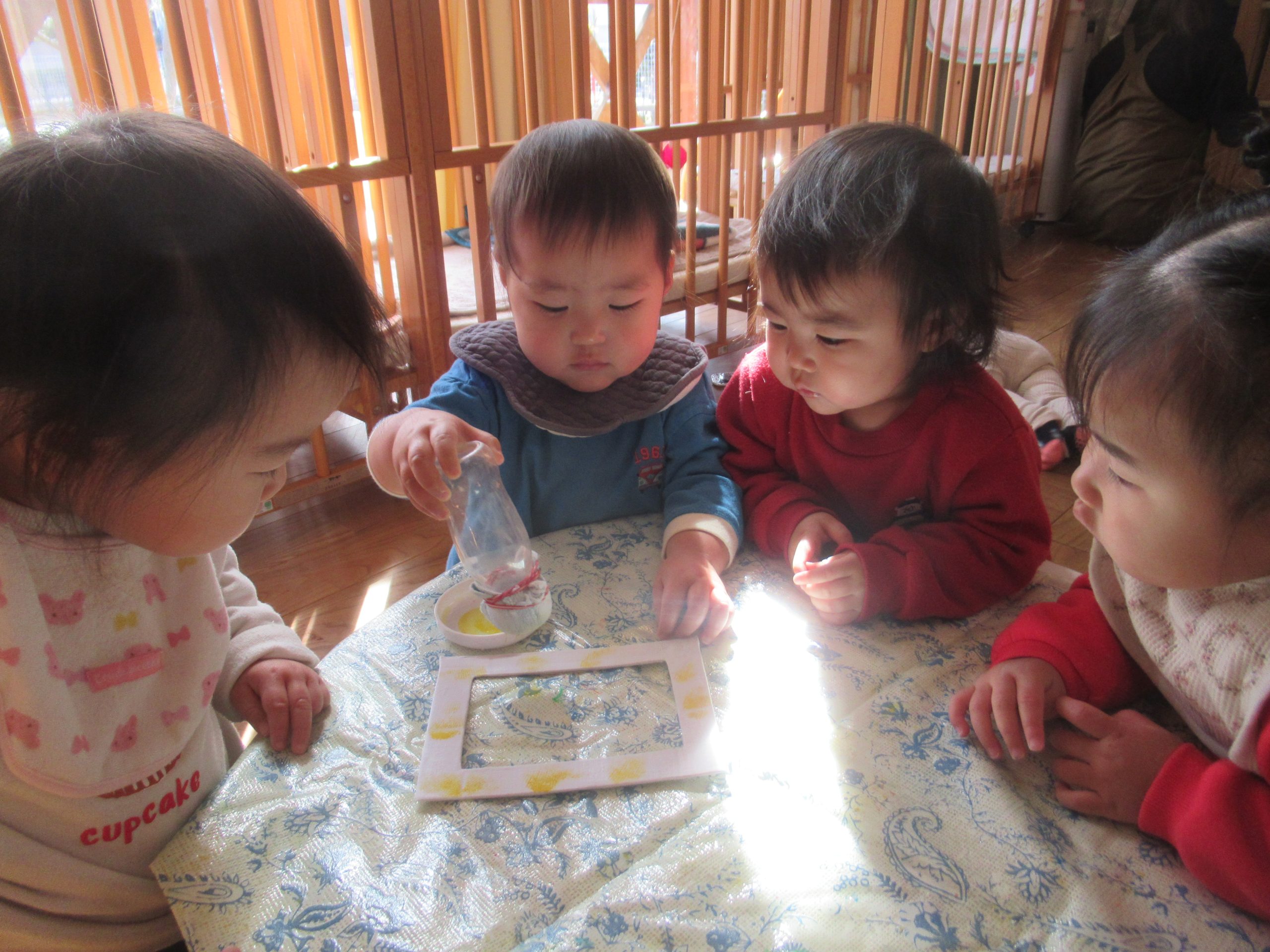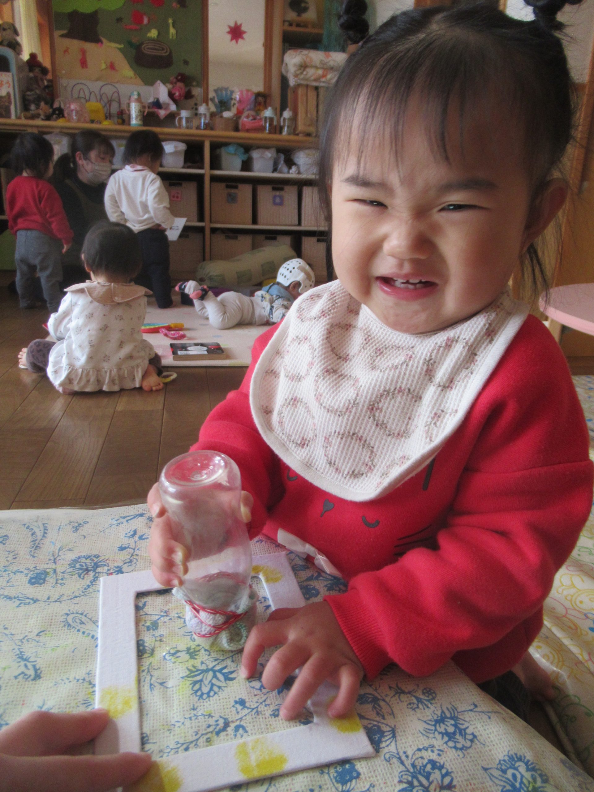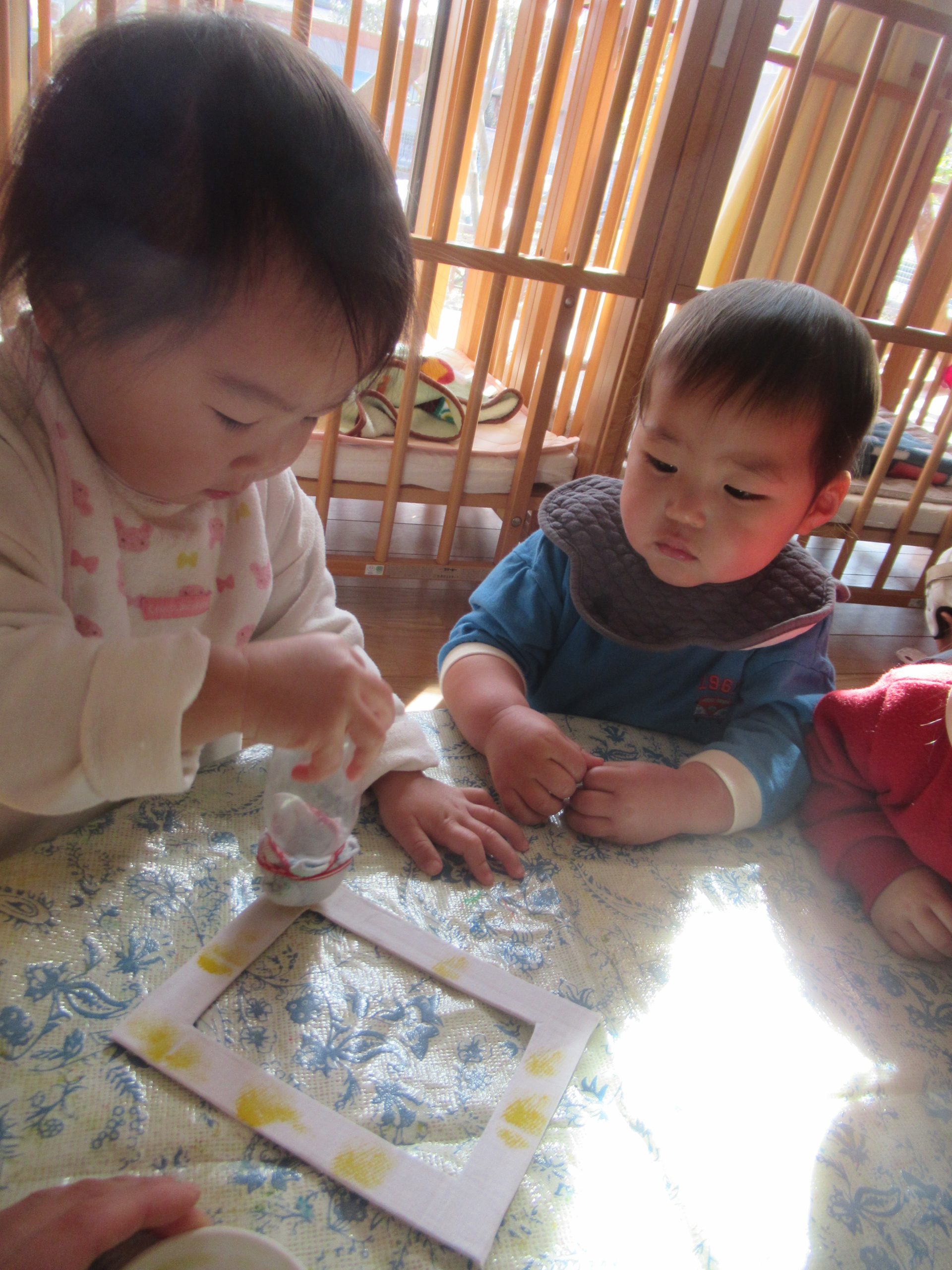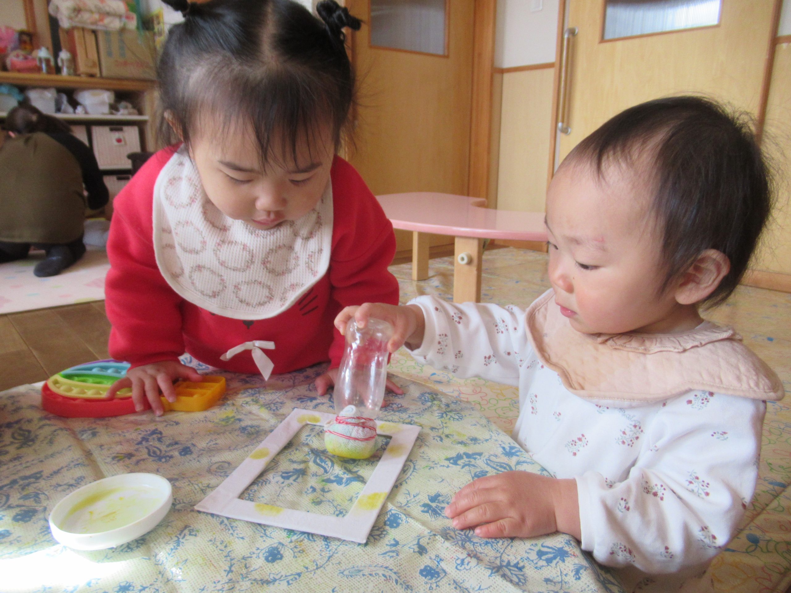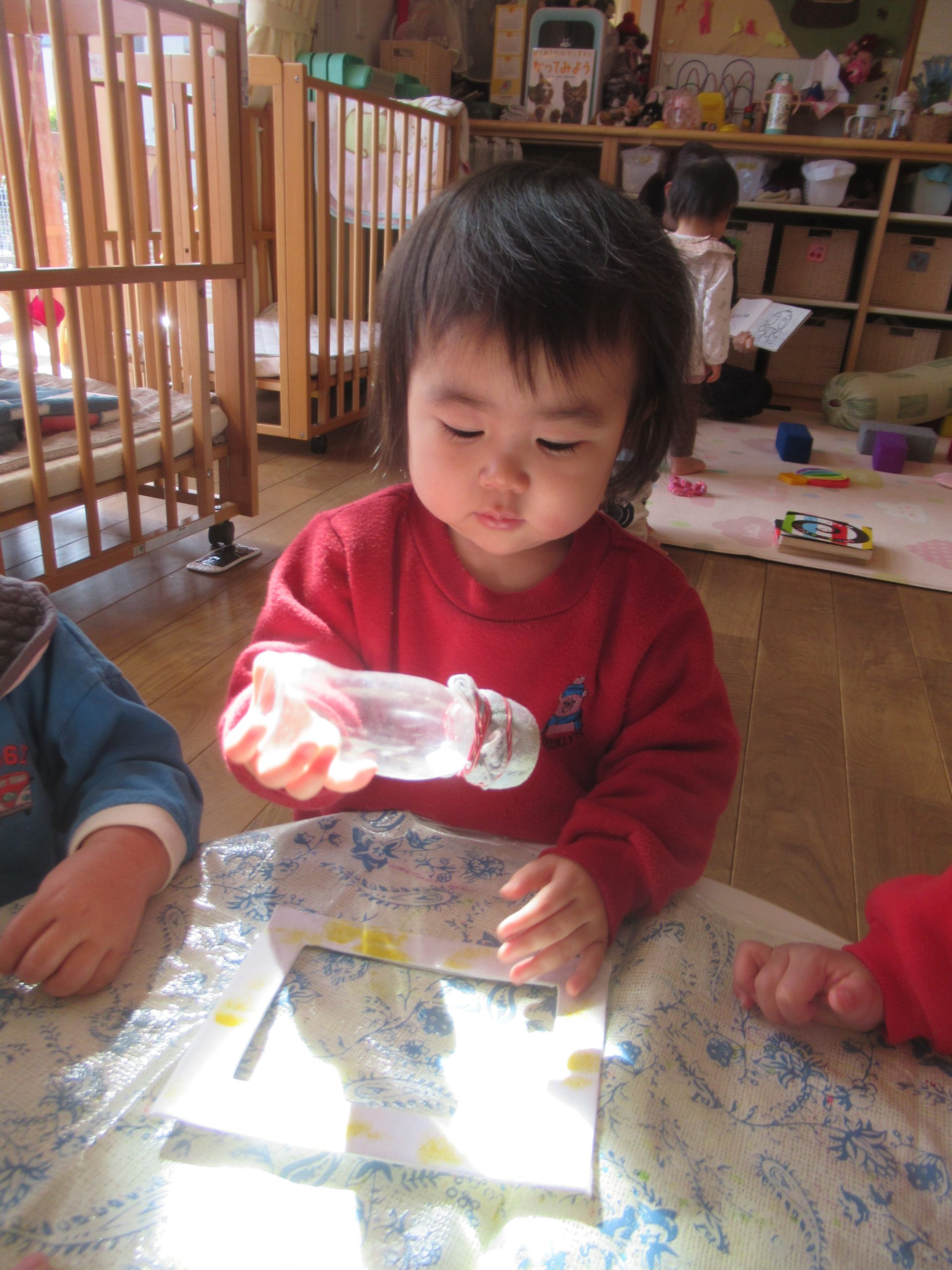 先生やお友だちがやっていることに、興味を示してみています。「やってみる?」と声掛けされて、その気になって向き合いましたが、道具が気になり、どのようになるのかもわからず終始緊張❢のことり組さん。何に出来上がっていくのでしょう。