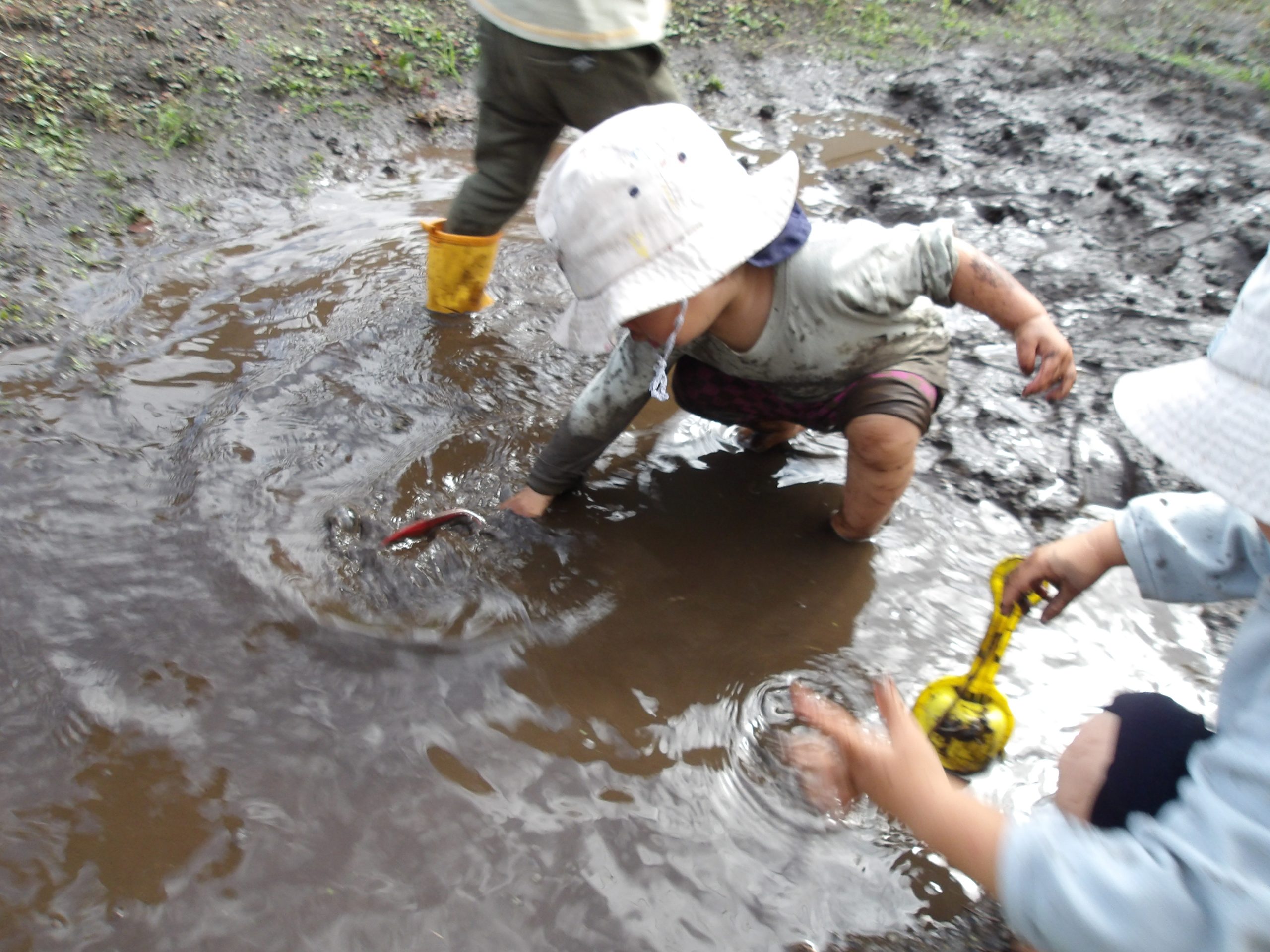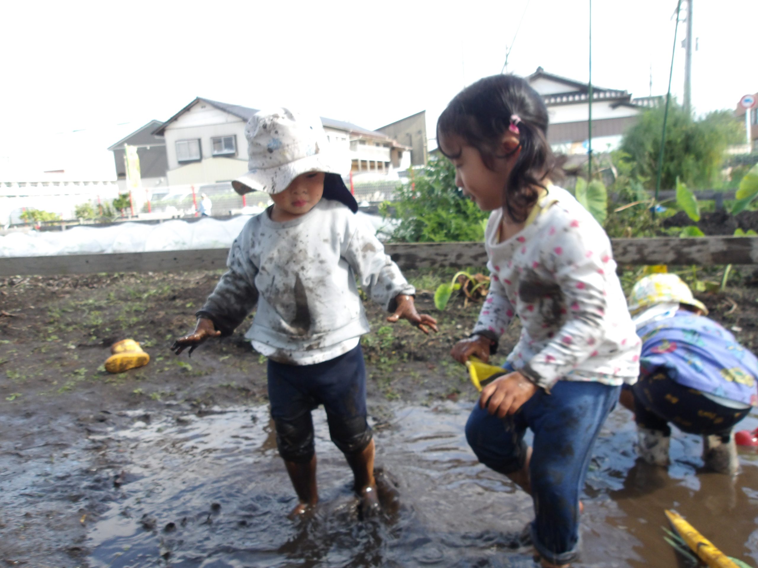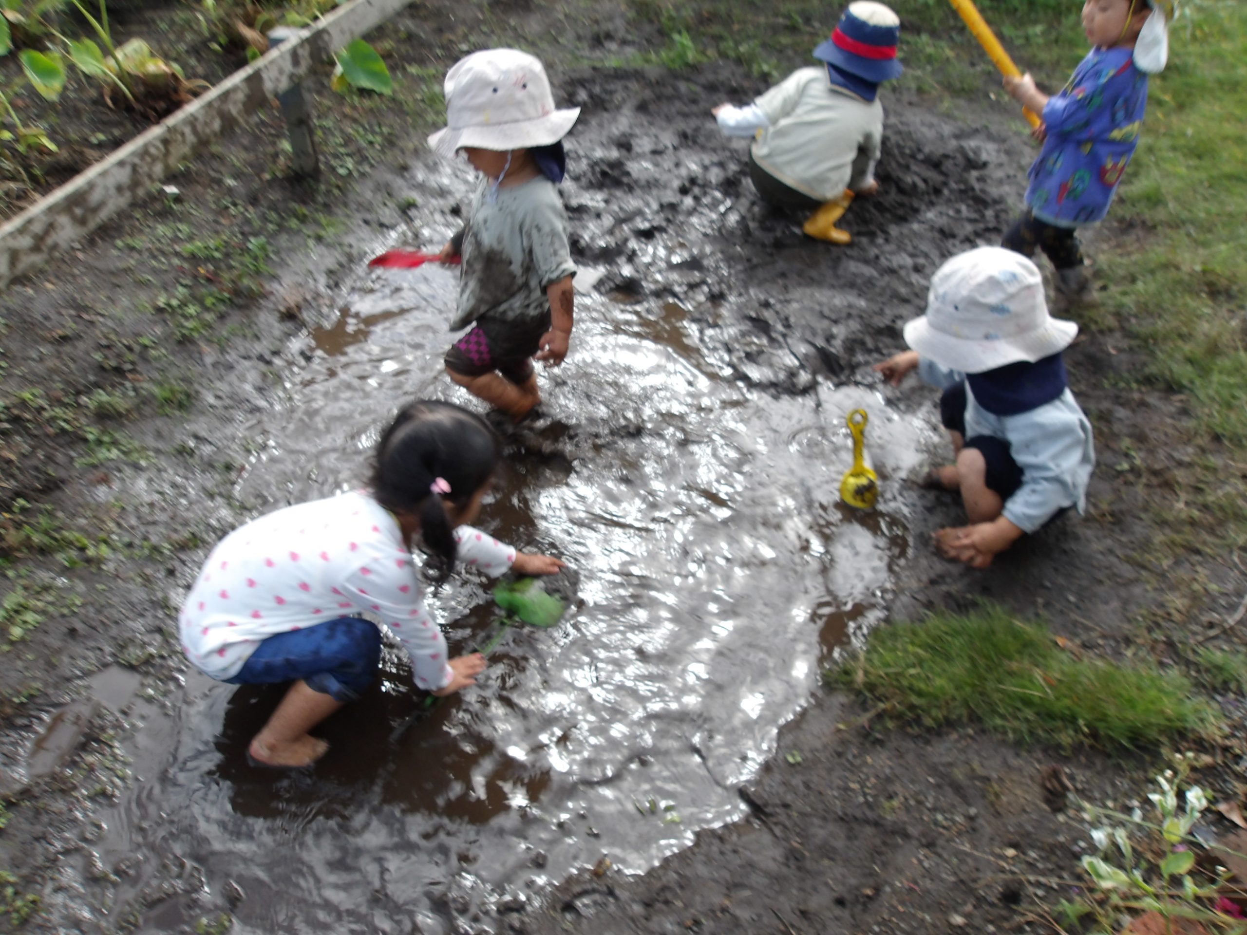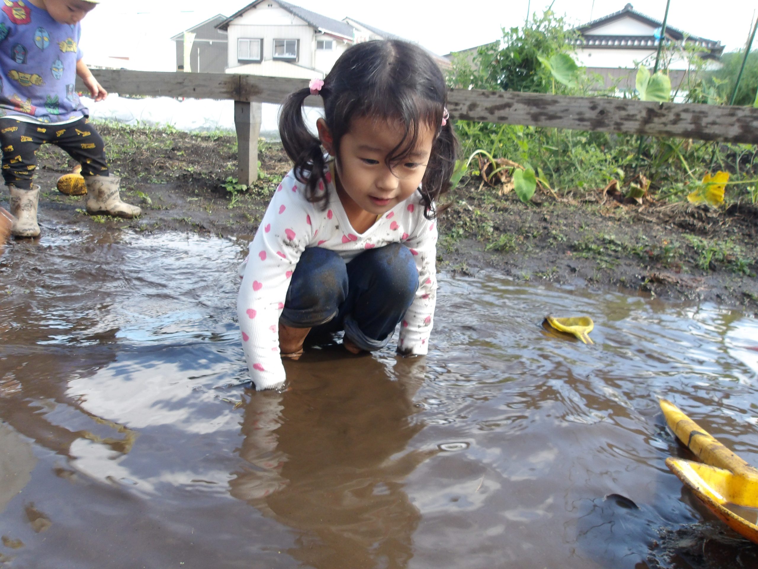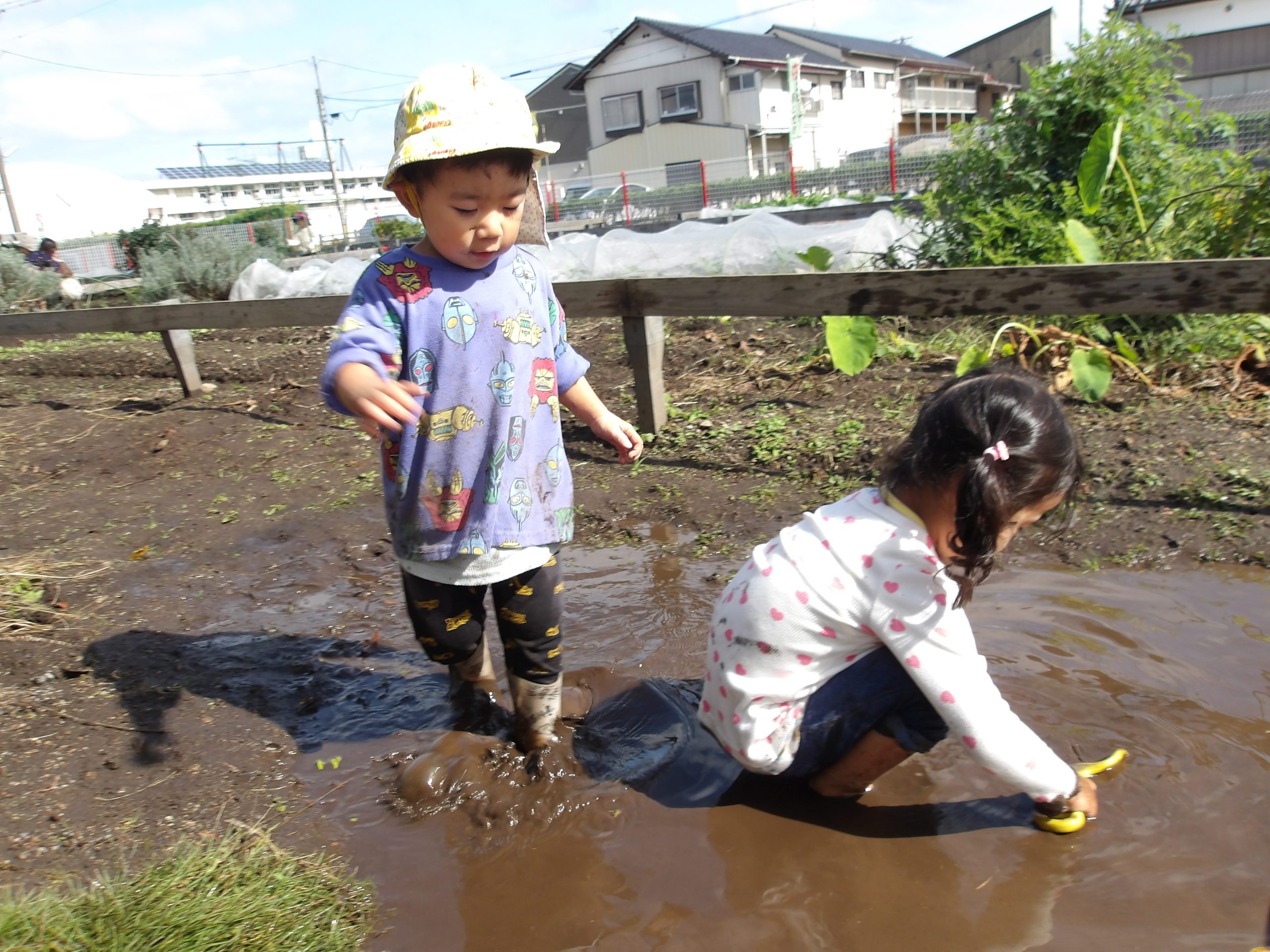 久しぶりの泥んこの海。遊びたそうに眺めていましたが、いざどろんこの前に立つと・・・ちょっと躊躇いが。今日は日差しもなく、足を入れてみたものの冷たかったのでしょう。ちょっと遠慮がちに遊んでいました。今夏はとても暑かったですが毎日元気に遊べたのは、明るい日差が、子どもたちの元気な遊びを引き出してくれていたのかもしれません。