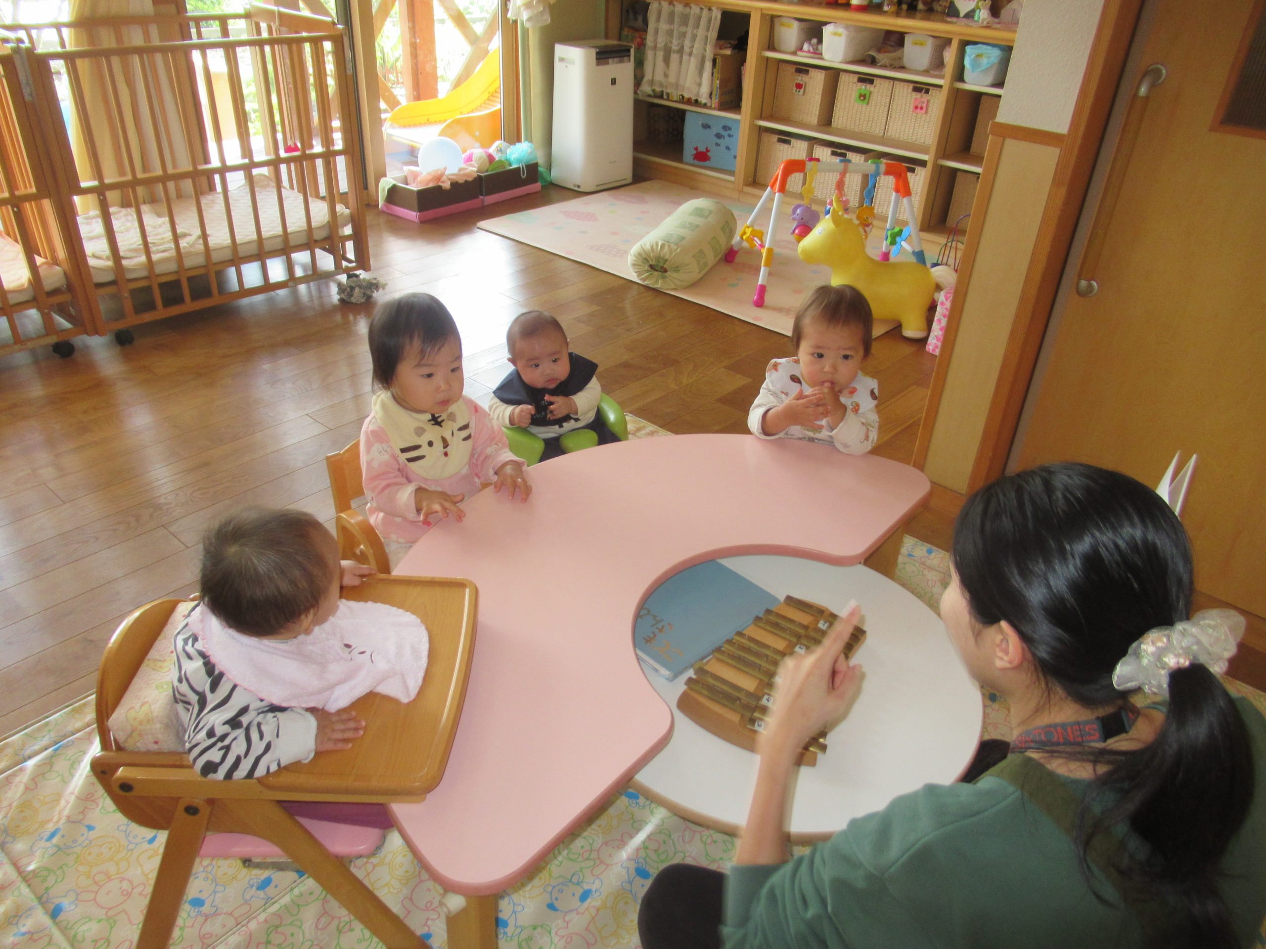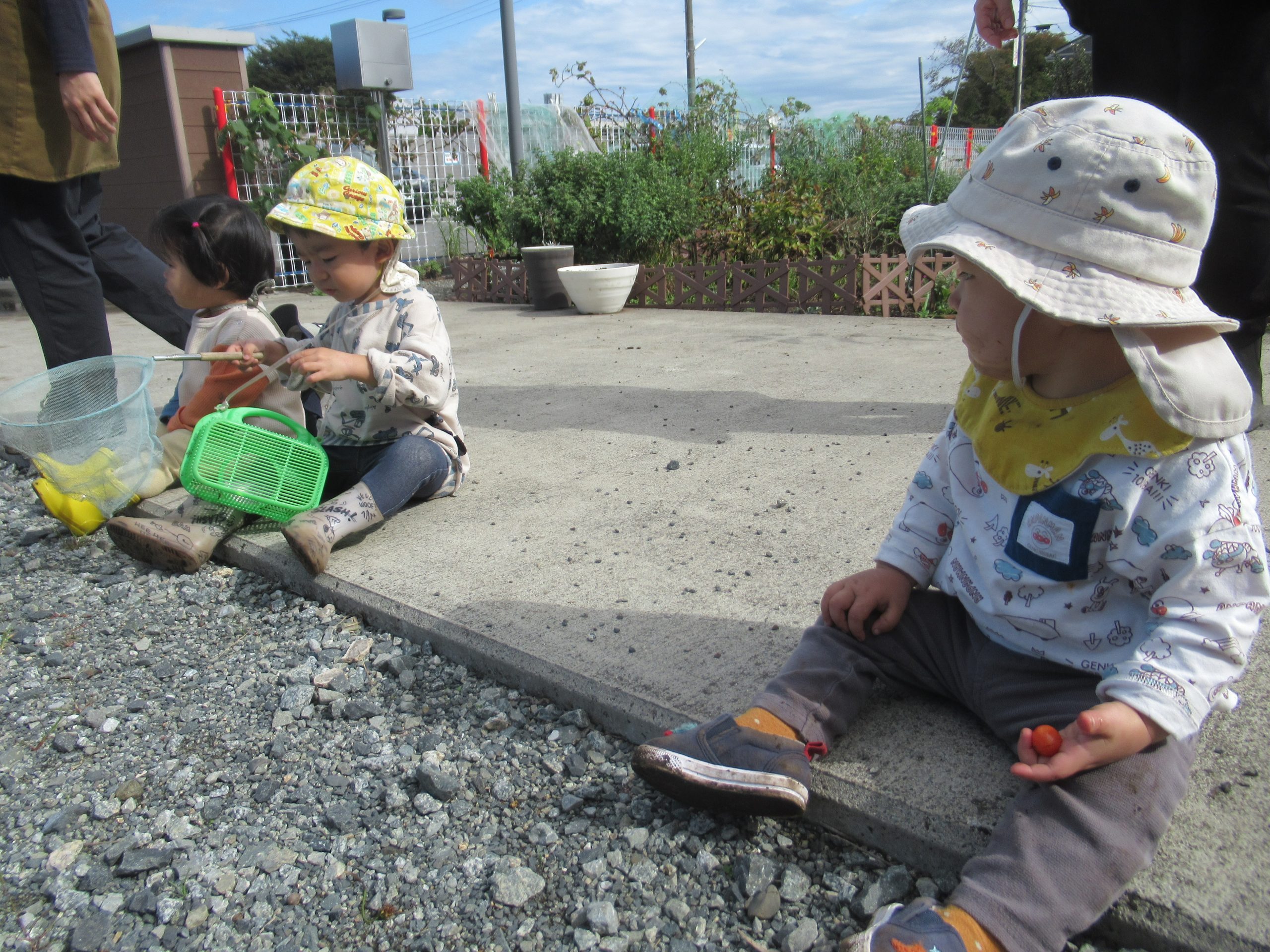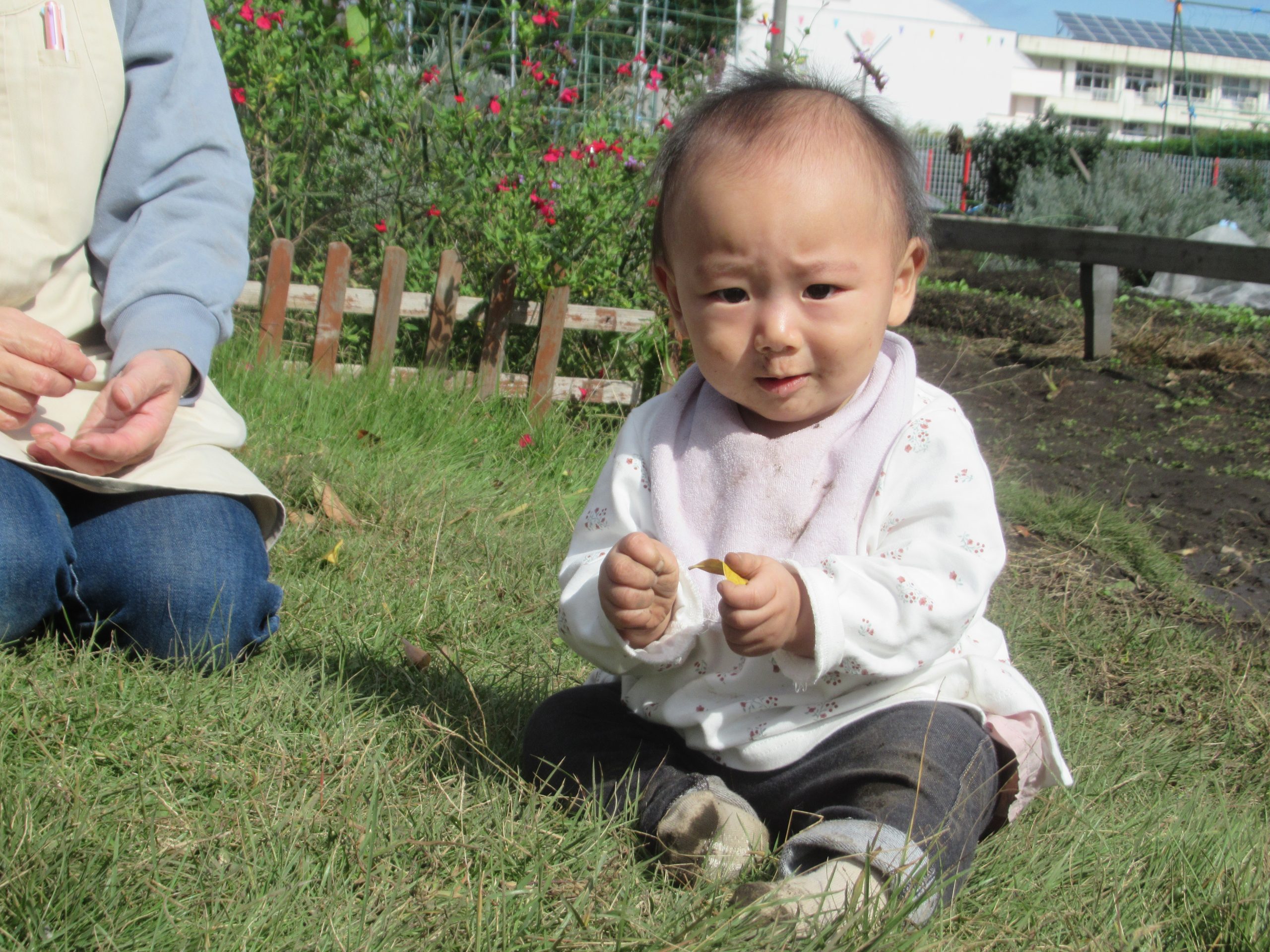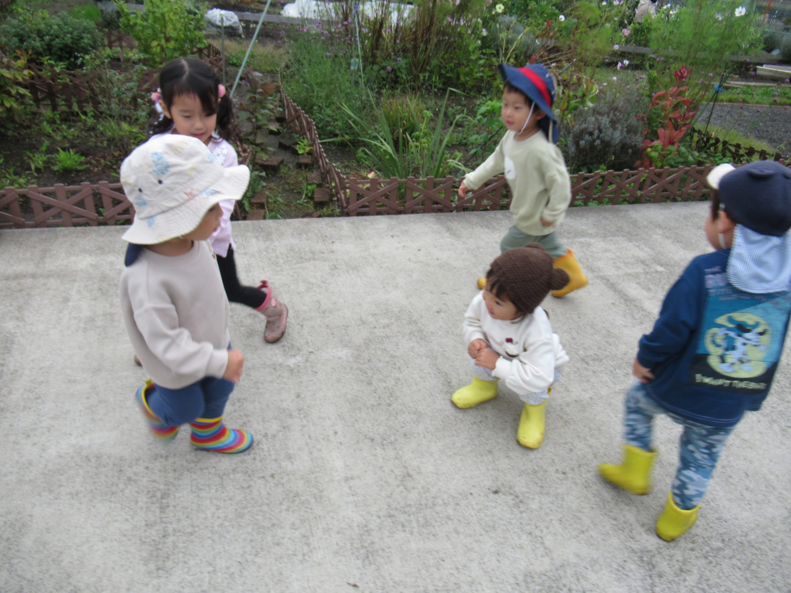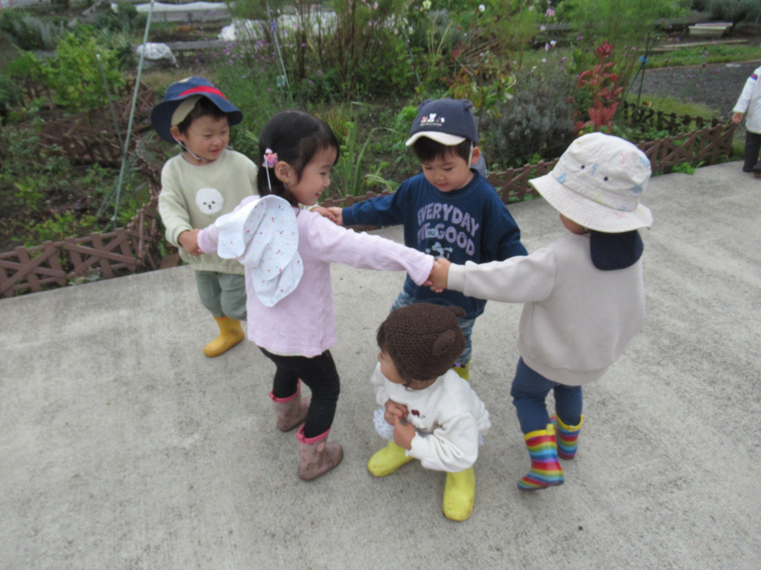 ことり組さんもみんなで礼拝をしてから外遊び。今日はℤ君も一緒に絵本を見ました。ことり組さんは、にじ組さんやはな組さんが遊んでいるのをよく見ていて、後ろをついて歩き同じようにしてみたいS君と、指先に触れたものをじっくり見つめるTちゃんとEちゃん。泥団子を見つけたRちゃんは、両手に握って、「みて これ!」というように発見を喜んでいました。