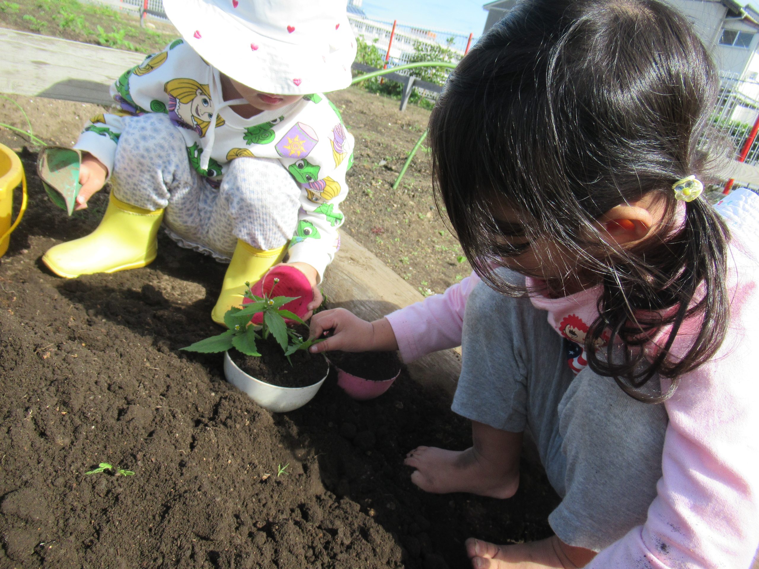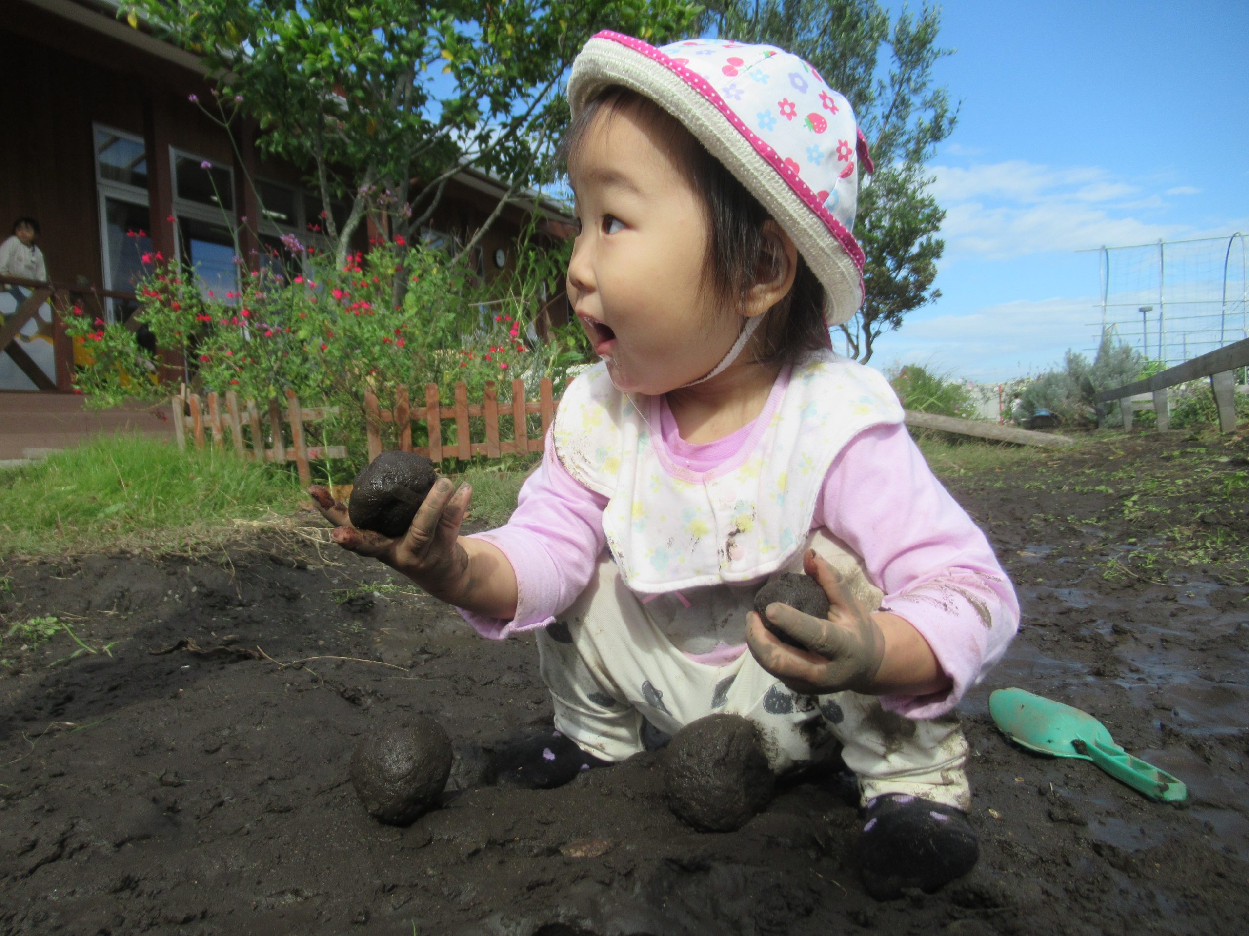 保育者がカラフルなキノコを作ってちいろば畑に隠しました。「きのこを探に行こう!」と言われて喜んで畑の中に出かけた子どもたち。“自分で探して見つける”が遊びの目的。でしたが・・・。「きのこでなくてもいいでしょ!」「そうだね」泥団子でもしなびたナスでも、美味しかったぶどうでもOKです。「よく見つけました。」Aちゃんはきのこを使ってお料理をしてくれました。