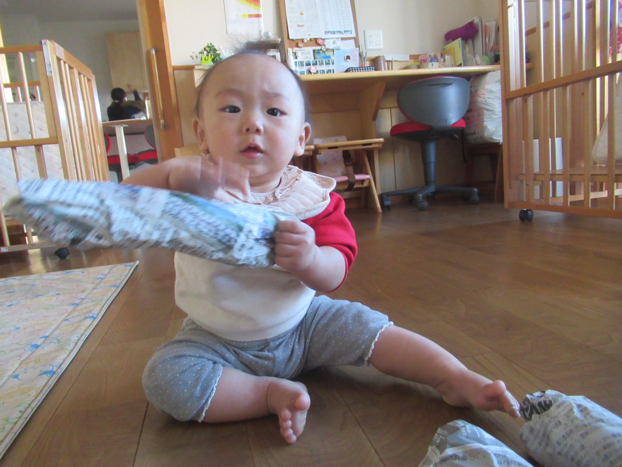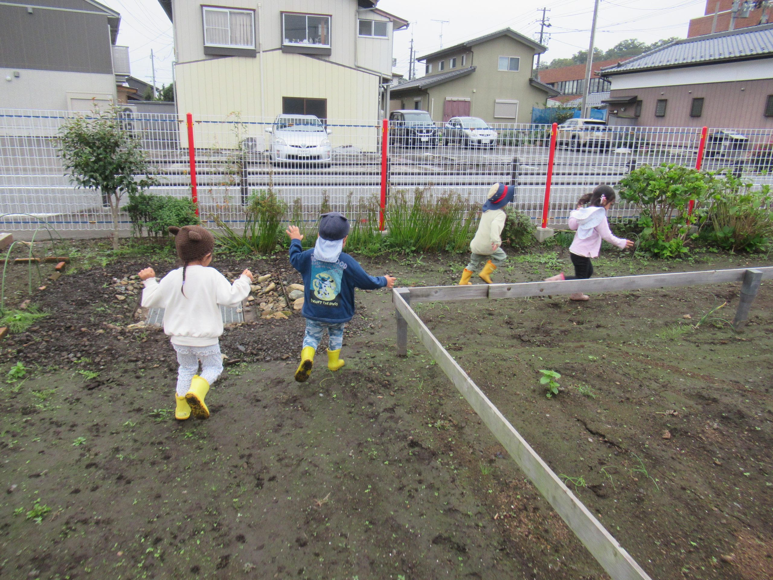 ことり組さんは新聞紙を丸めて🍠サツマイモ(保育者の予定)。ことり組の子どもたちは、何かわからないけど興味はいっぱい。仕上がりを楽しみにしてね。はな組さんやにじ組さんたちは畑で、自分で不思議なものを見つけて楽しみ、それぞれにイメージして遊んでいます。