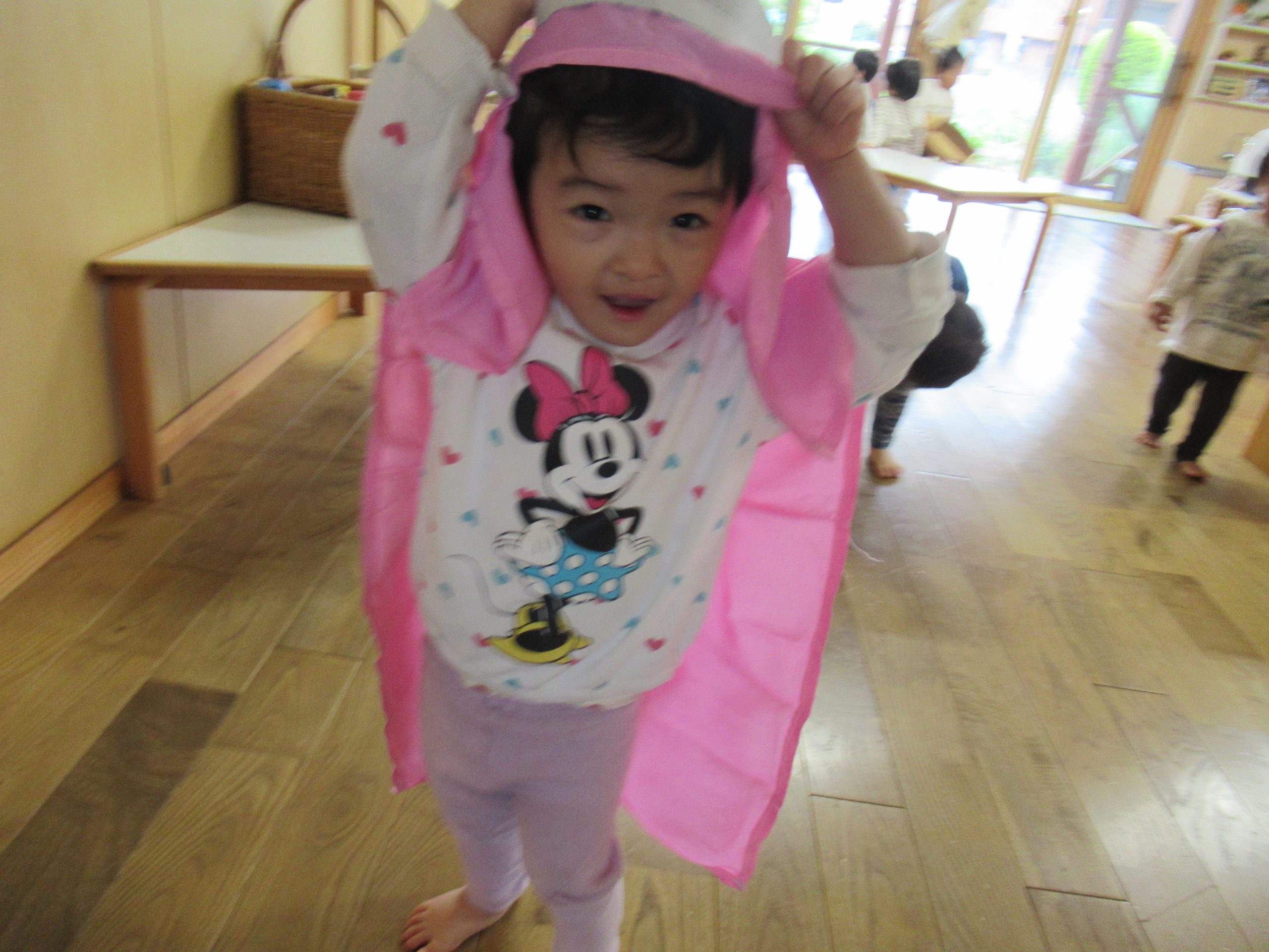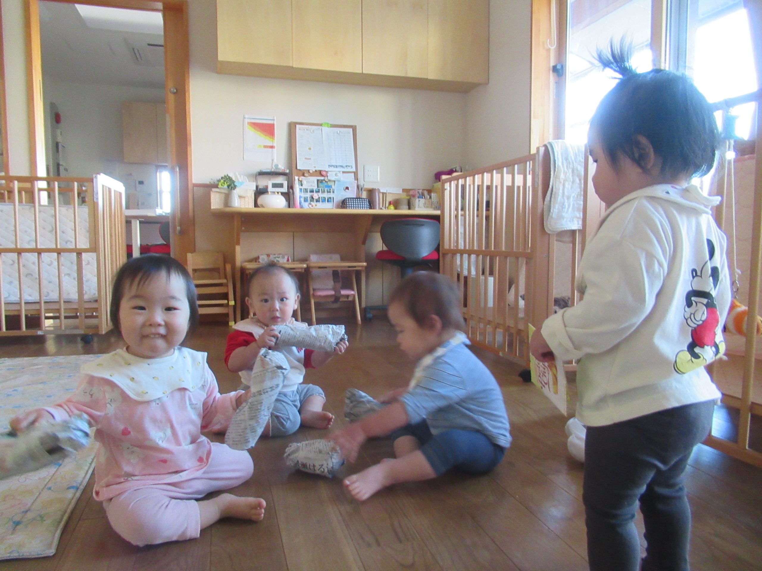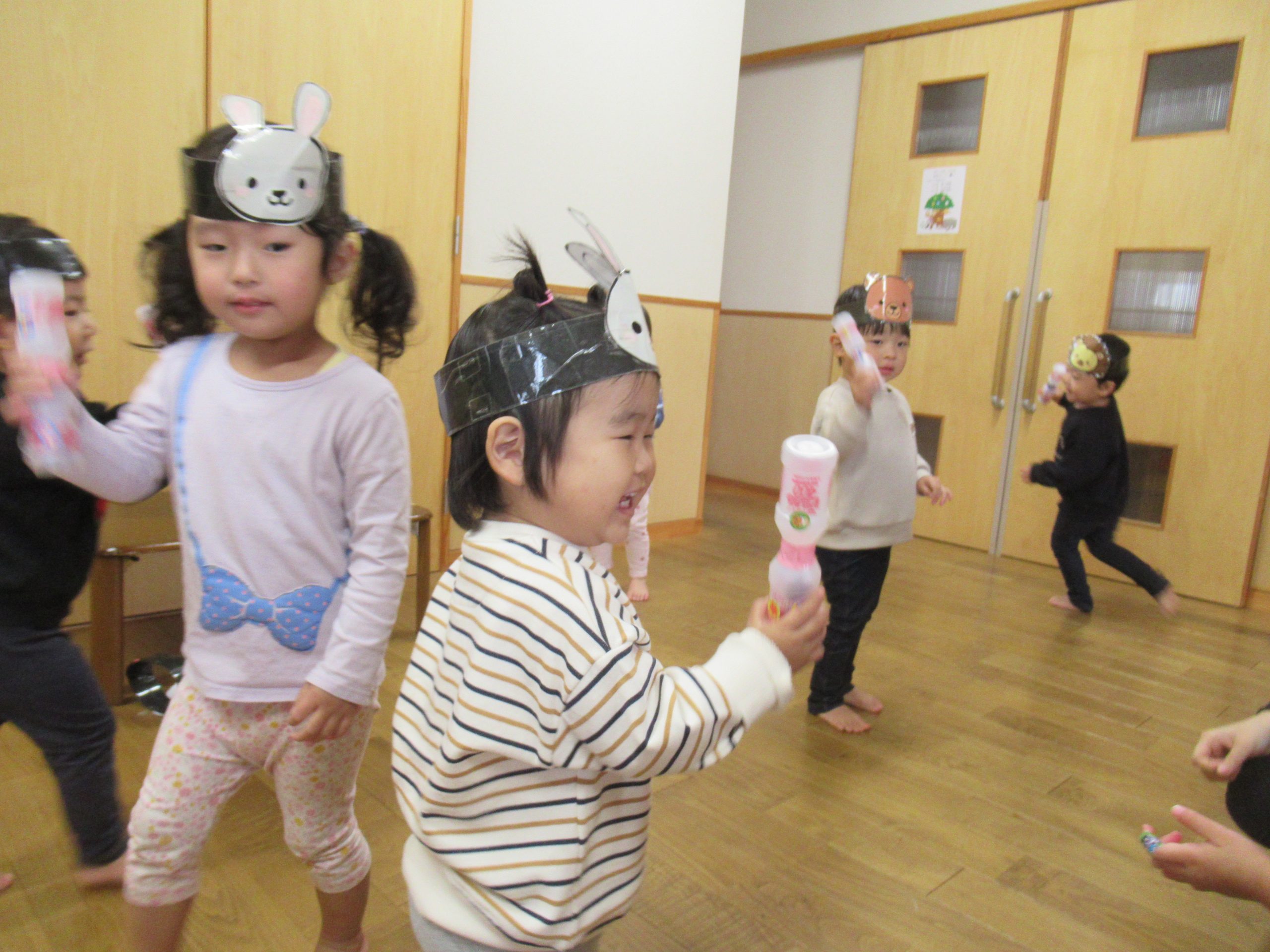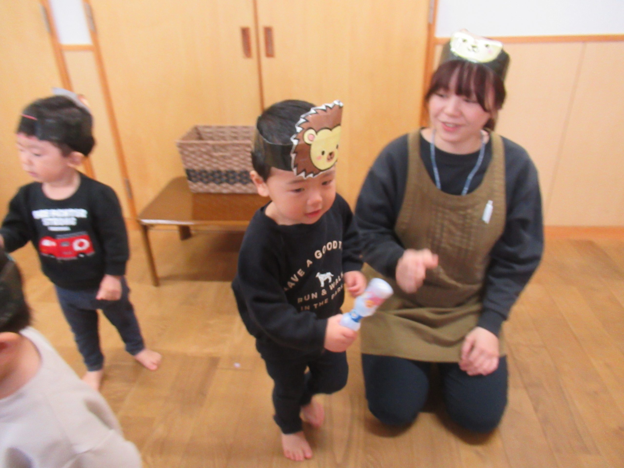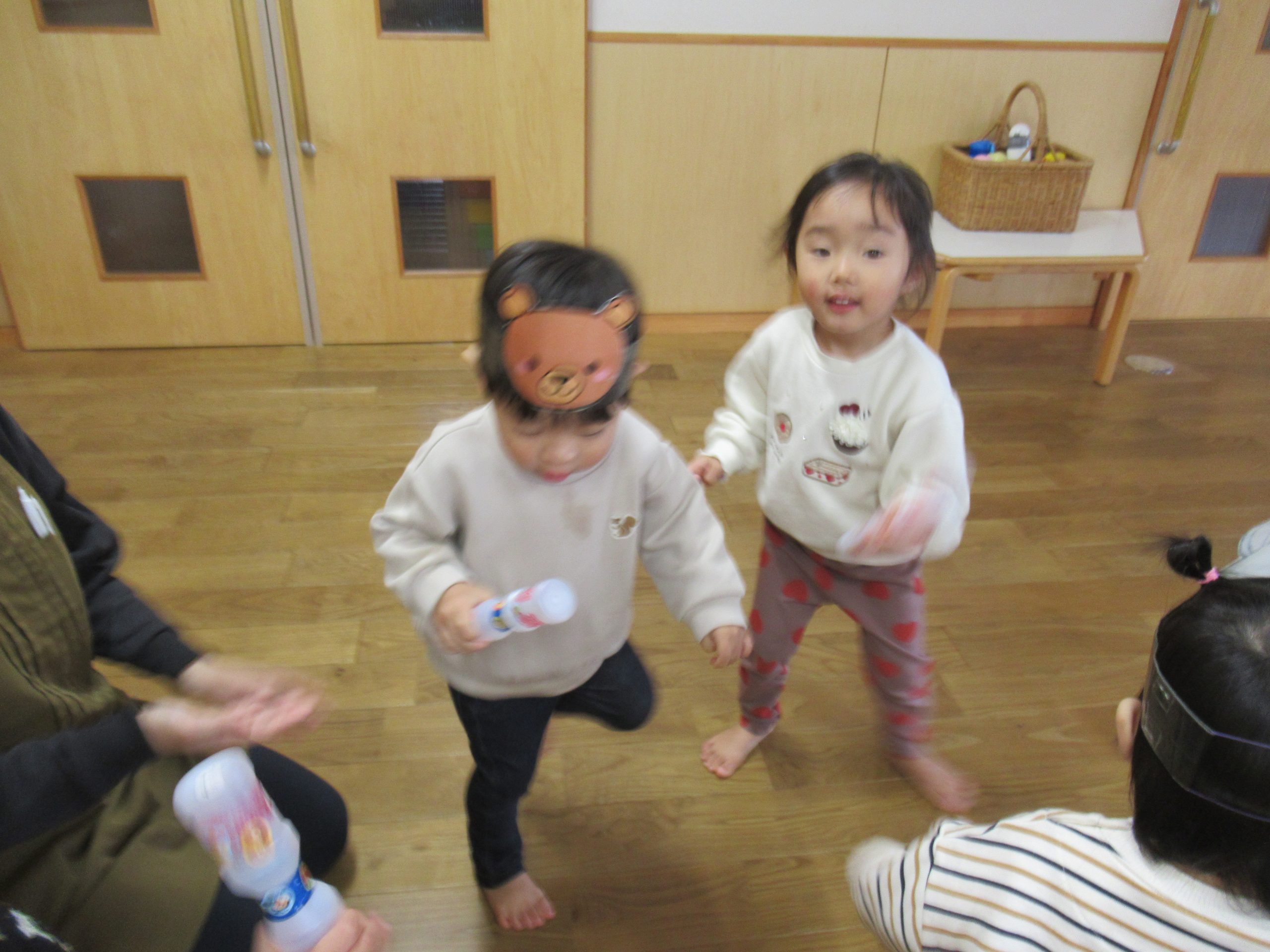 今年度も後半を迎え、いろいろな場面で一人ひとりが成長したことを感じます。今日の遊びは、「むっくりくまさん」「電車ごっこ」「天使さんごっこ」などなど。誰かがやりたいことを見つけて、遊び始めたり誘ったりすると、やりたい意思を表して積極的に混ざる子。何だろうと思って近づき誘われて混ざる子。遠巻きに眺めてるだけだけど気持ちは一緒の子。とそれぞれの遊びの楽しみ方で満足し、いろんな遊びが次々と展開していました。