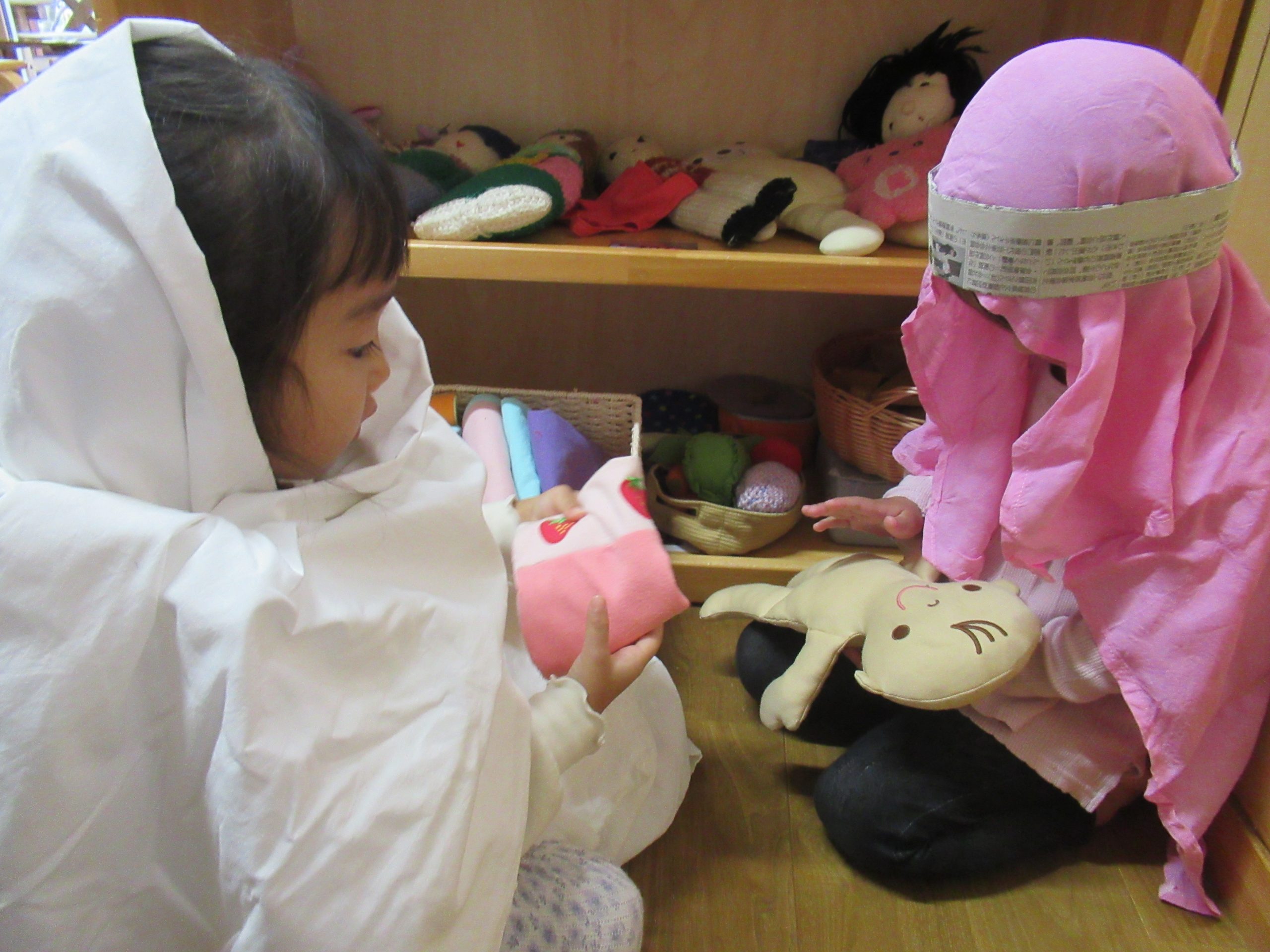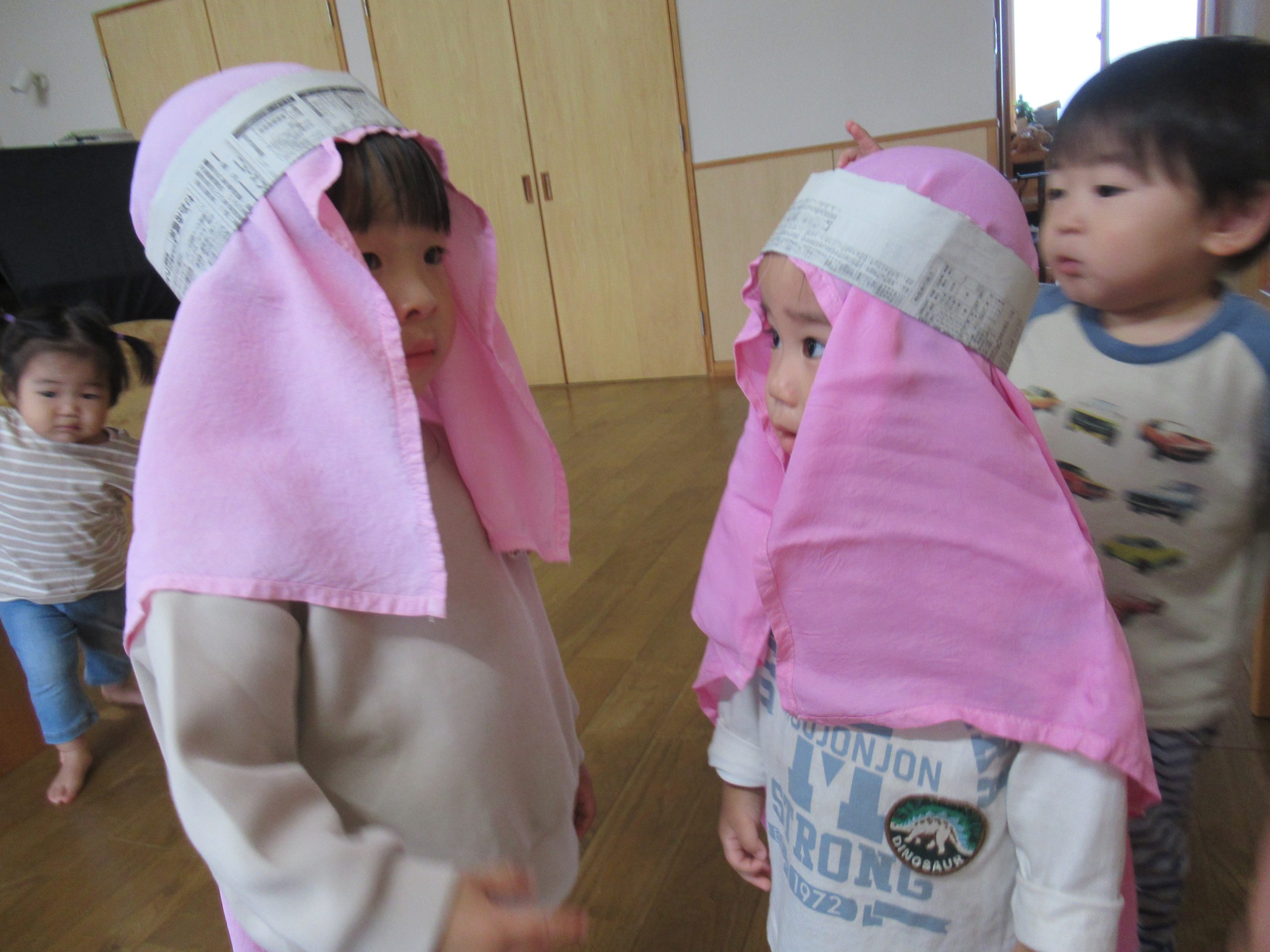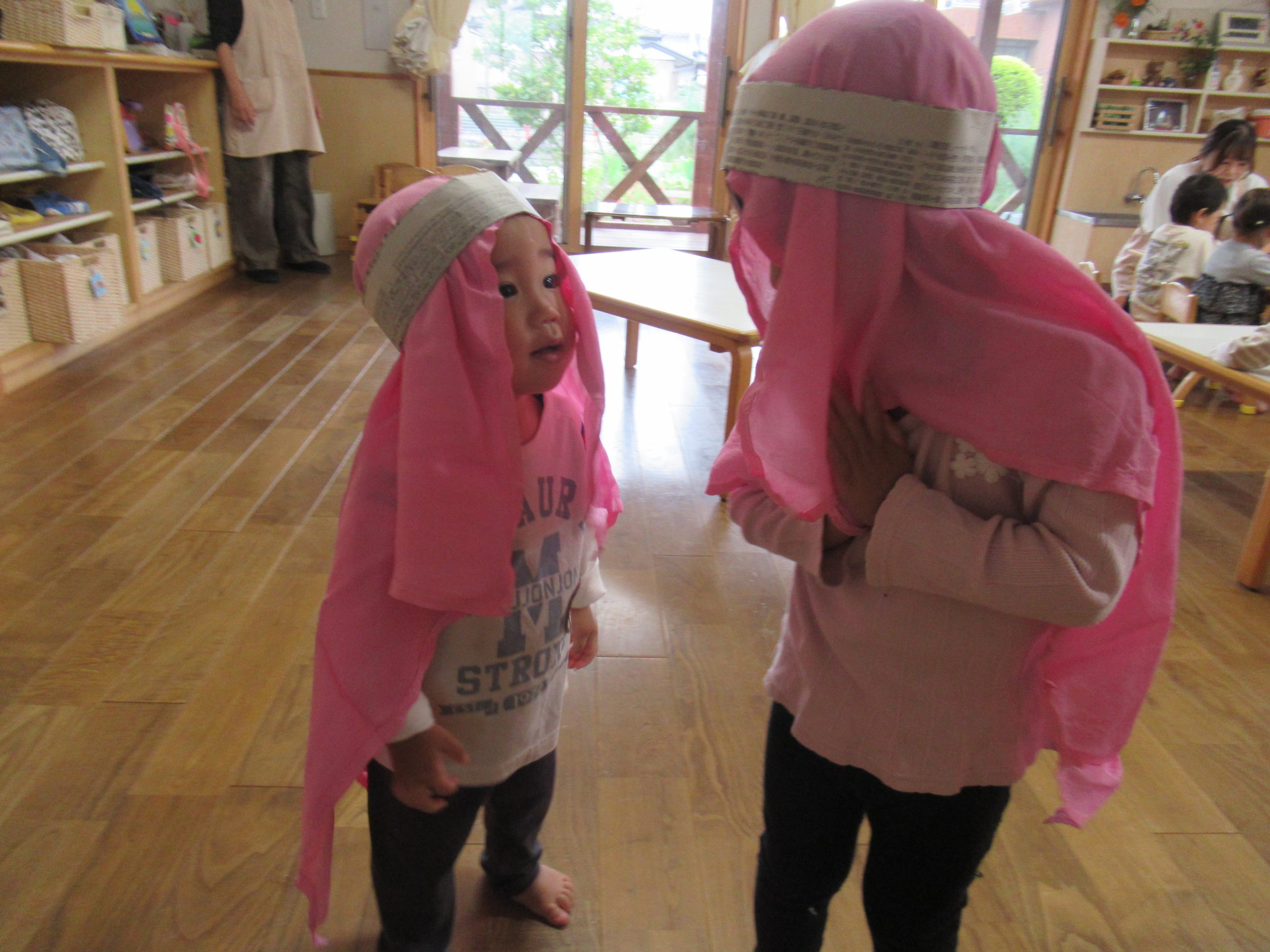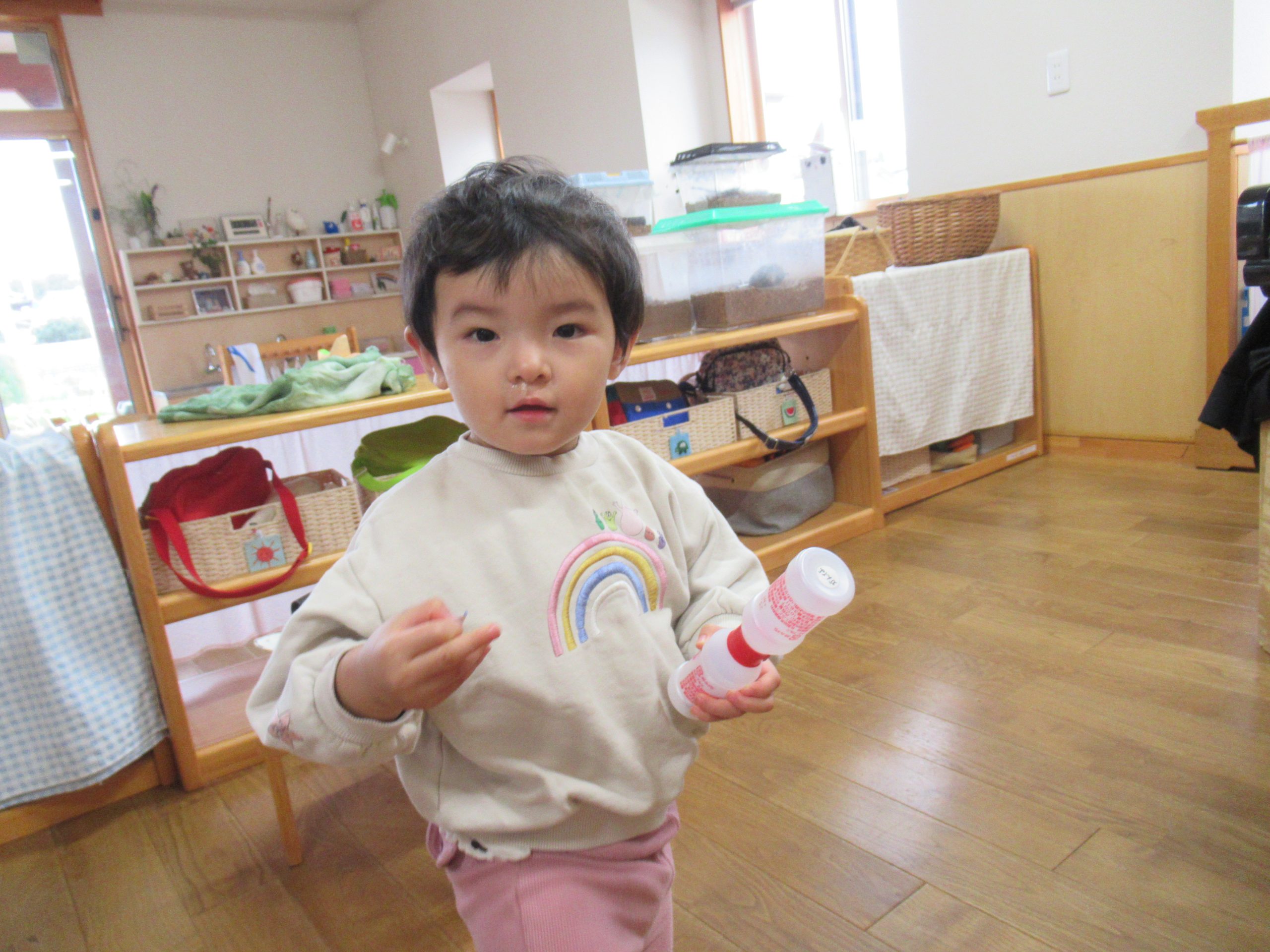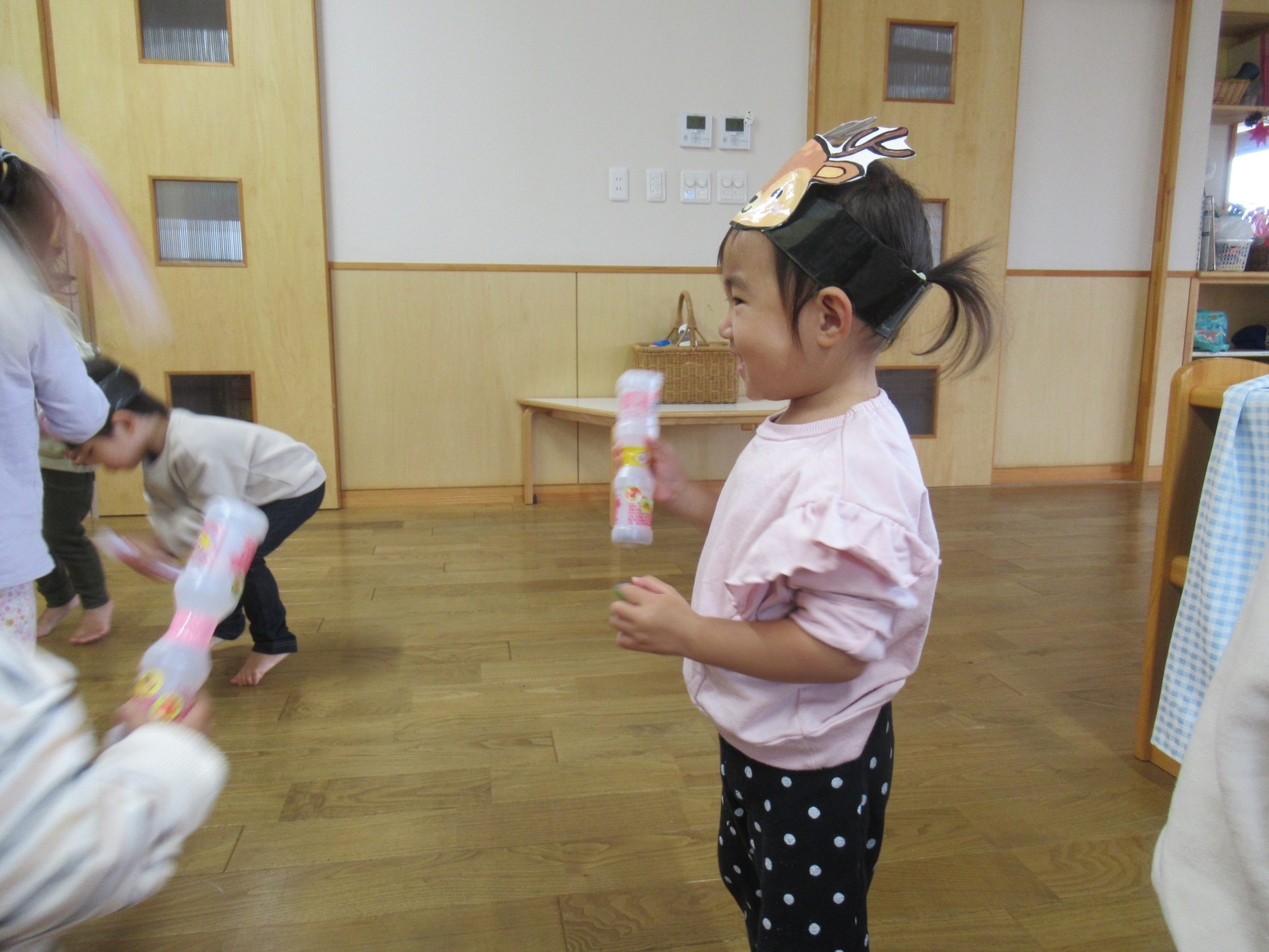 今年度も後半を迎え、いろいろな場面で一人ひとりが成長したことを感じます。今日の遊びは、「むっくりくまさん」「電車ごっこ」「天使さんごっこ」などなど。誰かがやりたいことを見つけて、遊び始めたり誘ったりすると、やりたい意思を表して積極的に混ざる子。何だろうと思って近づき誘われて混ざる子。遠巻きに眺めてるだけだけど気持ちは一緒の子。とそれぞれの遊びの楽しみ方で満足し、いろんな遊びが次々と展開していました。