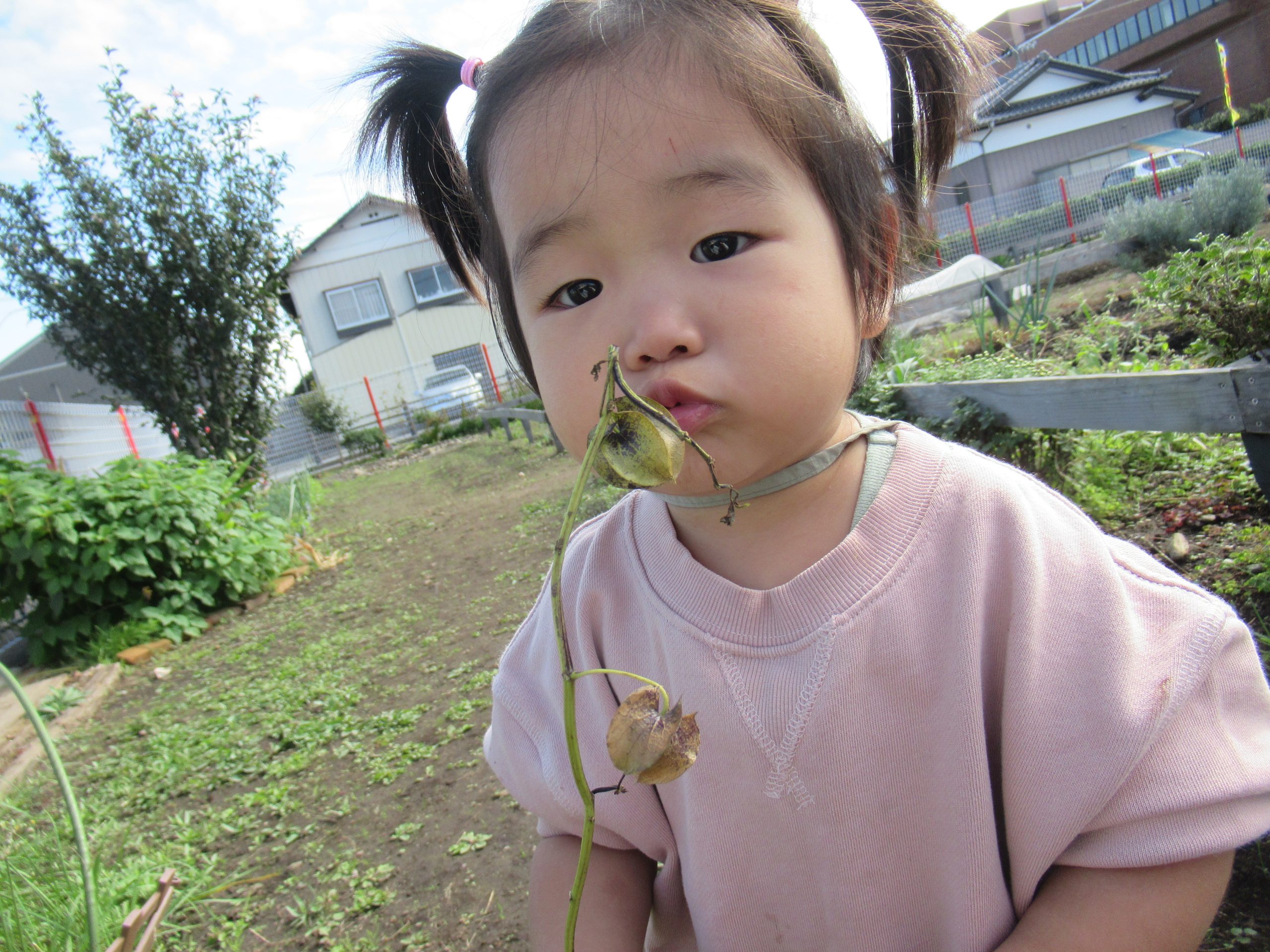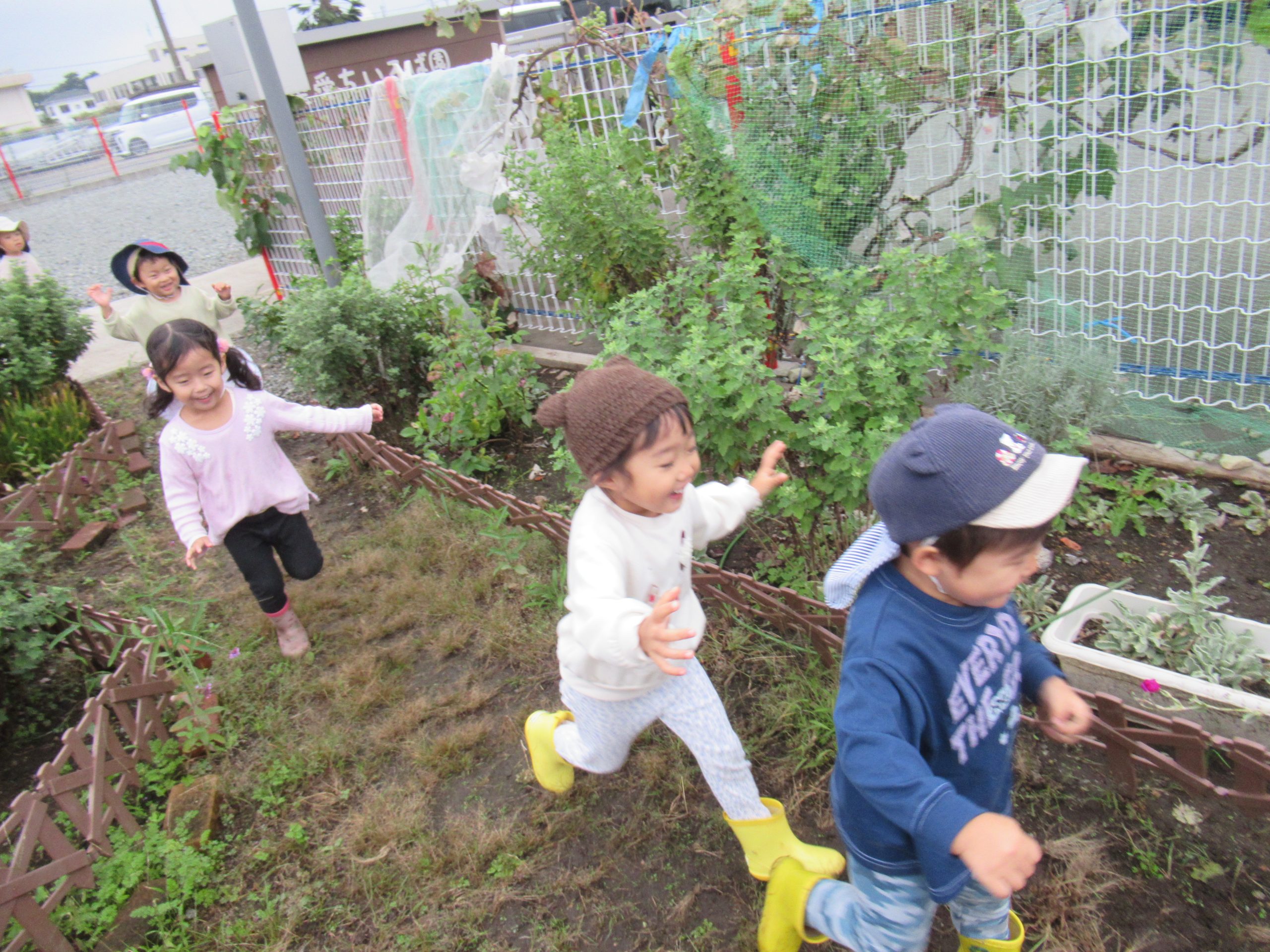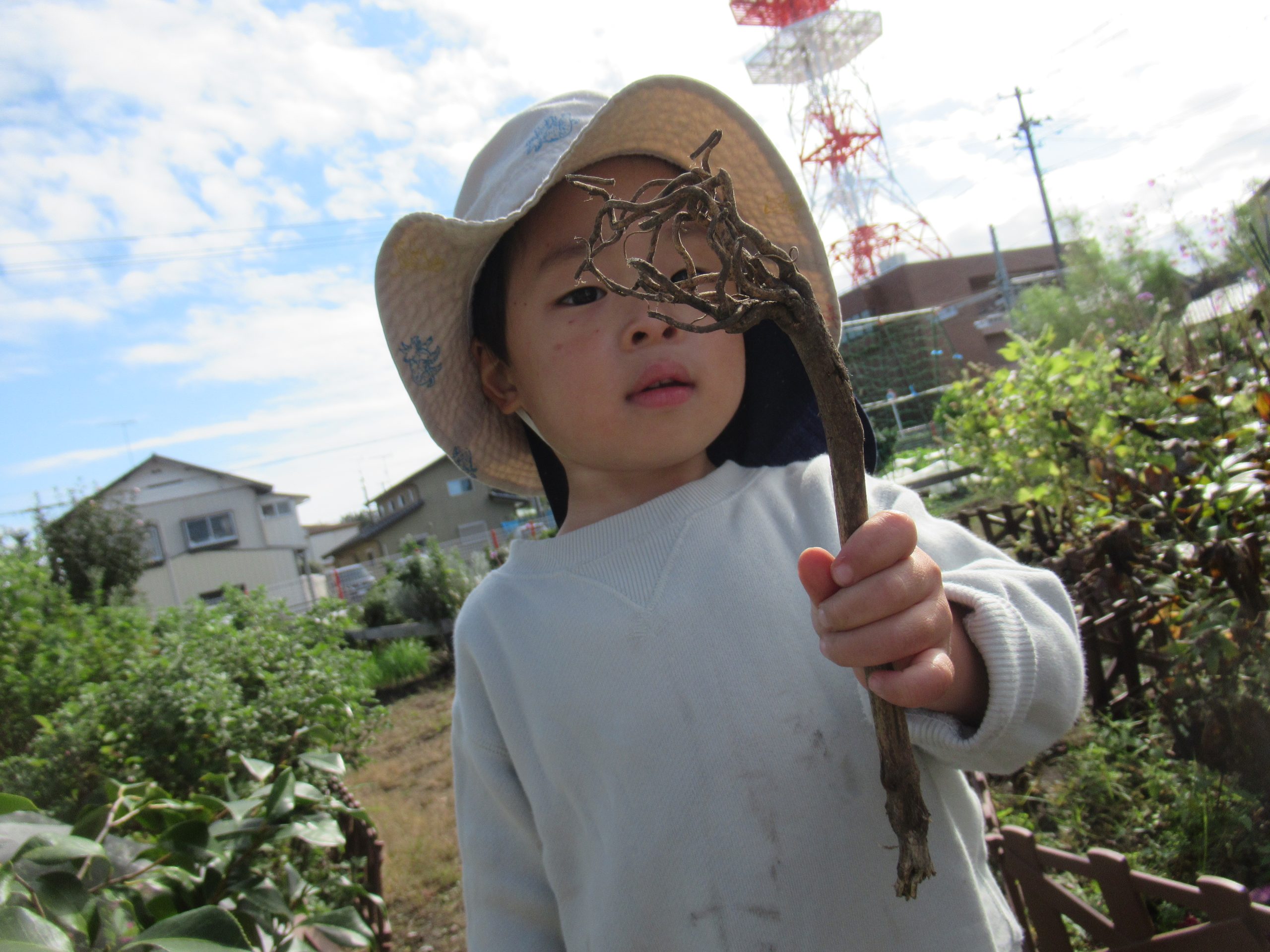 今年の落花生を収穫しました。今年はいつもよりたくさんの実りがありました。「これ何?」「食べられるの?」と手伝いながらも見たこともないものに、子どもたちは疑問・・・。それでも「ピーナツだよ 食べたことあるでしょ!?」など保育者と会話しながら、その後は、一粒ずつもぎ取るのを無言で手伝ってくれました。キノコ狩り(3色色当て・数える)も、今日も楽しみました。