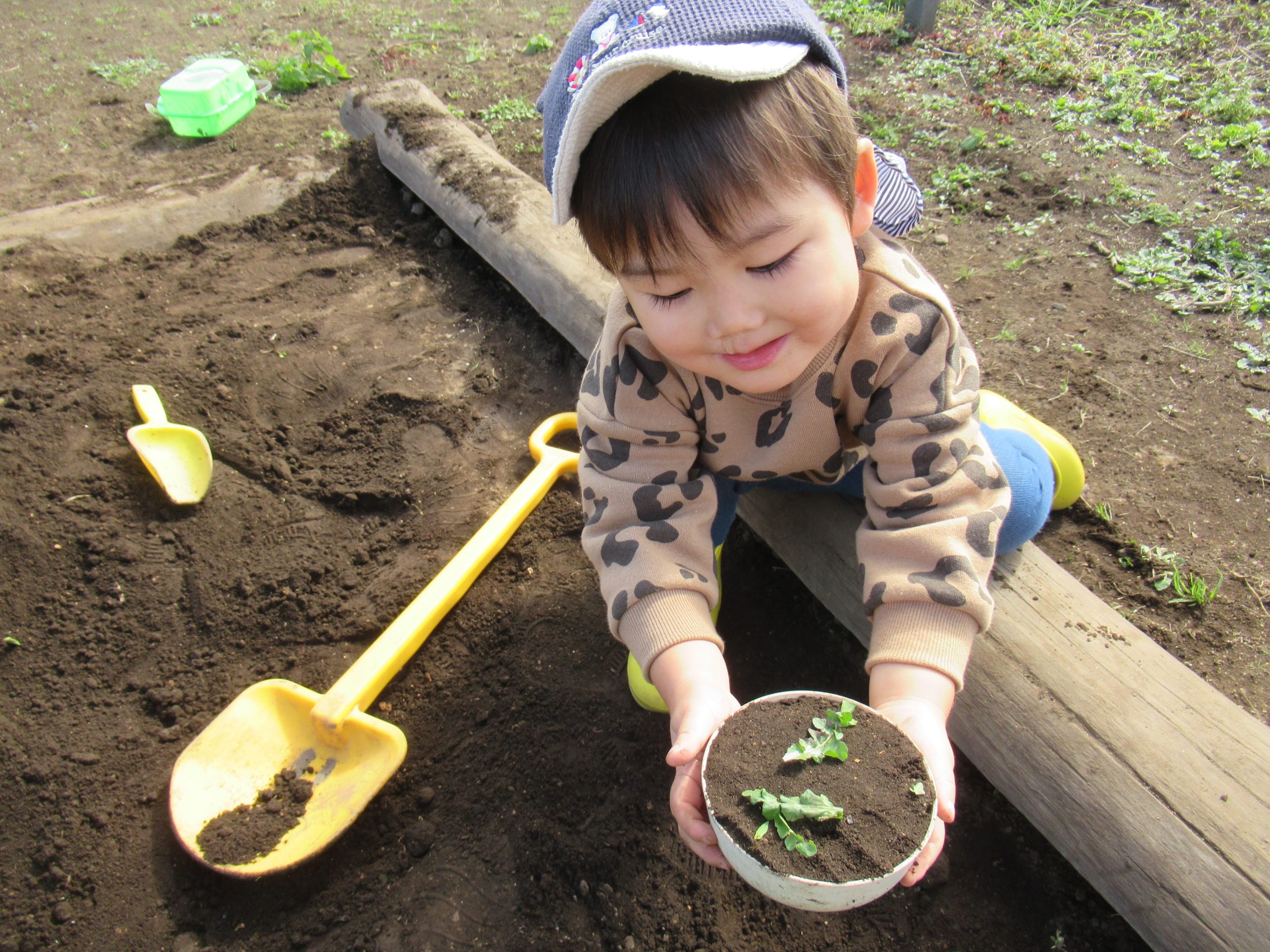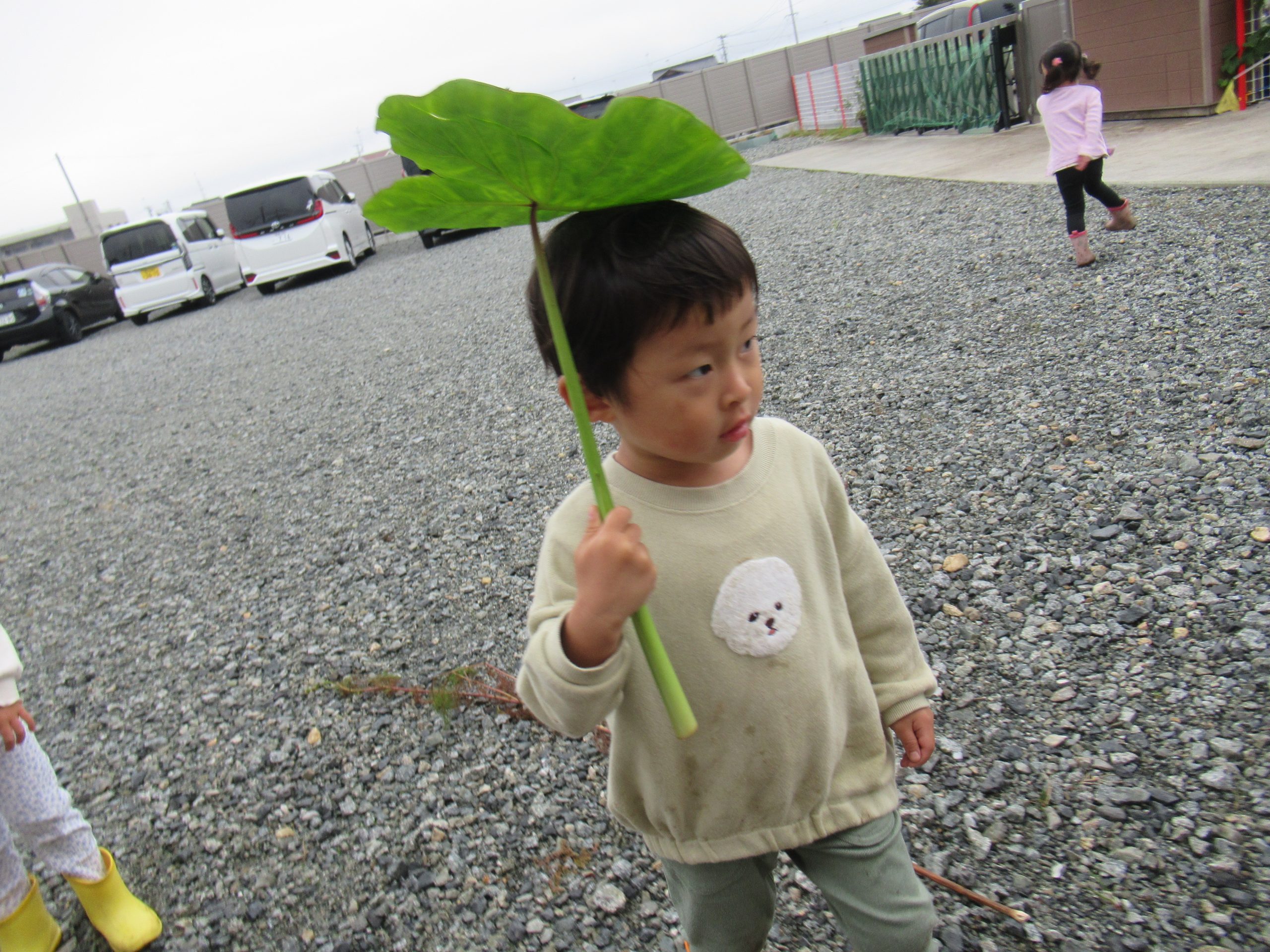 にじ組さんが畑で小さな本物のきのこを発見!「先生、来て」「来て あれあれ」「これこれ」と保育者を呼びに来ました。そのことを知ったはな組さんたちが♪きききのこ きききのこ♪と、“きのこの歌”を歌いだし、みんながちょっと興奮気味です。「これまで遊んできた赤や黄色ではないのに、ちゃんときのこだとわかった」「形でわかったのかな?!」と、F先生も驚きと喜びを一緒にしていました。きのこ発見!に触発されたのか、今日のお料理遊びは小さなパパたちが腕を振るっていました。