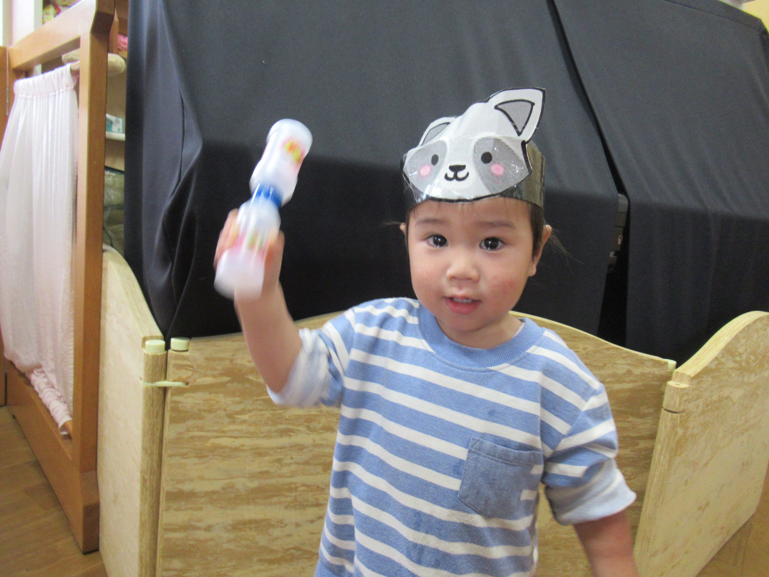 “むっくりくまさん”をして遊びました。♪むっくりくまさん むっくりくまさん…♪の歌が終わった瞬間に、くまさんに捕まらないように逃げなければなりません。始めの内は、みんなが逃げる人になっていましたが、遊んでいく内にくまさんに捕まらないように逃げるルールがわかってきて、交替して遊ぶことが出来ました。