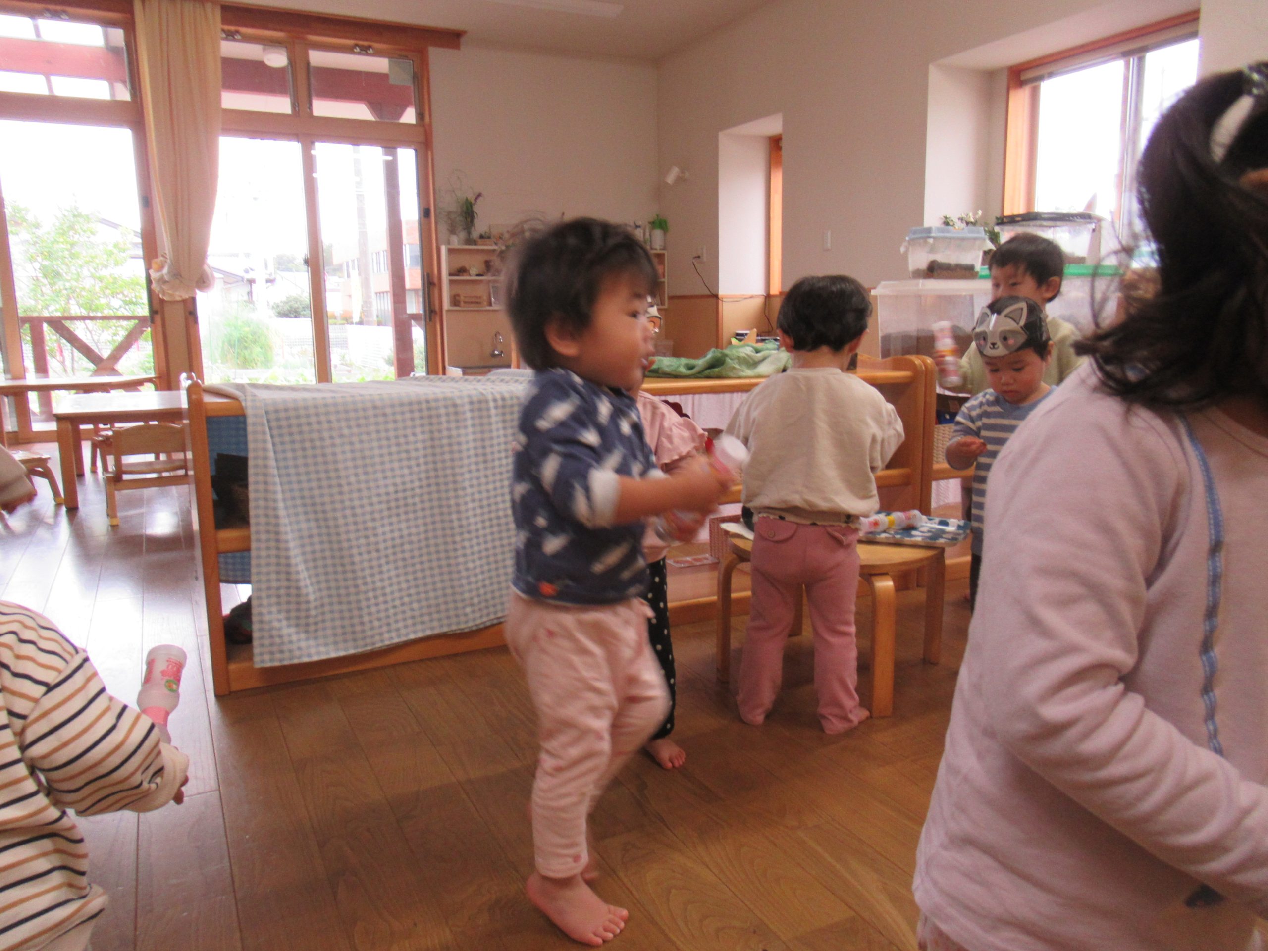 ガシャガシャ ガシャガシャ・・・、握ったら絶対にこうしてみたくなる、昨日作ったどんぐり入りの「マラカス」。あちらでもこちらでもガシャガシャガシャガシャ。ピアノの音もリズムも歌も関係なく、嬉しいうきうき気分を表す子どもたちの演奏です。