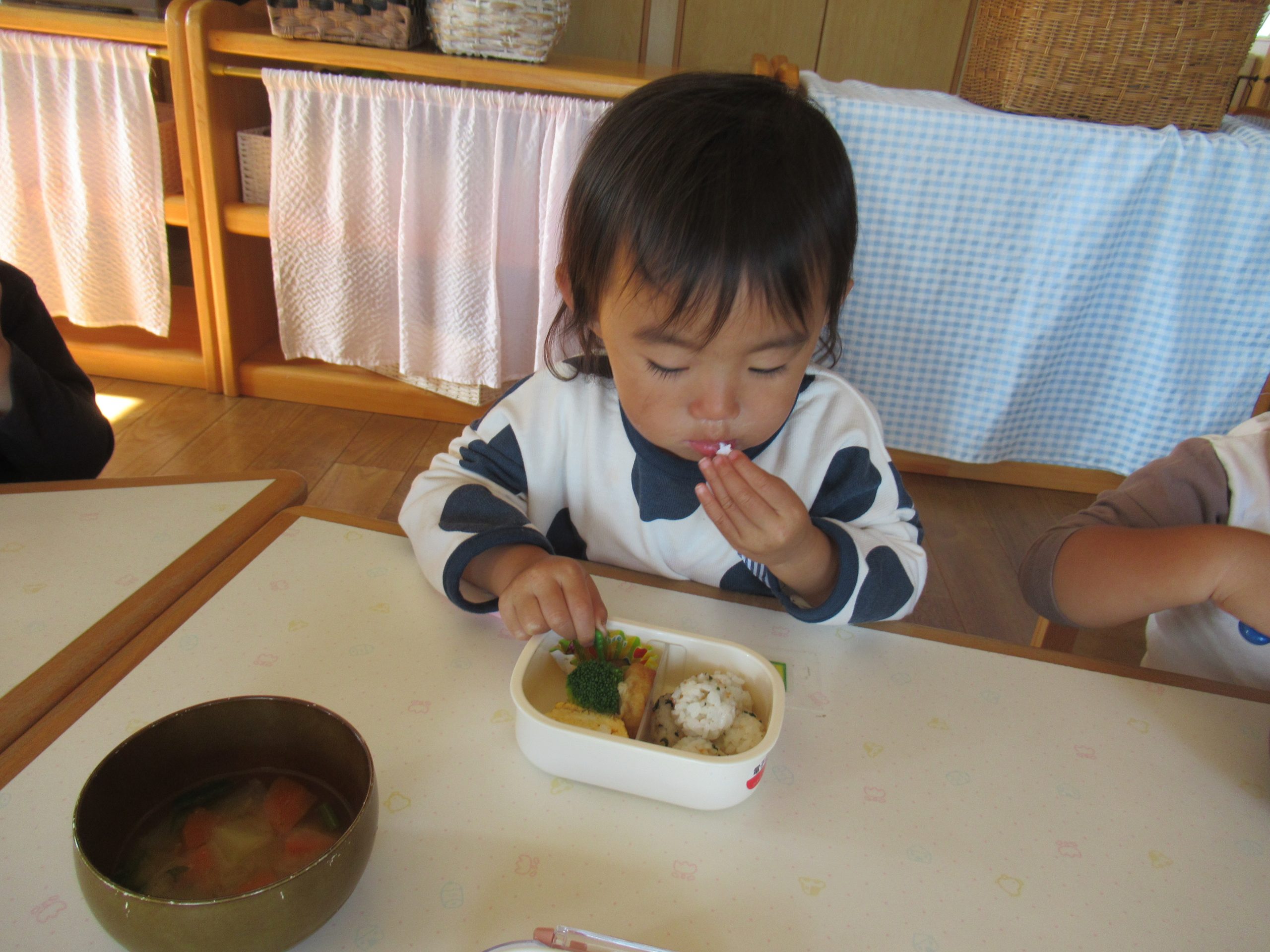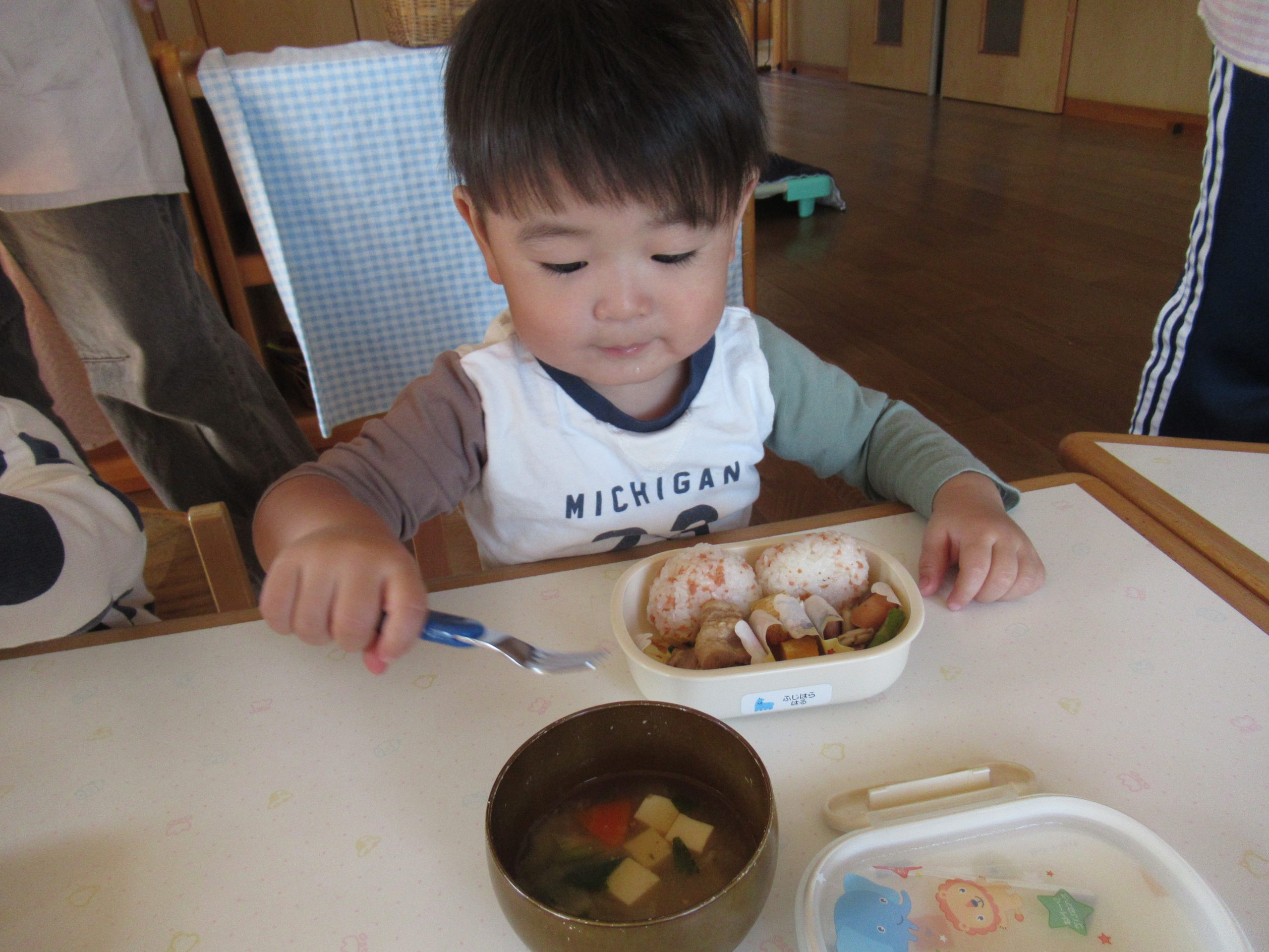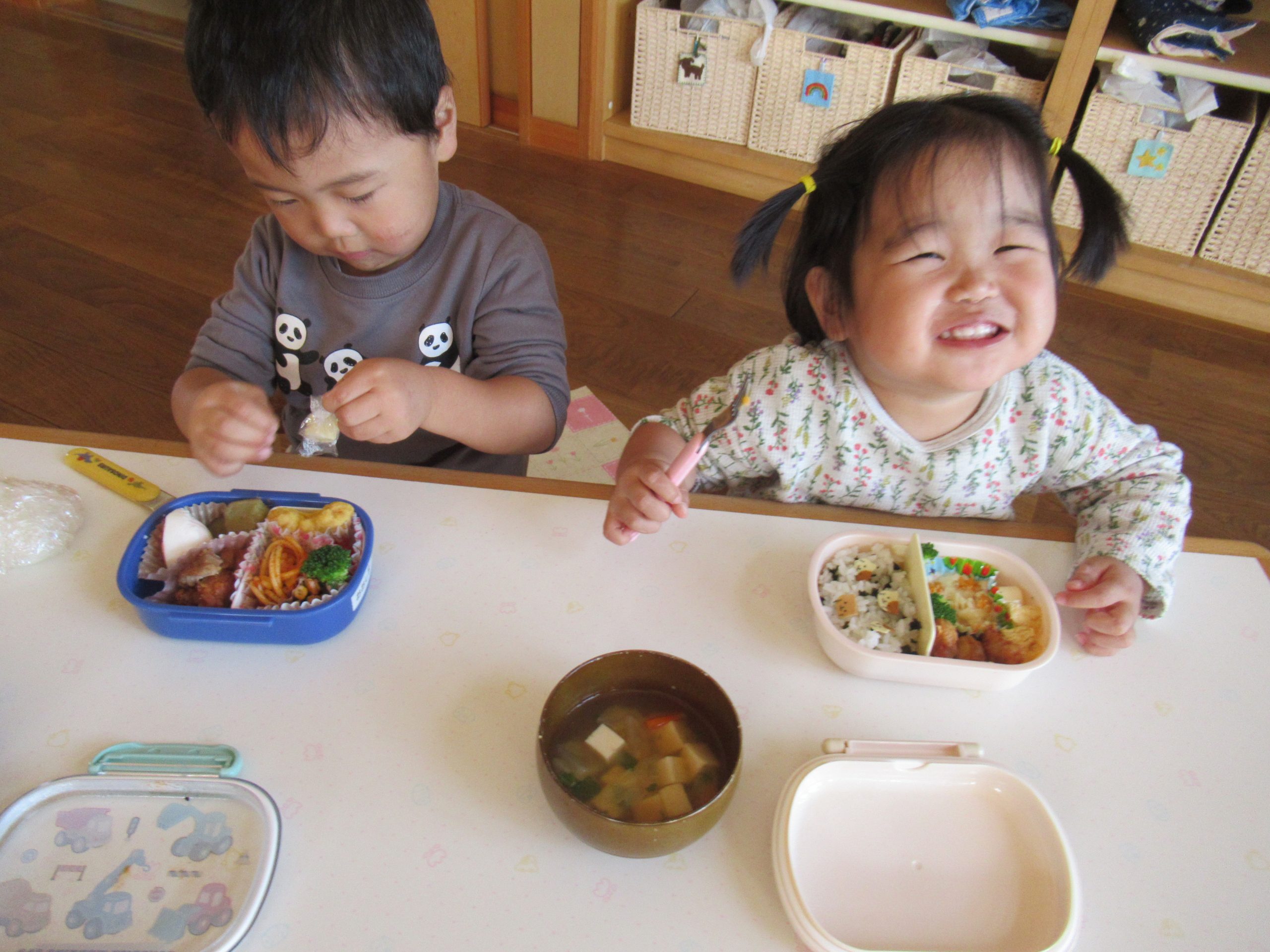 お母さん・お父さんお弁当を作ってくださってありがとうございました。今日は遊んだ後の片づけも入室も早く、昼食の準備も早かった嬉しい嬉しい給食の時間でした。お弁当をじっくり眺めてから食べ始めた子。すぐに好きなもの(?)から食べ始めた子。とそれぞれですが、普段はしないみそ汁のお代わりまでもあり、“食”の喜びが伝わってきました。みんな喜んで食べました。