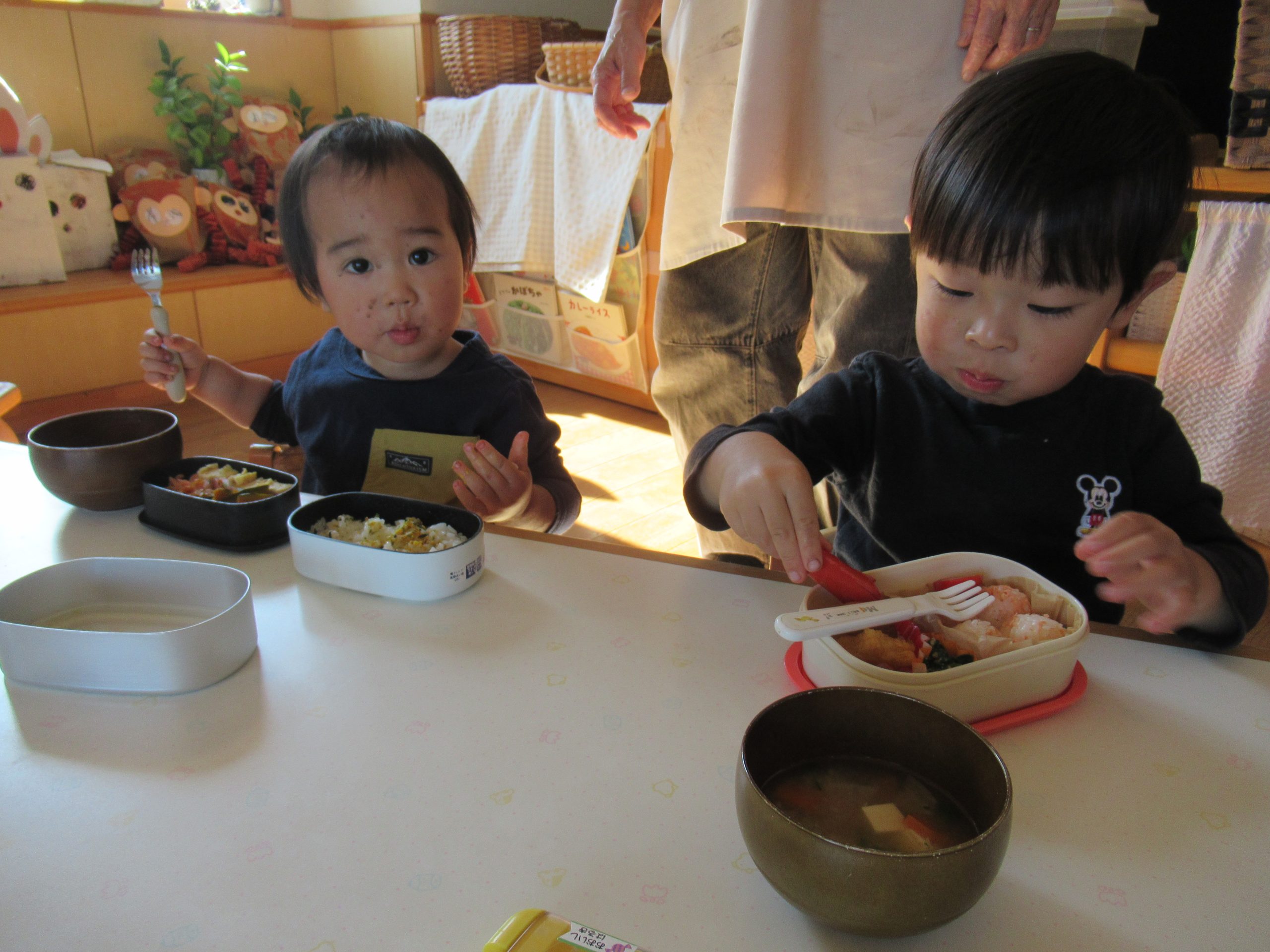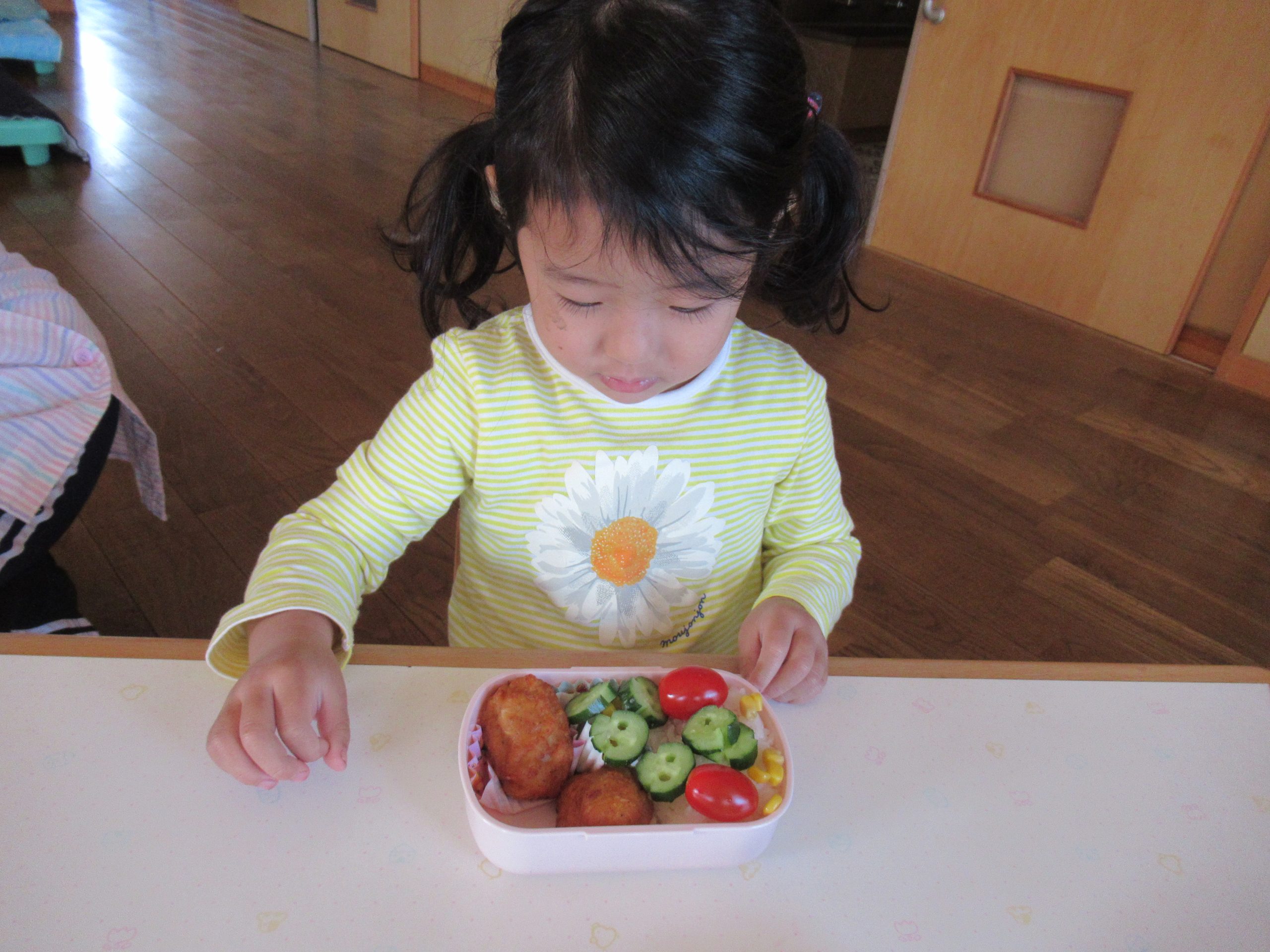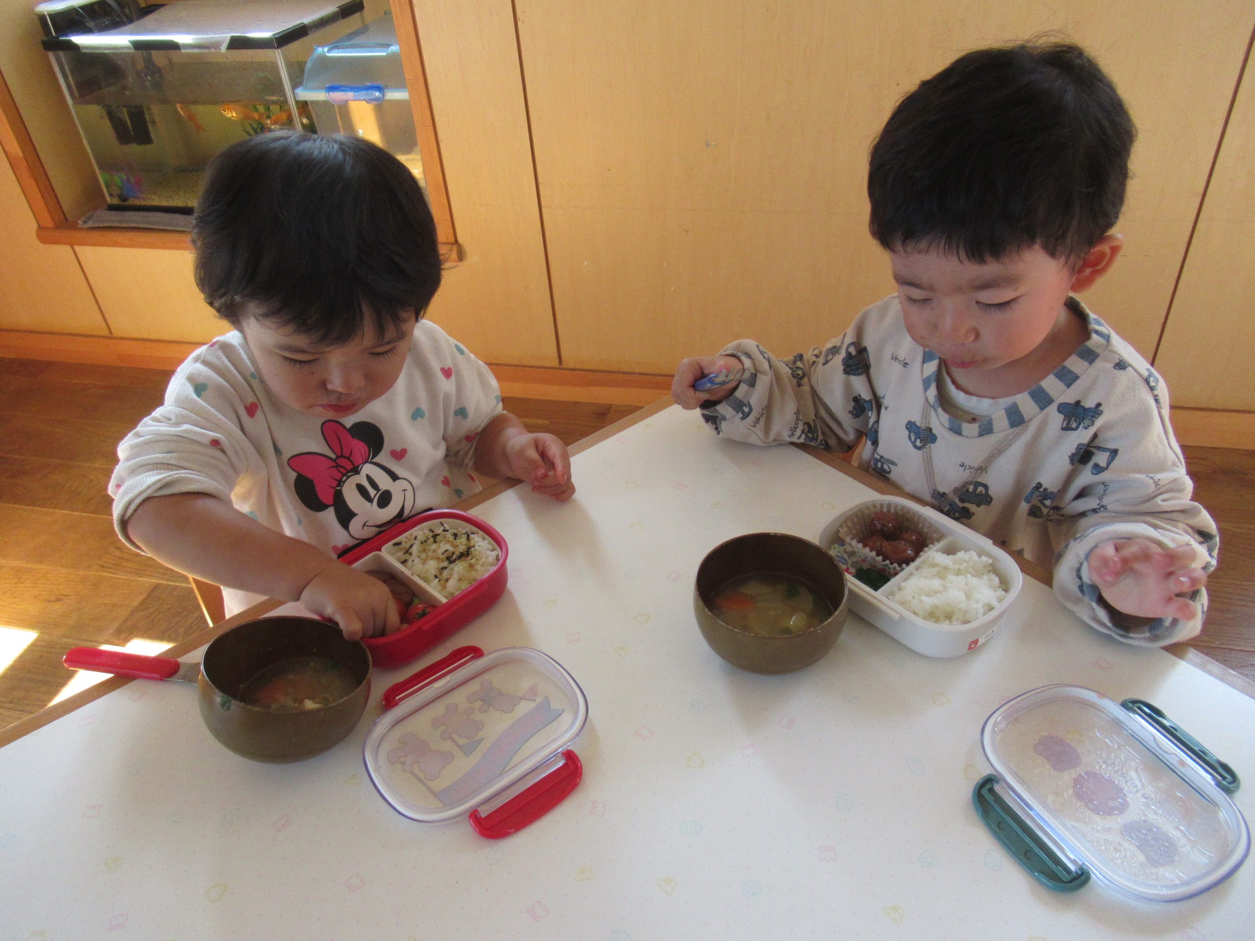 お母さん・お父さんお弁当を作ってくださってありがとうございました。今日は遊んだ後の片づけも入室も早く、昼食の準備も早かった嬉しい嬉しい給食の時間でした。お弁当をじっくり眺めてから食べ始めた子。すぐに好きなもの(?)から食べ始めた子。とそれぞれですが、普段はしないみそ汁のお代わりまでもあり、“食”の喜びが伝わってきました。みんな喜んで食べました。