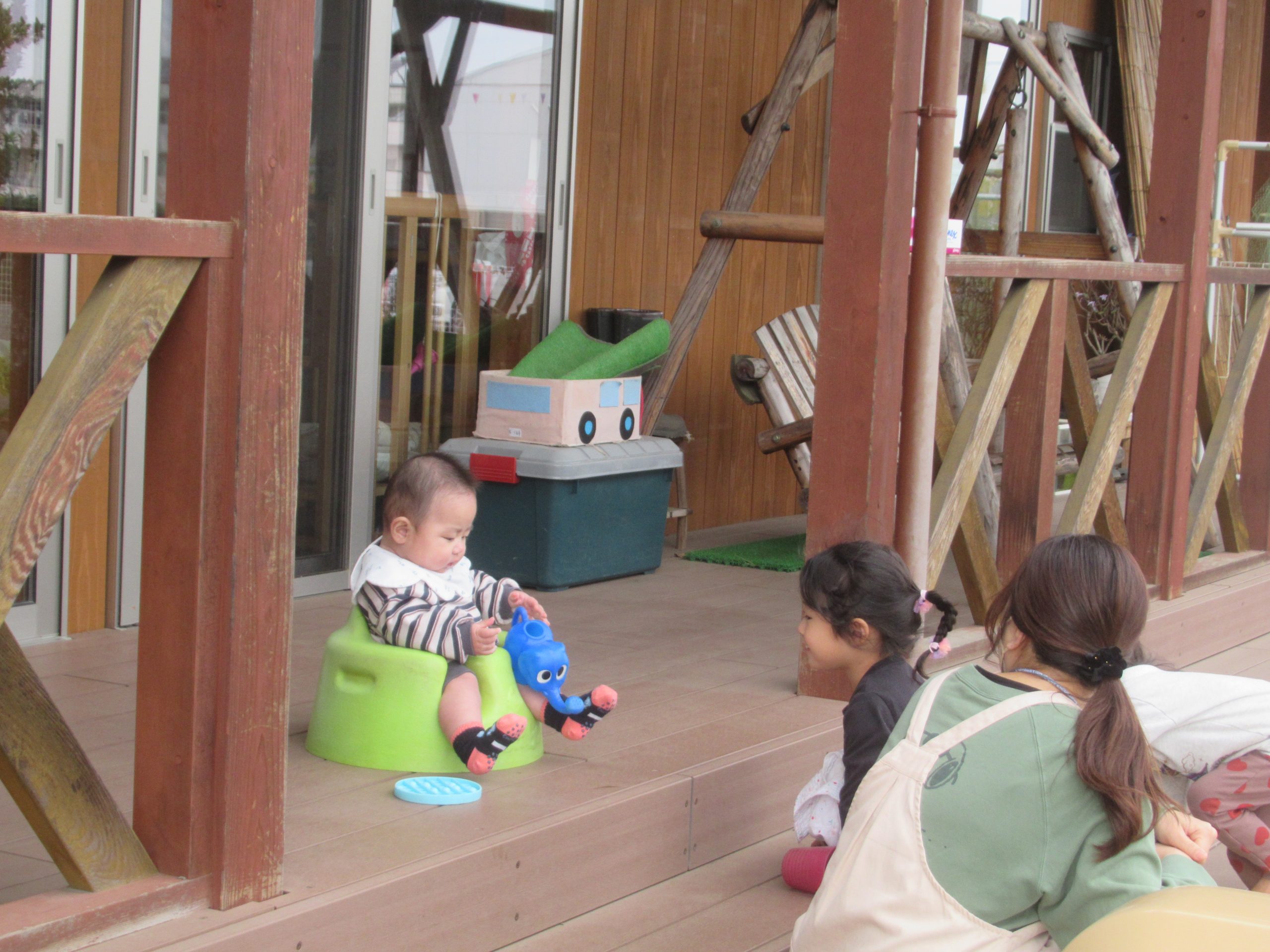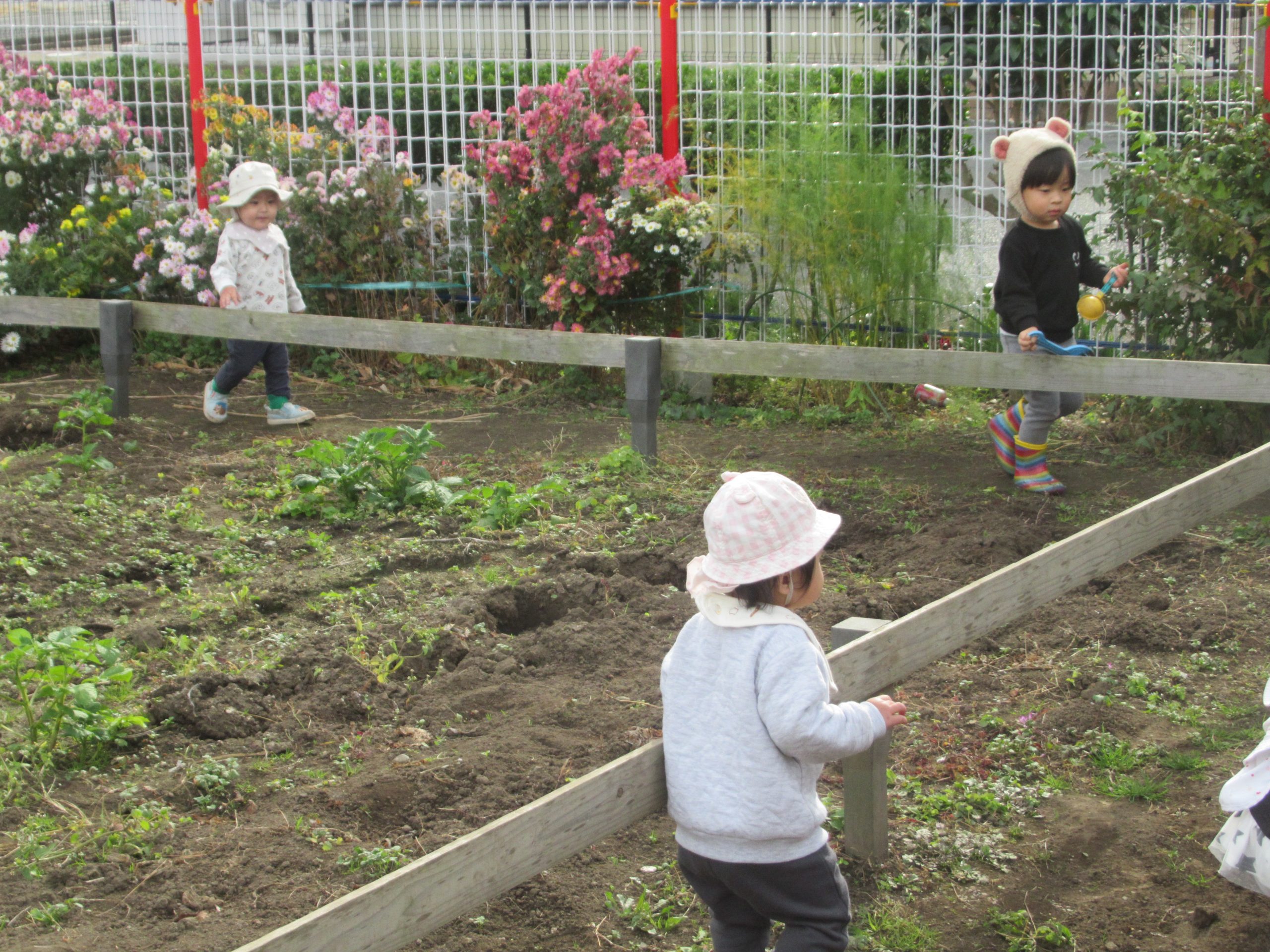 日差しが隠れると、厳しい寒さ到来間近のちょっと寒そうな園庭ですが、ことり組さんはお外が大好きです。先生が「おイスを・・・」と話しだすと最後まで言い切らないうちに、お外に行く気持ちになってソワソワし始めます。にじ・はな組さんの遊んでいるところに行って眺めたり一緒にやったりして、ことり組さんは一か所にとどまらず活発に動き回っています。