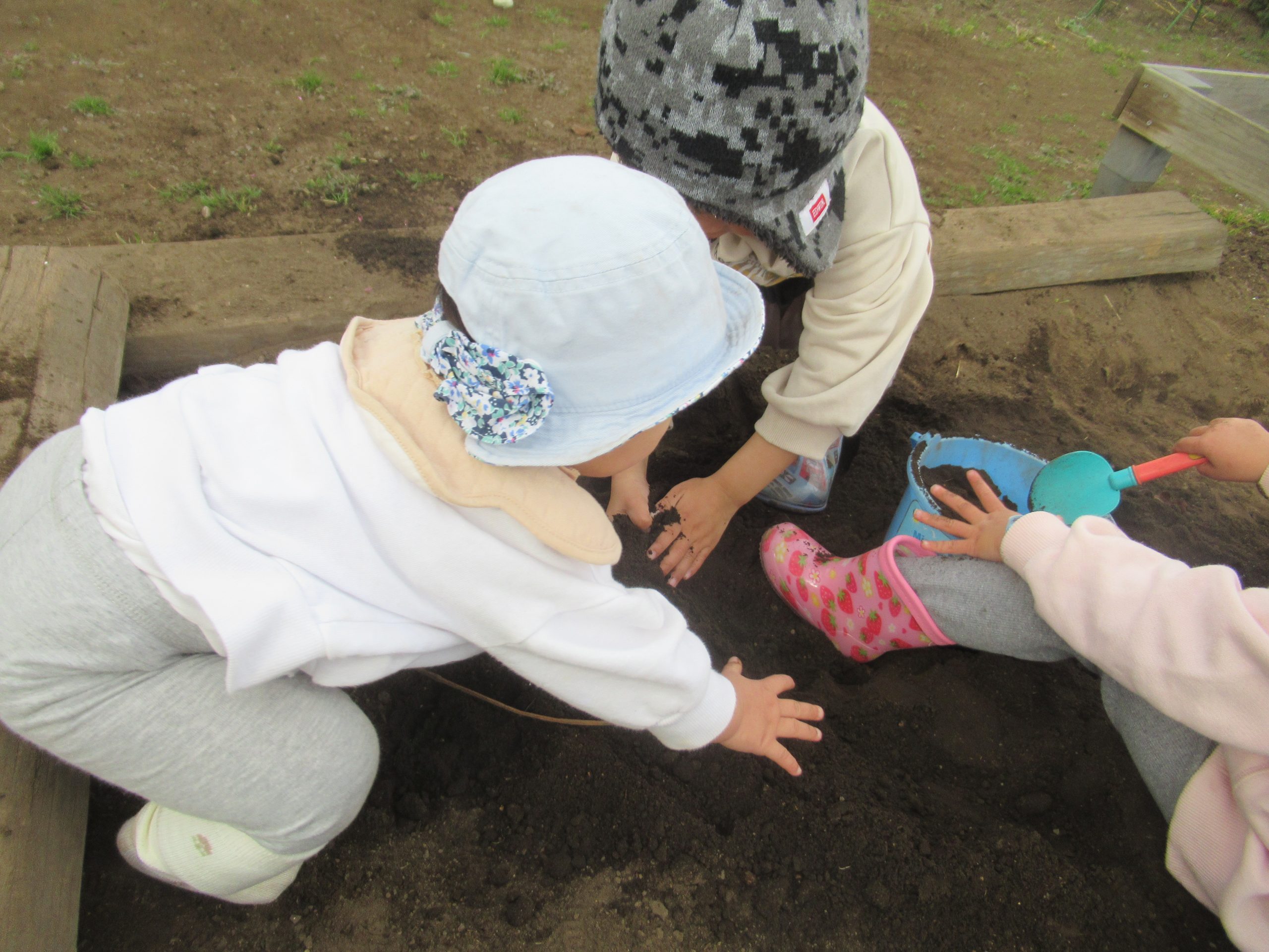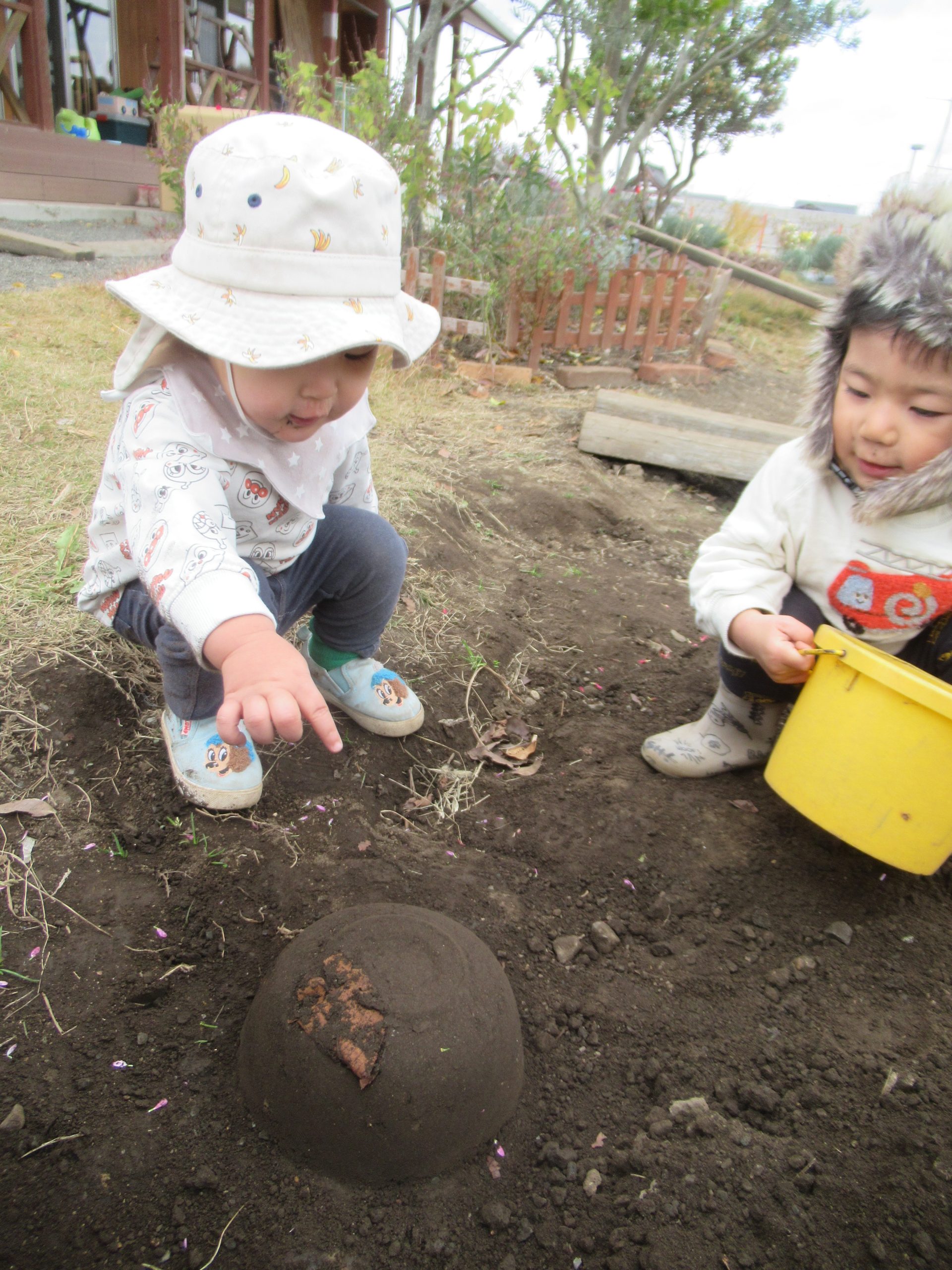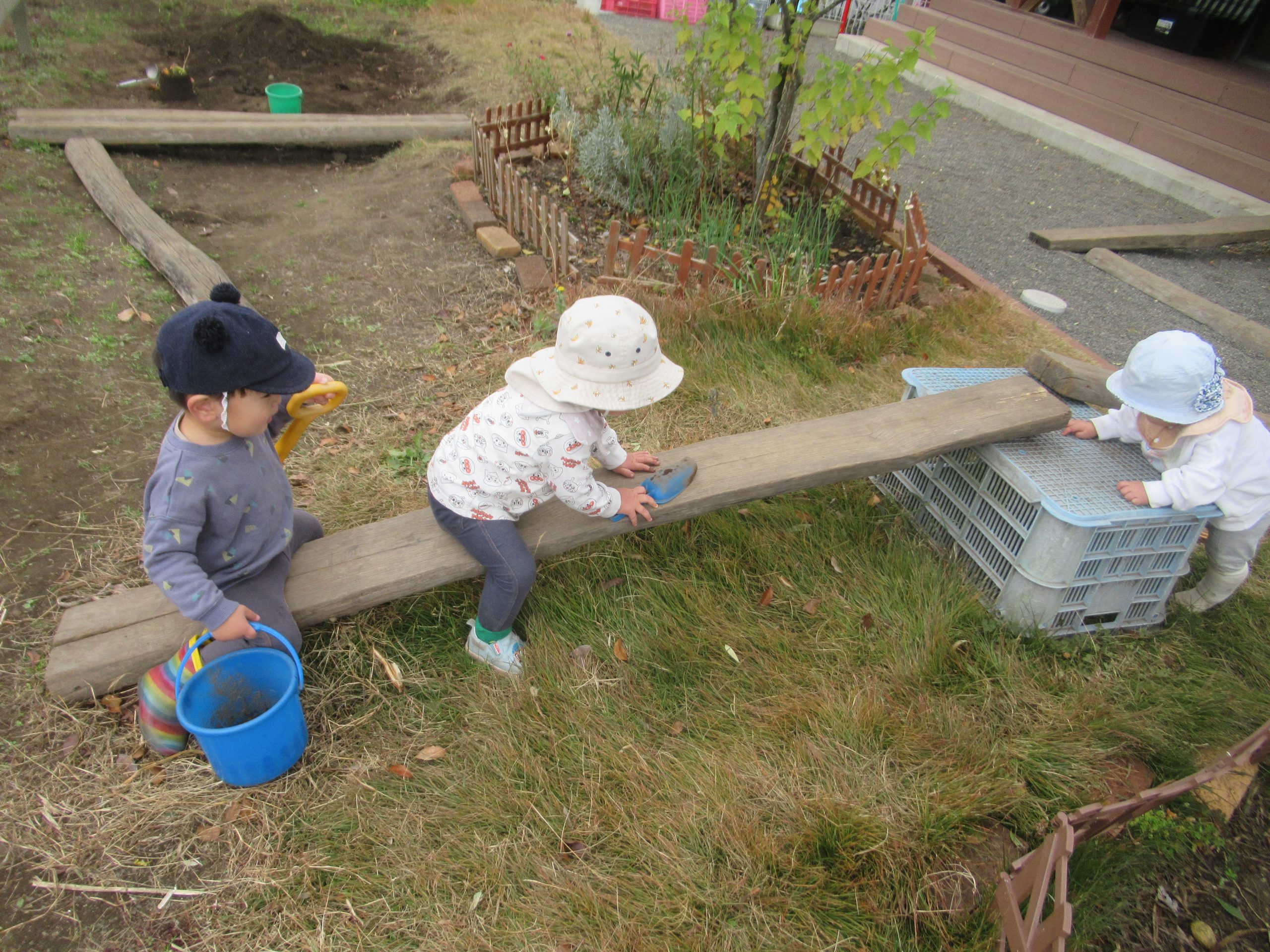 ことり組さんも、シャベルや容器を持っているだけで満足そうだったのが、使ってみる!に進歩しつつあります。天候がいい日には戸外に出ていっぱい遊んでいきます。
