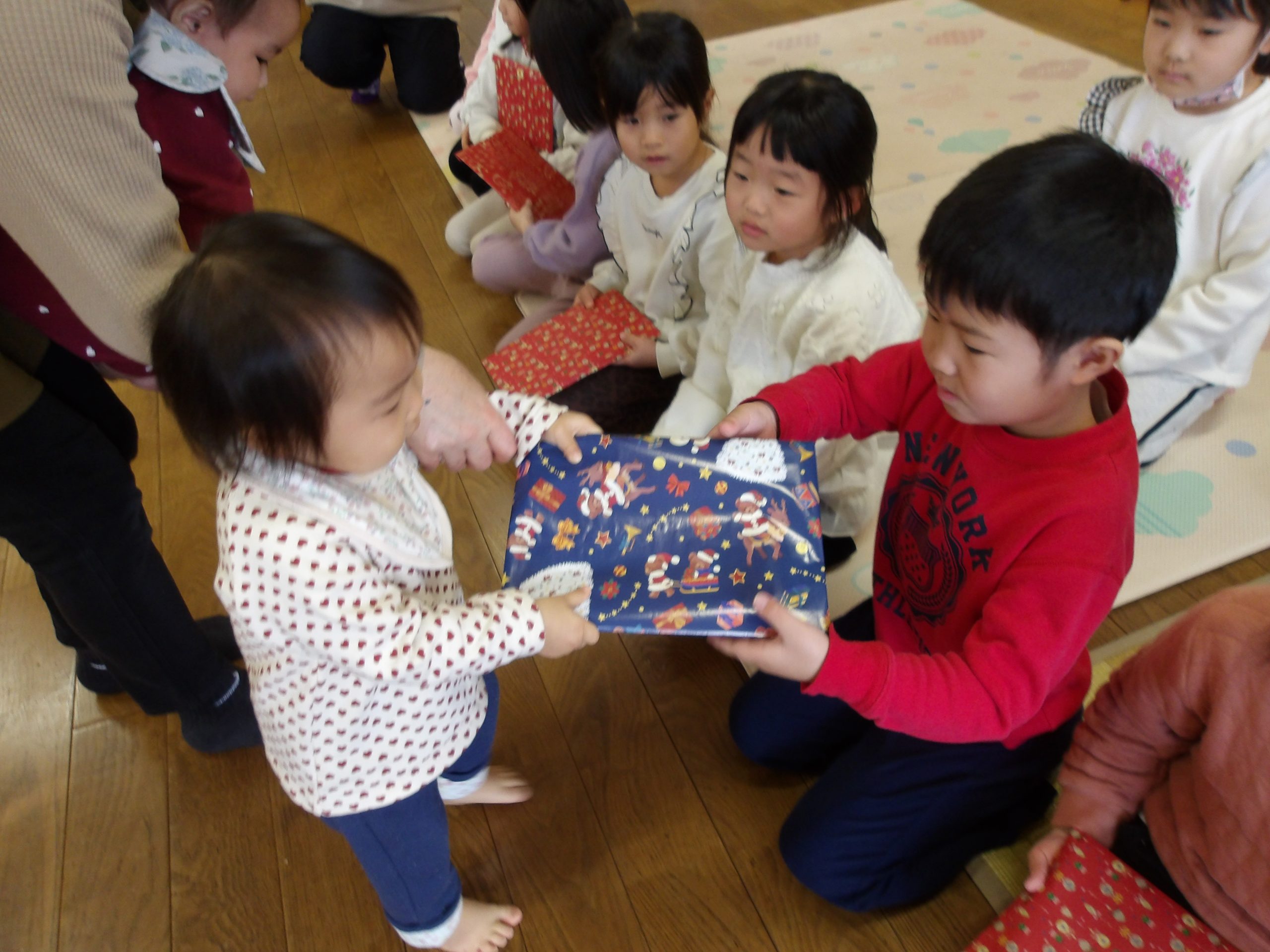 つき組さんと交流のひと時を持ちました。聖誕劇をじっくり見入る子どもたち。きっと“あっ知ってる”と思いながら見ていたことと思います。天使さんの動作に併せて、思わず手を拡げたことり組のRちゃんとEちゃん。最後まで見届けていました。あわてんぼうのサンタクロースを歌ったりプレゼント交換をしたりしてから、昼食(お弁当)を一緒に食べてさよならしました。楽しかった!つき組さんありがとう。