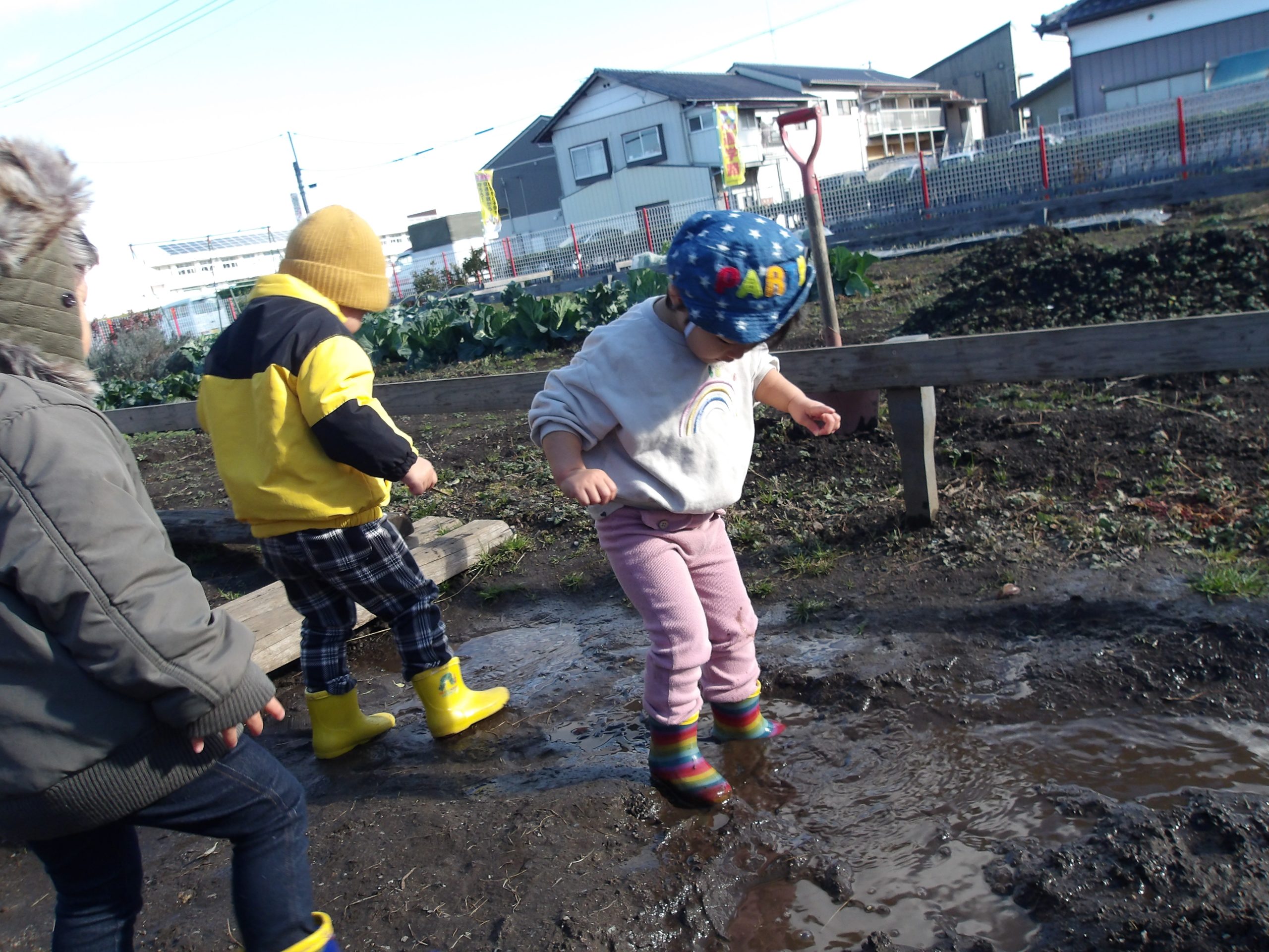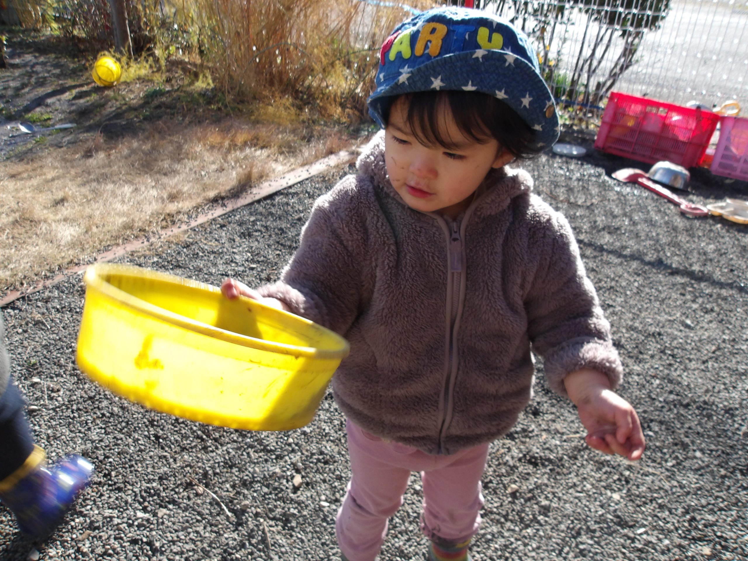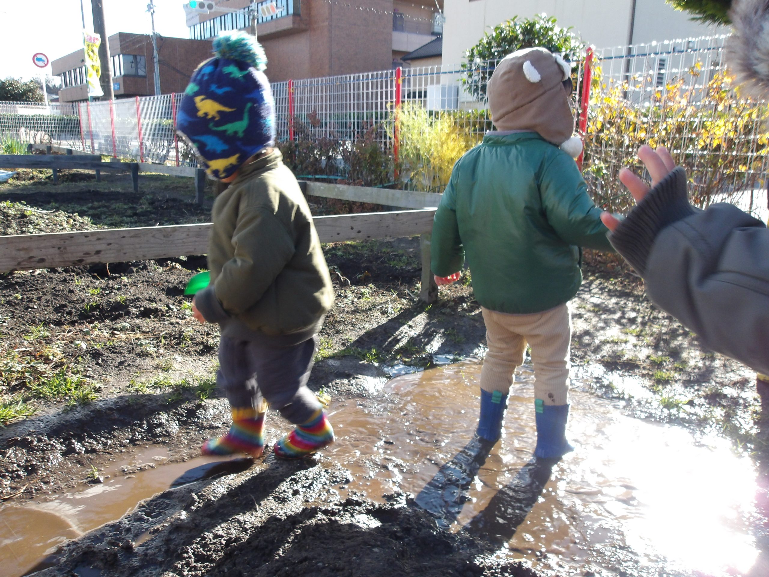今年最後の泥んこ遊び。しばらくぶりの雨降りで、外に出ると早速泥んこに集まった子どもたち。さすがに寒さを感じたのか、濡れないようにしながらおもちゃを使って遊んでいました。皆さん良いお年をお迎えください。