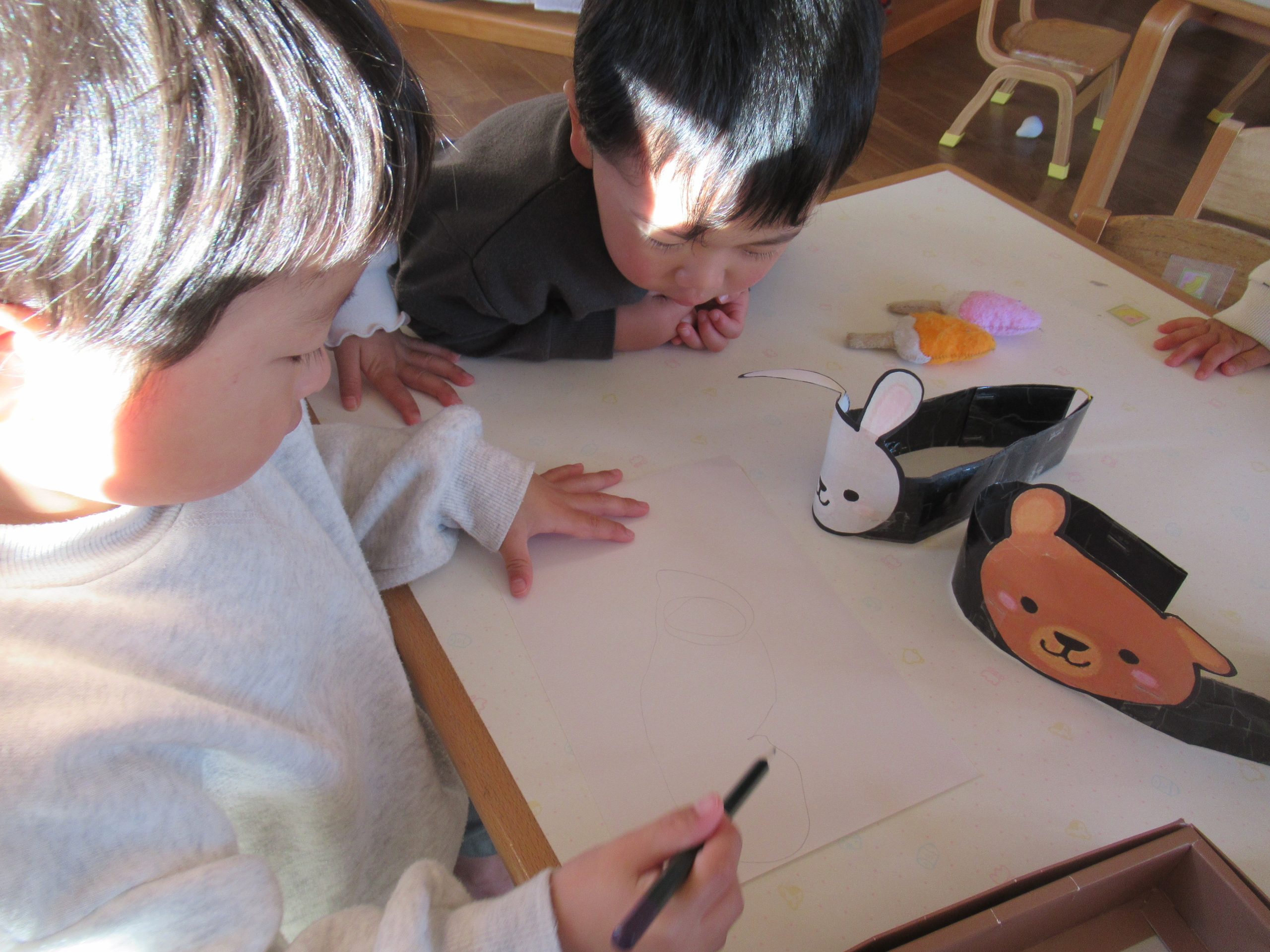 動物村の動物になって遊びました。ことり組さんも喜んでお面を被って遊びだしたのですが、ことり組同士で自然に集まってきます。「ねぇねぇこれ」とか「あっまってー」など言葉が聞こえてきそうです。言葉は交わさなくても通じ合っていることり組さんたちです。窓ガラスに映った自分の姿がお友だちに見えたのか、Eちゃんは一所懸命呼びかけているようでした。