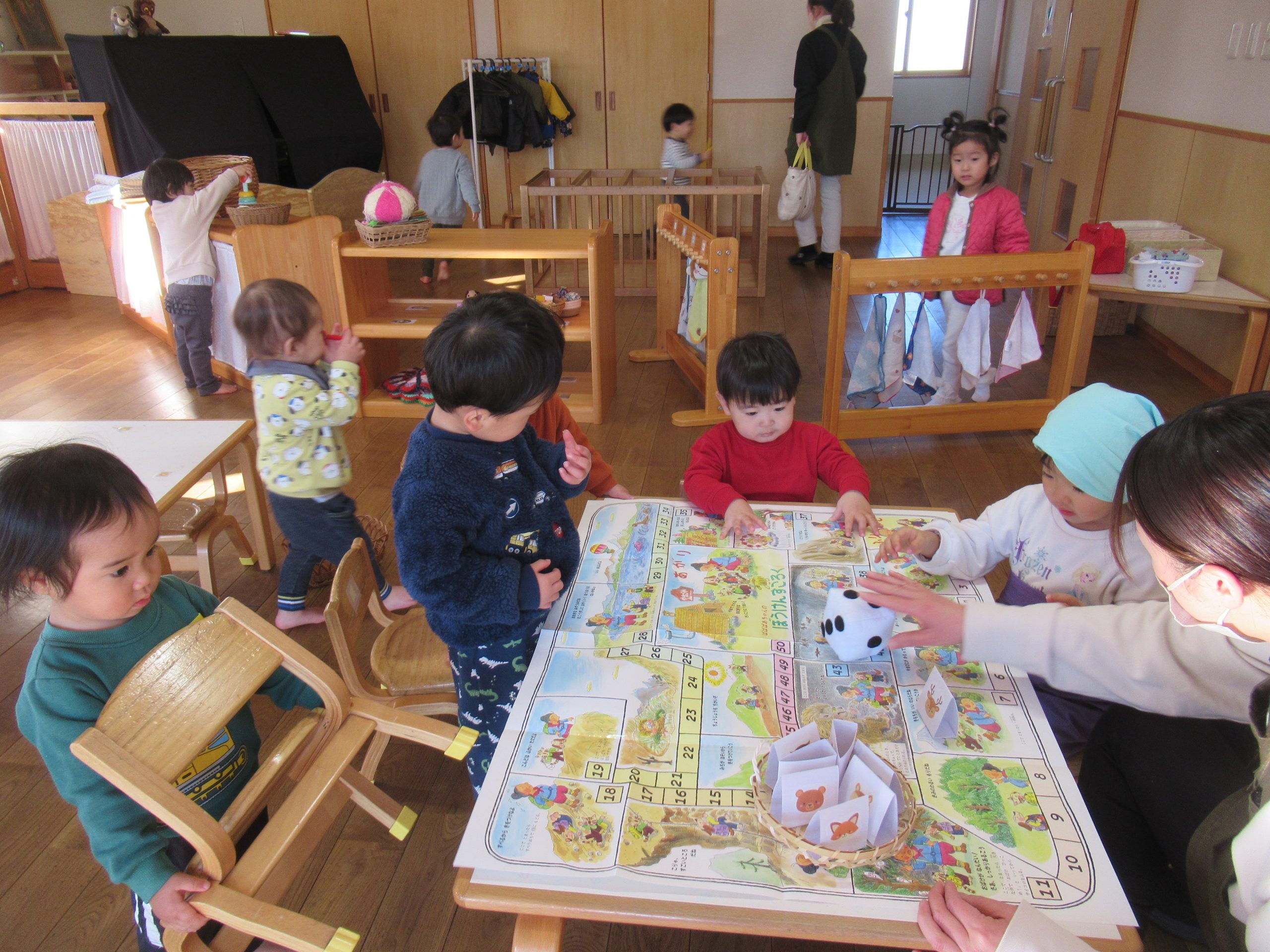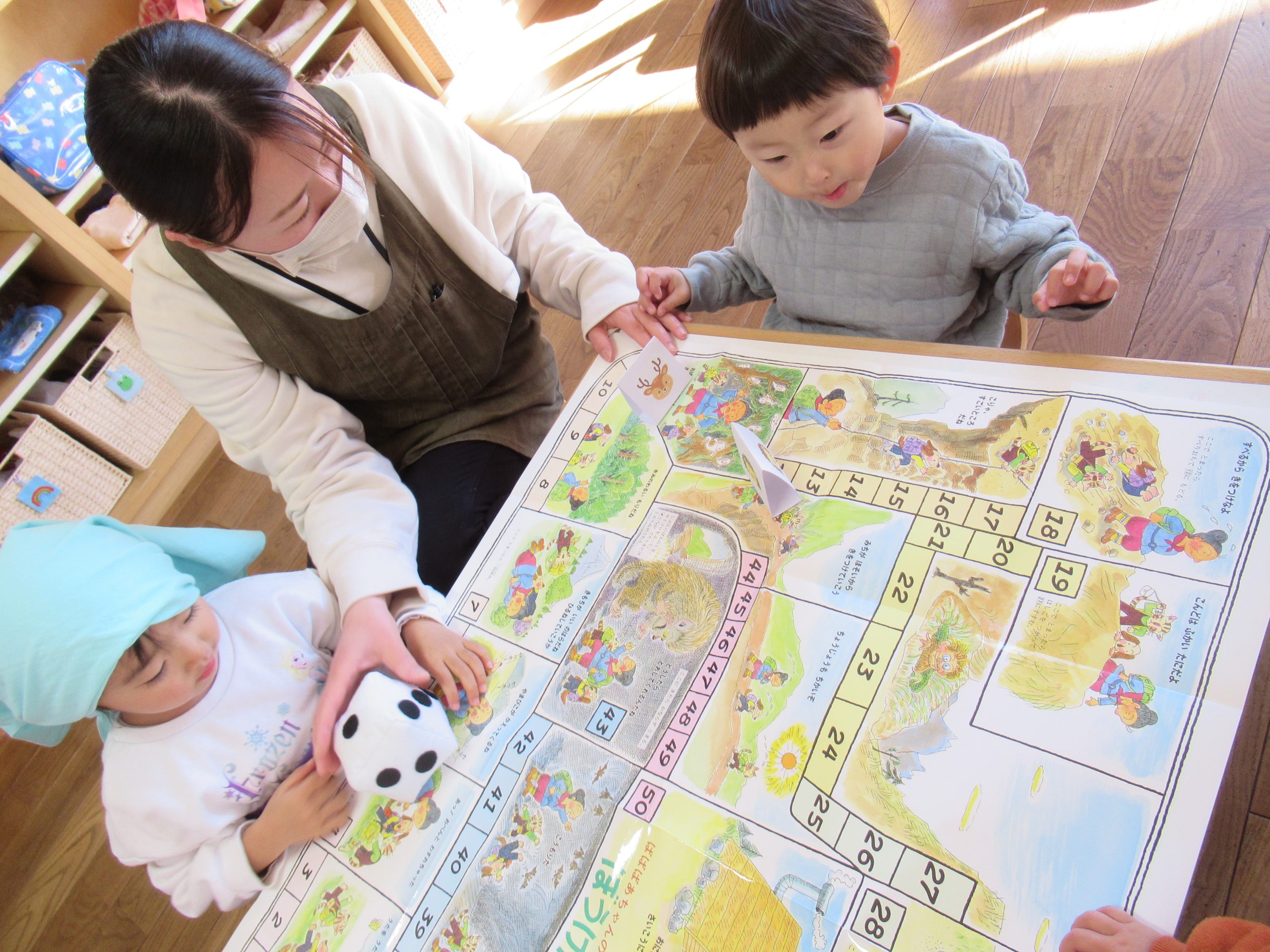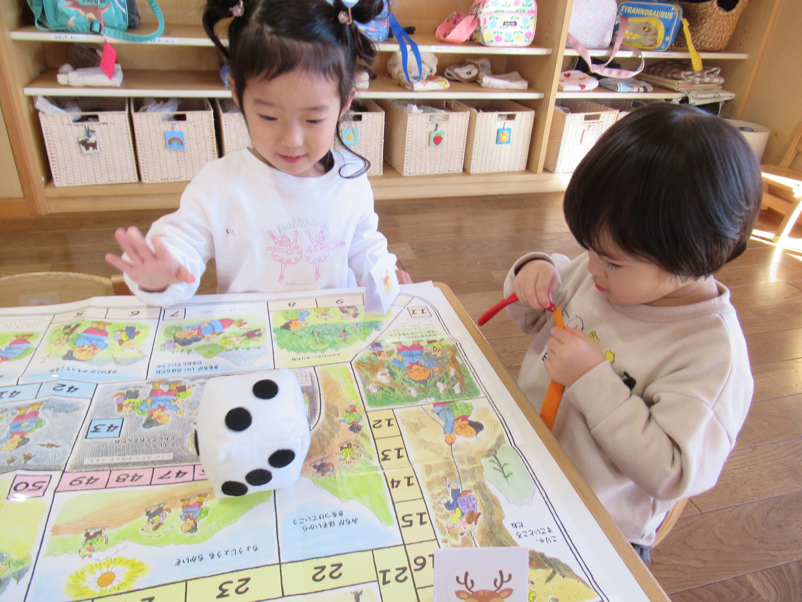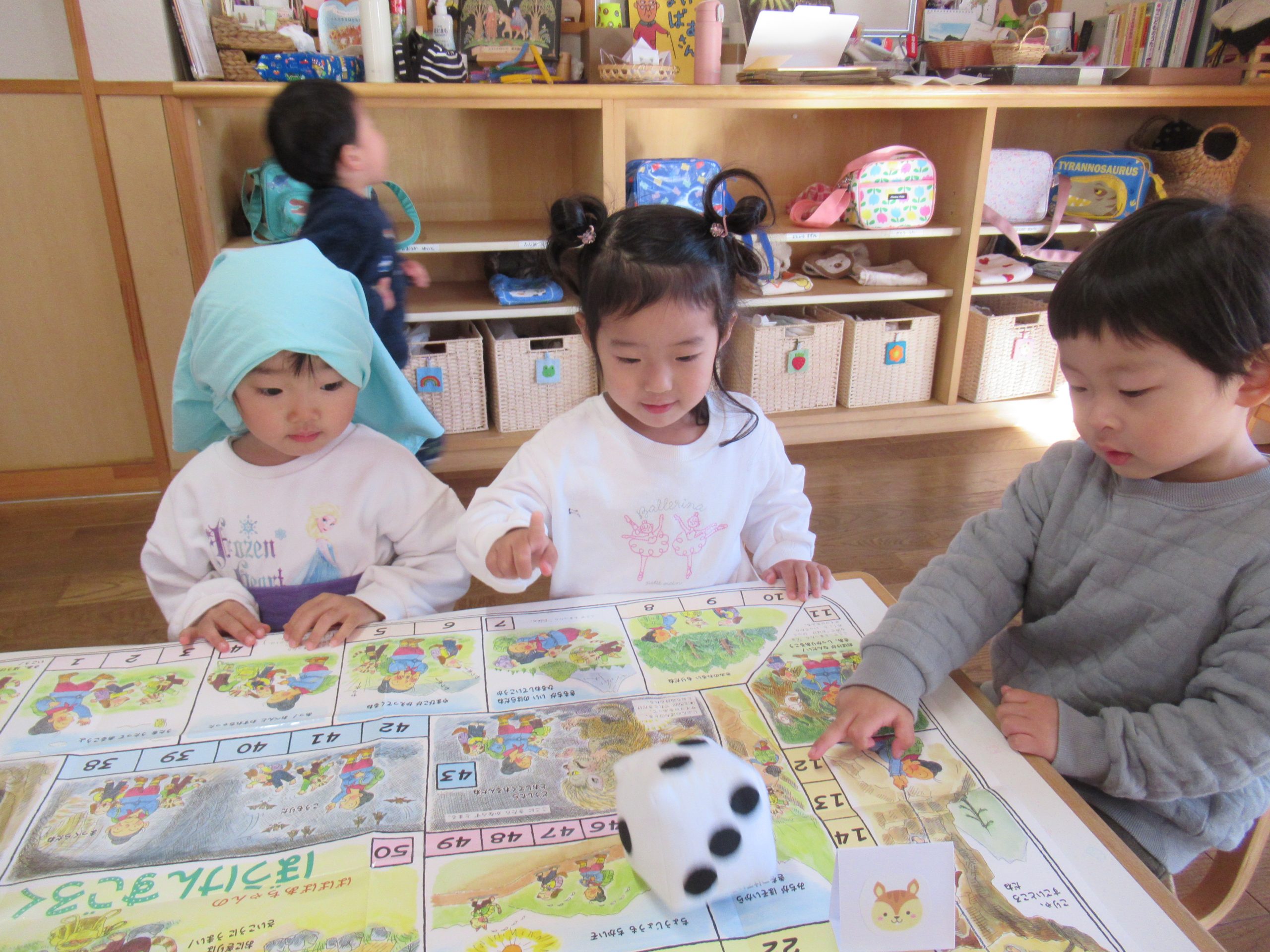 すごろく遊びをしました。振ったさいころの出た目(1~3)の数っだけ進むルールは、ちょっと難しかったですが、さいころを振るのは楽しそう。出た目の数分だけ進むのは、先生がやっているのを真似て言葉では言っています。が、自分の好きな所に好きなようにちょんちょんちょん。と。数え方遊びを楽しみました。