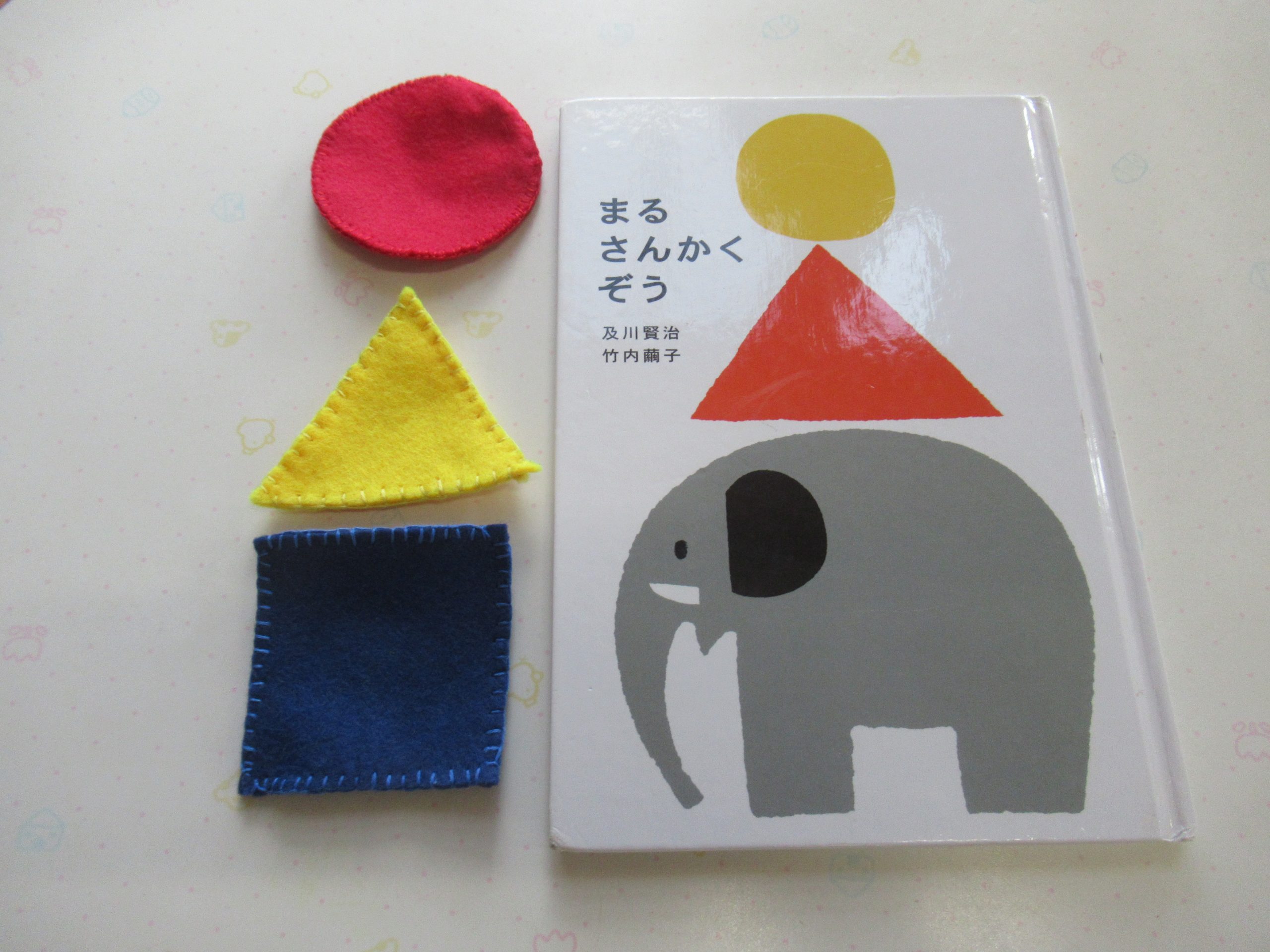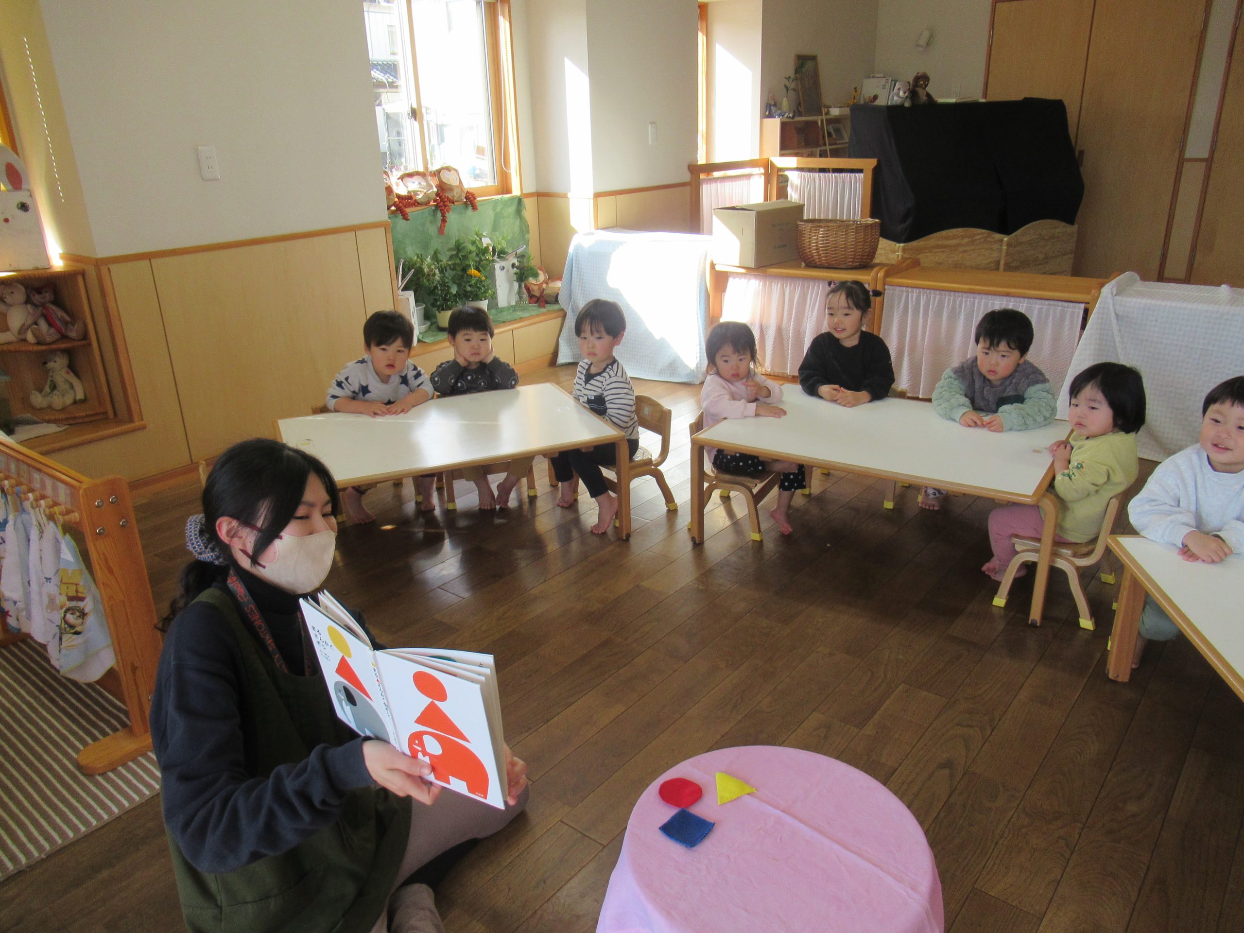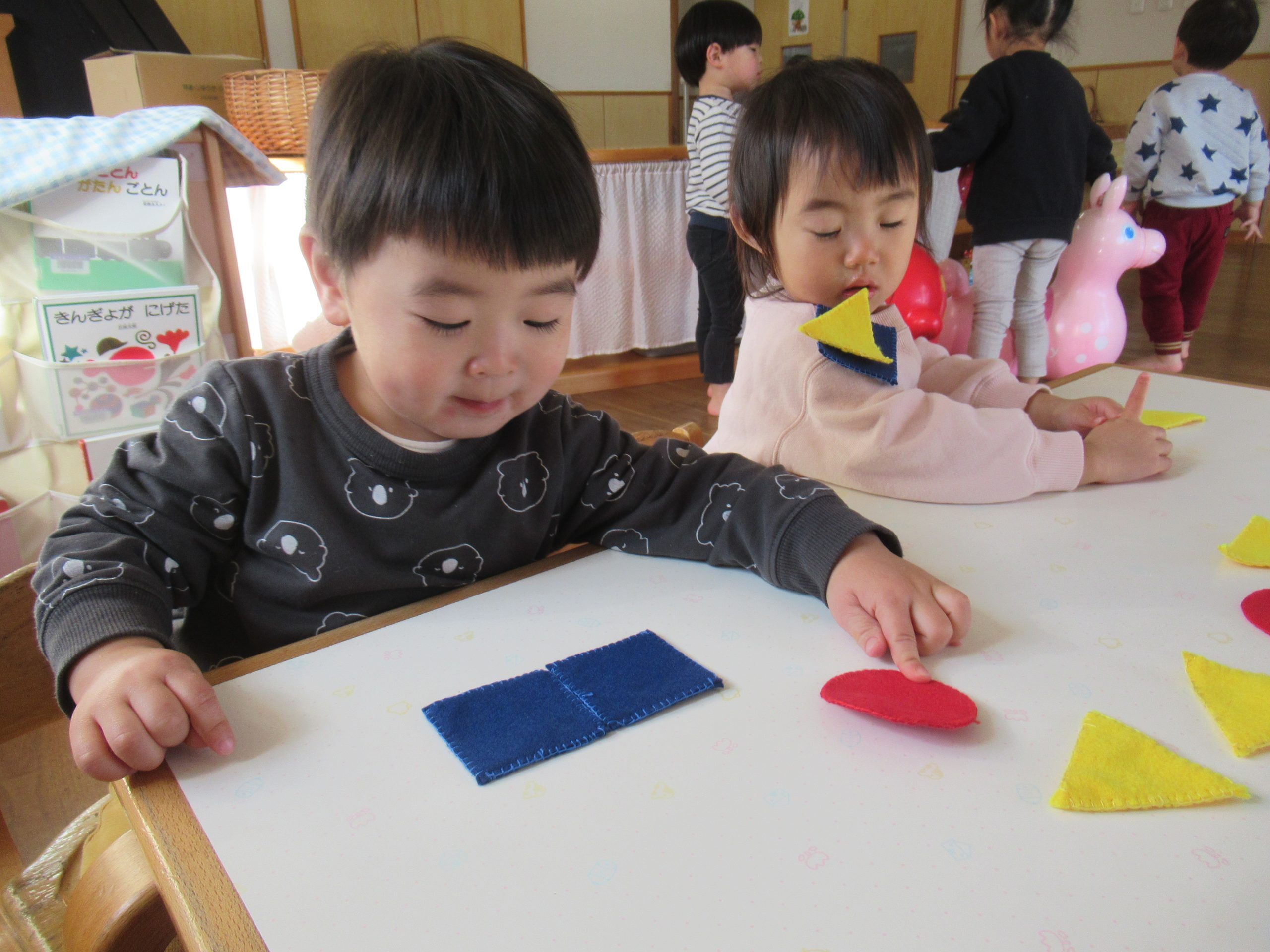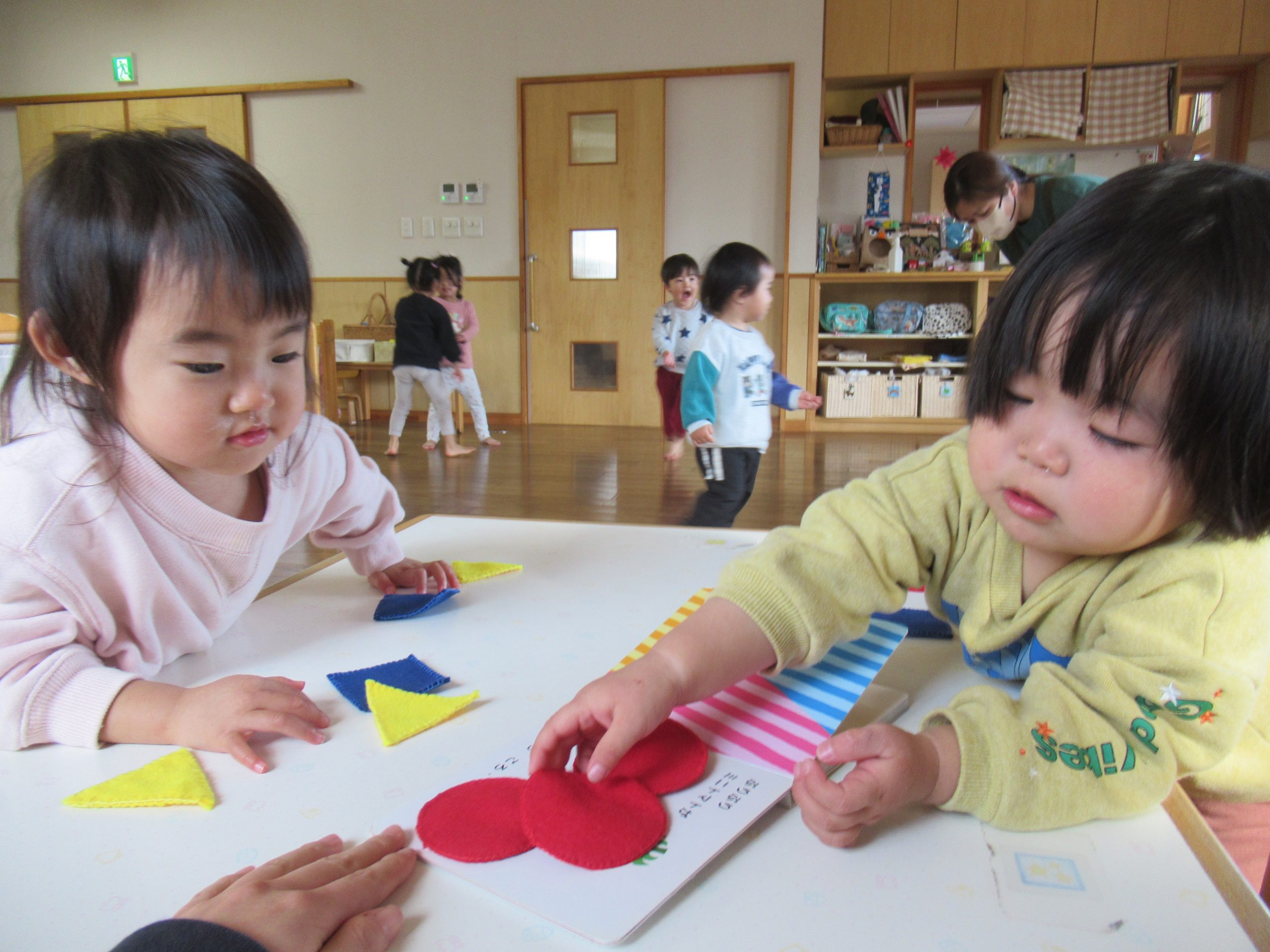 これまでも様々な遊びの中で、色や形を使って遊んできましたが、今度は赤い丸や黄色い三角など、色と形が一緒になっているものを使って、組み合わせ遊びをしていきます。