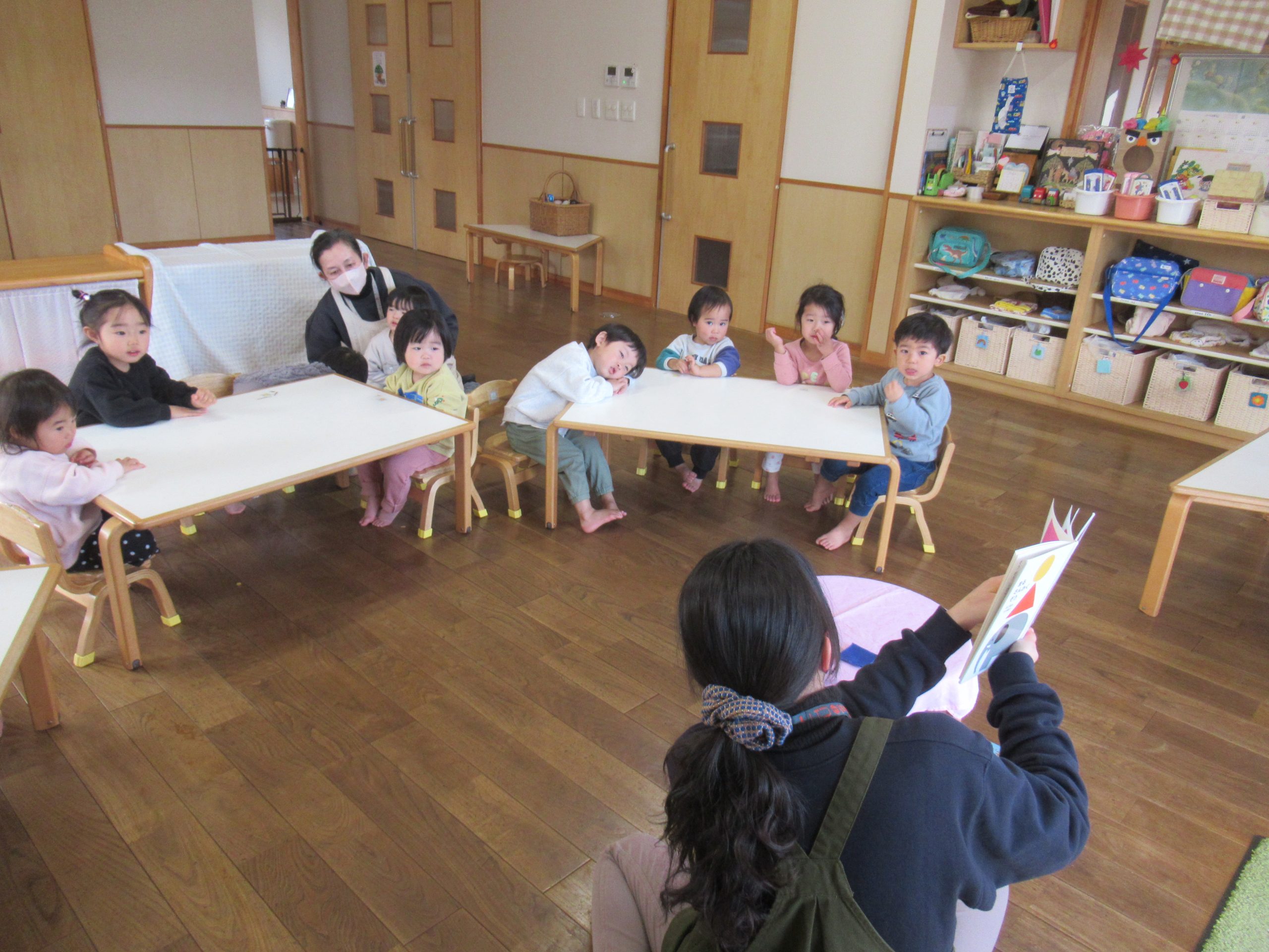 今日移動図書館の司書さんに読んでもらった絵本は「わにわにのおふろ」。大型絵本に描かれたワニは迫力があって怖そうですが、みんな真剣に見ていました。ページをめくるたびに出てくる擬音が、子どもの想像をひろげるのでしょうか? カード取りも、「白い(青い・赤いetc)ものは何でしょう・・・」。ときいて、絵を見極めて取るのですが、大人でもわかりにくい絵でも、これだ!と迷わず手を出して取っていました。