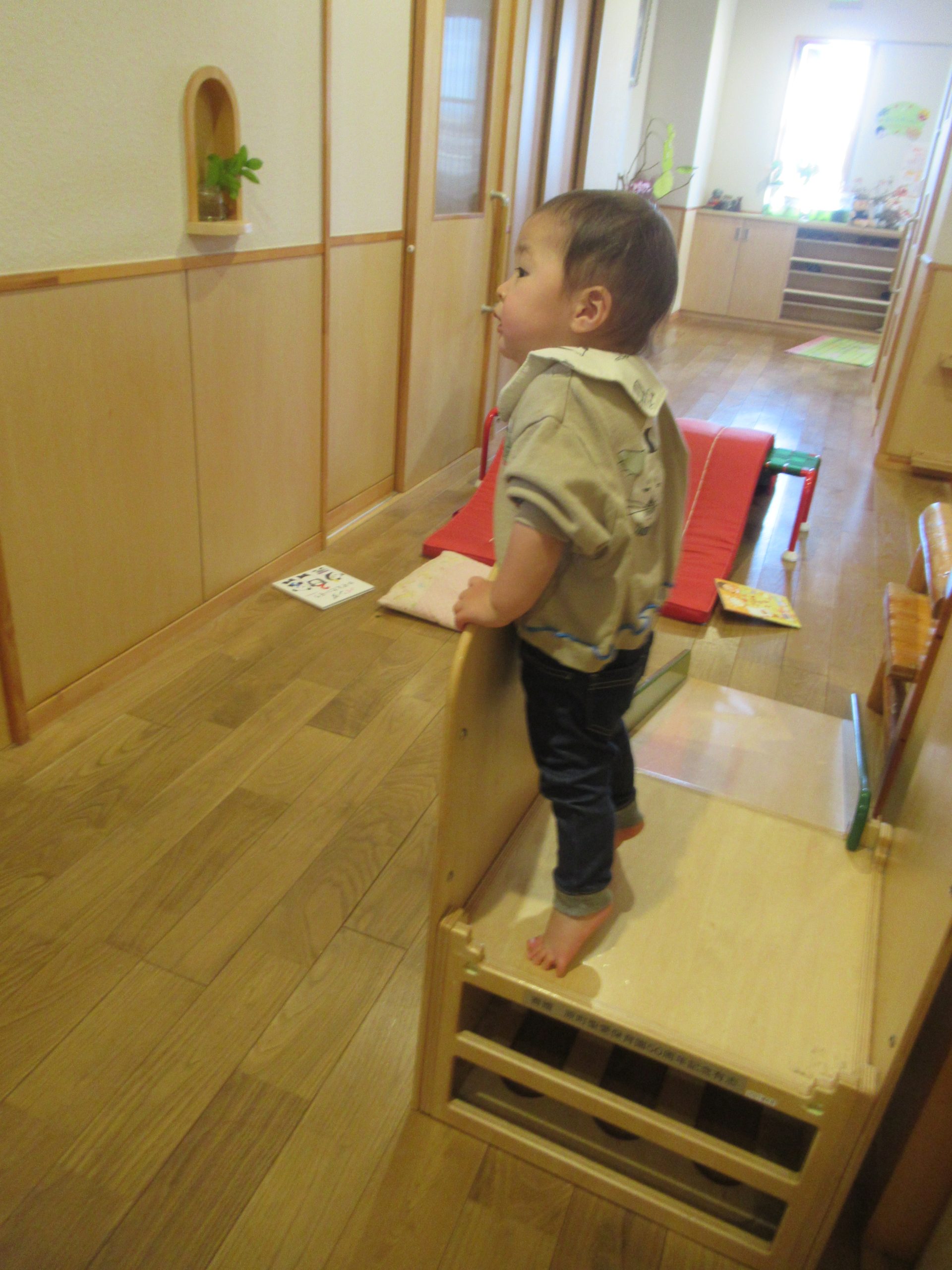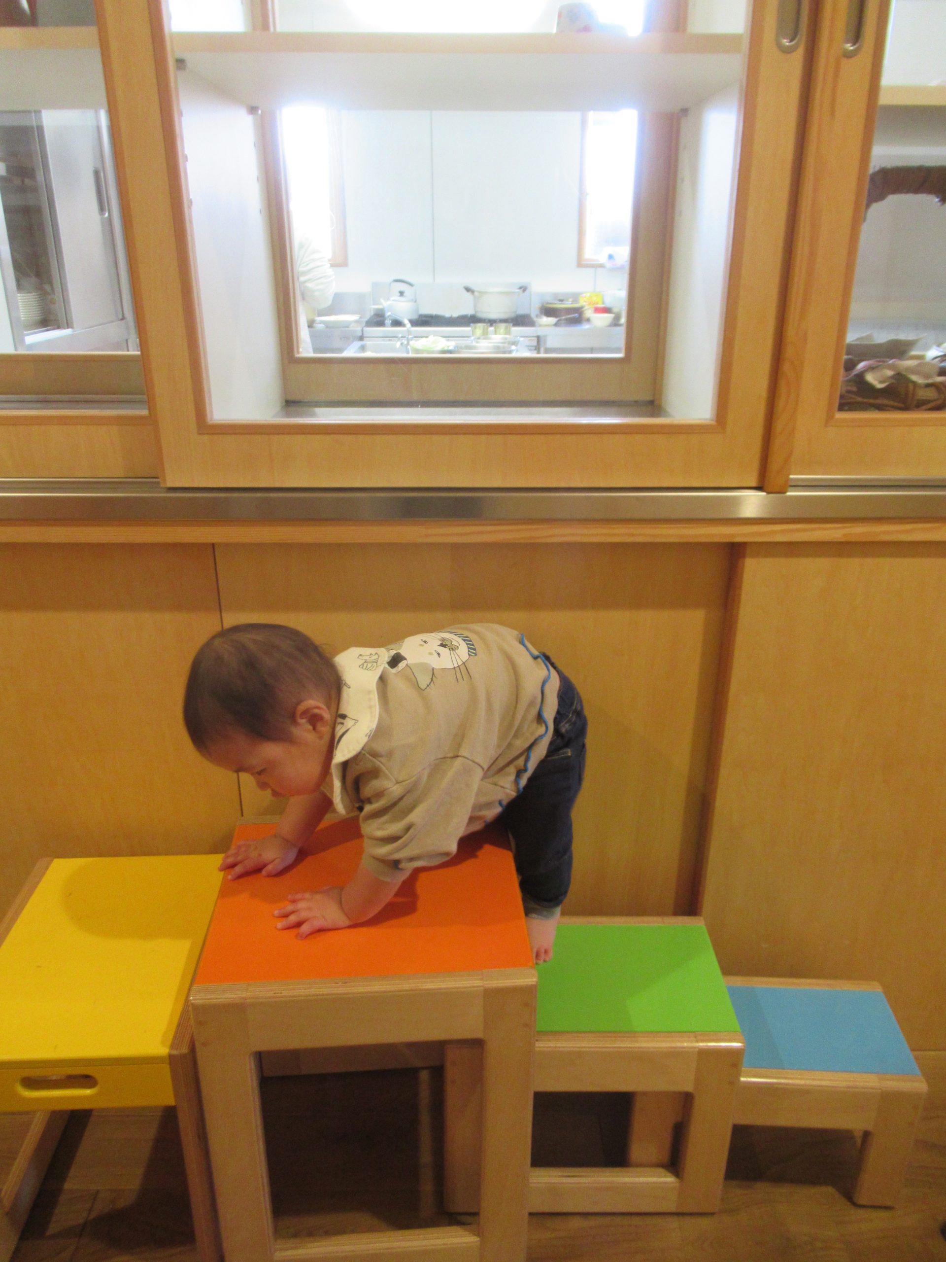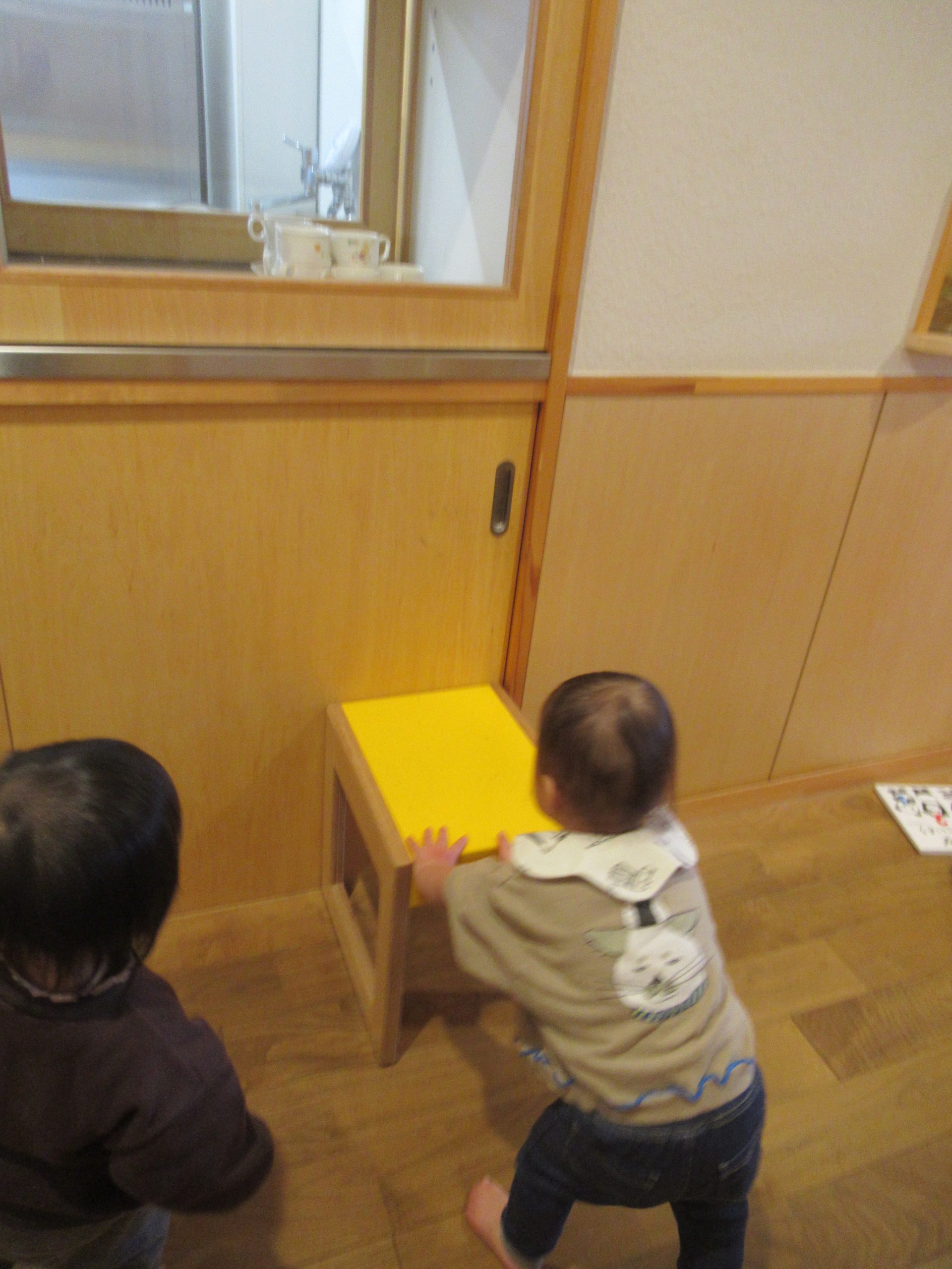 どうしても見たいものがあるS君。背伸びをしても滑り台の上に上がっても、給食室の中が見えません。そうだ❢と気が付いて、椅子を運んできました。それでも見えないと分かると、それよりも大きい椅子を窓の下まで押してきて・・・。と、その間に友だちも便乗して、やってみるけどなかなか見えません。工夫をしたり同調したり、小さいながらも主体的に遊ぶ姿でした。