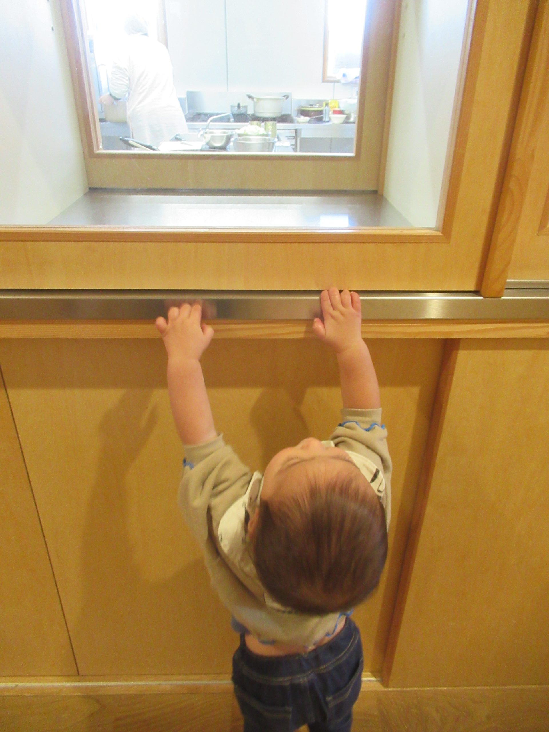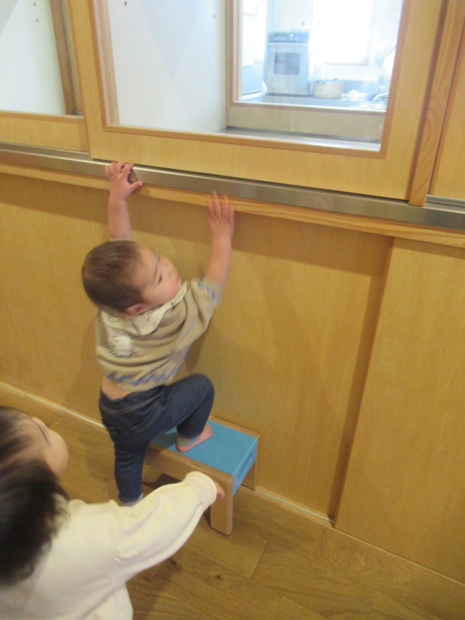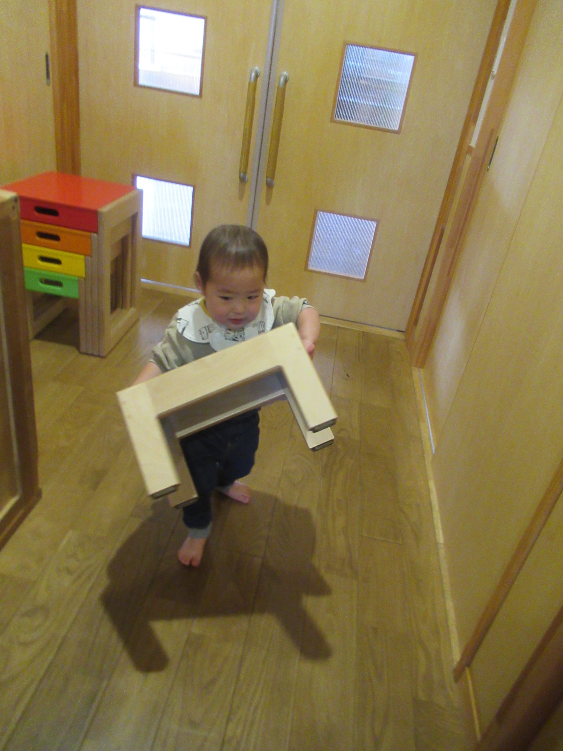 どうしても見たいものがあるS君。背伸びをしても滑り台の上に上がっても、給食室の中が見えません。そうだ❢と気が付いて、椅子を運んできました。それでも見えないと分かると、それよりも大きい椅子を窓の下まで押してきて・・・。と、その間に友だちも便乗して、やってみるけどなかなか見えません。工夫をしたり同調したり、小さいながらも主体的に遊ぶ姿でした。