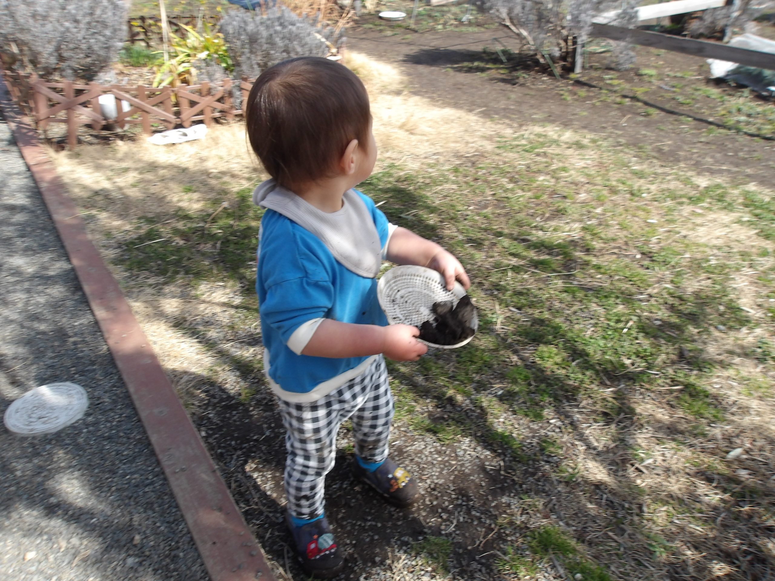 ことり組さんもままごと。砂利を入れたりかき混ぜたり、出来上がった(?)ら食べることを真似てみたり。また、先生に作ってもらった、大きなまん丸泥団子を喜んで持ち運んだり。やってもらっていたことから自分でやってみて遊ぶ、になって楽しんでいます。