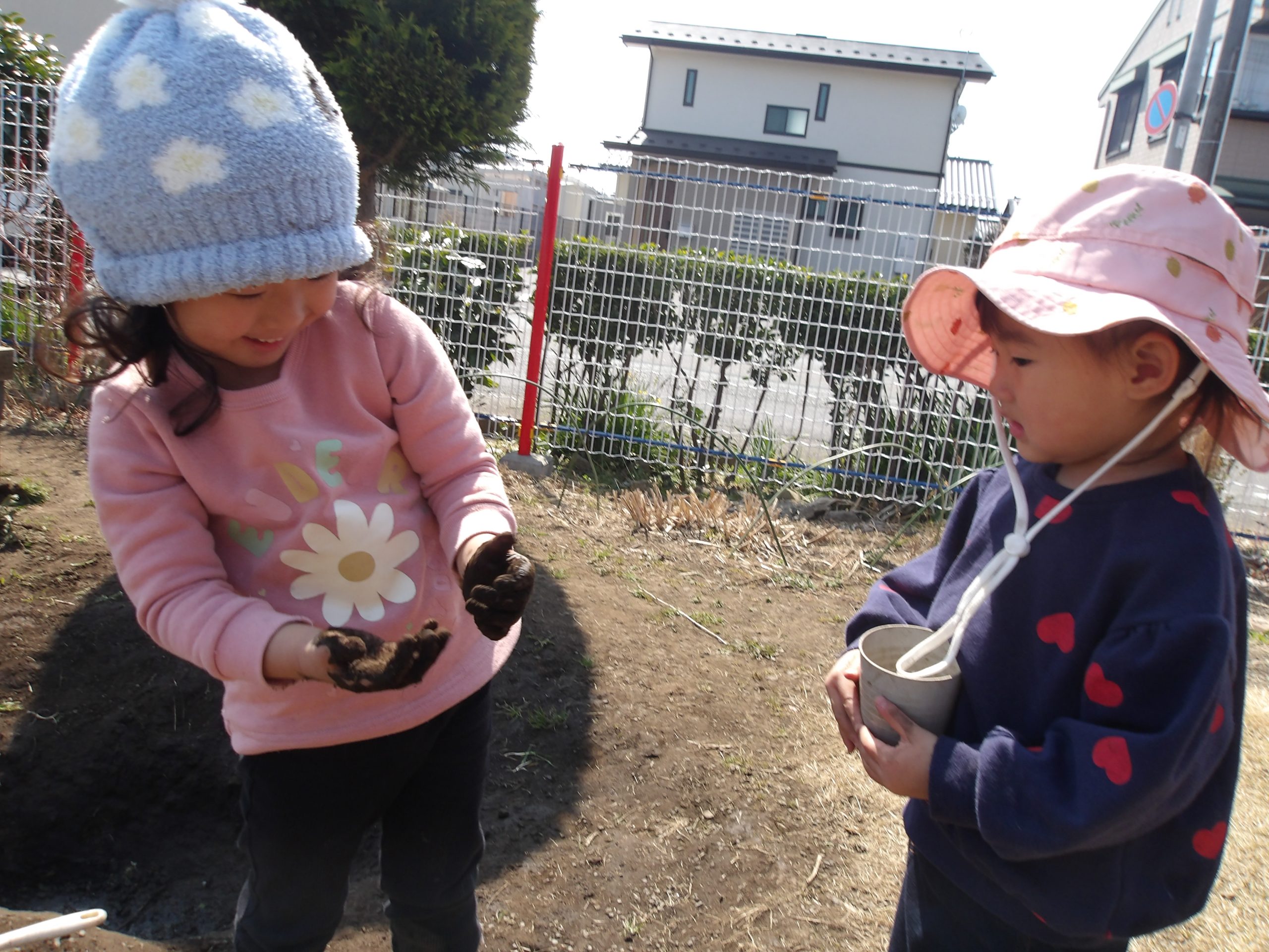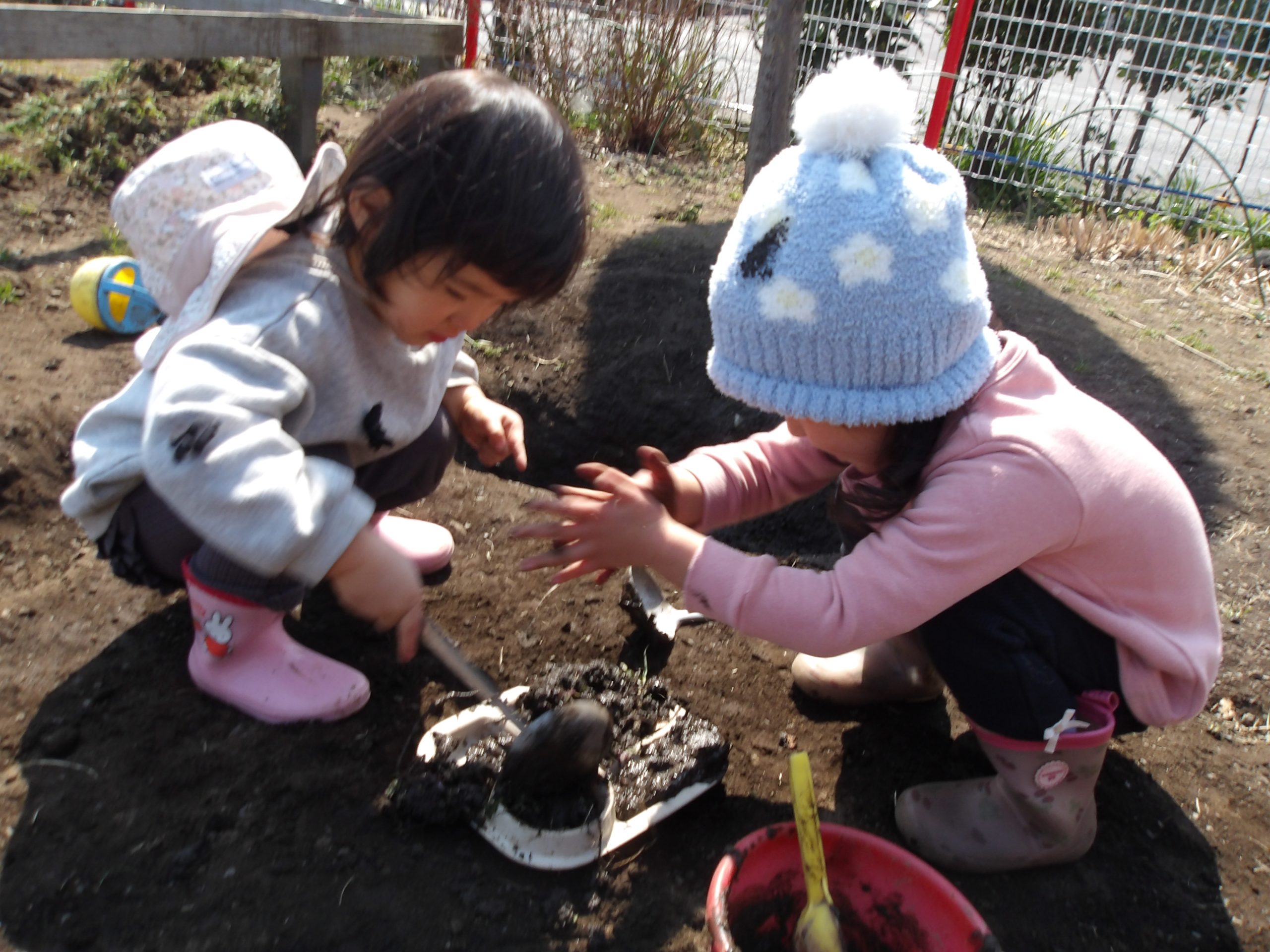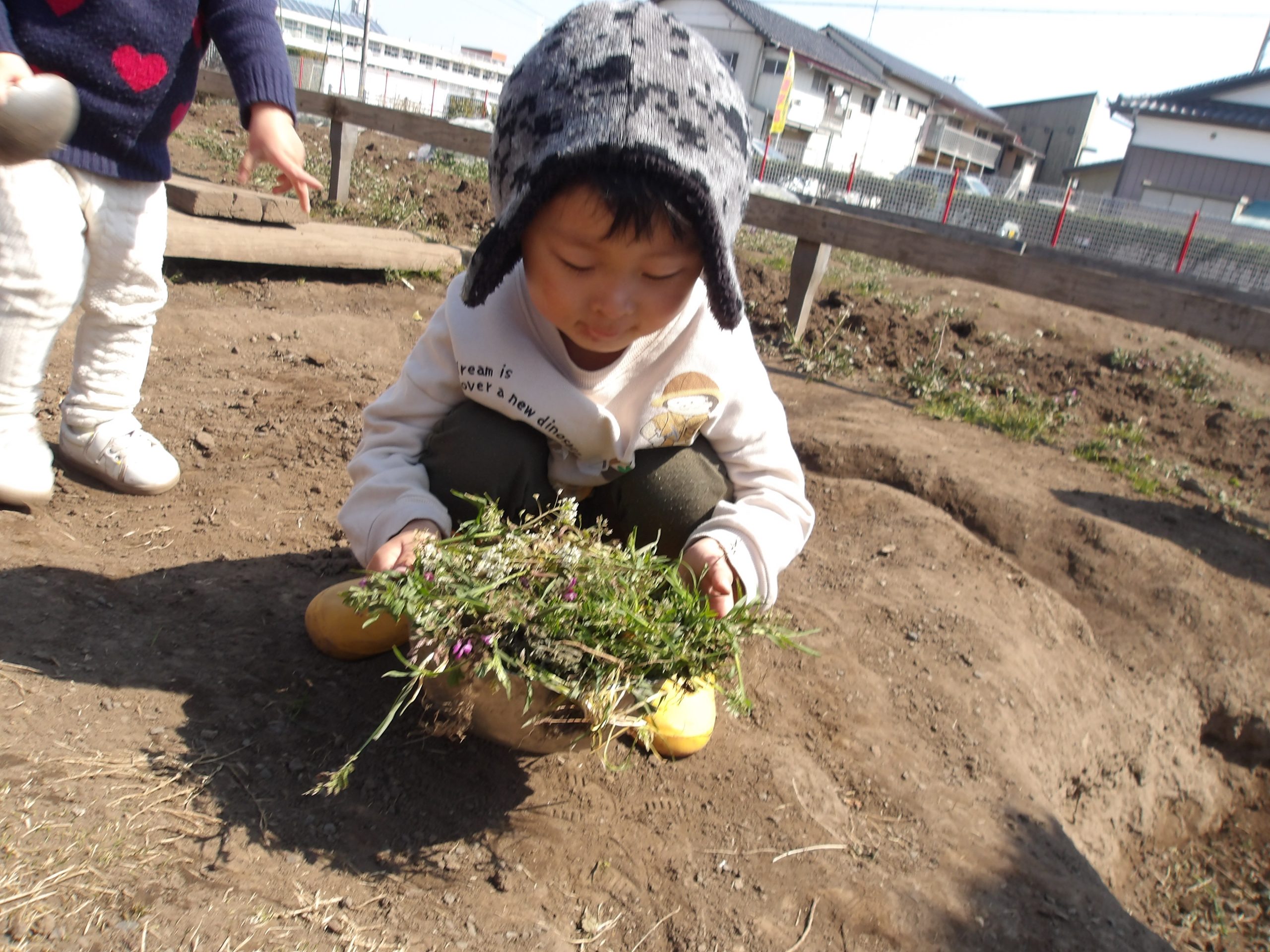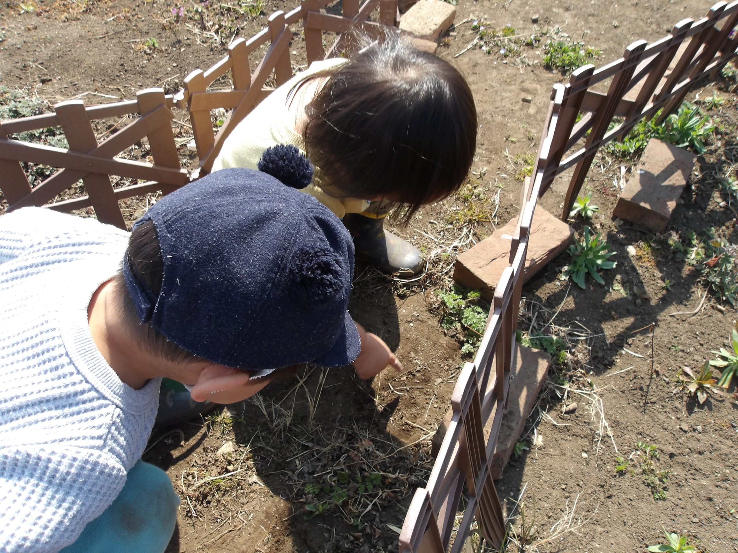 冬でも日差しが暖かい時にはレンガをひっくり返して虫(ダンゴ虫)探しをする子ども達。越冬した蛾は見つけましたがダンゴムシはまだのようで、期待しながら繰り返し探しています。畑の隅の菜の花が寒さに耐えて大株になり、可愛らしい黄色の花を咲かせて、春を運んできてくれたようです。