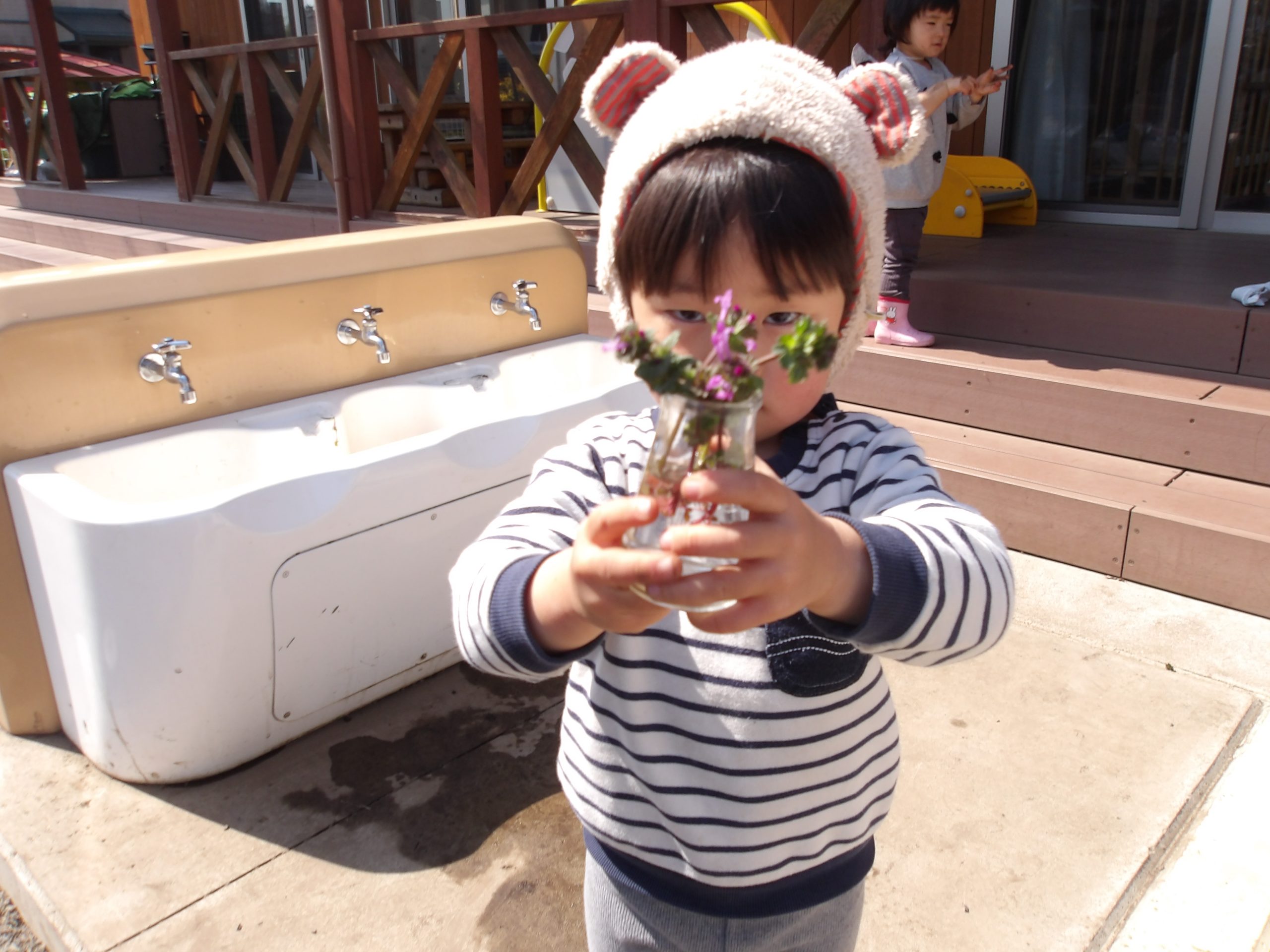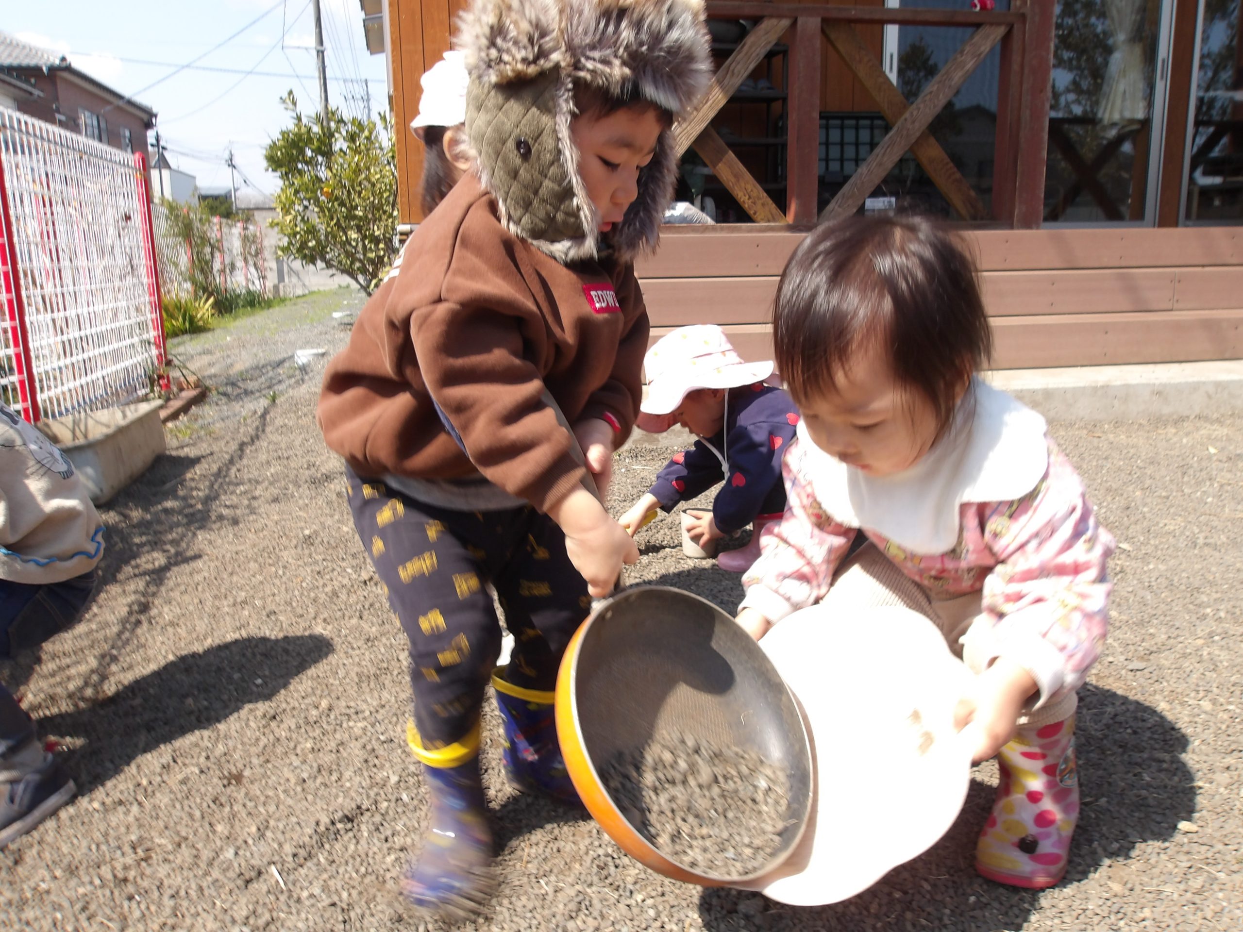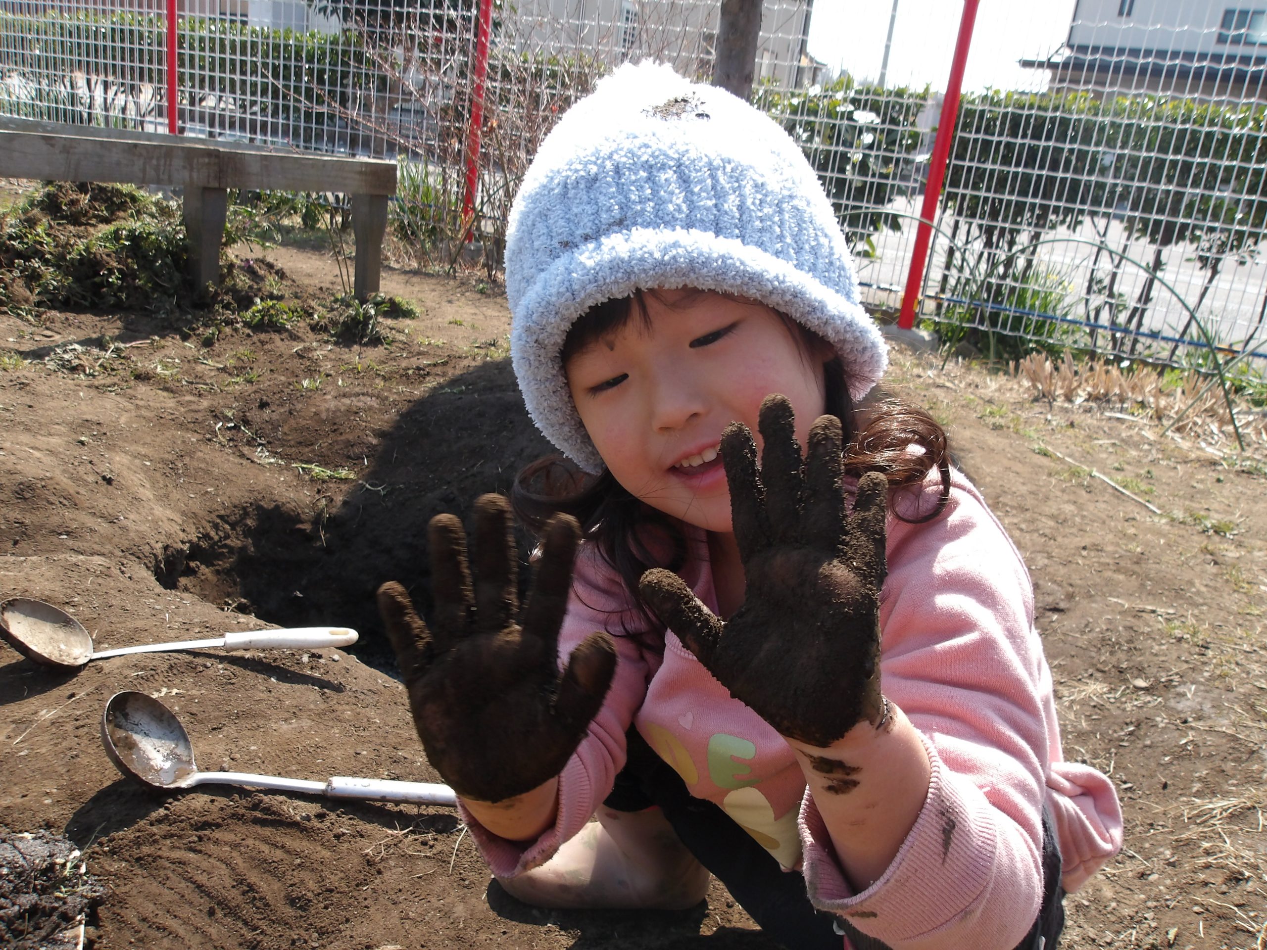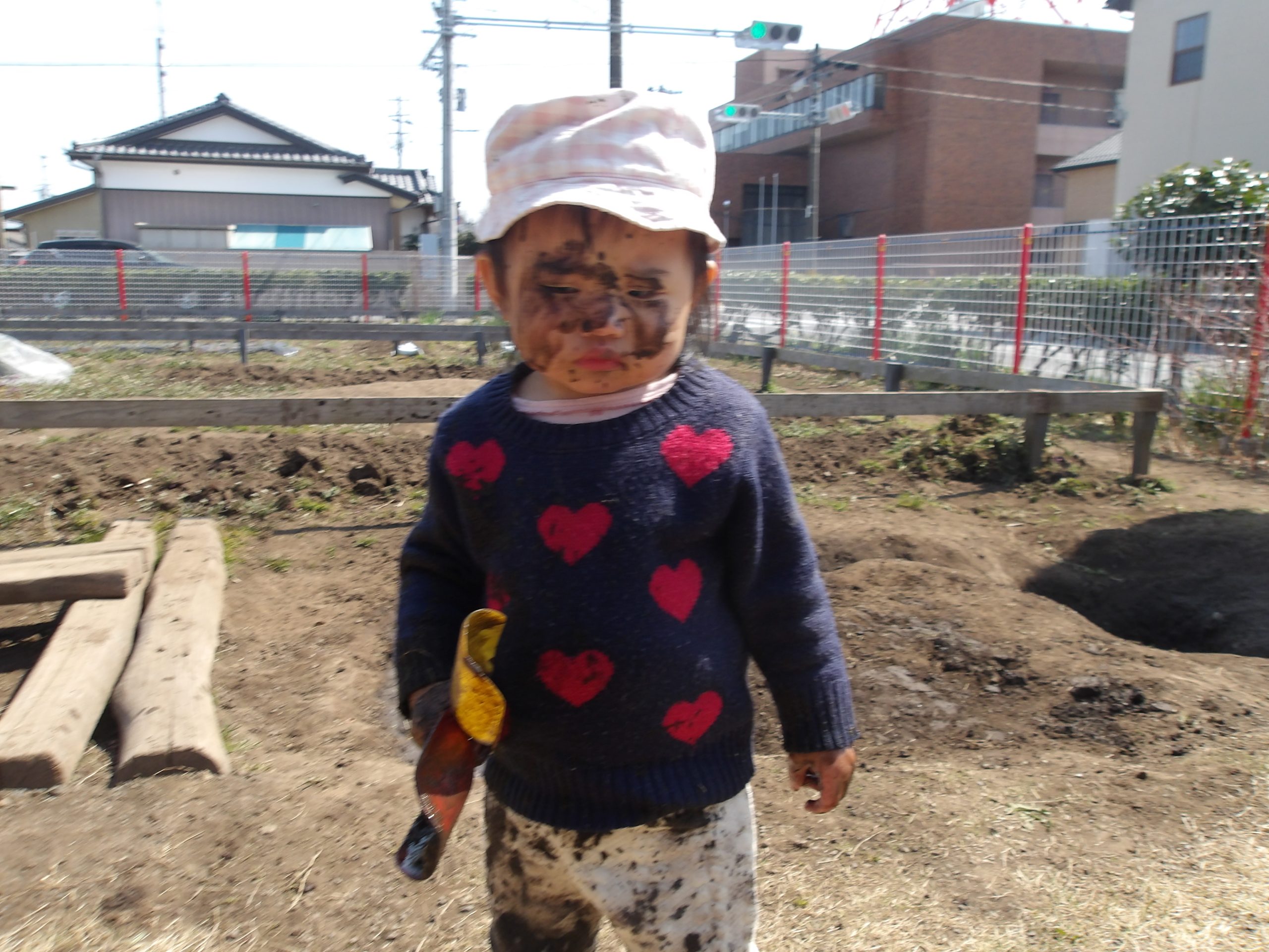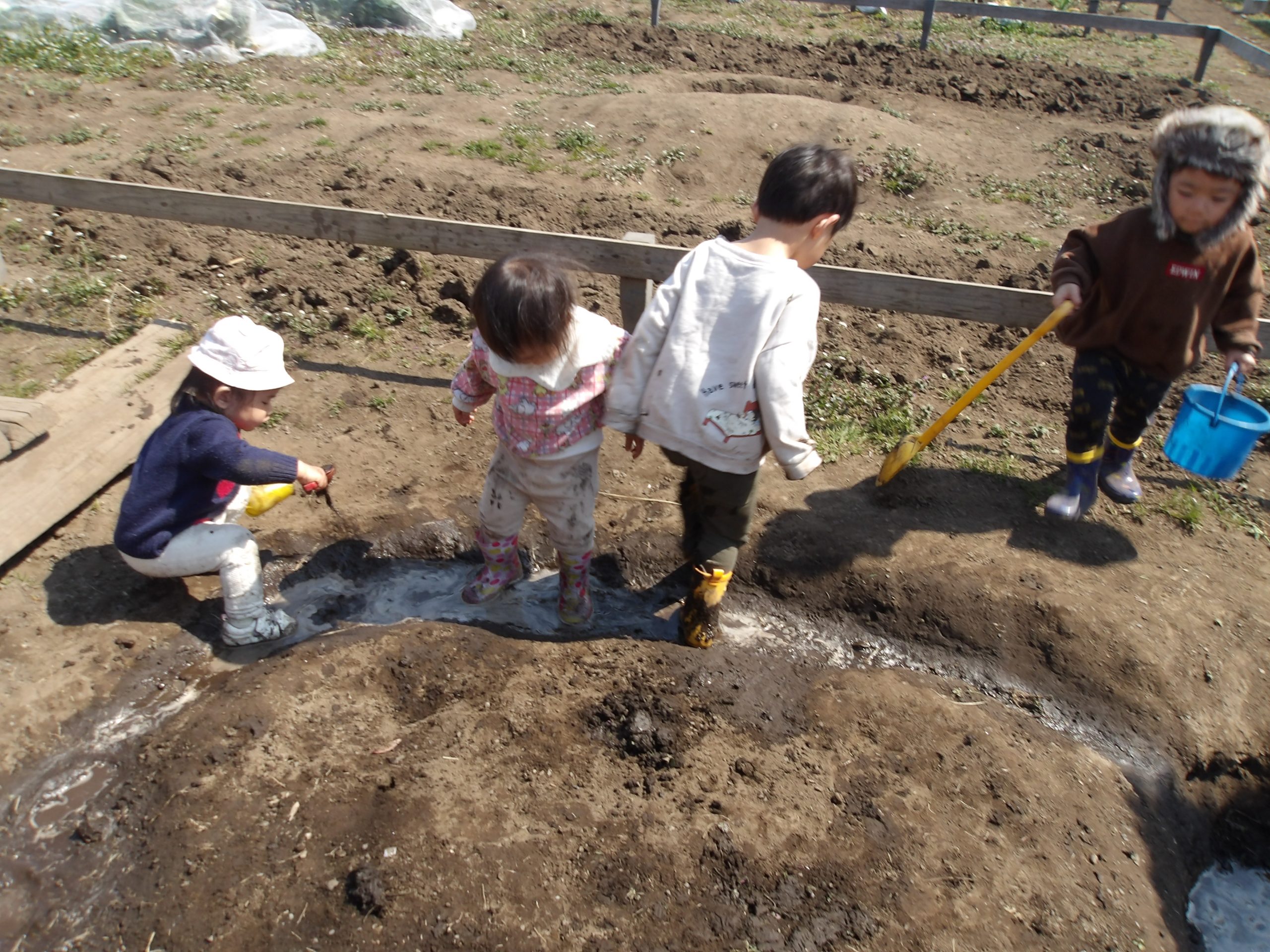 冬でも日差しが暖かい時にはレンガをひっくり返して虫(ダンゴ虫)探しをする子ども達。越冬した蛾は見つけましたがダンゴムシはまだのようで、期待しながら繰り返し探しています。畑の隅の菜の花が寒さに耐えて大株になり、可愛らしい黄色の花を咲かせて、春を運んできてくれたようです。