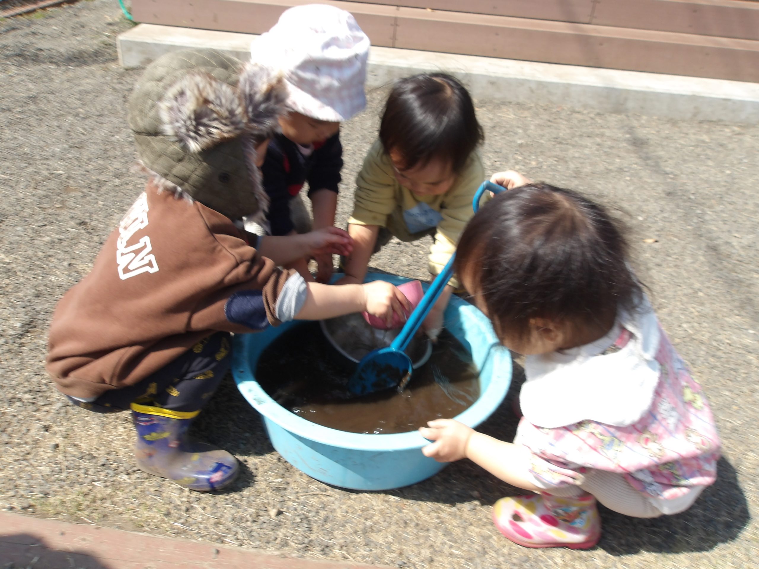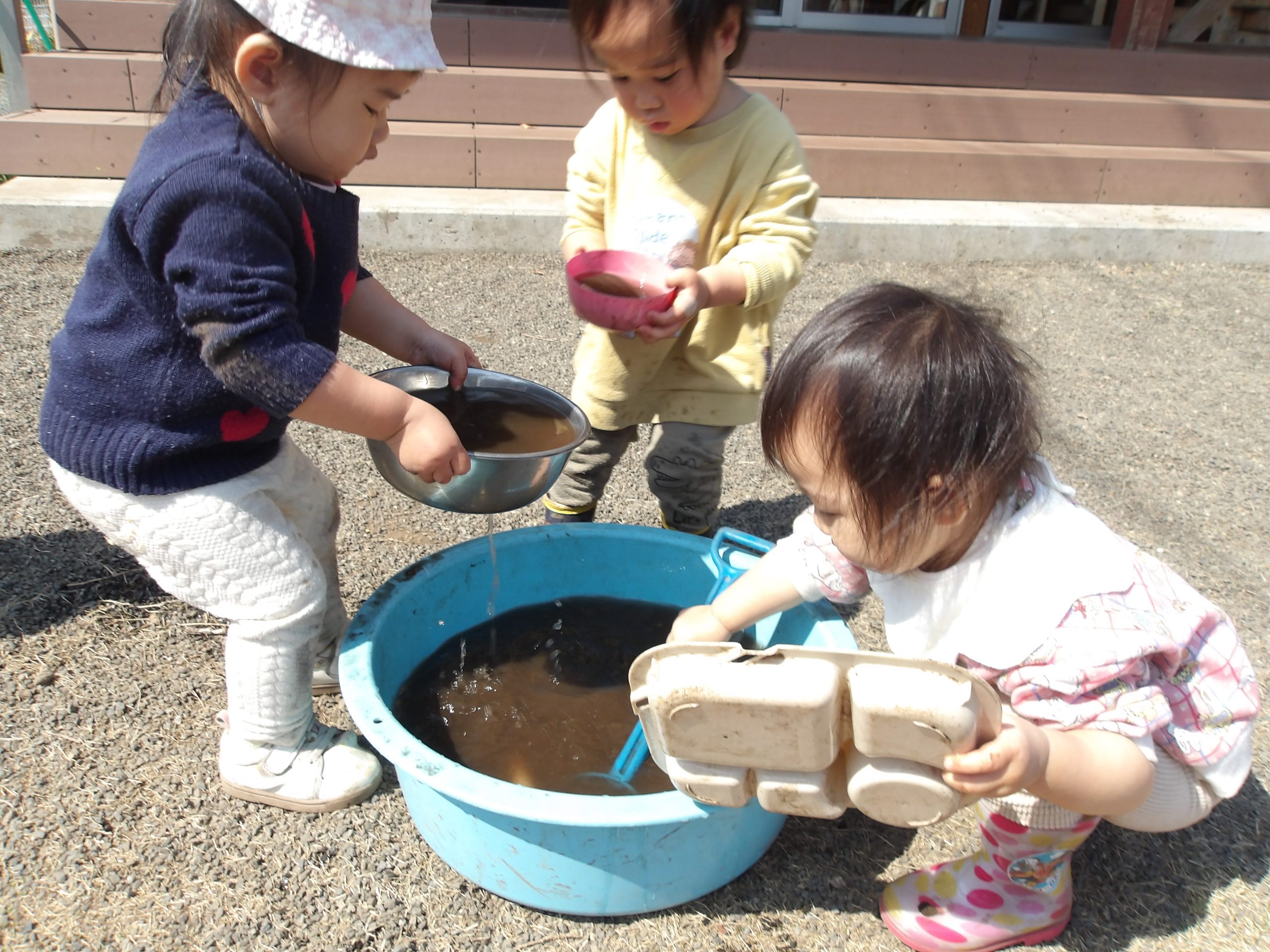 これまでにあそんだことのある「だるまさんがころんだ」の遊びは、先生が○○しようかな…と言うとやりたい子が集まってきて、自然に遊びが始まりました。また、「穴」を作りたい子どもたちも、はじめだけ先生に手伝ってもらうと自分たちで掘り進めていました。今では、先生がその場から離れると遊びも終わる、ということはなく自分たちで続けられるようになっています。