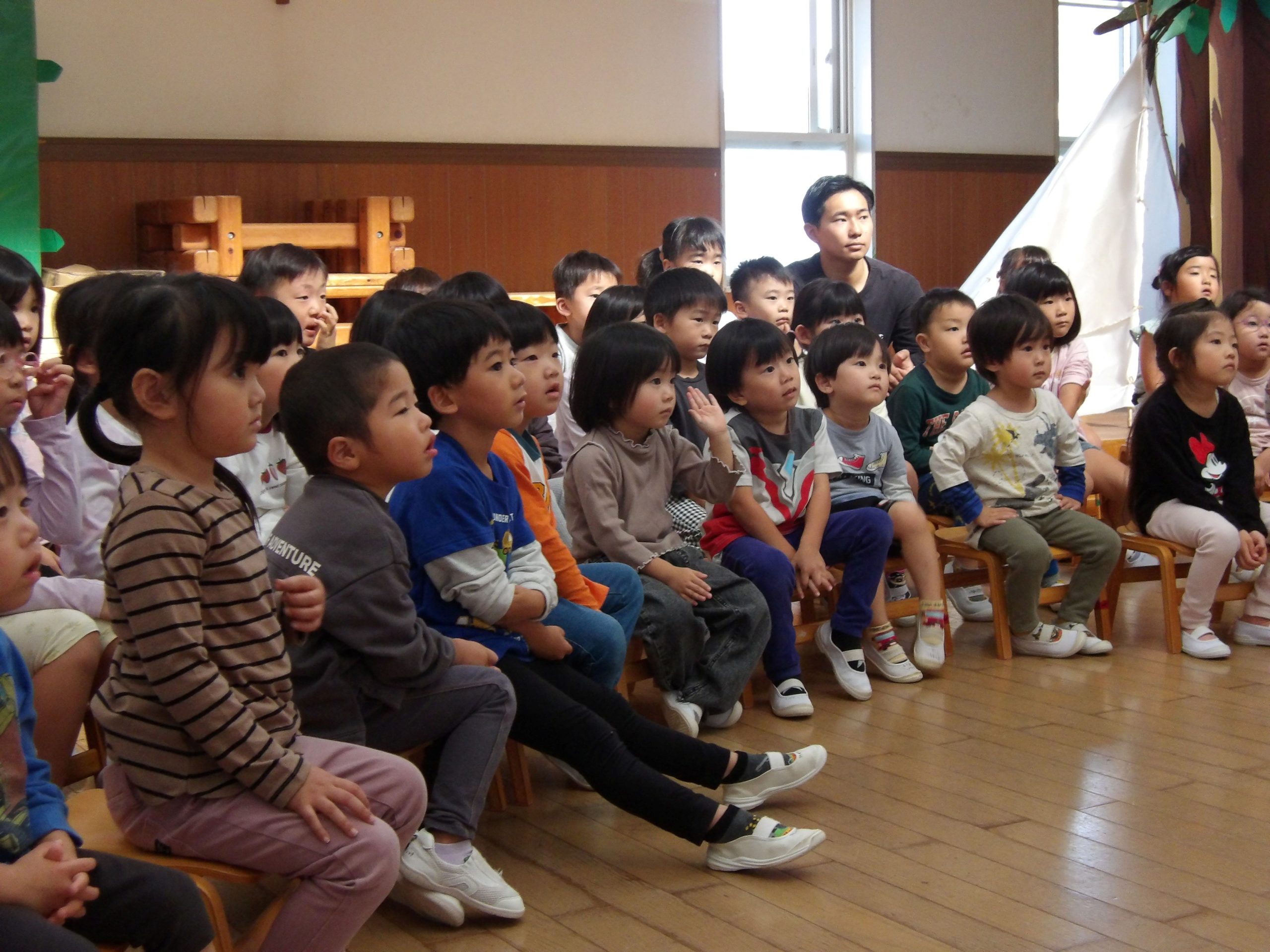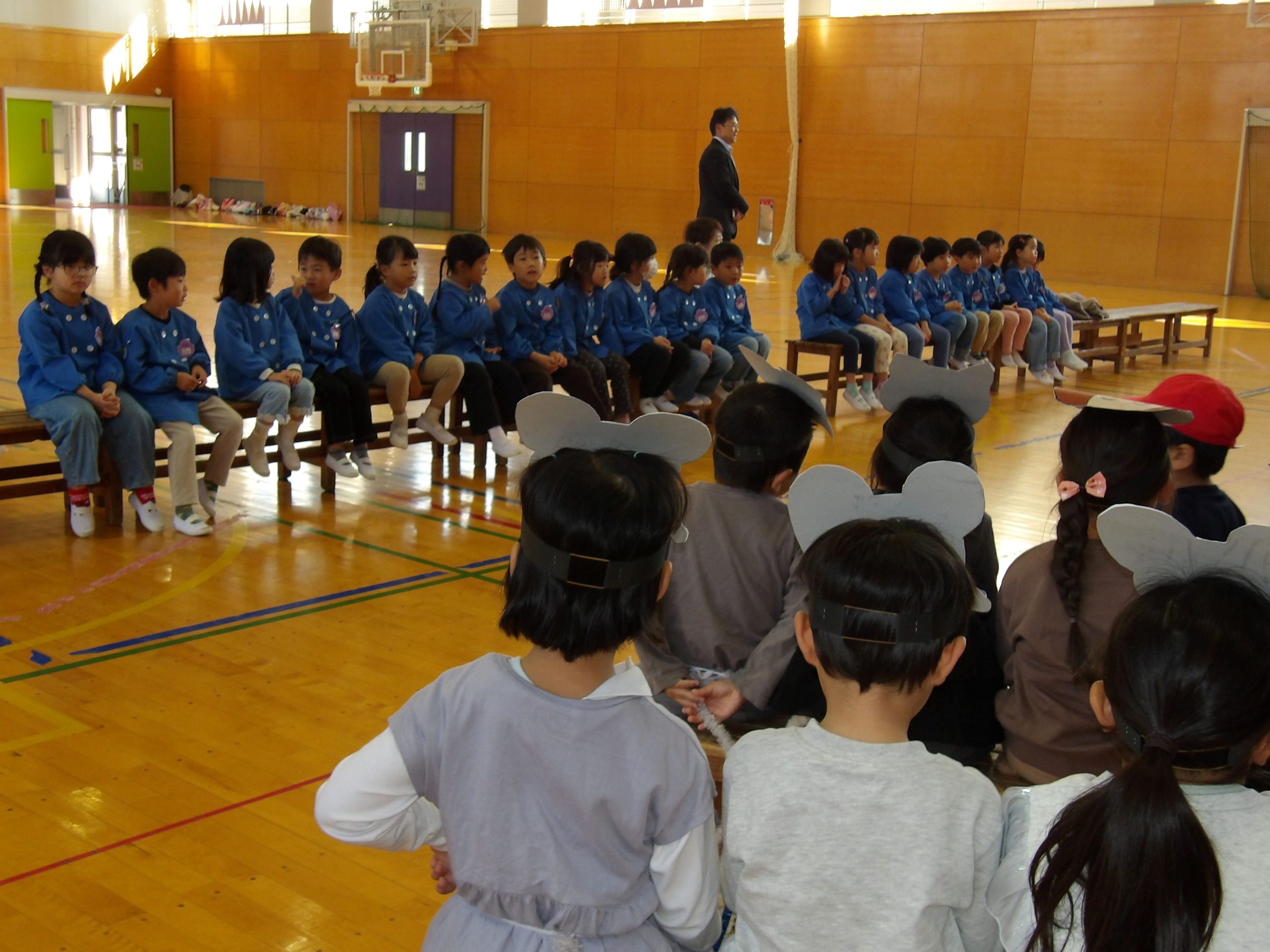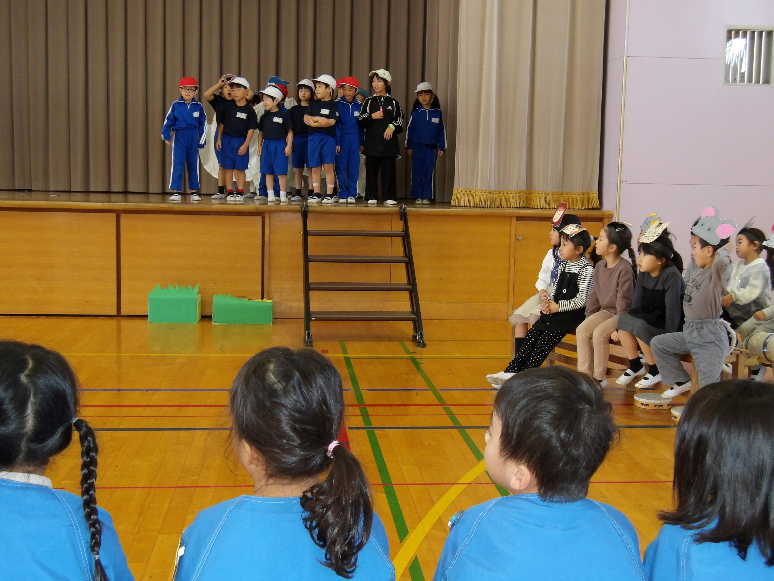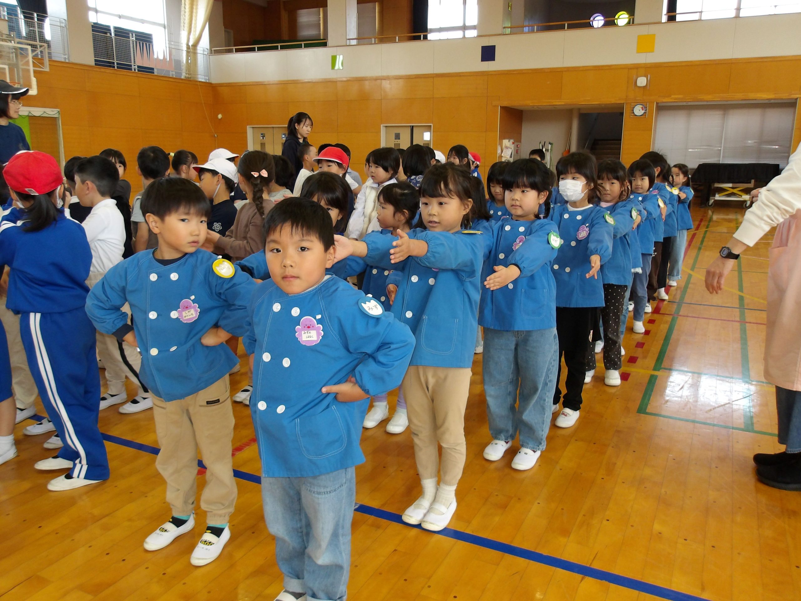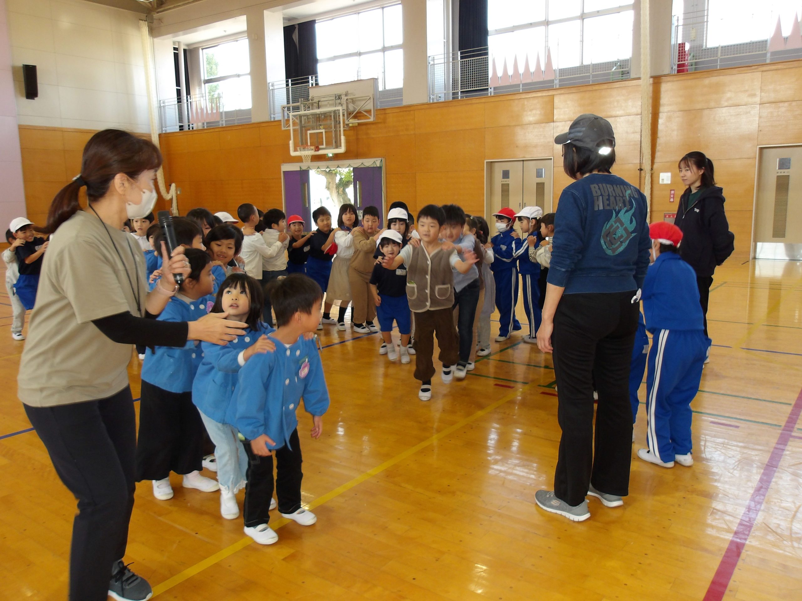 10月30日(木) つき組が原町第二小学校へ訪問し、1年生と交流しました。1年生が学習発表会で発表した劇を披露してもらった後、体育の授業に交ぜてもらったりじゃんけん列車をして遊んだりしました。「前へならえ」を教えてもらってやってみると、すっかり1年生の気分に。子どもたちは、小学校へ行く期待が高まったようです。