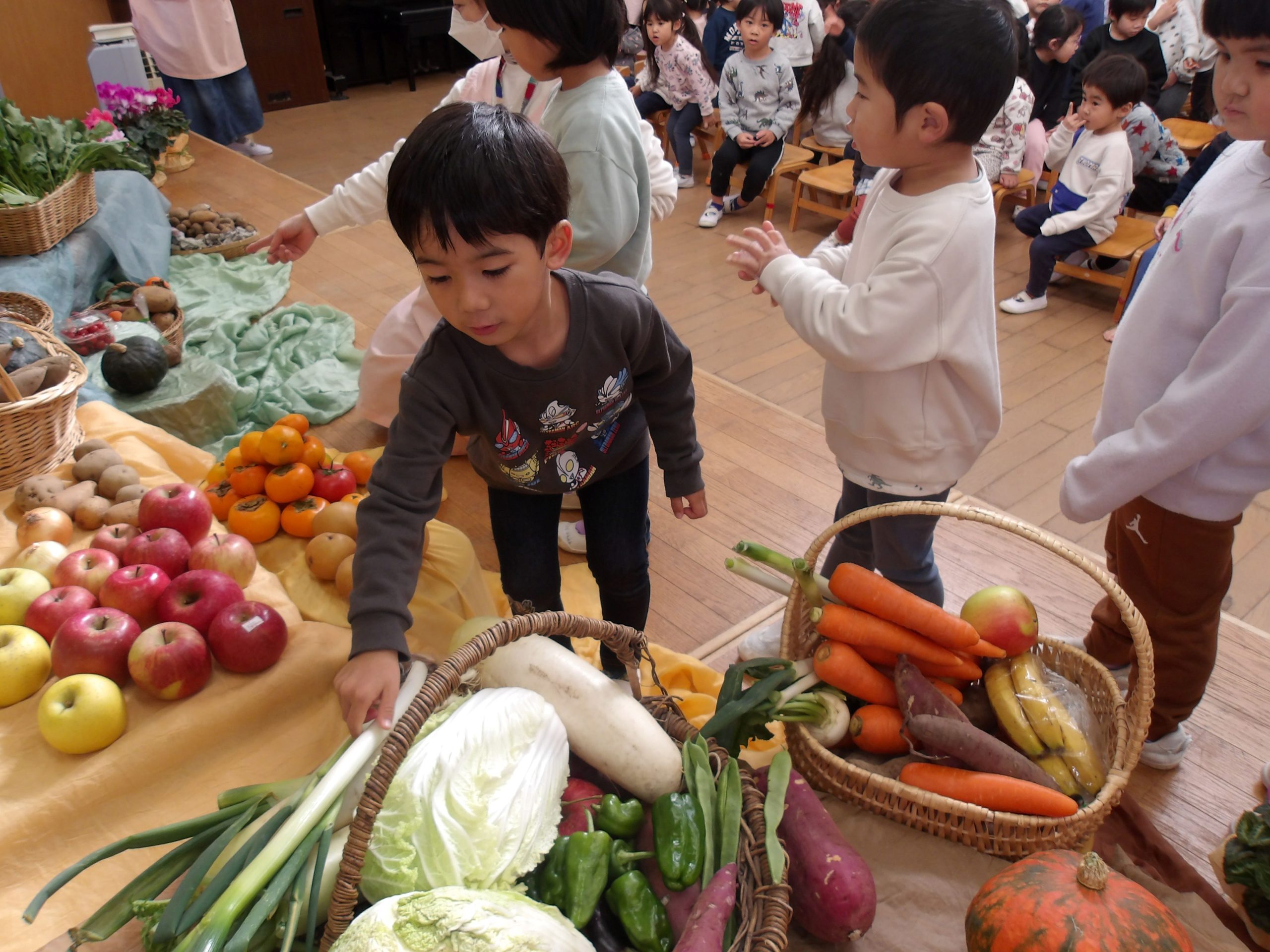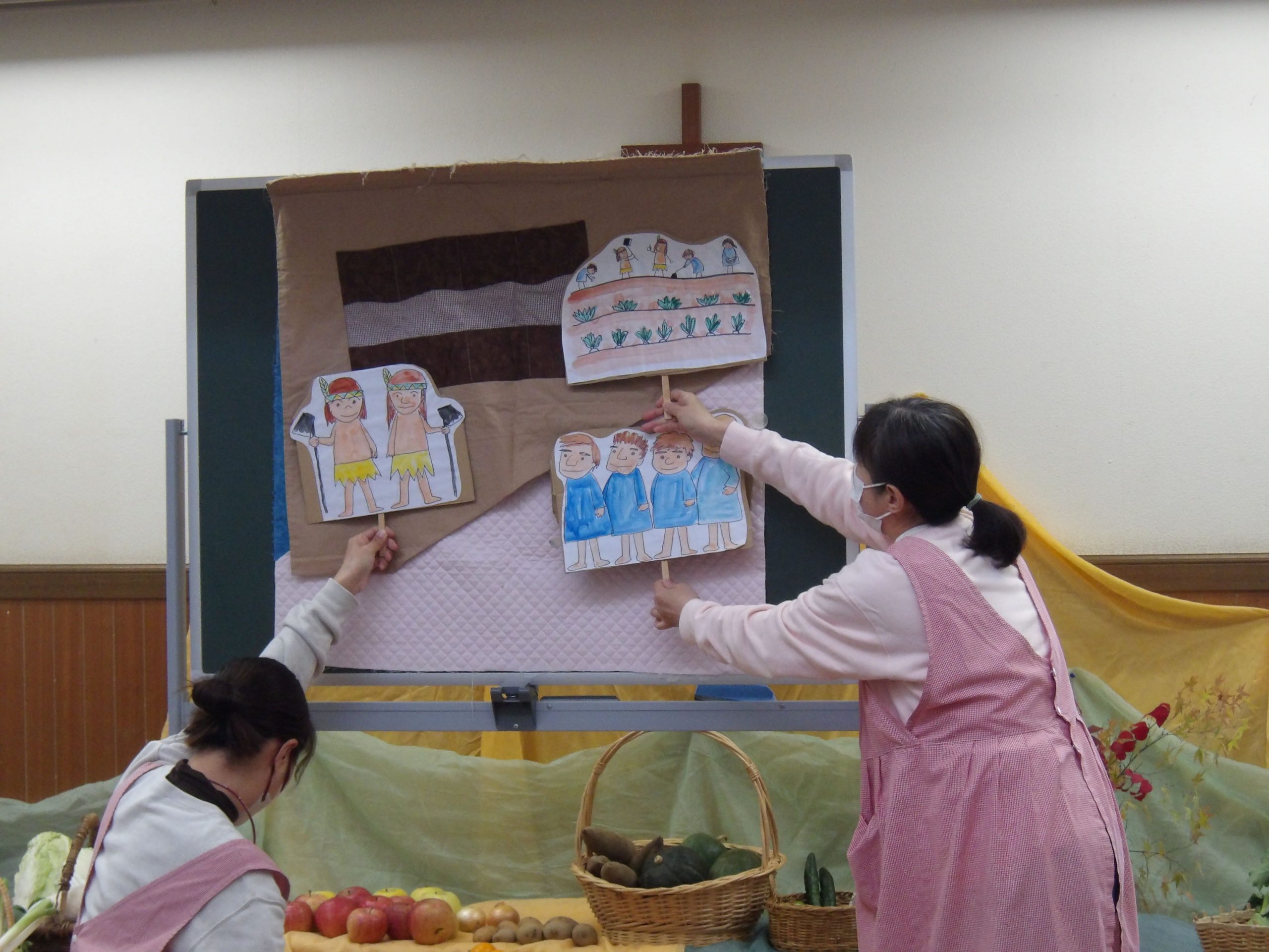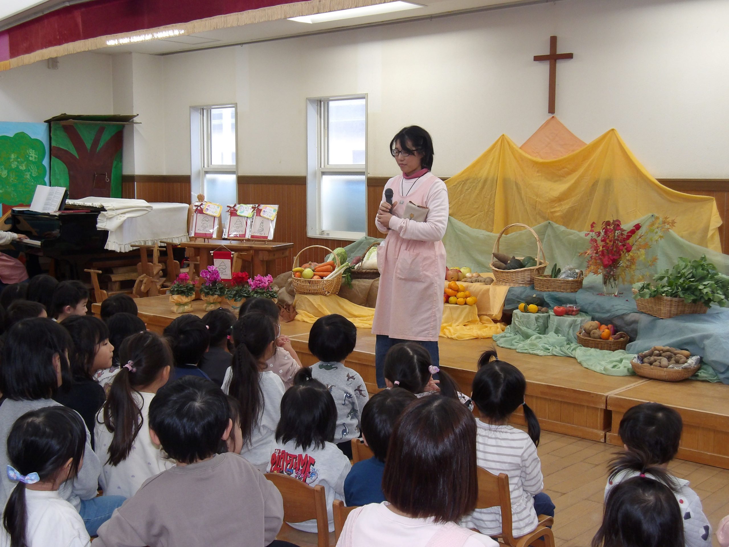 子どもたちが持ち寄った野菜や果物を飾り収穫感謝祭をしました。たくさんの恵みをくださった神さまに感謝の礼拝をし、近所の方にも届けました。収穫の喜びを分かち合いました。25日(火)には、本日集まった野菜を使って子どもたちが豚汁作りをする予定です。