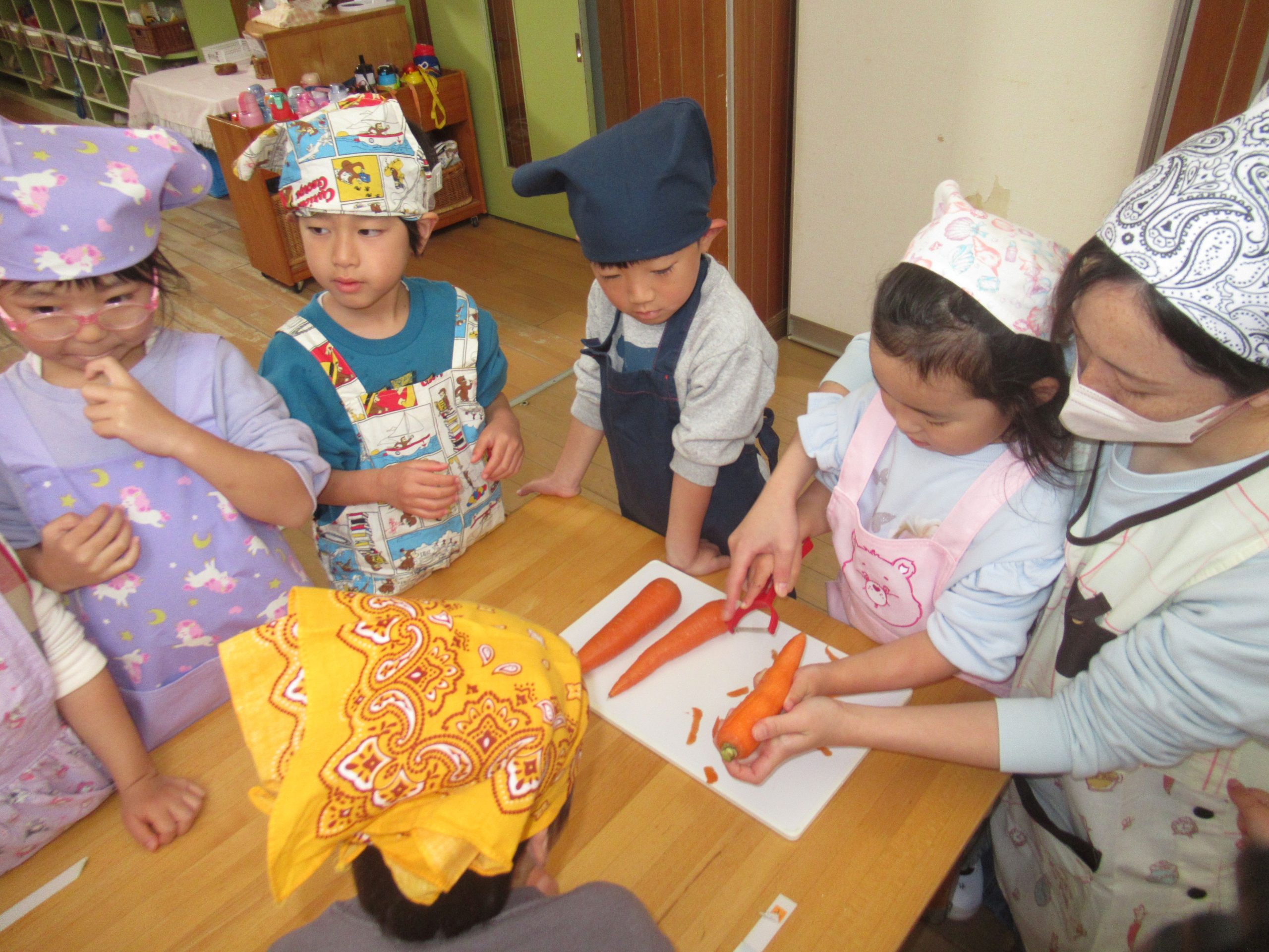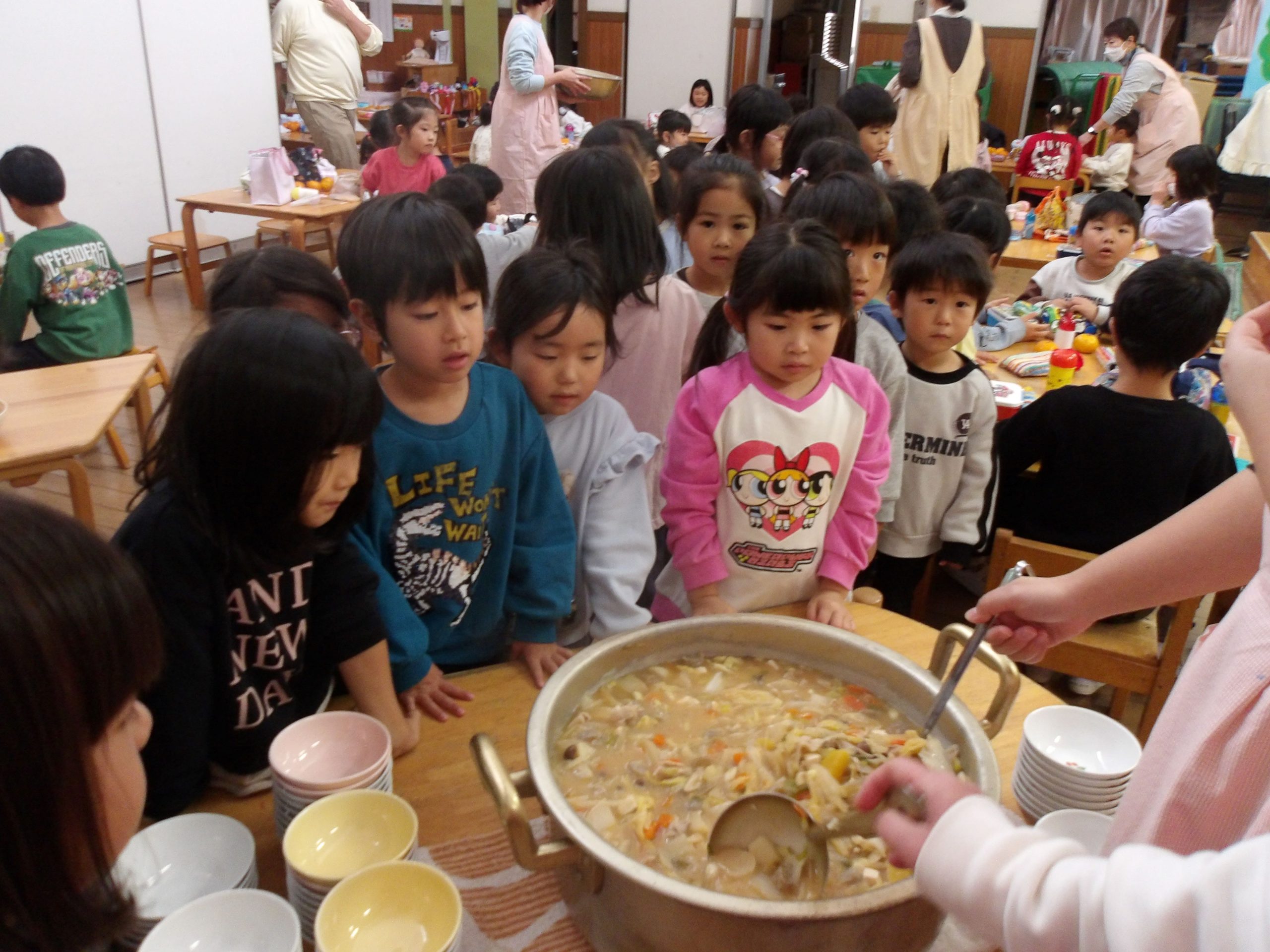 先日の収穫感謝祭に集まった野菜で、ファミリークラスの子どもたちが豚汁作りをしました。エプロンと三角巾を身に付け大張りきり。野菜を洗ったり包丁で切ったりと、役割分担をして作りました。具沢山の豚汁が出来上がると「わぁ」と歓声をあげていました。神さまからいただいた、たくさんの恵みに感謝して美味しくいただきました。