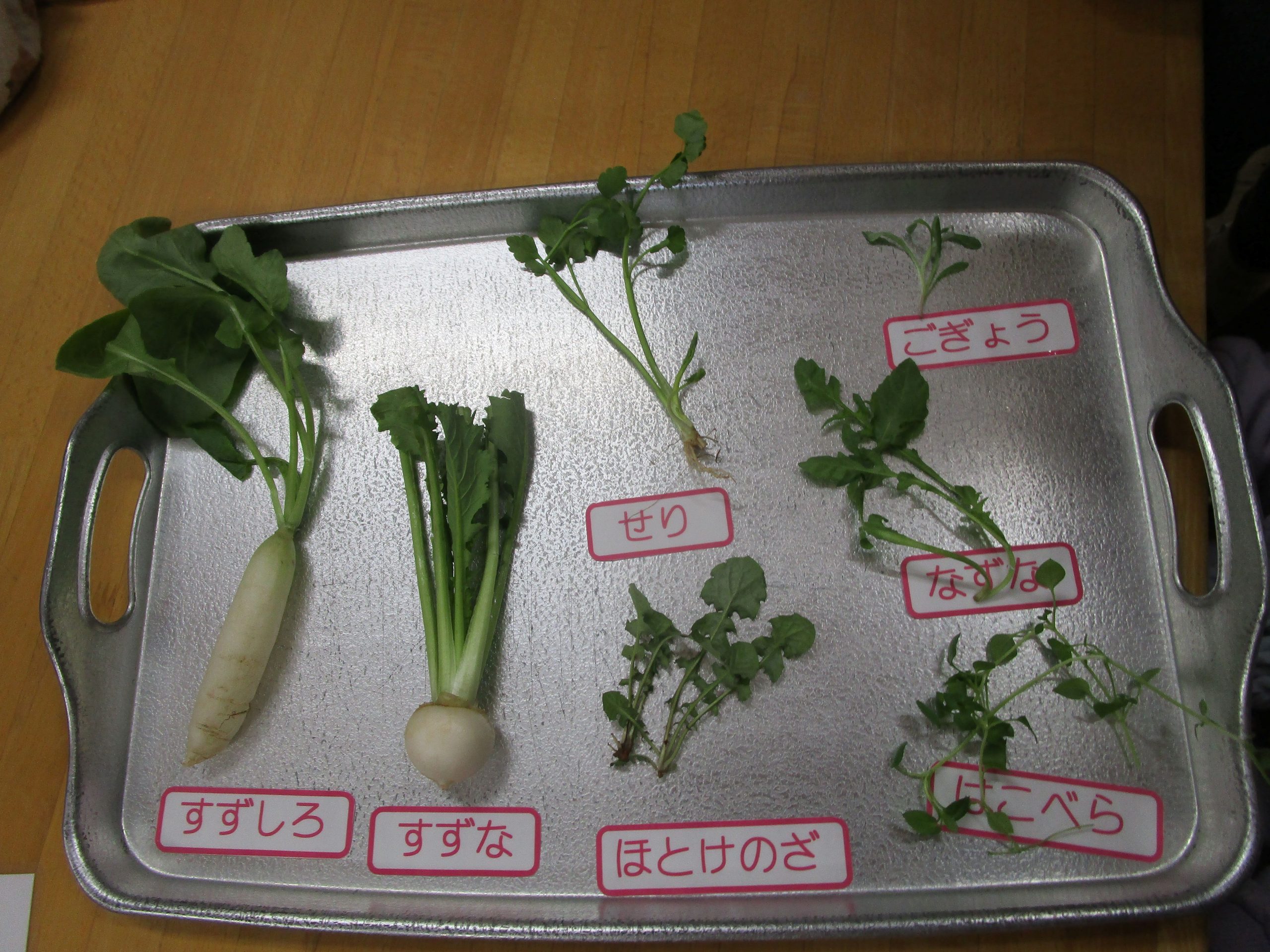 給食先生が七草を見せながら各クラスを回り、なぜ七草を食べるのかを教えてくれました。給食の時間、お汁のお椀を覗き込みながら「どれかなぁ?」と七草の絵と見比べながら探していました。今年一年も元気に過ごせますように・・・