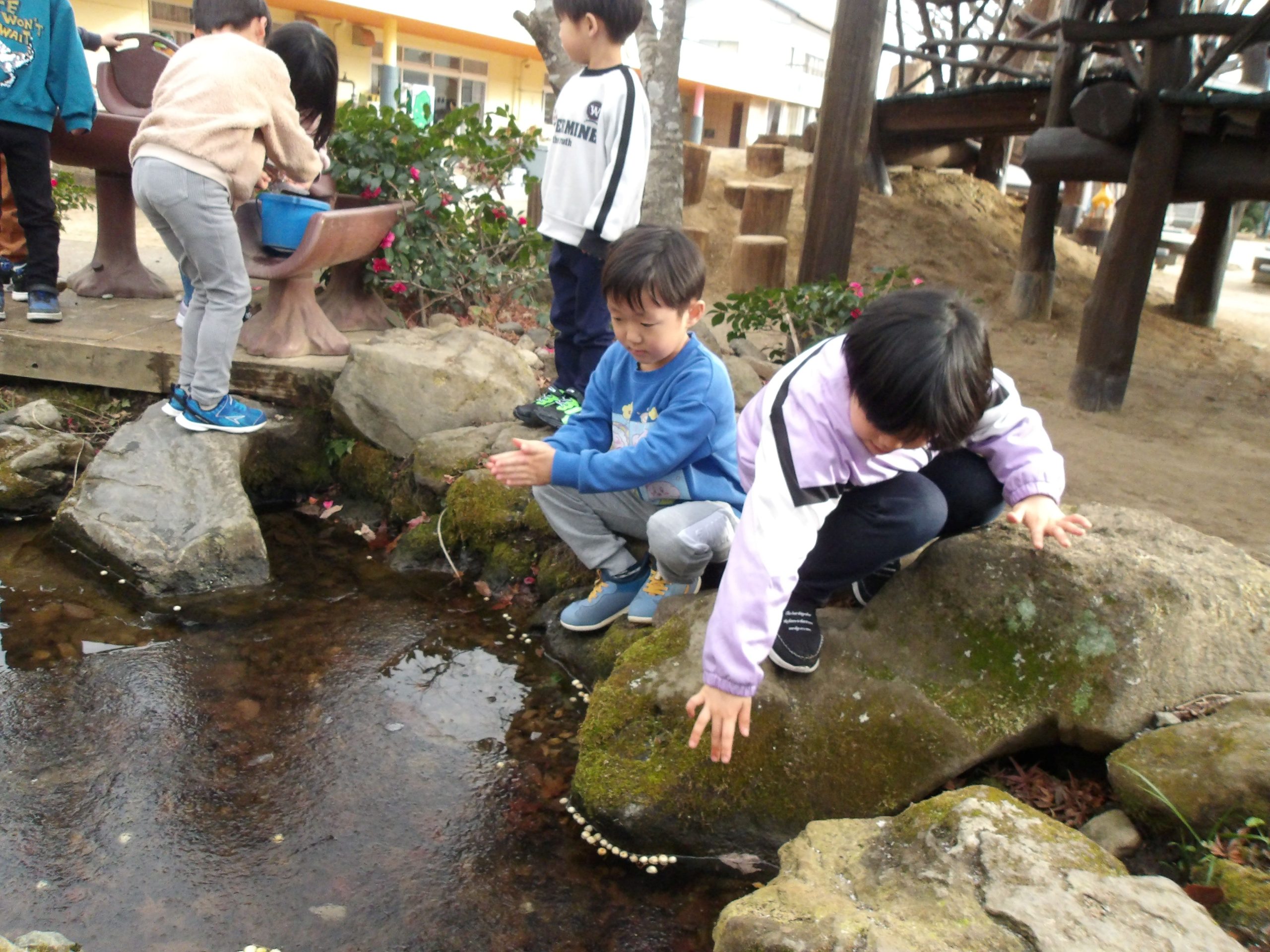 今朝は冷え込み、子どもたちからも「寒いね」という声が聞こえてきました。園庭に出て小川を覗いてみると氷が張っていて子どもたちは大喜び!「冷た~い」と言いながらも、氷を手に目を輝かせていました。