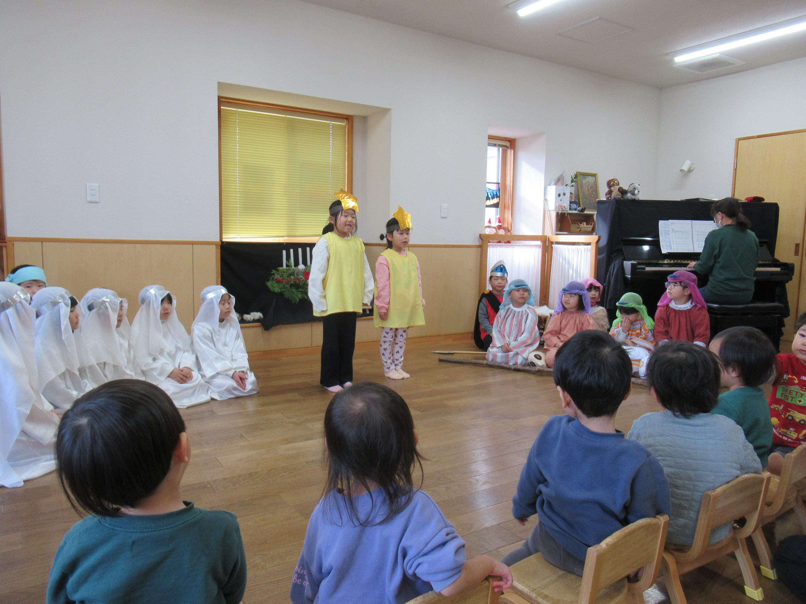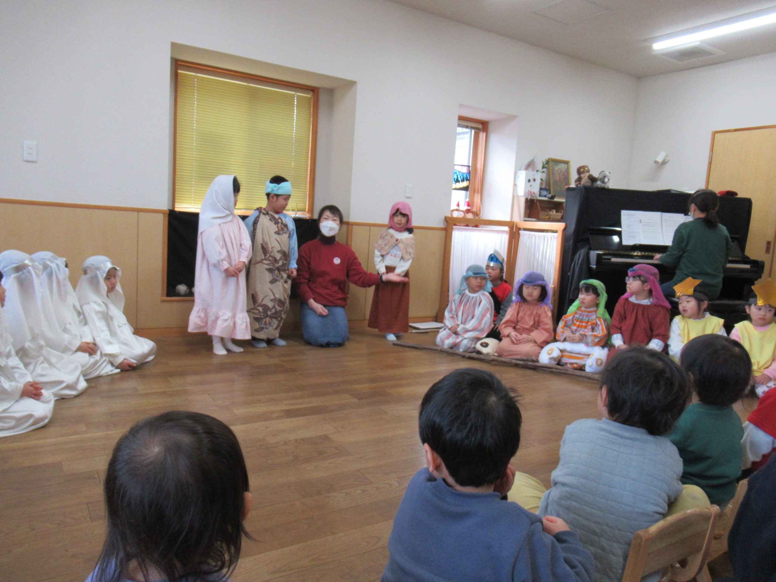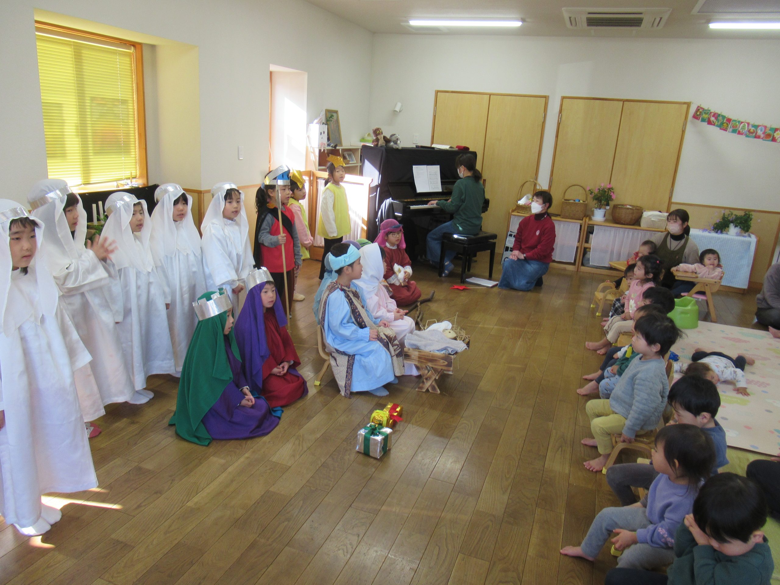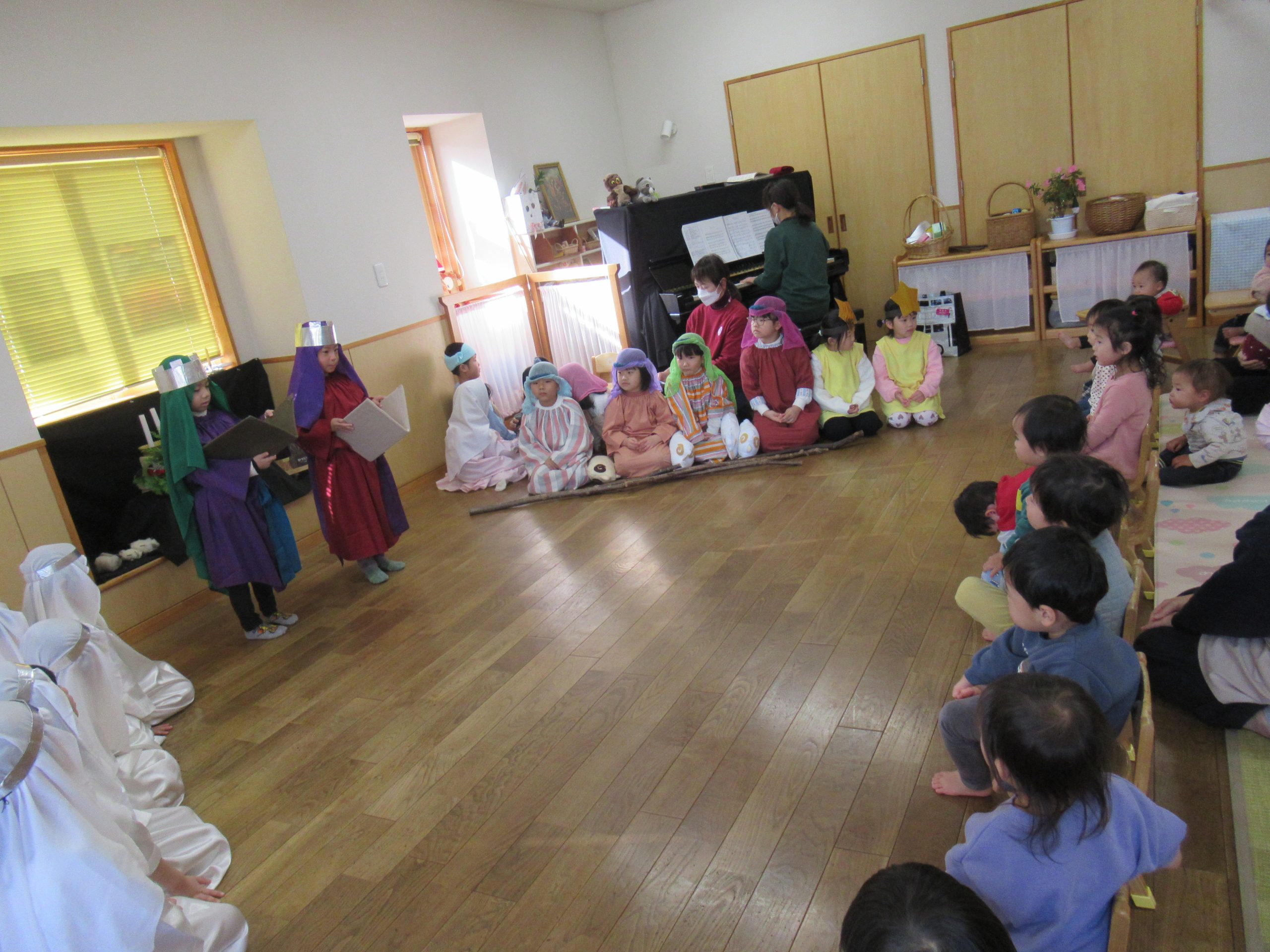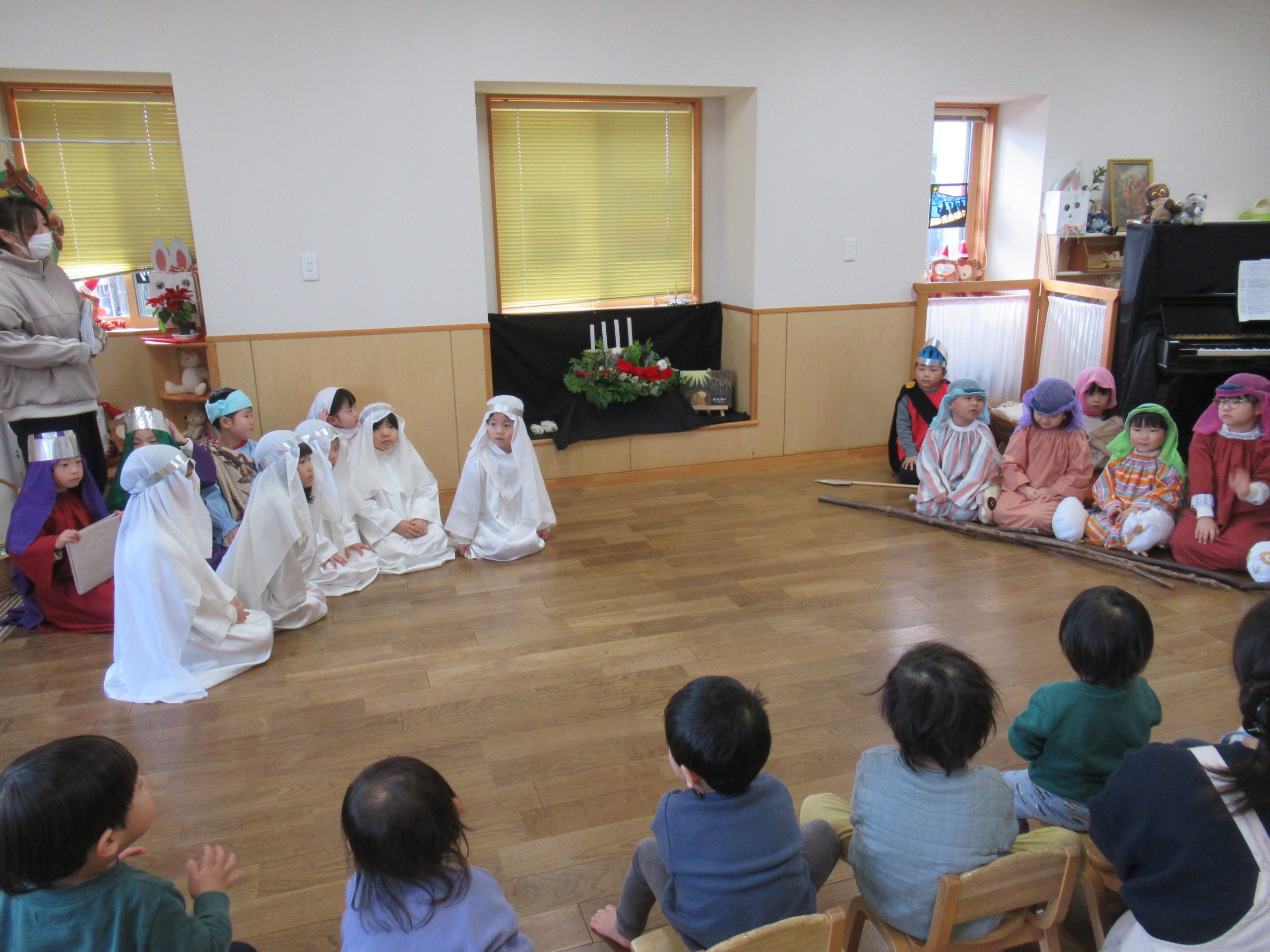 つき組さんと交流のひと時を持ちました。聖誕劇をじっくり見入る子どもたち。きっと“あっ知ってる”と思いながら見ていたことと思います。天使さんの動作に併せて、思わず手を拡げたことり組のRちゃんとEちゃん。最後まで見届けていました。あわてんぼうのサンタクロースを歌ったりプレゼント交換をしたりしてから、昼食(お弁当)を一緒に食べてさよならしました。楽しかった!つき組さんありがとう。